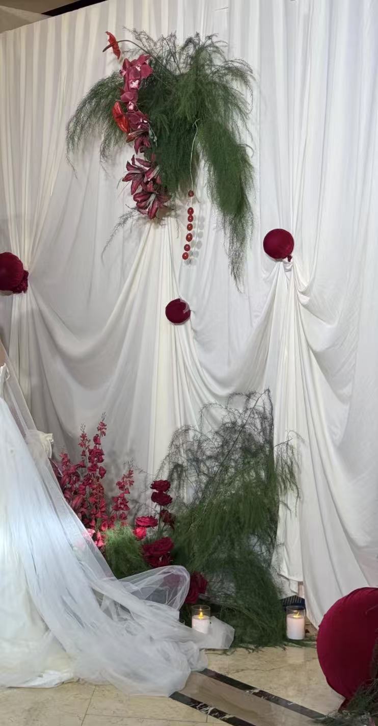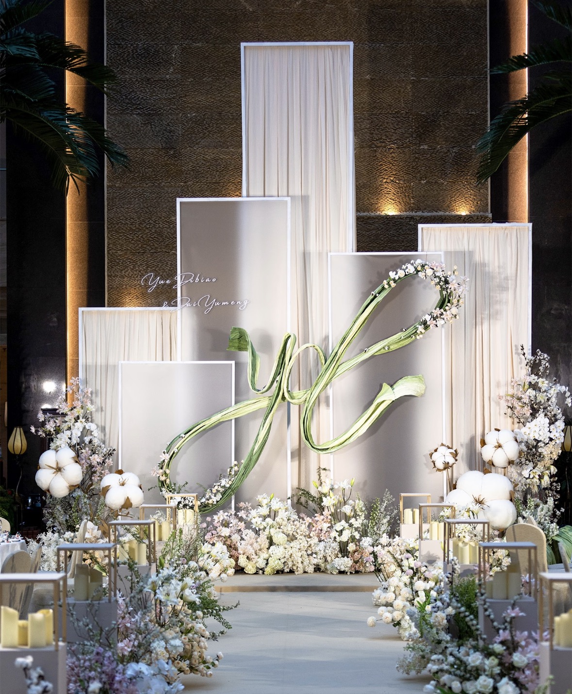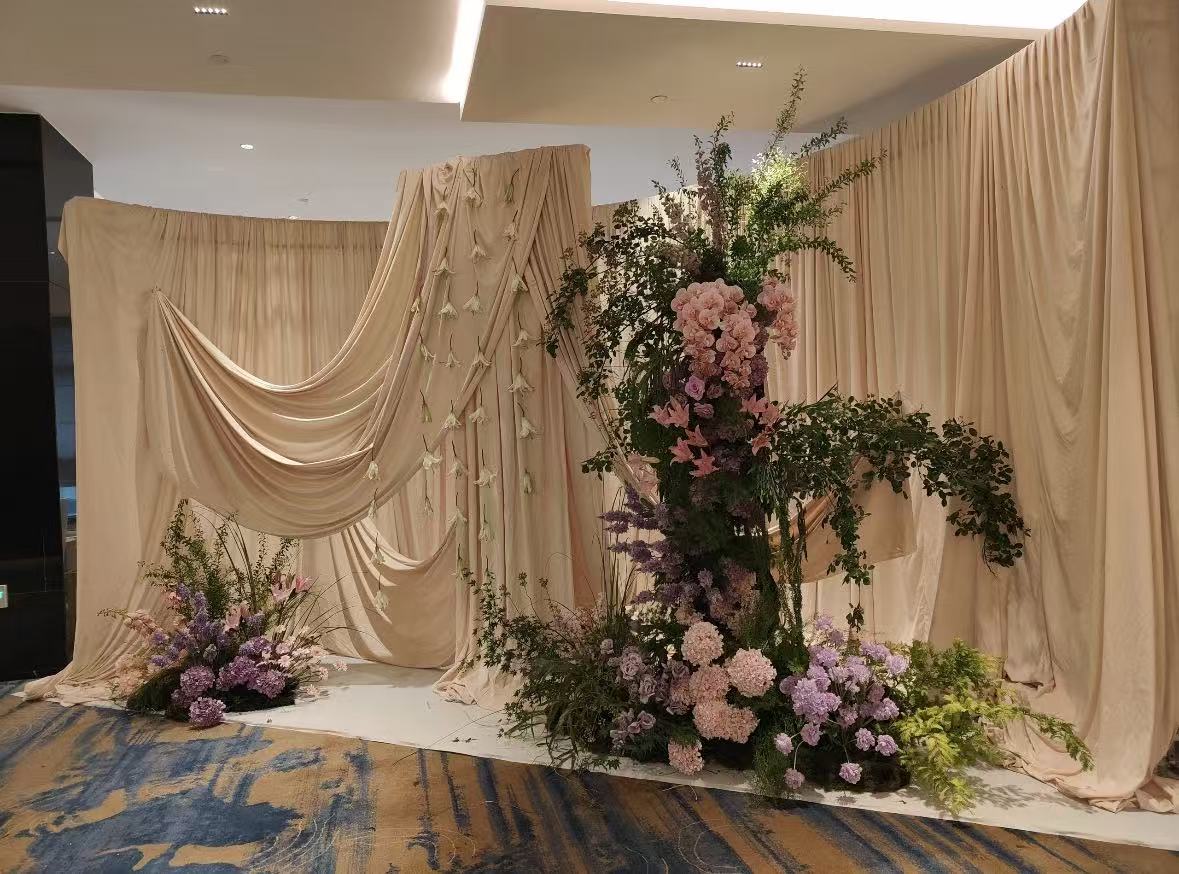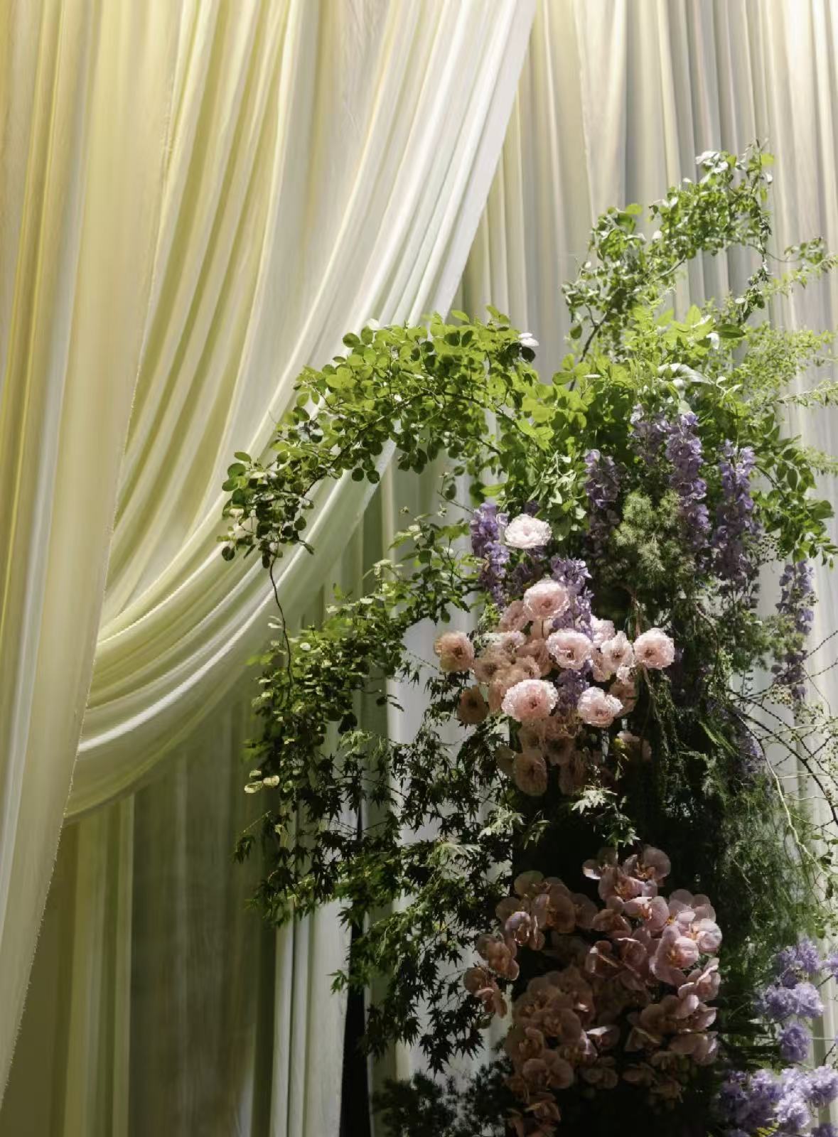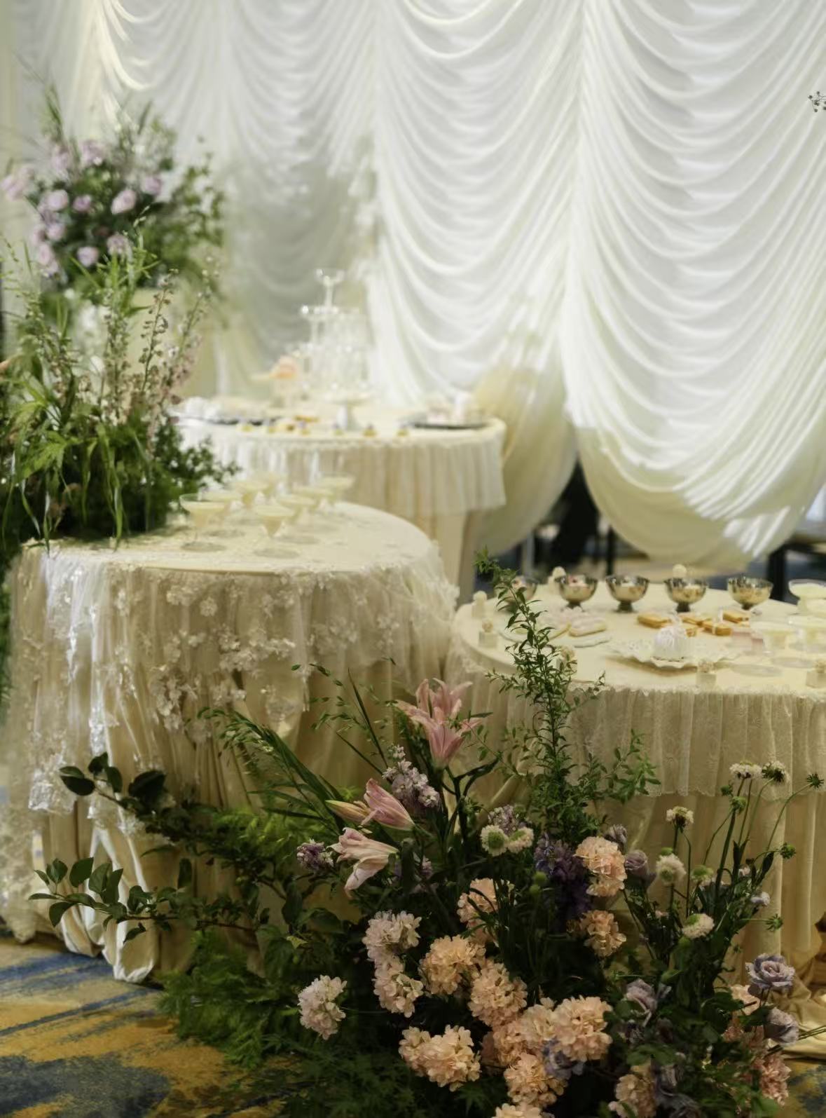• 香槟布幔搭上绿色花艺,韩式风格瞬间提升