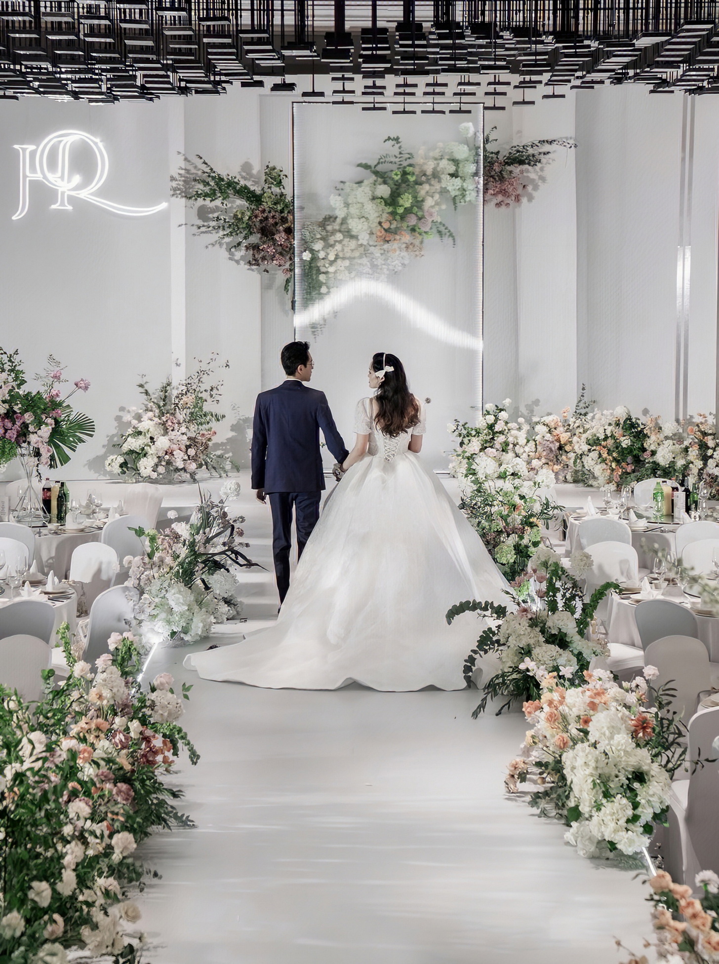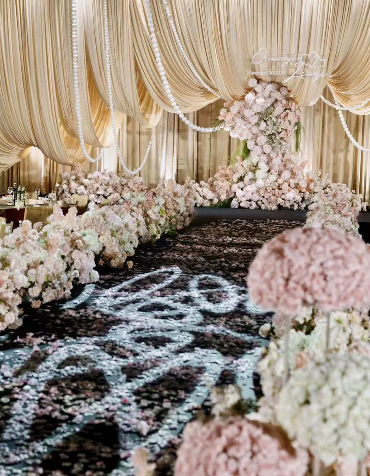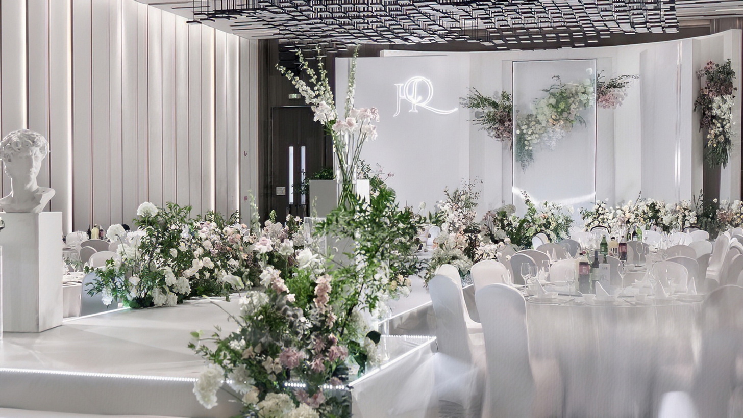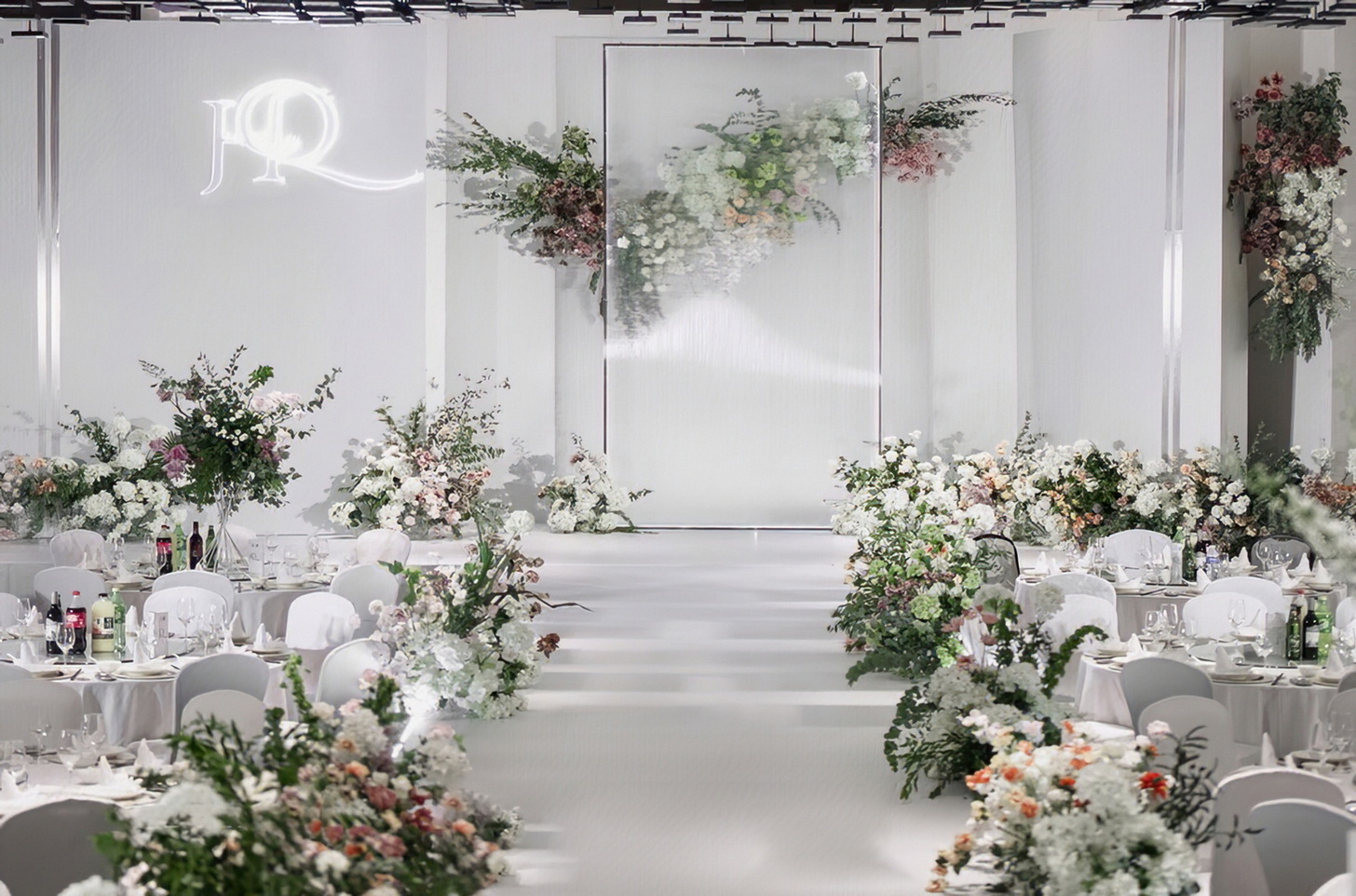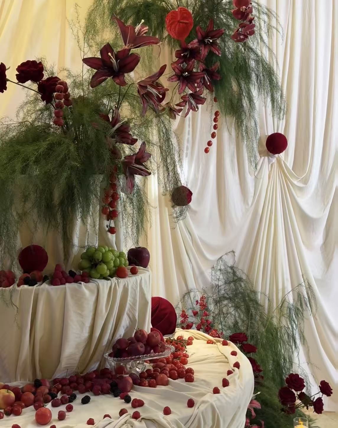 • 香槟布幔搭上绿色花艺,韩式风格瞬间提升