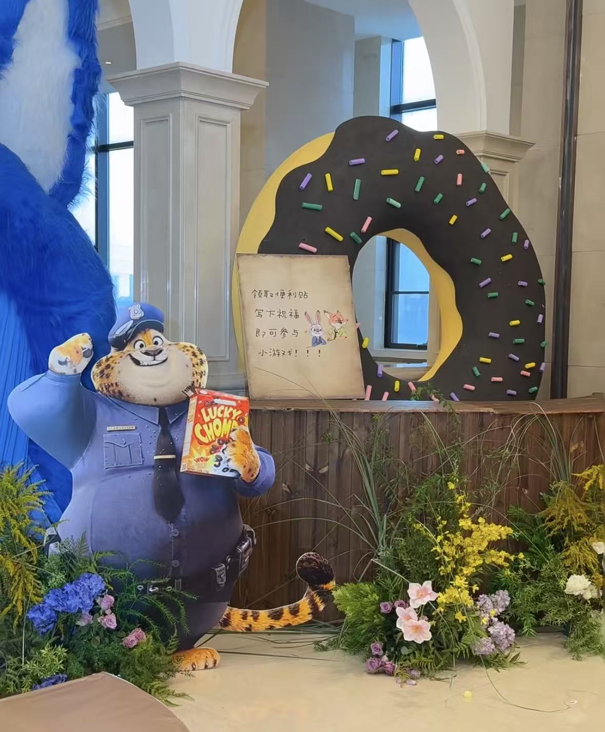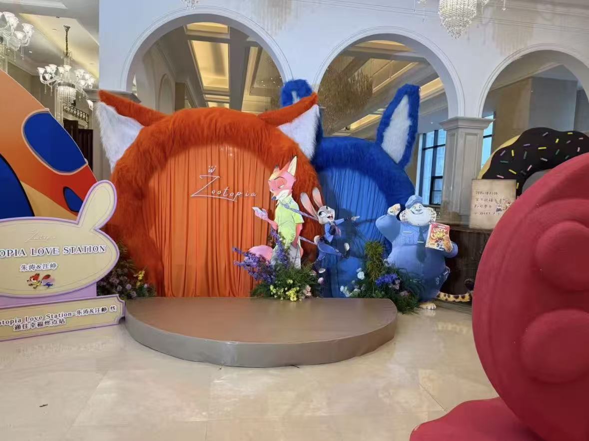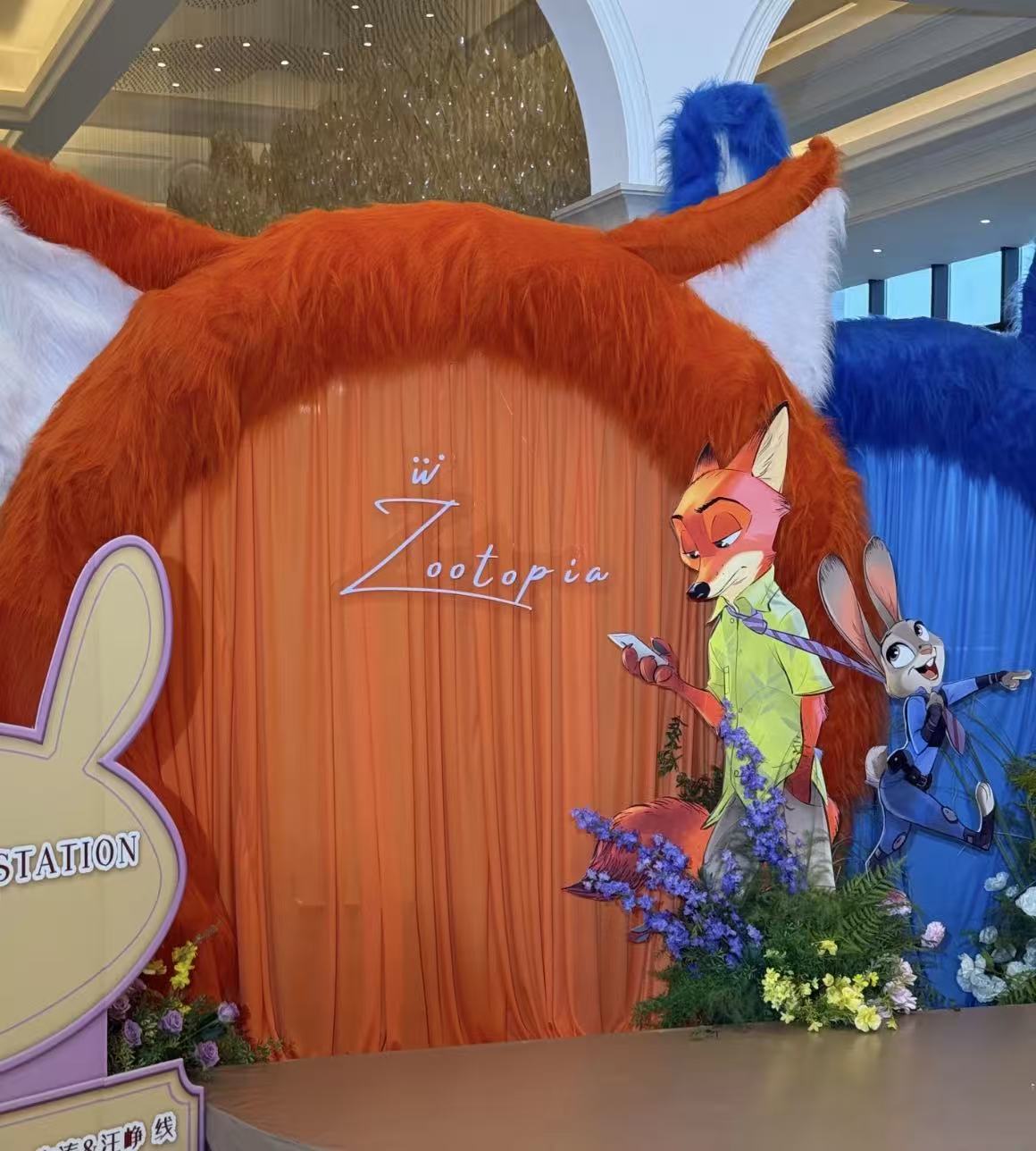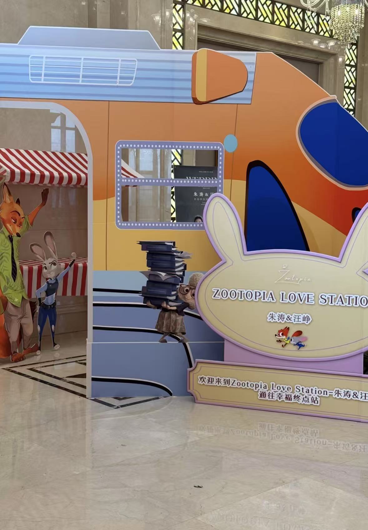 • # 橙色的立体狐头像,还有兔子警官头像,豹子警官,当然还有记忆尤深的粉色雪糕啦! 还有2米多高的超大甜甜圈~厅内布置的舞台主背景的动物城大楼,火车轨道的T台,蘑菇,胡萝卜,婚礼现场藏着动物城的整个街区~