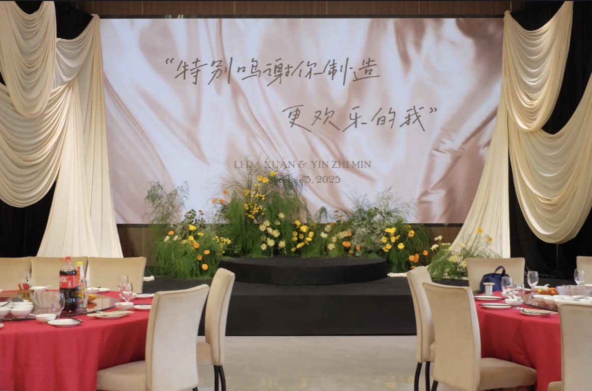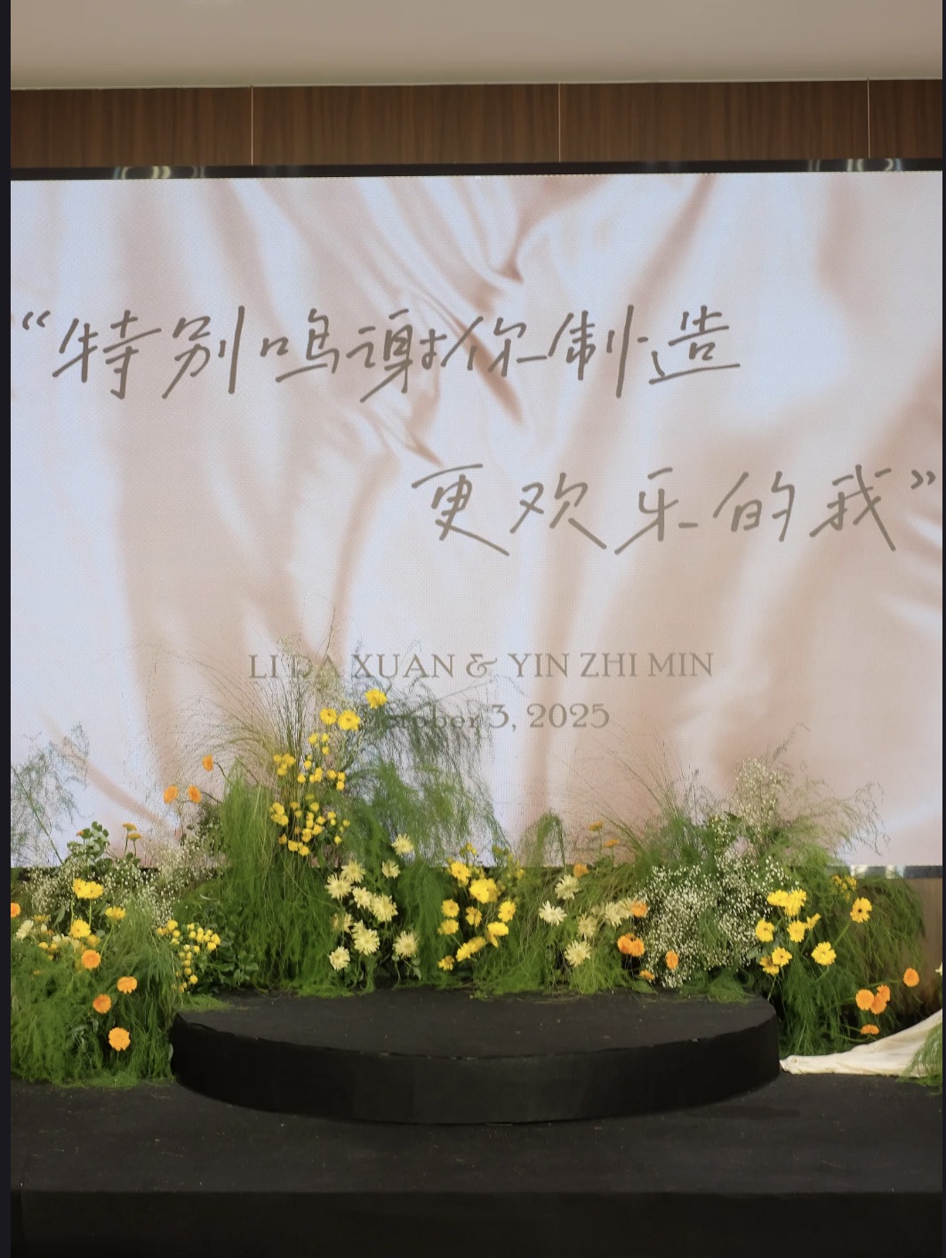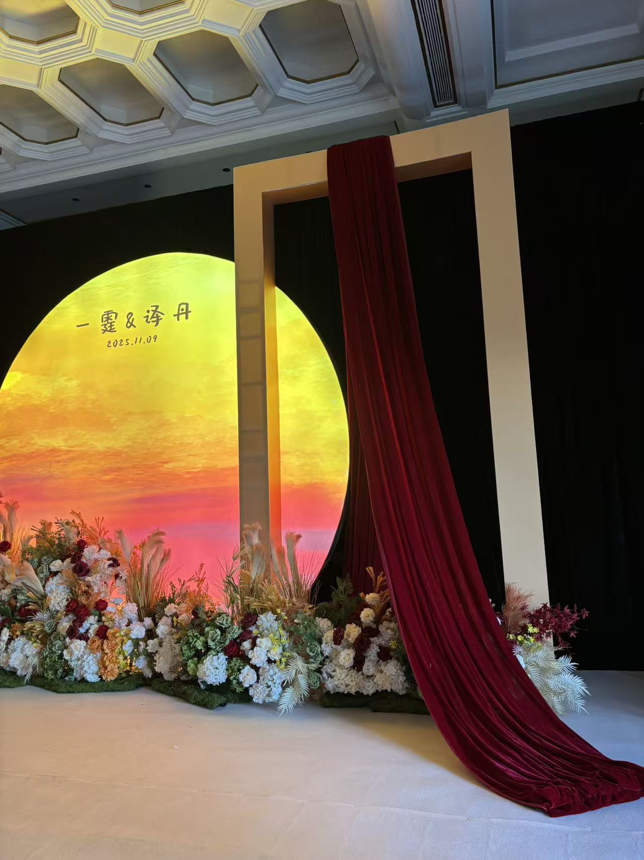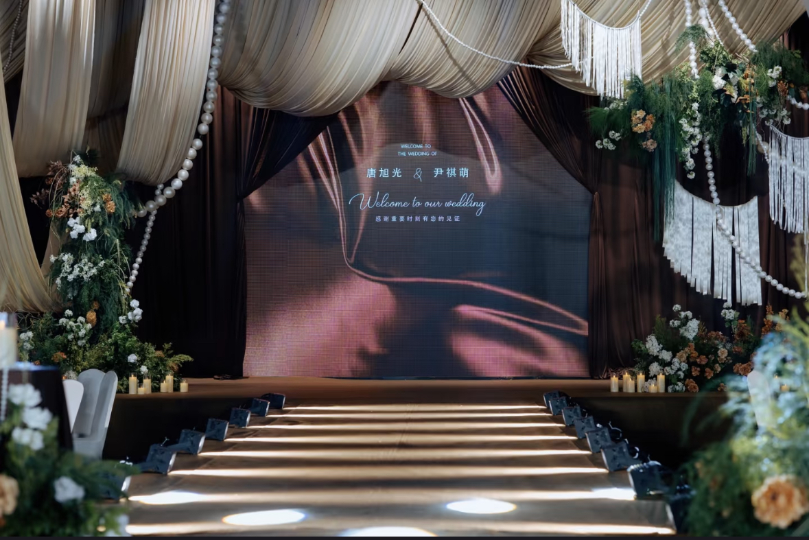 • 米咖布幔+野生花艺=温柔野趣! 两侧用低调高级的米色咖色布幔打底,点缀充满呼吸感的野生感花艺。 完美烘托出自然、松弛又温暖的仪式氛围,和中央大屏的现代感融合得恰到好处。