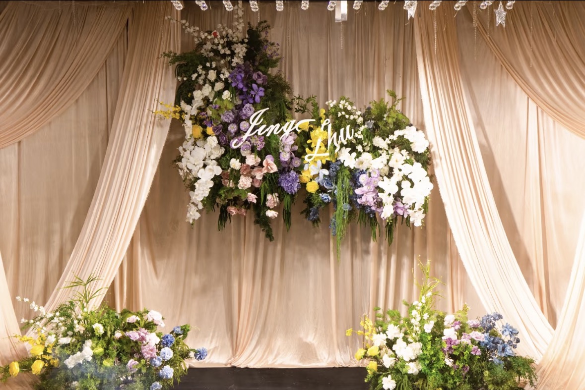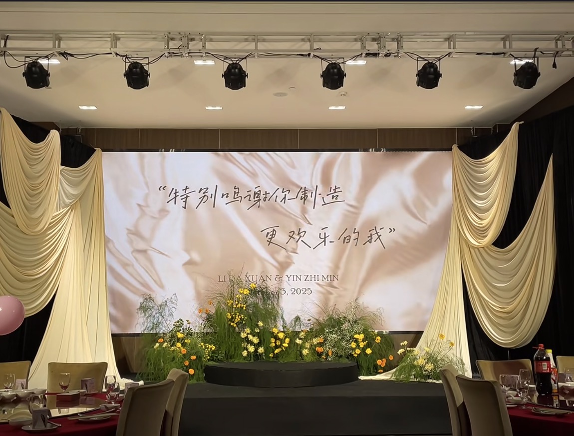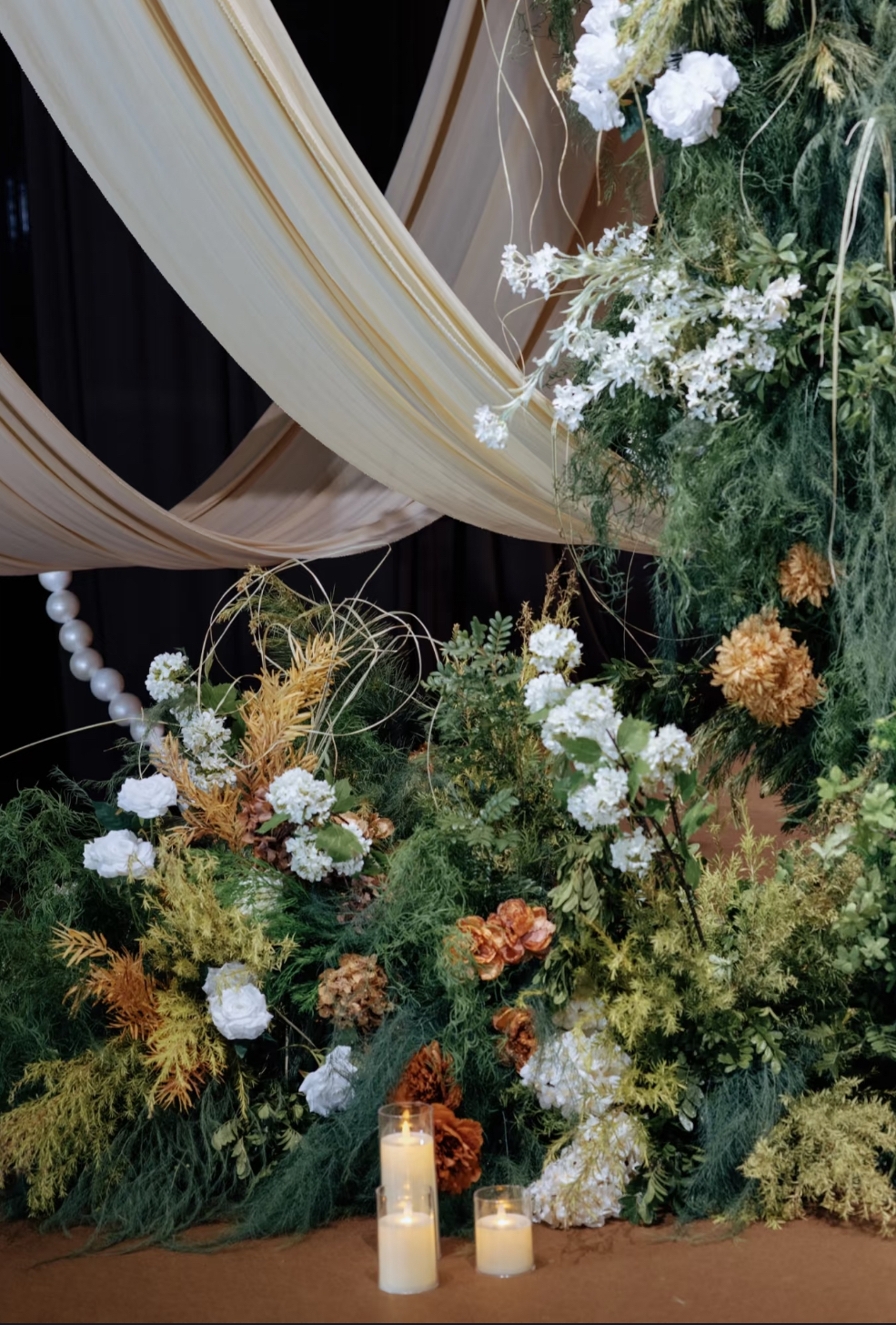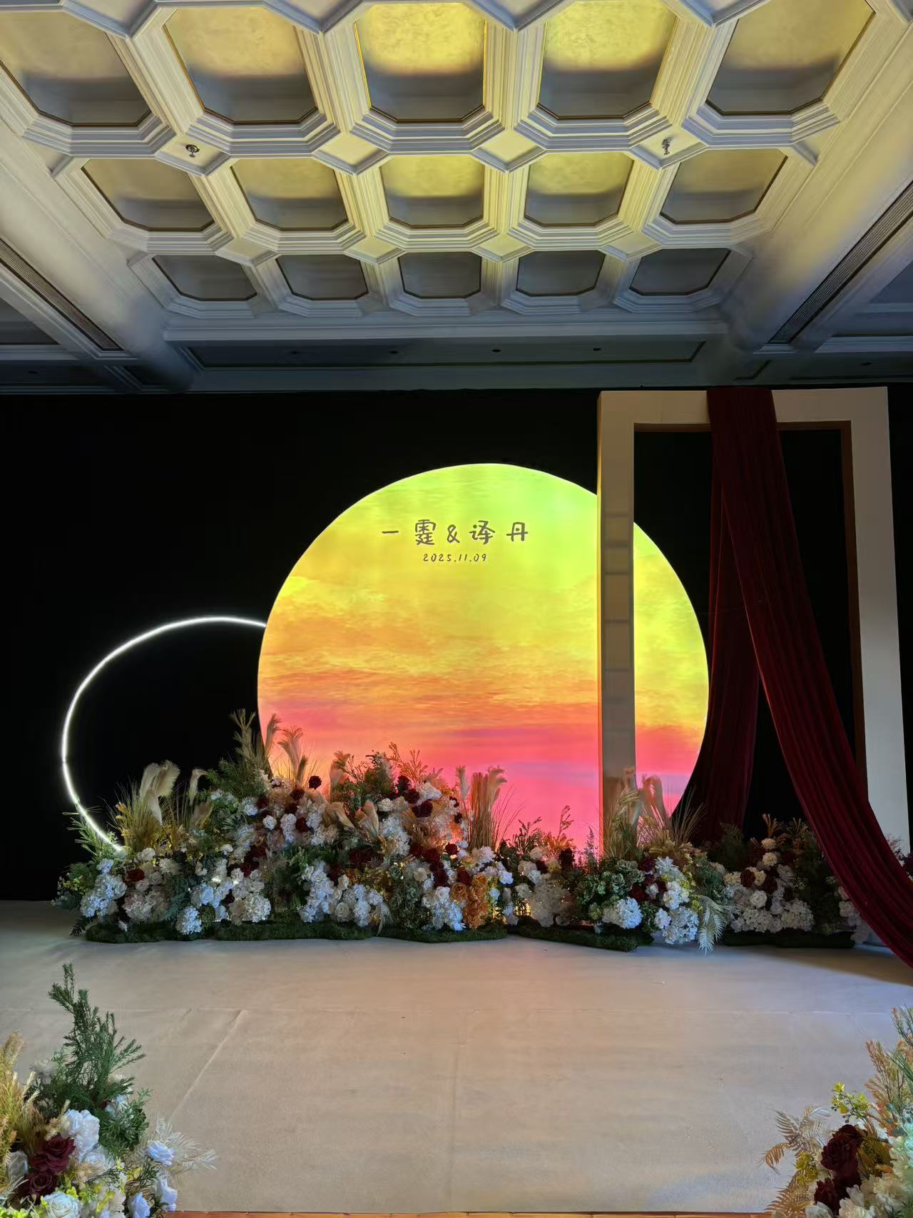 • 米咖布幔+野生花艺=温柔野趣! 两侧用低调高级的米色咖色布幔打底,点缀充满呼吸感的野生感花艺。 完美烘托出自然、松弛又温暖的仪式氛围,和中央大屏的现代感融合得恰到好处。