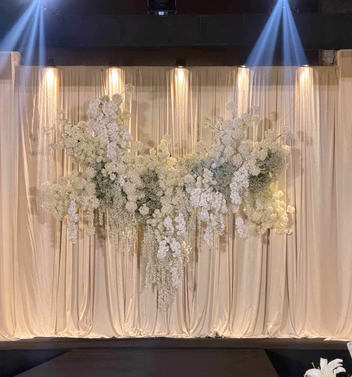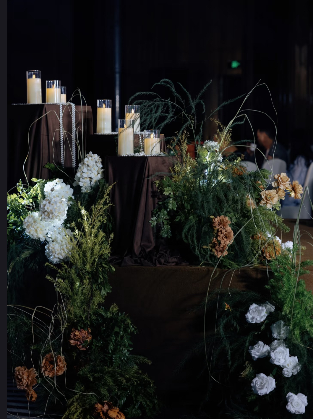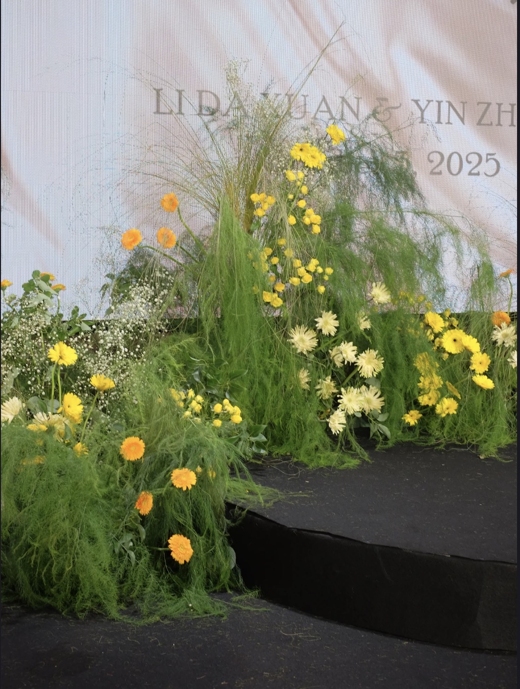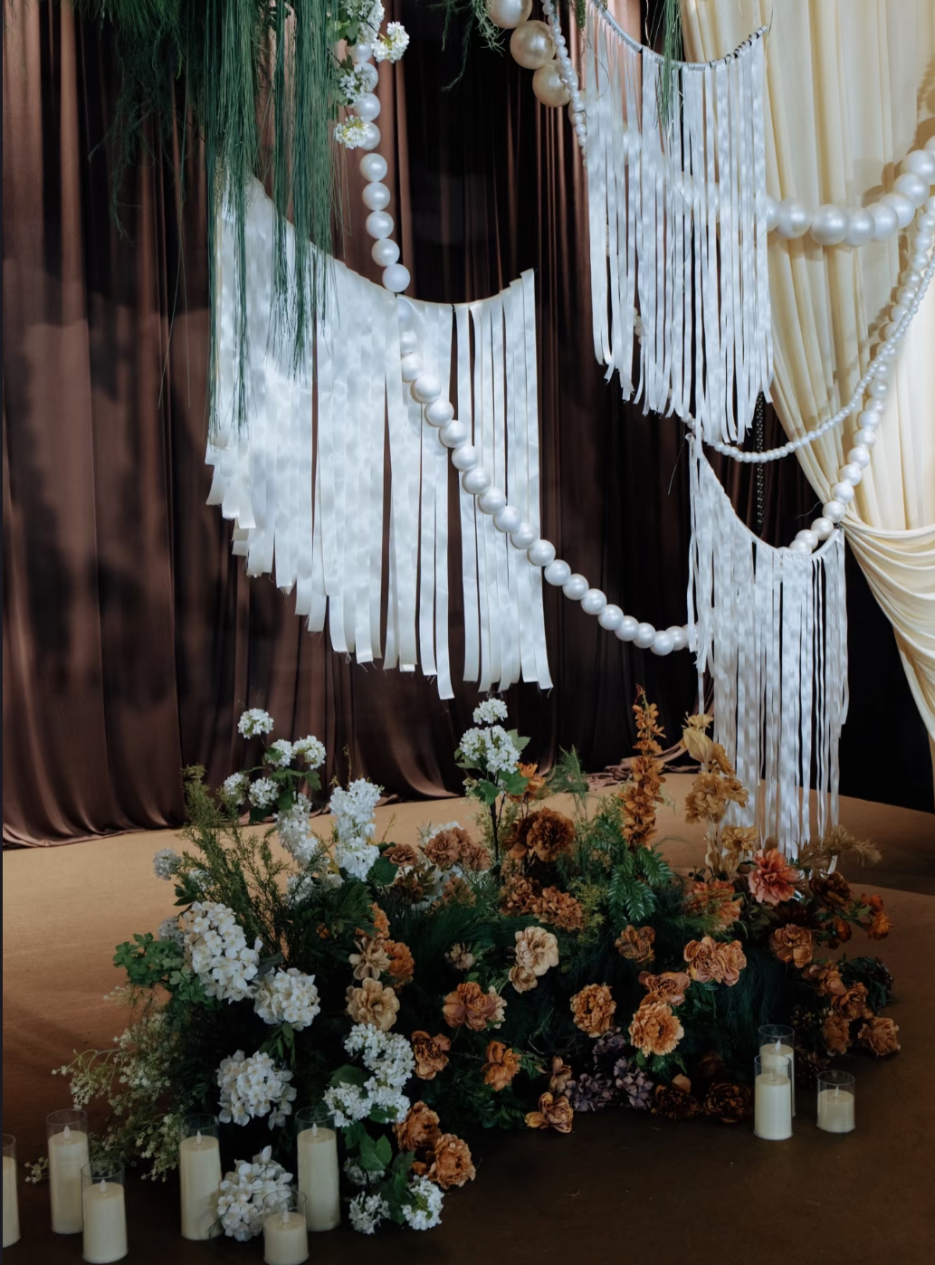 • 米咖布幔+野生花艺=温柔野趣! 两侧用低调高级的米色咖色布幔打底,点缀充满呼吸感的野生感花艺。 完美烘托出自然、松弛又温暖的仪式氛围,和中央大屏的现代感融合得恰到好处。