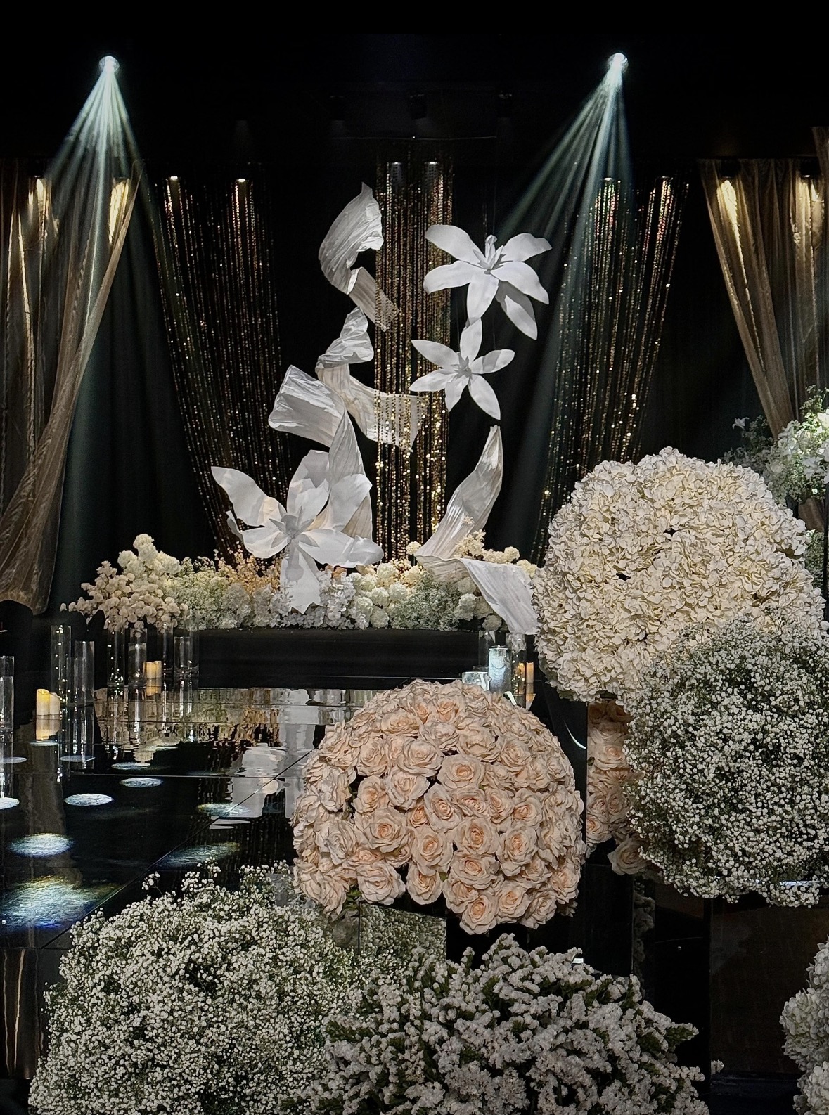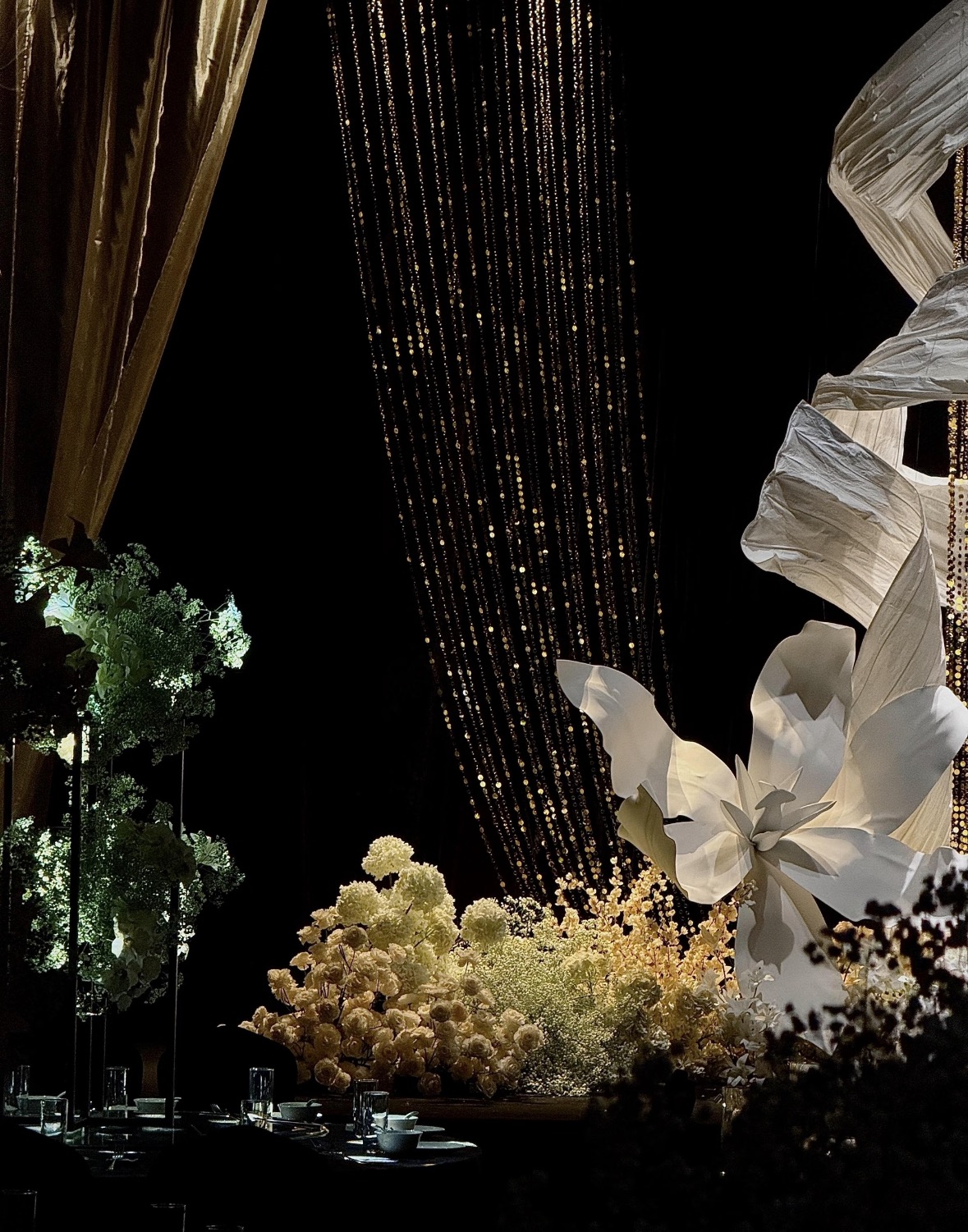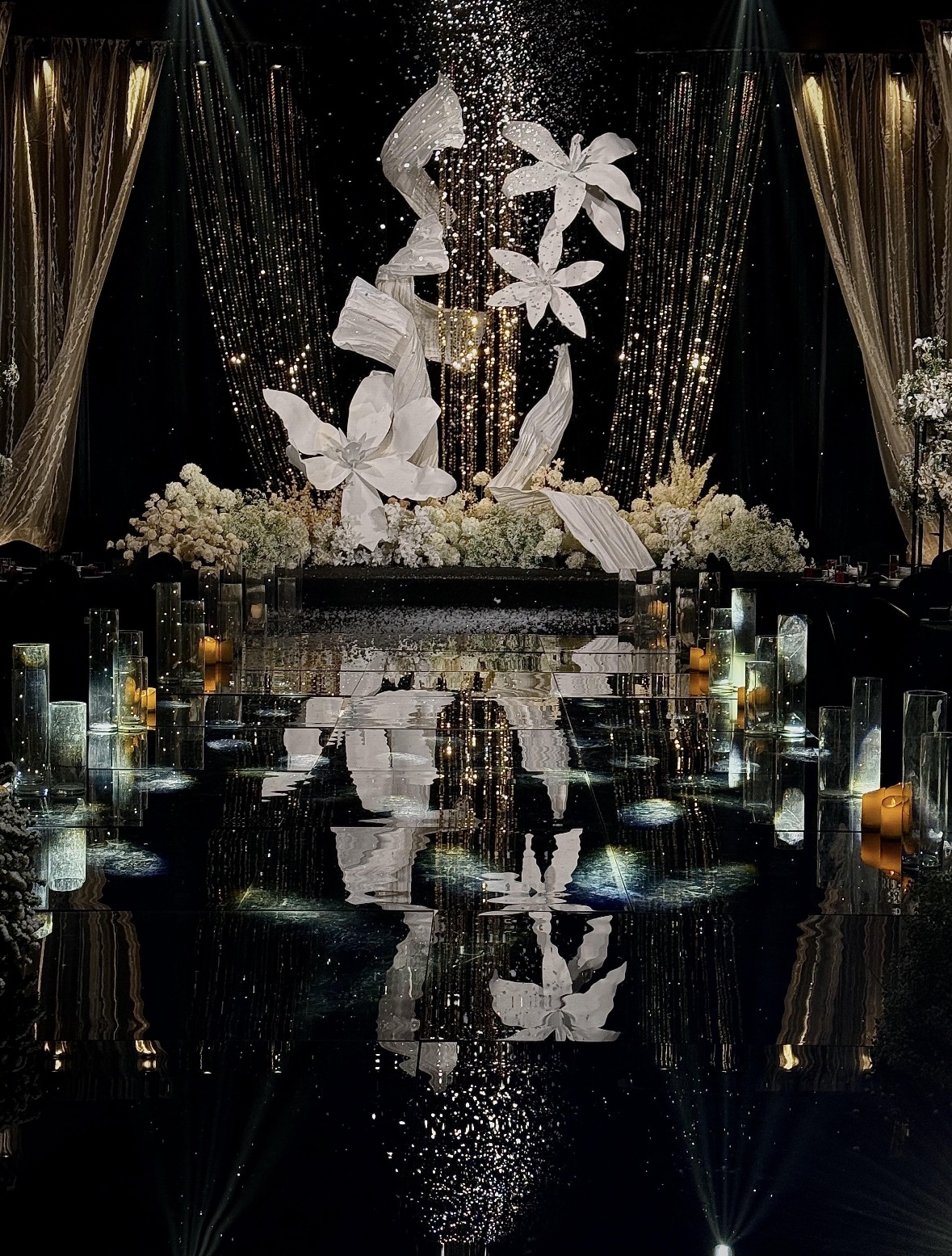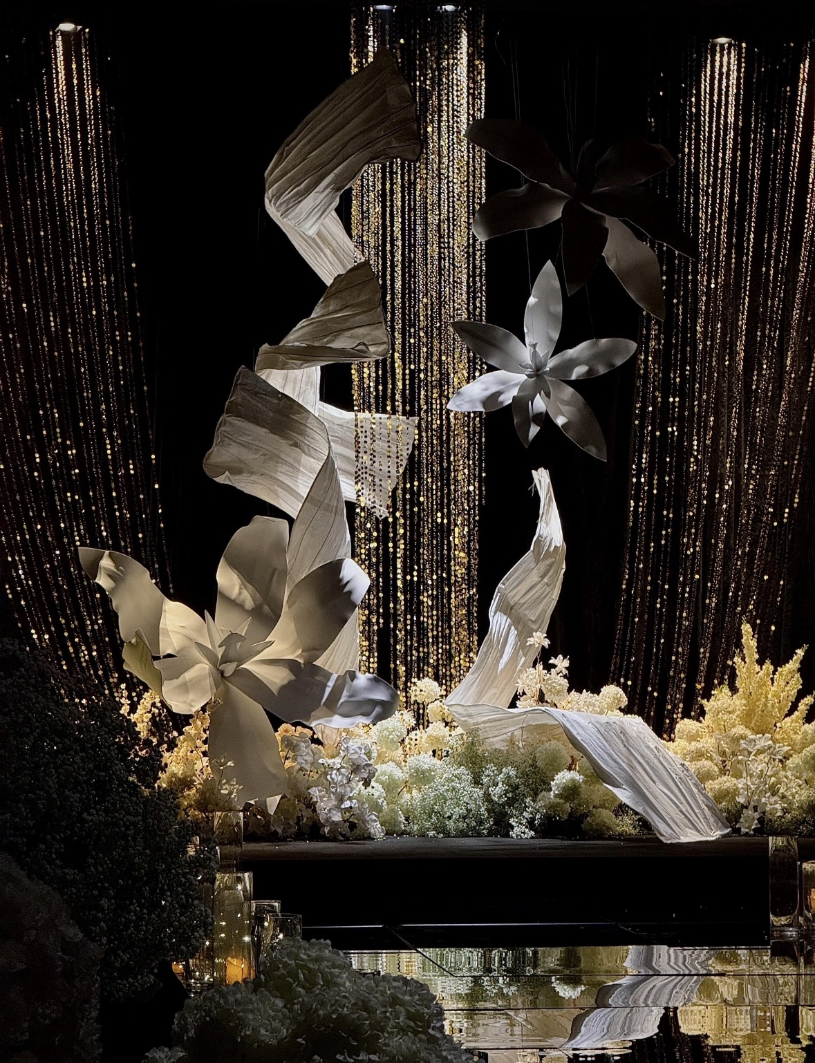 • 巨型艺术纸花装置太吸睛! 褶皱肌理+立体造型 镜面T台+烛光玻璃器皿 光影折射出的层次感 让整个场地高级又浪漫#氛围感婚礼布置