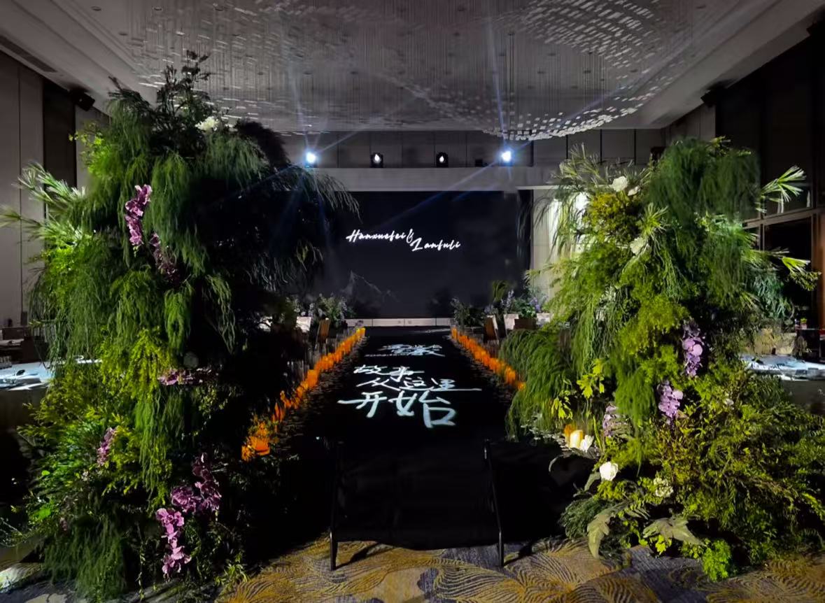 • 布幔元素结合定做的动态屏幕素材,清新的绿植花艺围绕舞台 其实保留led屏幕也可以做得精致出片。