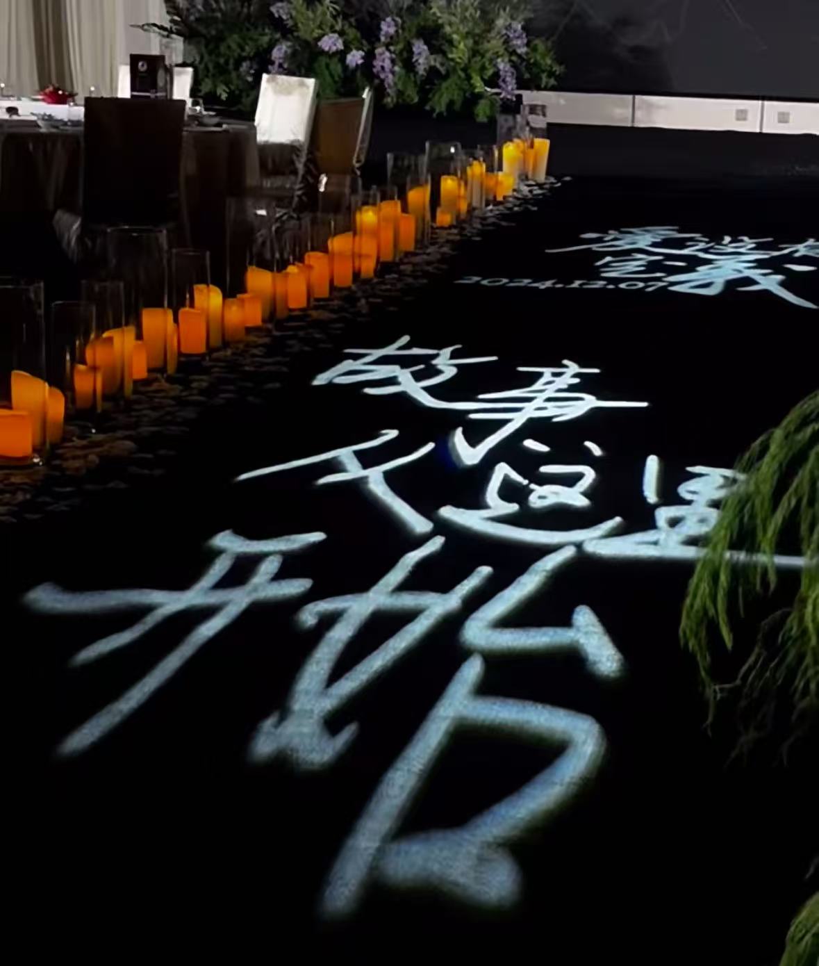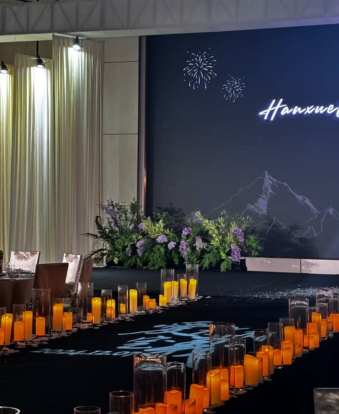 • 今天的婚礼,主打一个简洁高级 丢弃了繁琐的背景布置,一整块LED屏和雪花机的搭配设计,轻盈而纯粹 将冬日里的氛围感直接拉满 舞台两侧以及台口绿色为主的花艺真假搭配,为这个沉闷的冬天带来一丝生机勃勃🌿🌿 除了雪花机和绿植营造出的冬日雪景之外,logo投影灯片也为婚礼带来不一样的感觉