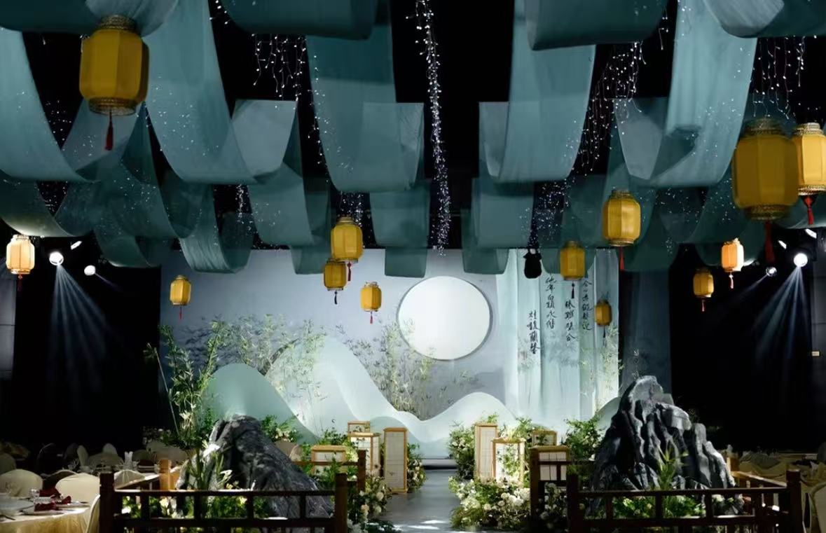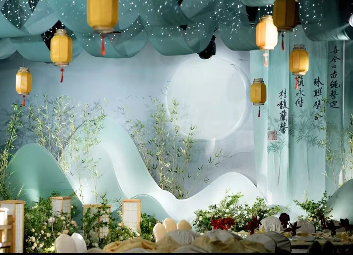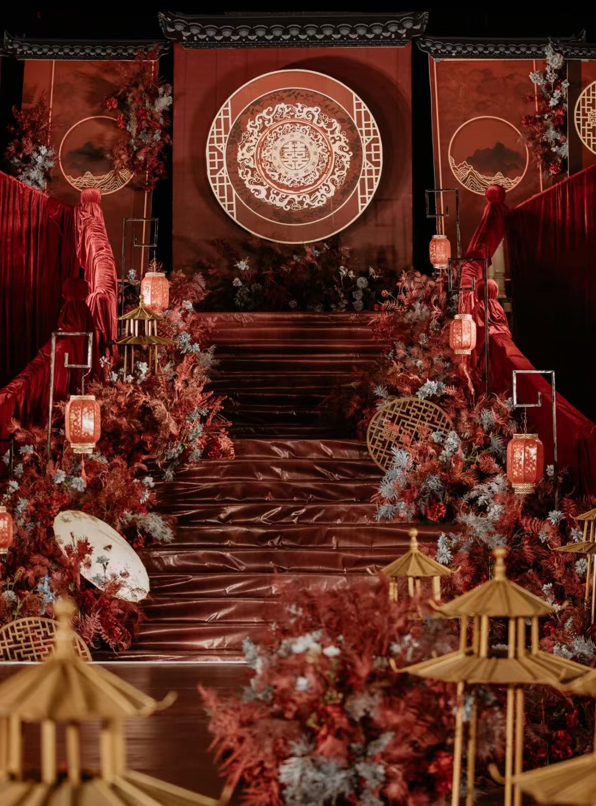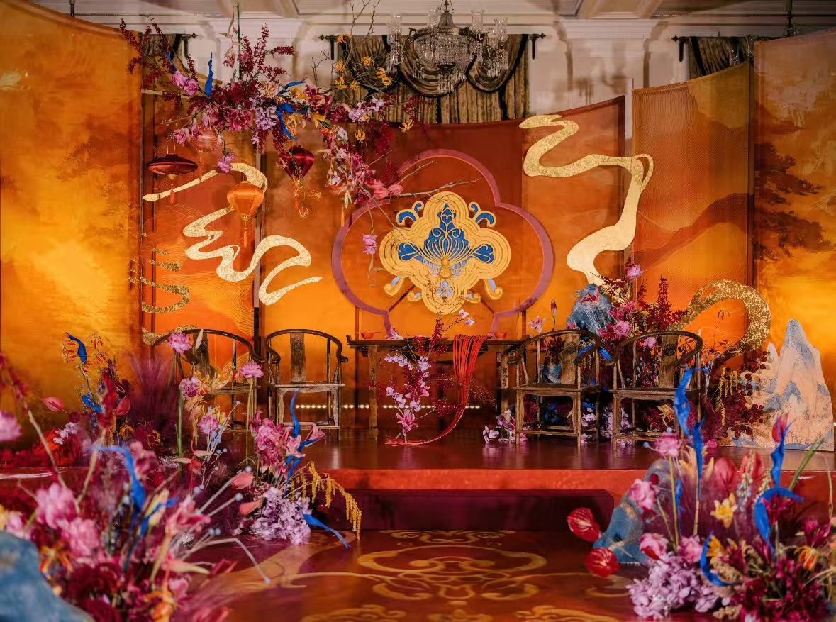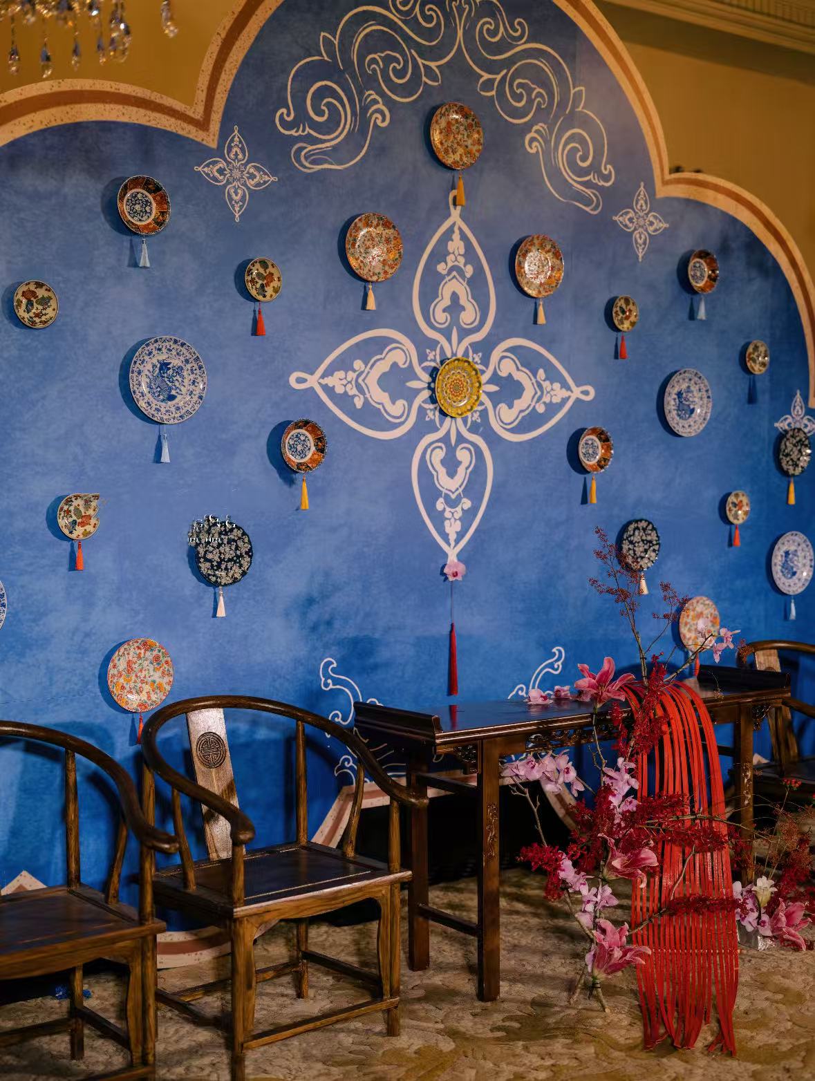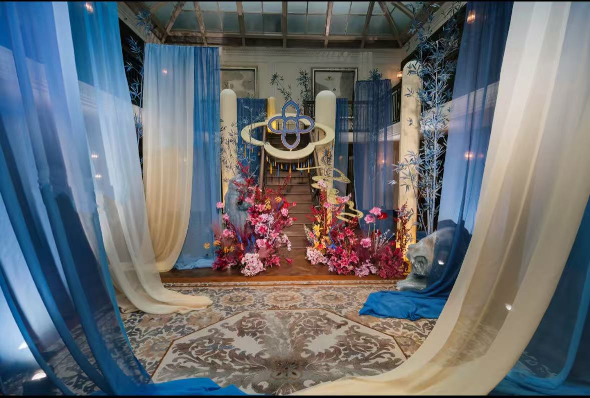 • 蓝黄渐变纱幔变“国风画卷” 正中央柿蒂纹 装置寓意事事如意! 靛蓝祥云背景+唐代瓷器点缀 没有繁杂没有堆砌⛩️