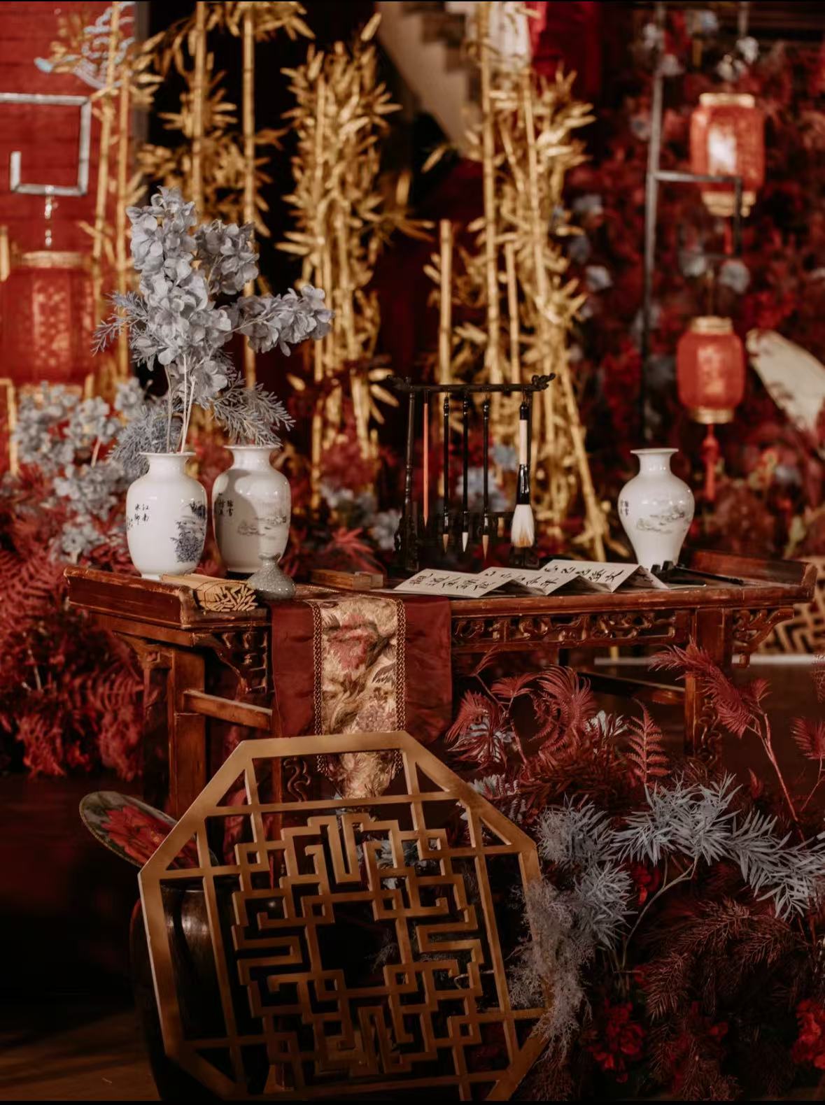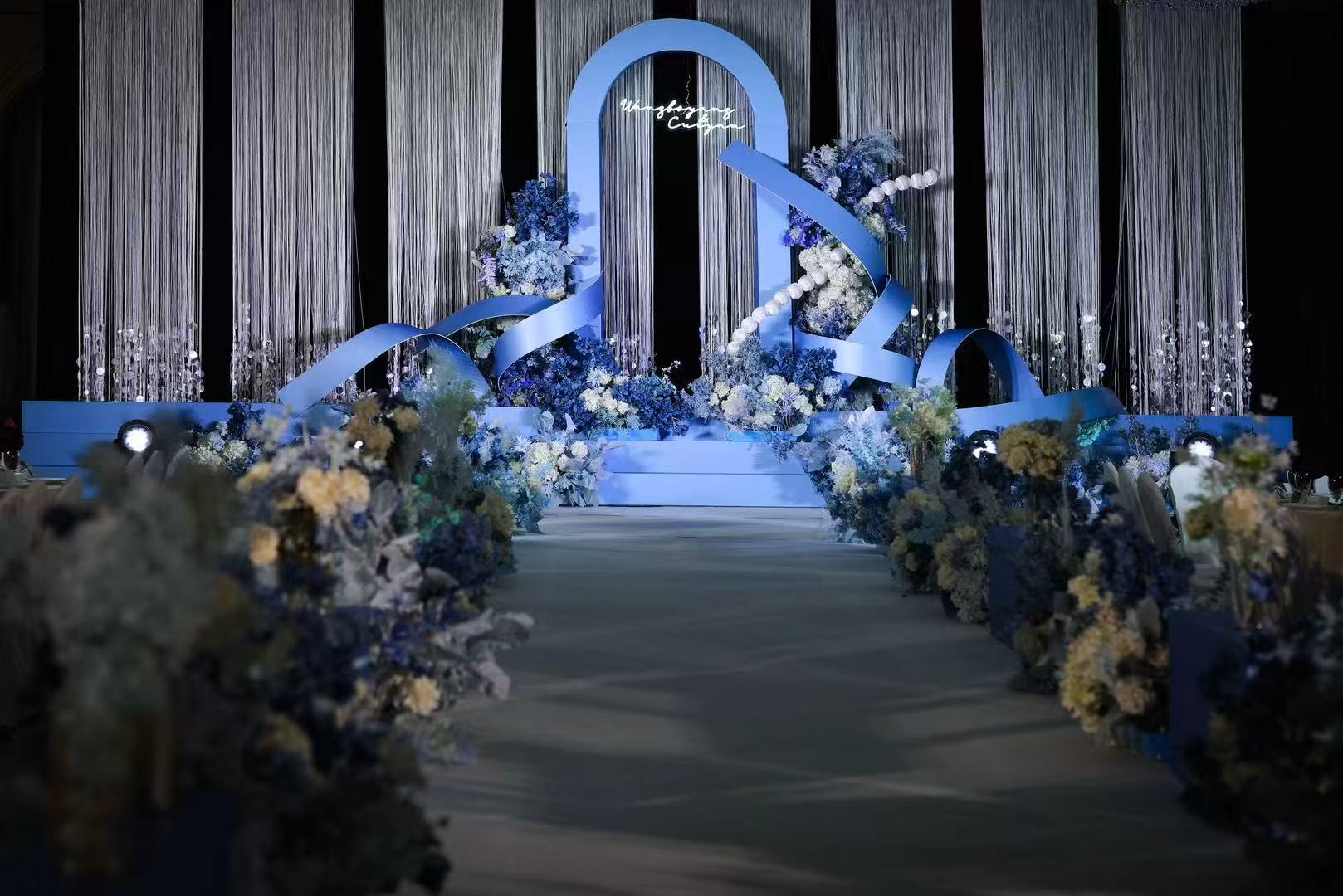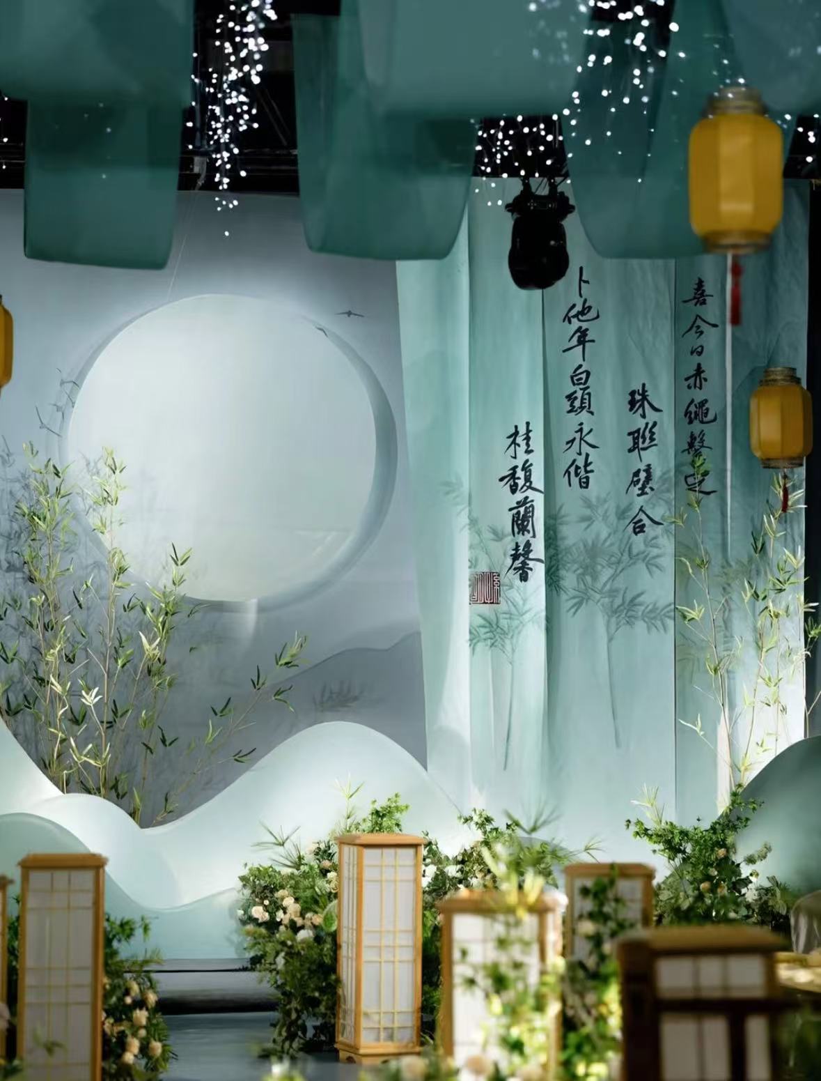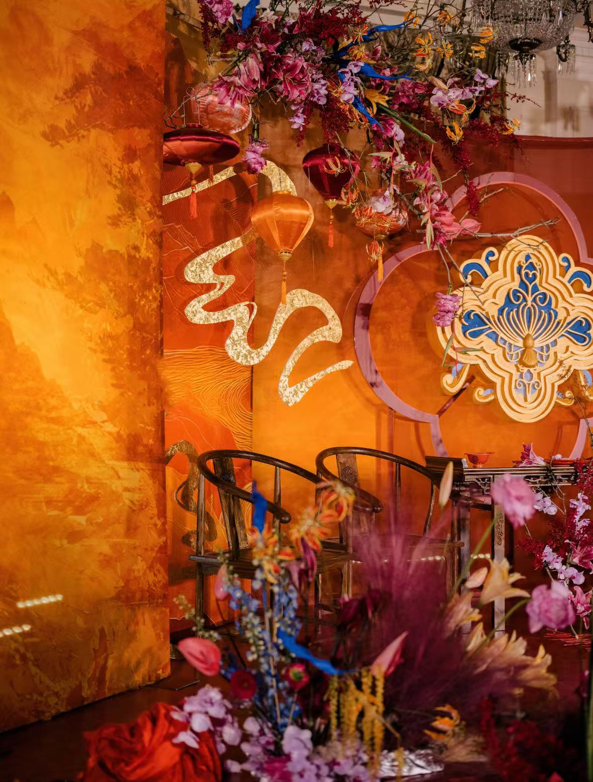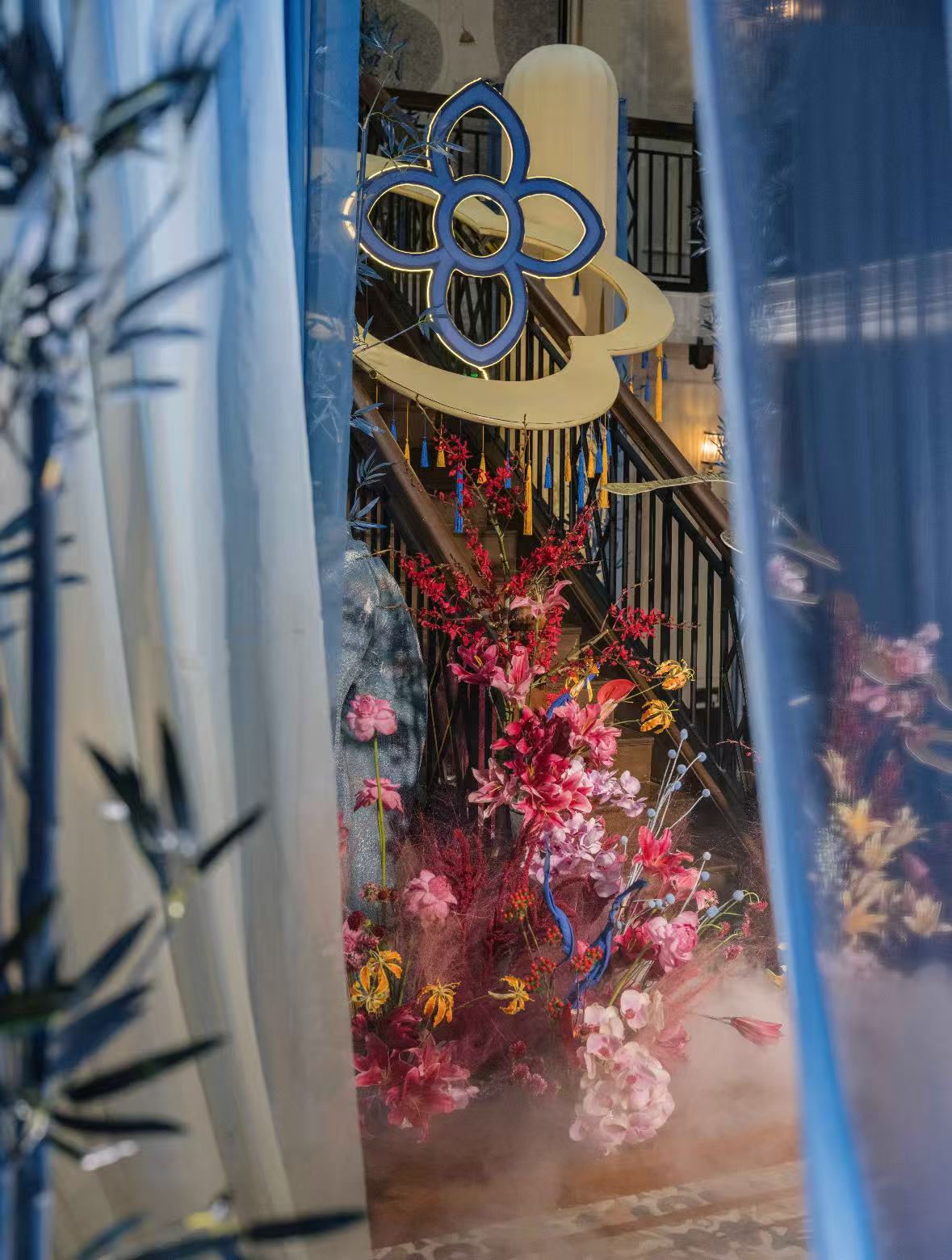 • 蓝黄渐变纱幔变“国风画卷” 正中央柿蒂纹 装置寓意事事如意! 靛蓝祥云背景+唐代瓷器点缀 没有繁杂没有堆砌⛩️
