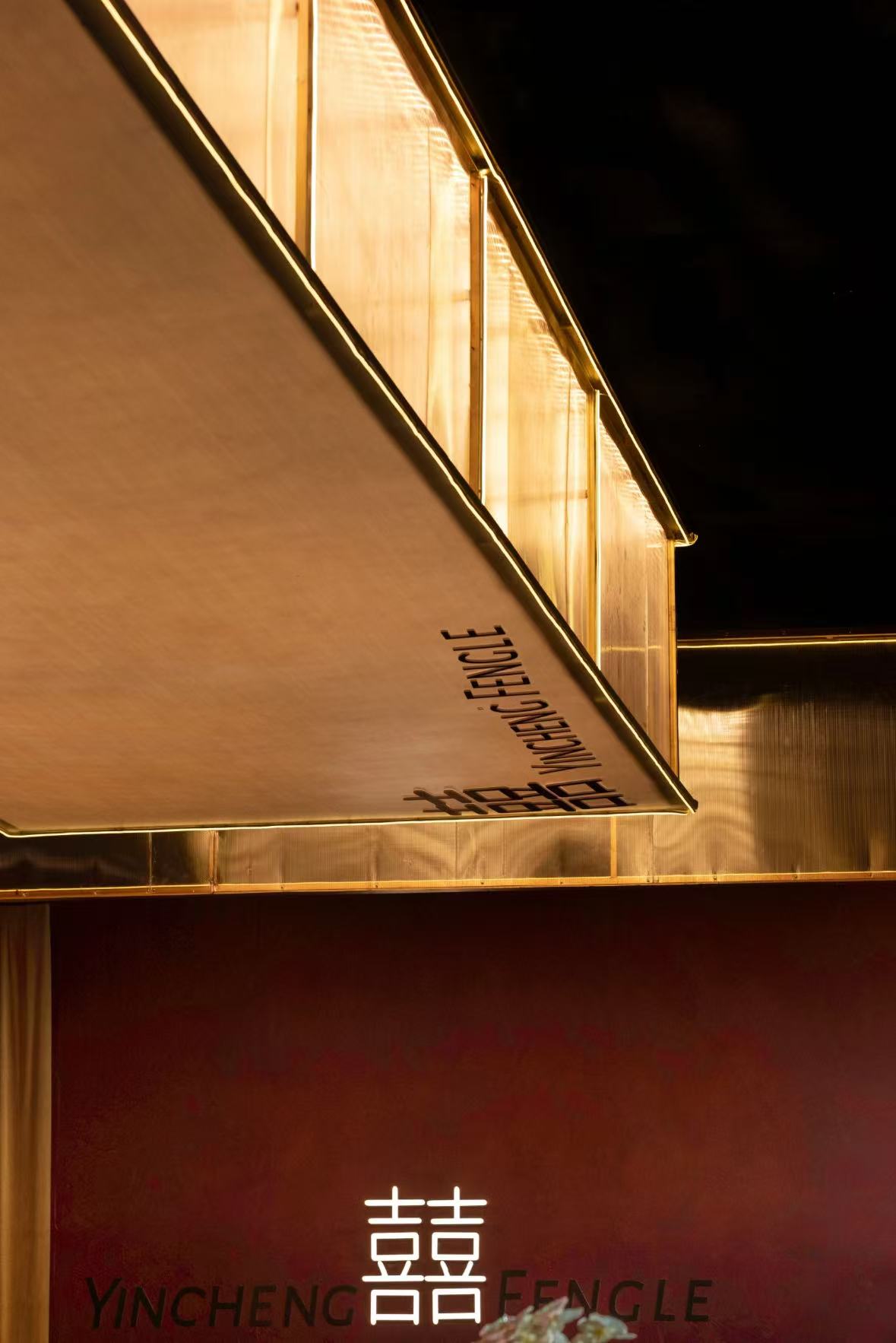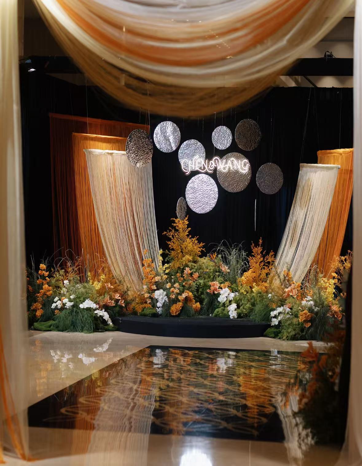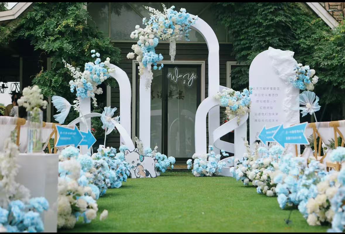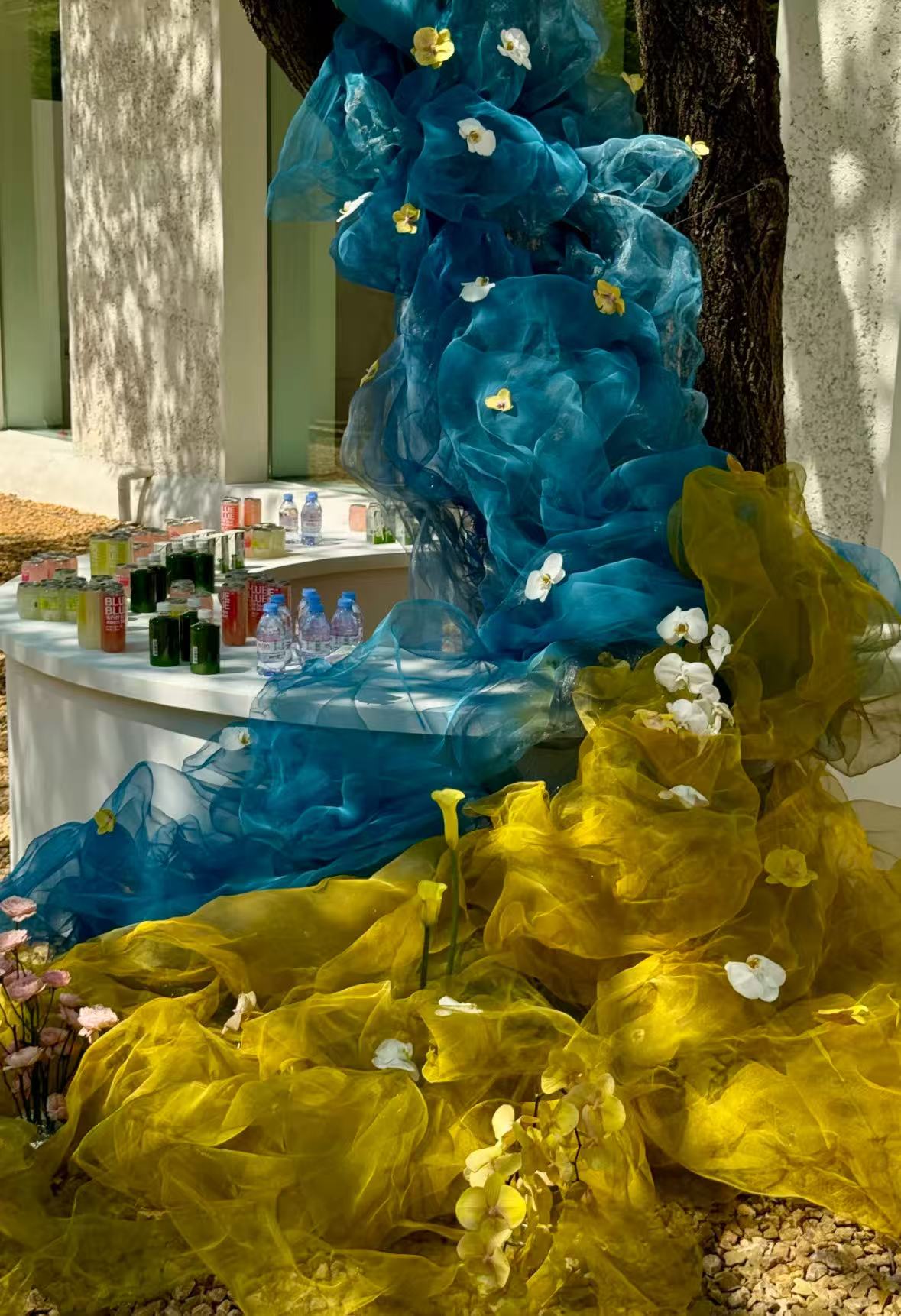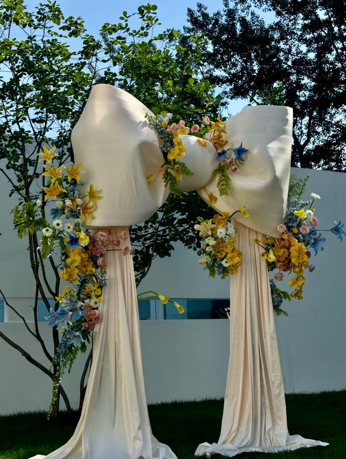 • 蓝黄渐变纱幔变“国风画卷” 正中央柿蒂纹 装置寓意事事如意! 靛蓝祥云背景+唐代瓷器点缀 没有繁杂没有堆砌⛩️