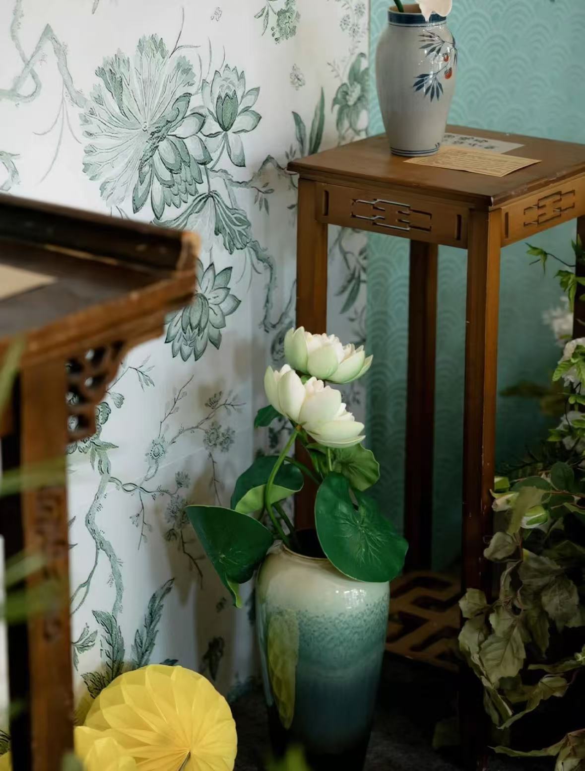 • 婉约轻扬,烟雨朦胧新中式🖼️ 低饱和的青绿色💚不张扬不怯懦 完美诠释了东方人骨子里的低调大气 正值夏日限定的荷花🌸季节 怎能少的了它的🥂灵魂点缀 举手投足之间都是温婉儒雅的氛围