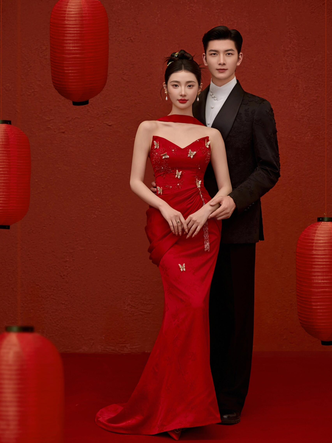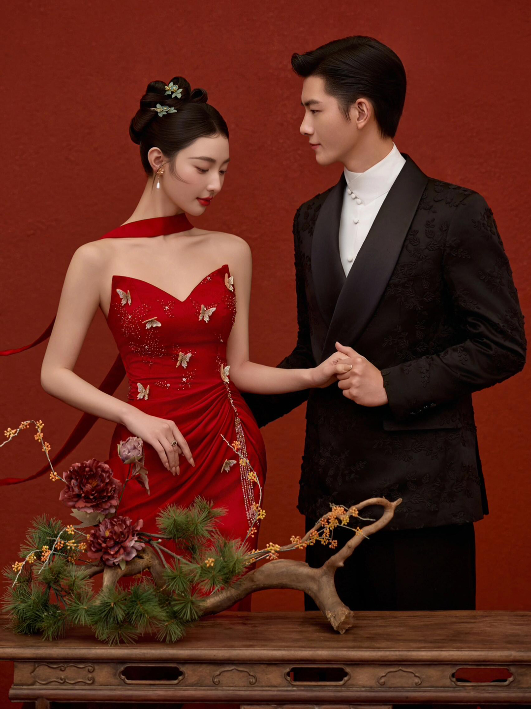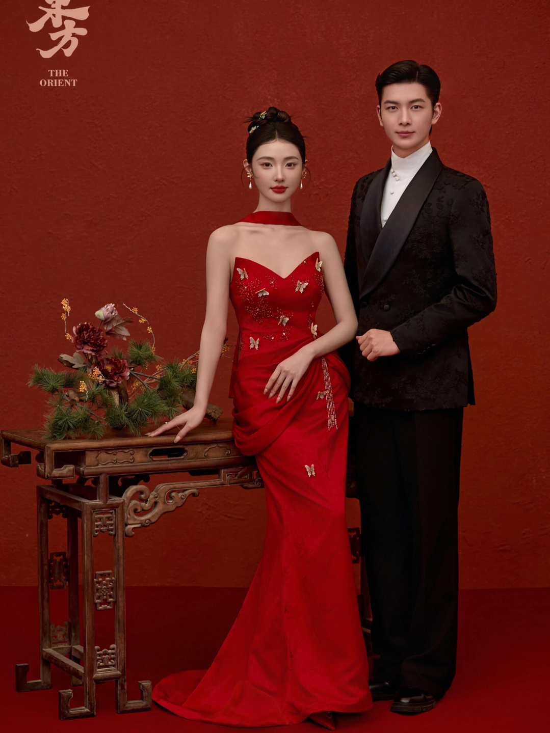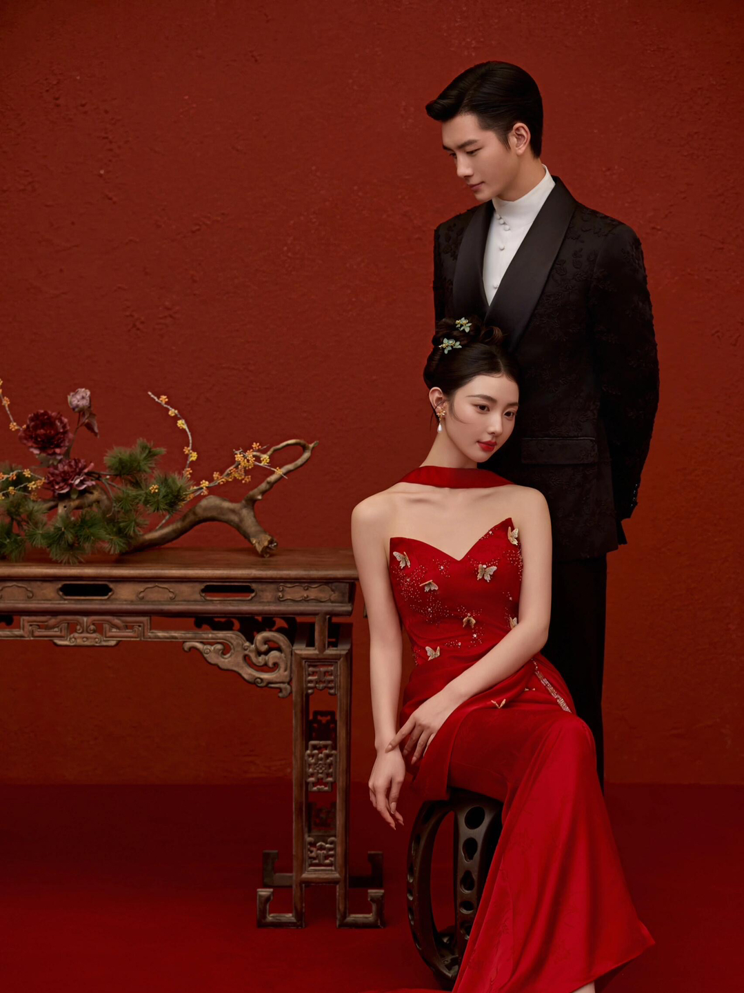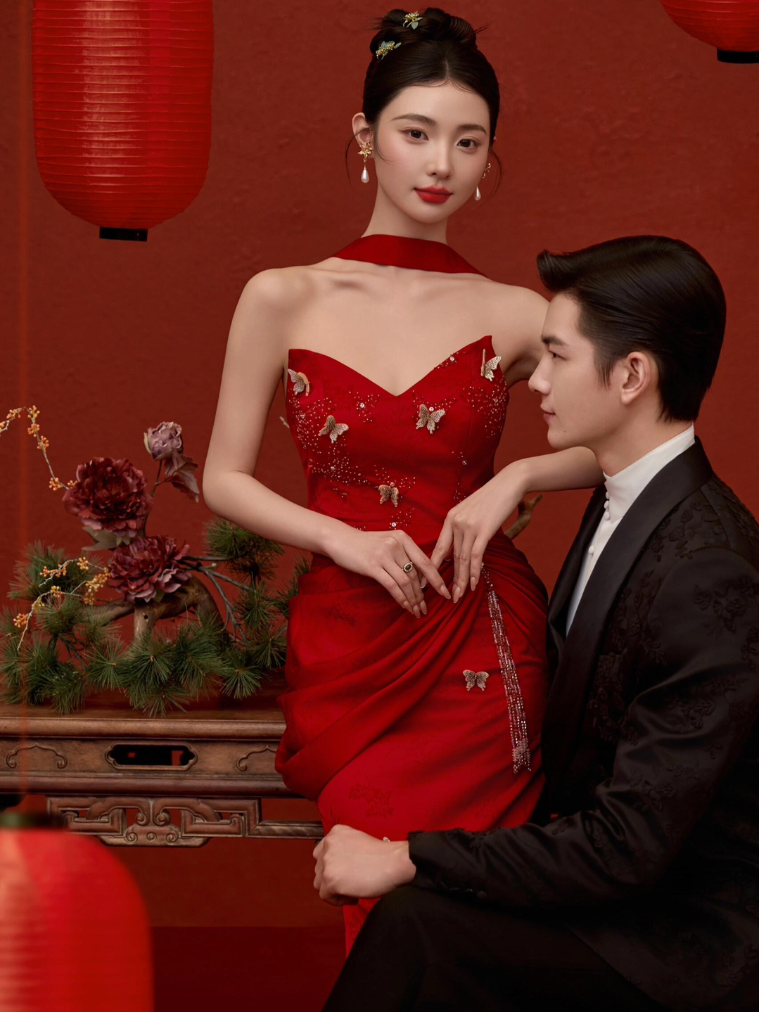 • 女生一袭红色抹胸长裙 裙身上点缀着精致的蝴蝶装饰 优雅又浪漫 男生则是黑色西装,内搭白色衬衫显得稳重又不失风度 背景是浓郁的红色墙面 搭配一张古色古香的木制桌子桌上摆放着一些花卉装饰整个场景充满了东方韵味 两人并肩而立 仿佛从古典画卷中走出的佳人 既有传统的韵味,又不失现代的时尚感 #美出圈的新中式婚纱照