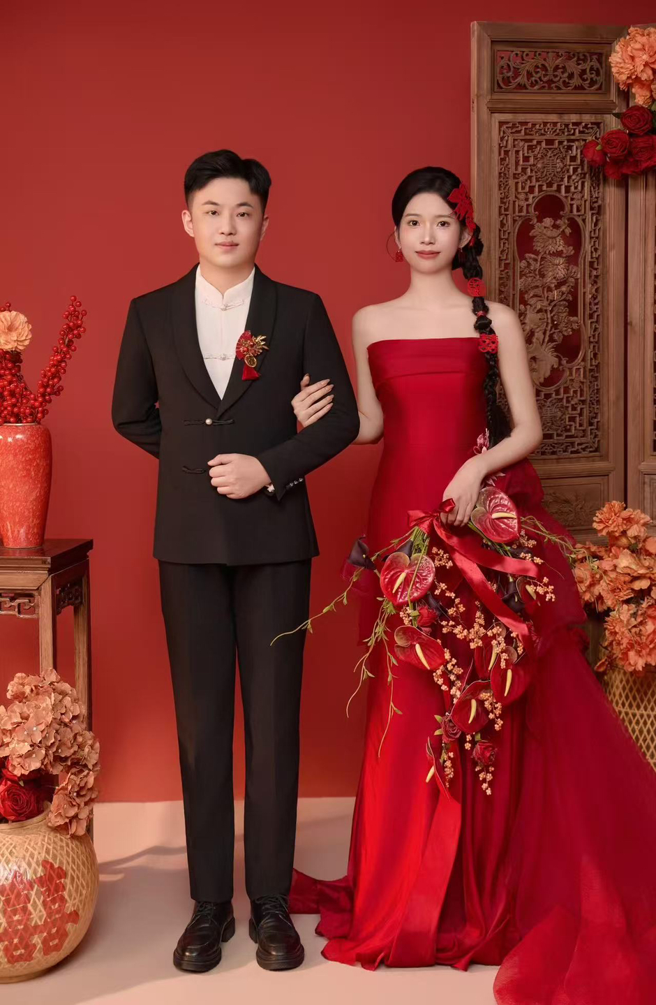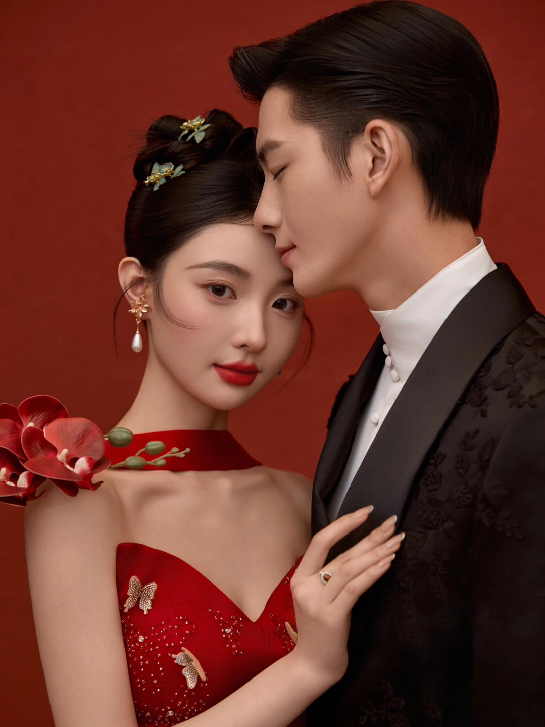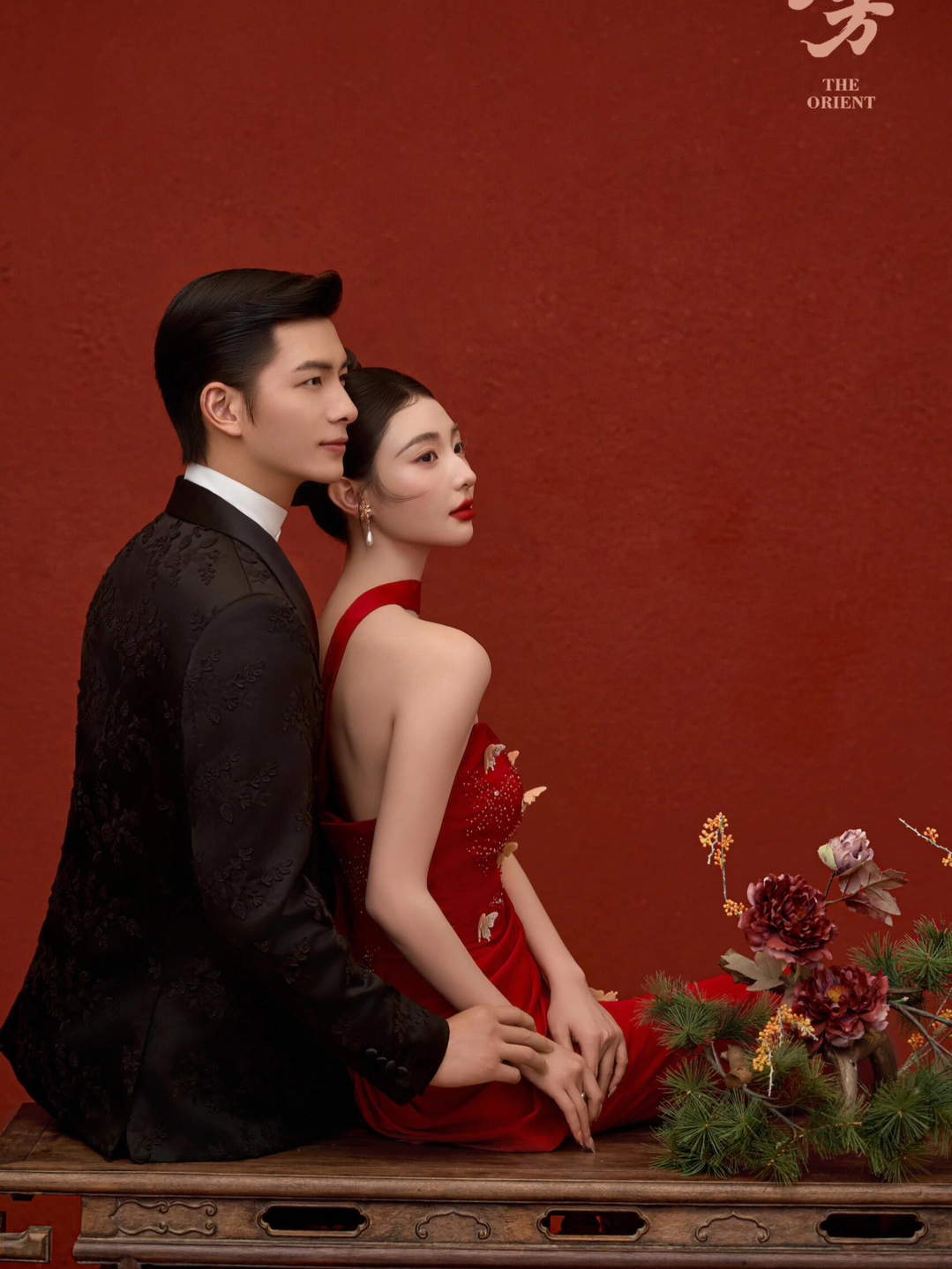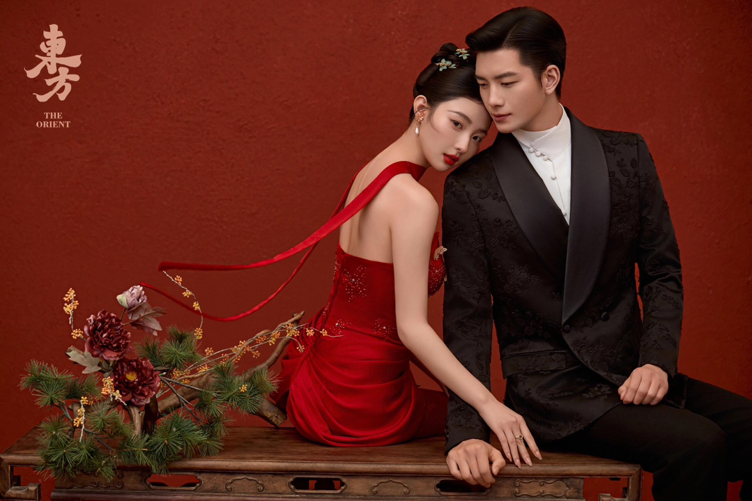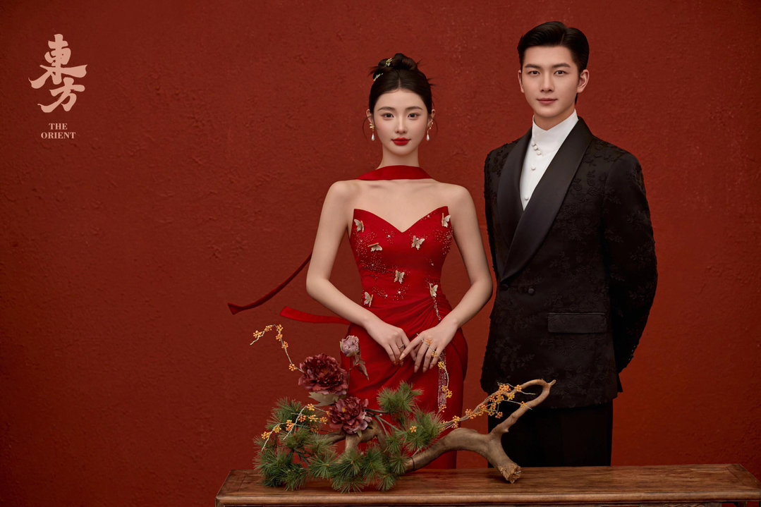 • 女生一袭红色抹胸长裙 裙身上点缀着精致的蝴蝶装饰 优雅又浪漫 男生则是黑色西装,内搭白色衬衫显得稳重又不失风度 背景是浓郁的红色墙面 搭配一张古色古香的木制桌子桌上摆放着一些花卉装饰整个场景充满了东方韵味 两人并肩而立 仿佛从古典画卷中走出的佳人 既有传统的韵味,又不失现代的时尚感 #美出圈的新中式婚纱照