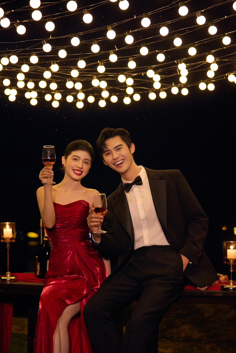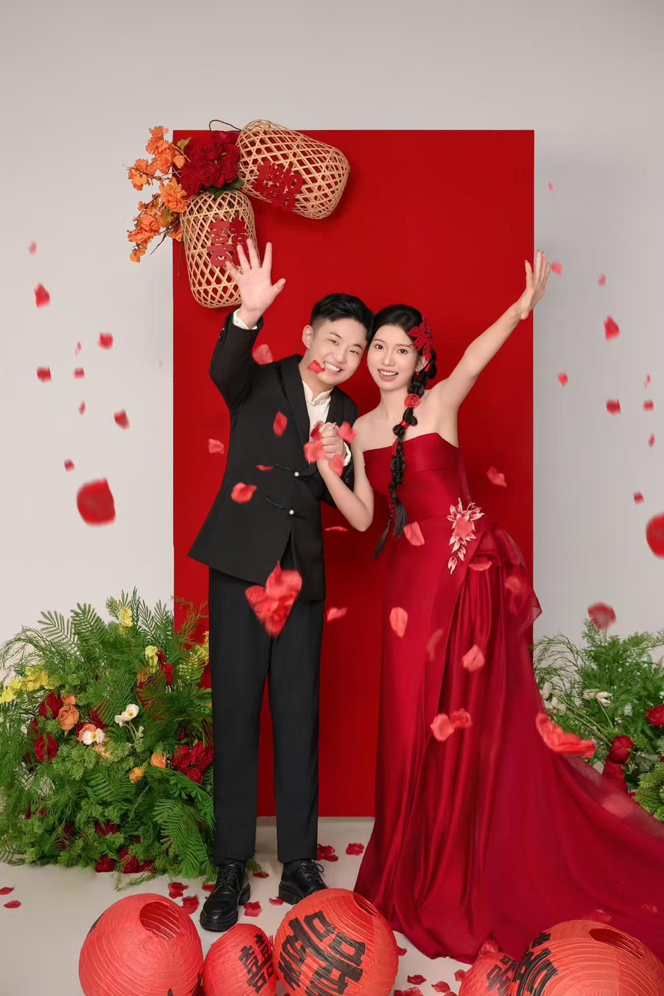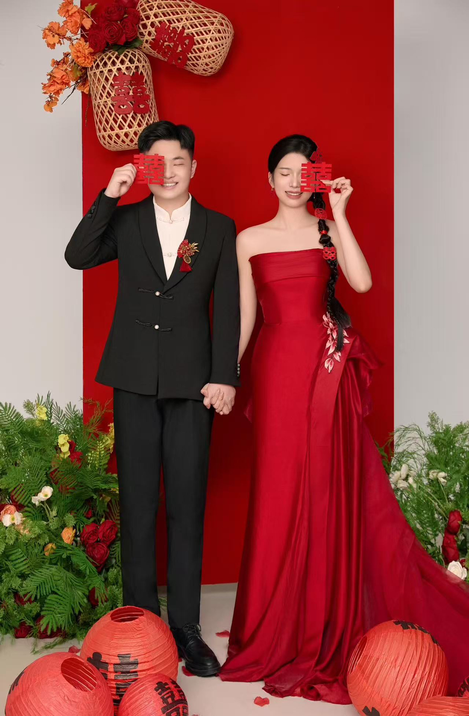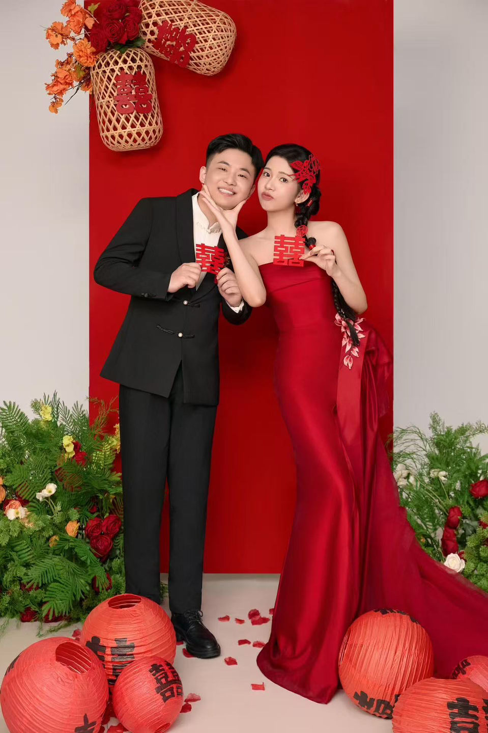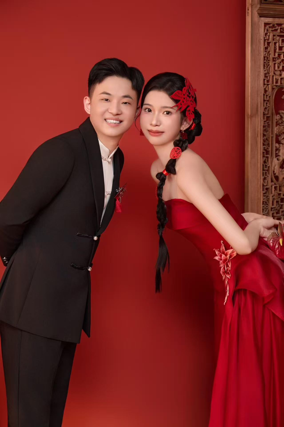 • 女生一袭红色抹胸长裙 裙身上点缀着精致的蝴蝶装饰 优雅又浪漫 男生则是黑色西装,内搭白色衬衫显得稳重又不失风度 背景是浓郁的红色墙面 搭配一张古色古香的木制桌子桌上摆放着一些花卉装饰整个场景充满了东方韵味 两人并肩而立 仿佛从古典画卷中走出的佳人 既有传统的韵味,又不失现代的时尚感 #美出圈的新中式婚纱照