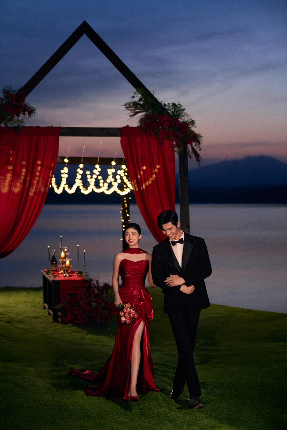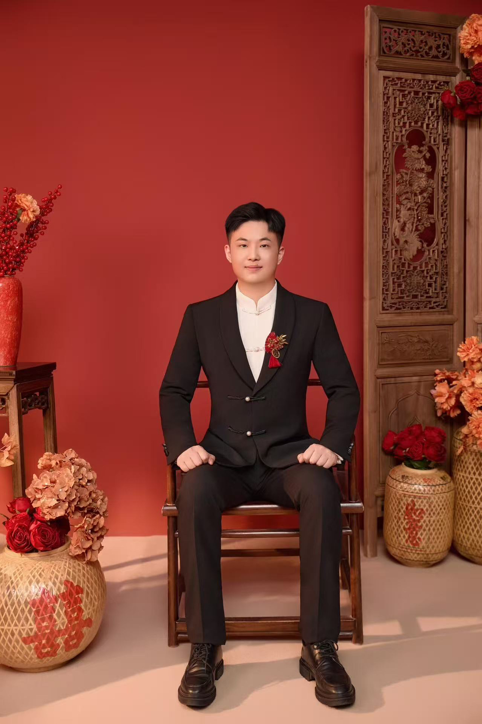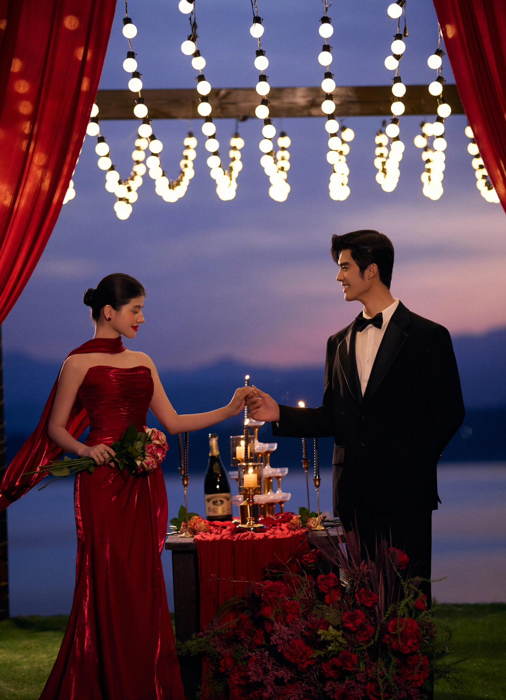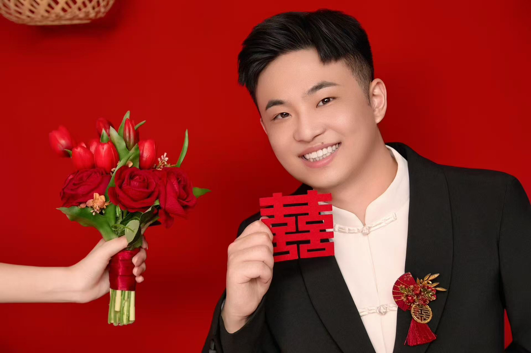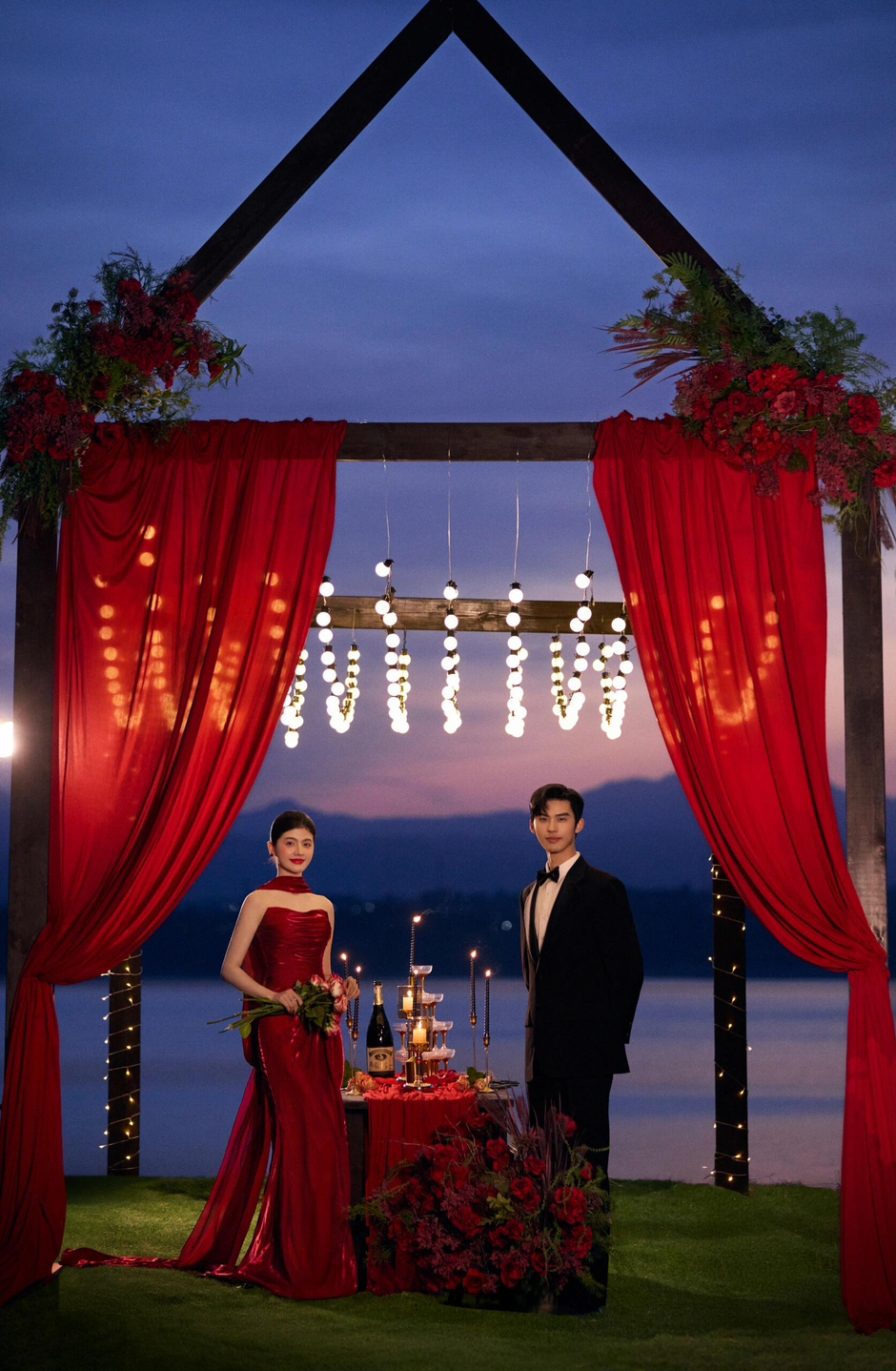 • 女生一袭红色抹胸长裙 裙身上点缀着精致的蝴蝶装饰 优雅又浪漫 男生则是黑色西装,内搭白色衬衫显得稳重又不失风度 背景是浓郁的红色墙面 搭配一张古色古香的木制桌子桌上摆放着一些花卉装饰整个场景充满了东方韵味 两人并肩而立 仿佛从古典画卷中走出的佳人 既有传统的韵味,又不失现代的时尚感 #美出圈的新中式婚纱照