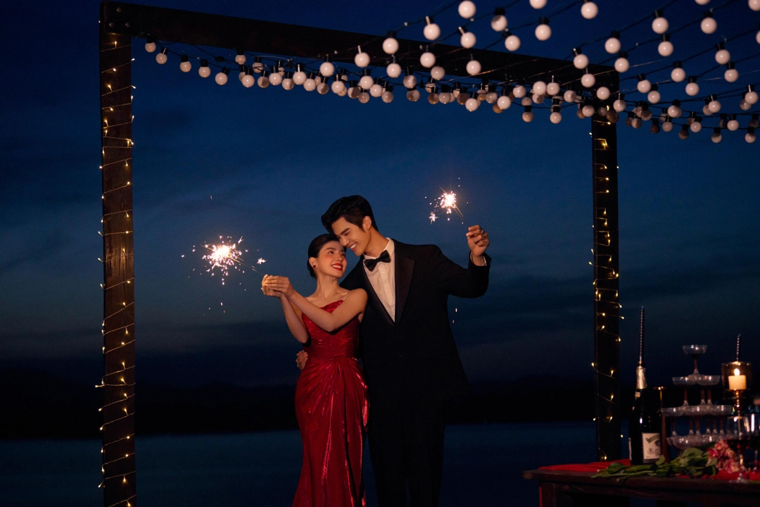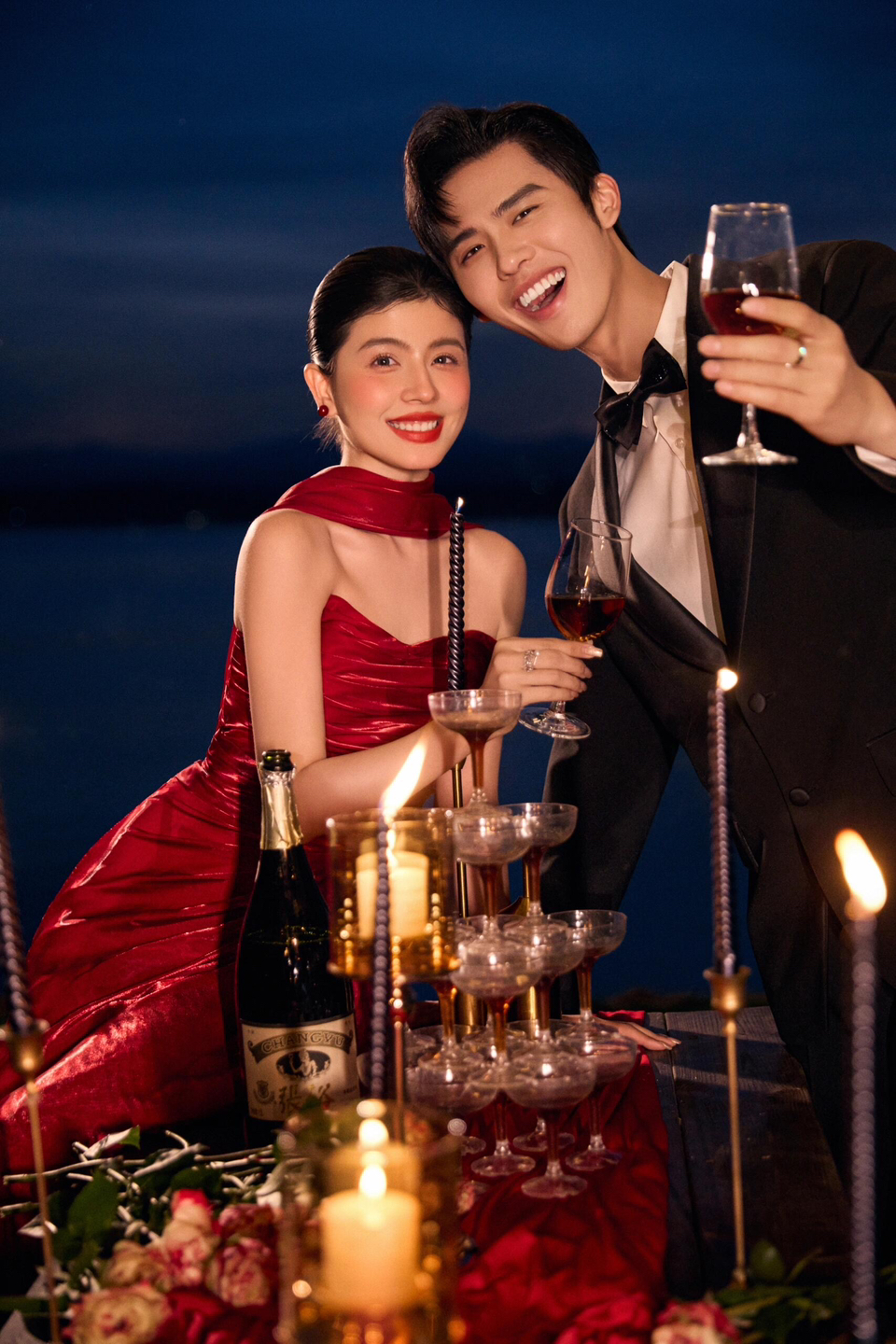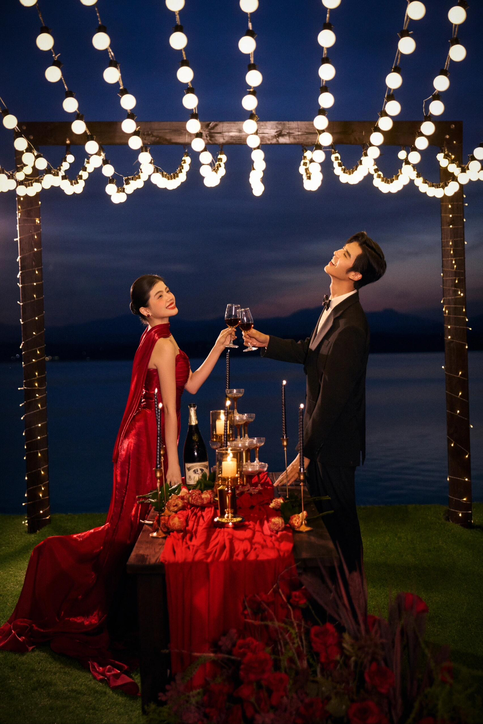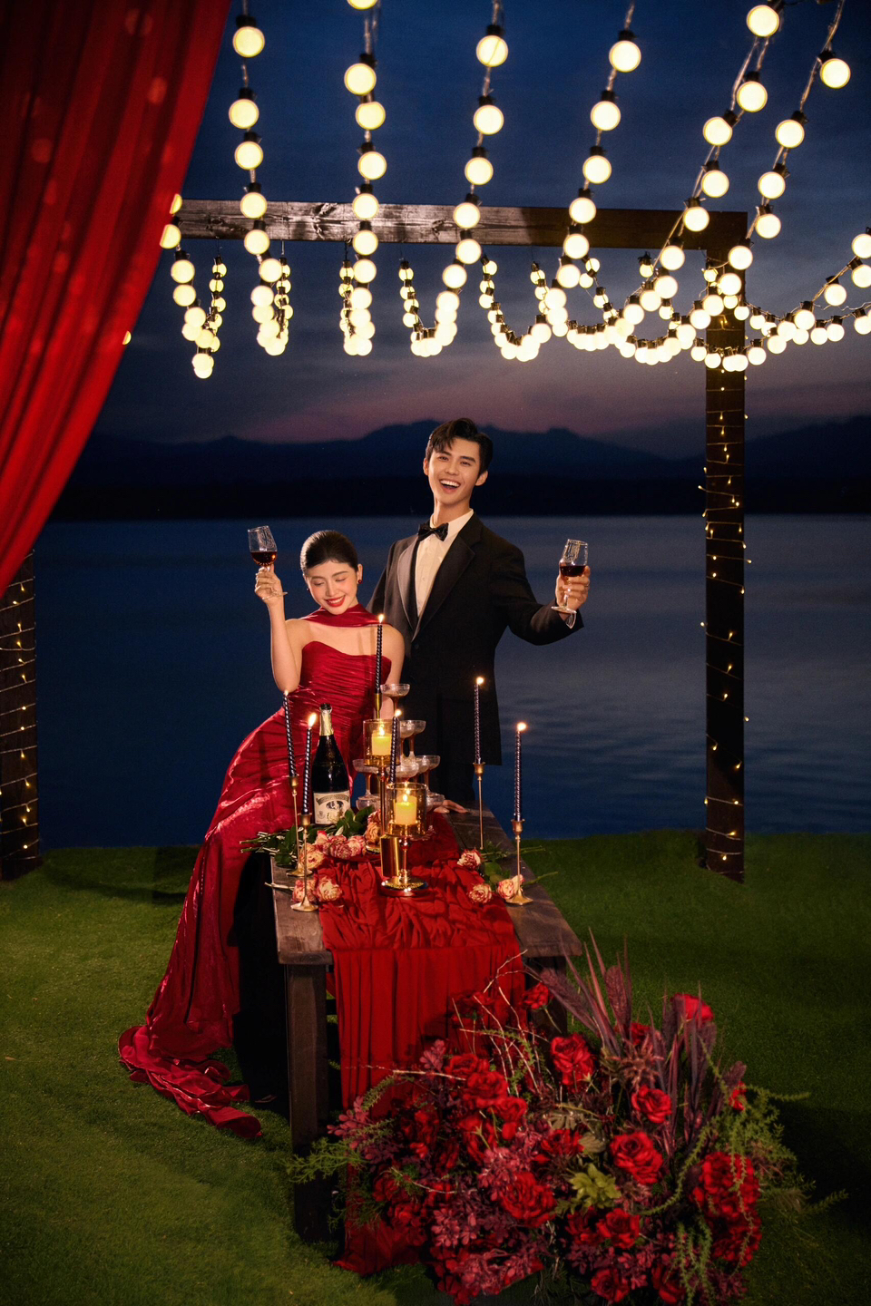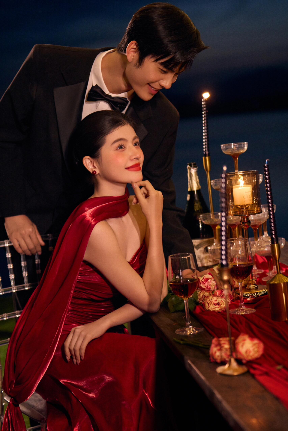 • 女生一袭红色抹胸长裙 裙身上点缀着精致的蝴蝶装饰 优雅又浪漫 男生则是黑色西装,内搭白色衬衫显得稳重又不失风度 背景是浓郁的红色墙面 搭配一张古色古香的木制桌子桌上摆放着一些花卉装饰整个场景充满了东方韵味 两人并肩而立 仿佛从古典画卷中走出的佳人 既有传统的韵味,又不失现代的时尚感 #美出圈的新中式婚纱照