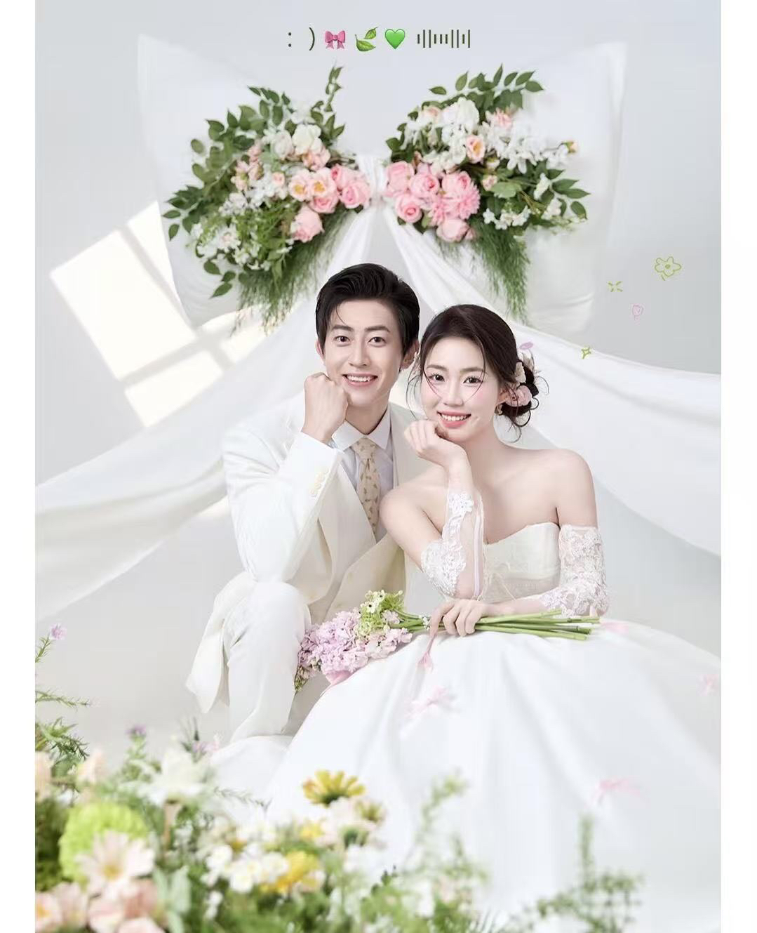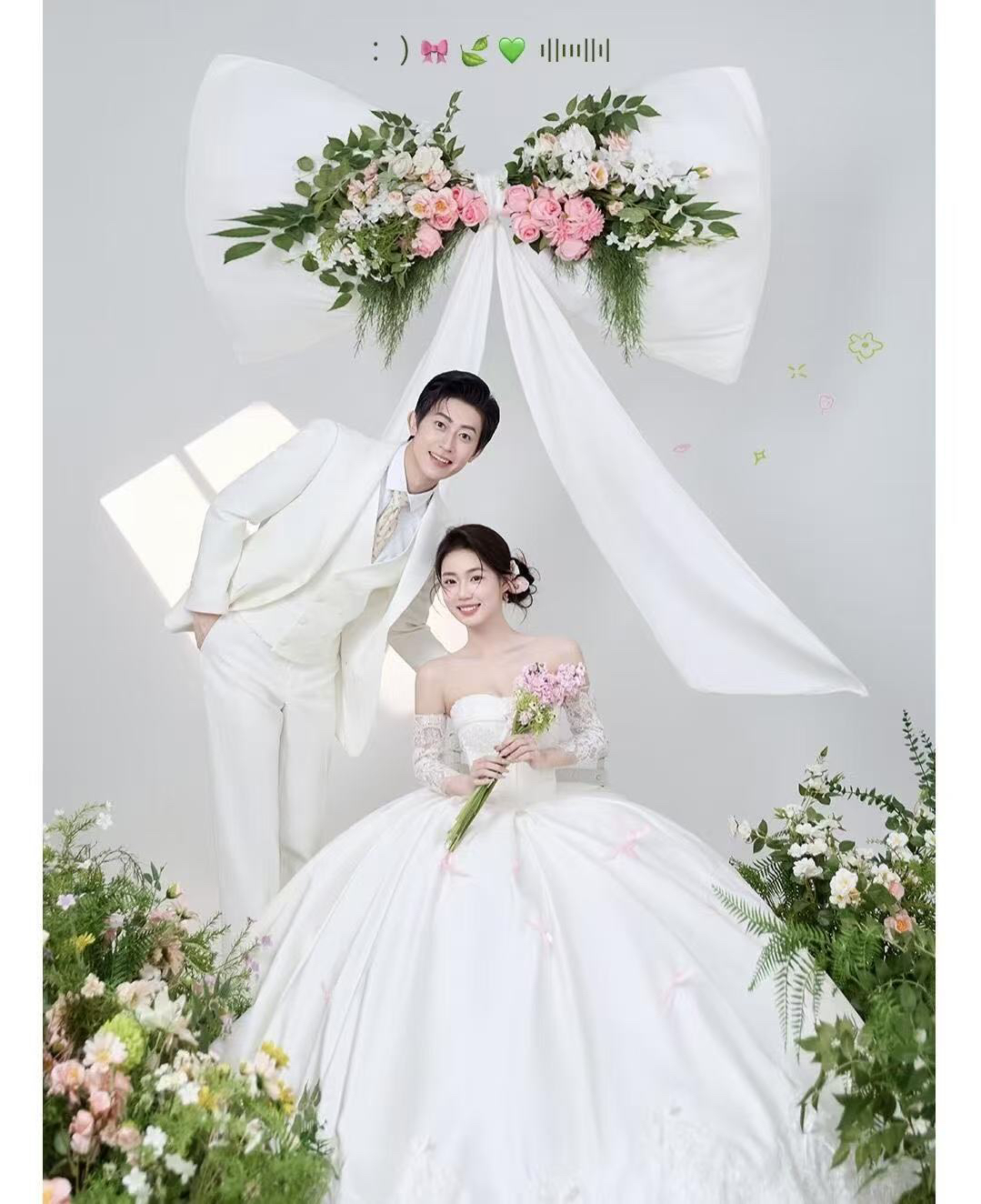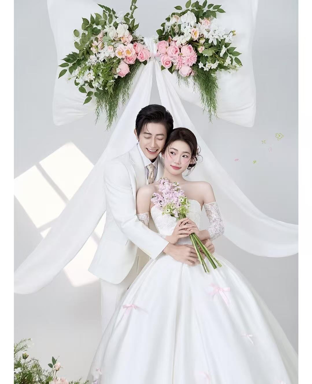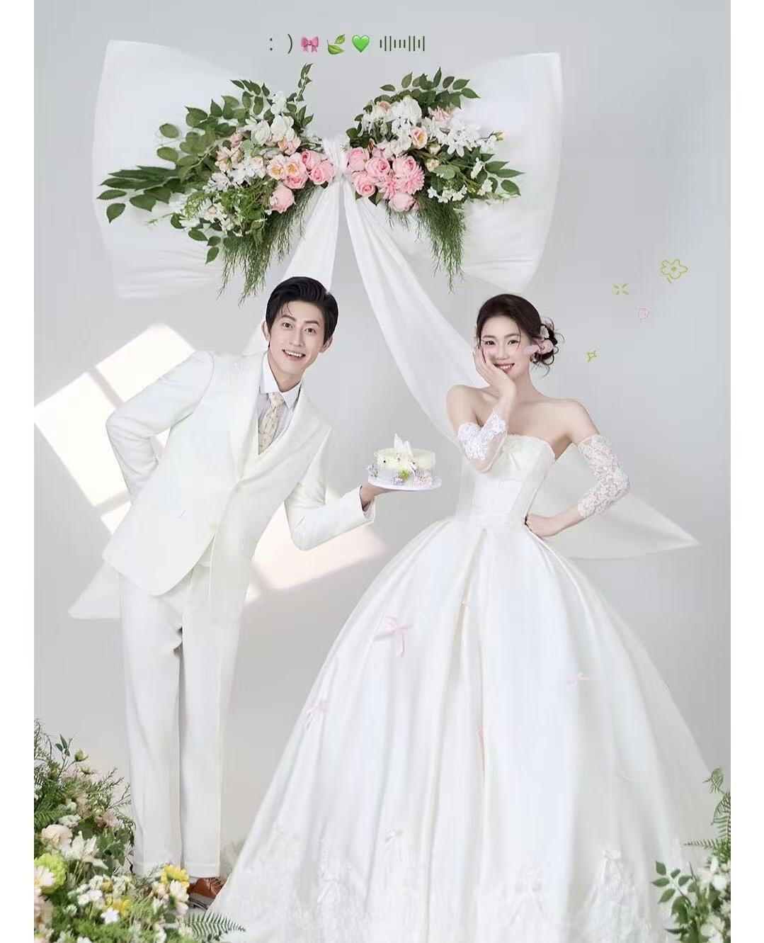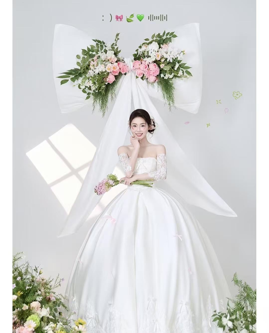 • 巨型缎面蝴蝶结+花簇装饰直接把“童话感”拉满 新娘的抹胸白纱和新郎的奶油白西装像从棉花糖里走出来的情侣~ 伸手互动的瞬间,连空气都在冒甜泡泡!~ 朋友说这组像“迪士尼公主的婚礼现场”长辈看了直夸“干净又高级”! 极简背景+巨型装饰的反差感,出片率直接达 #韩式花房婚纱照