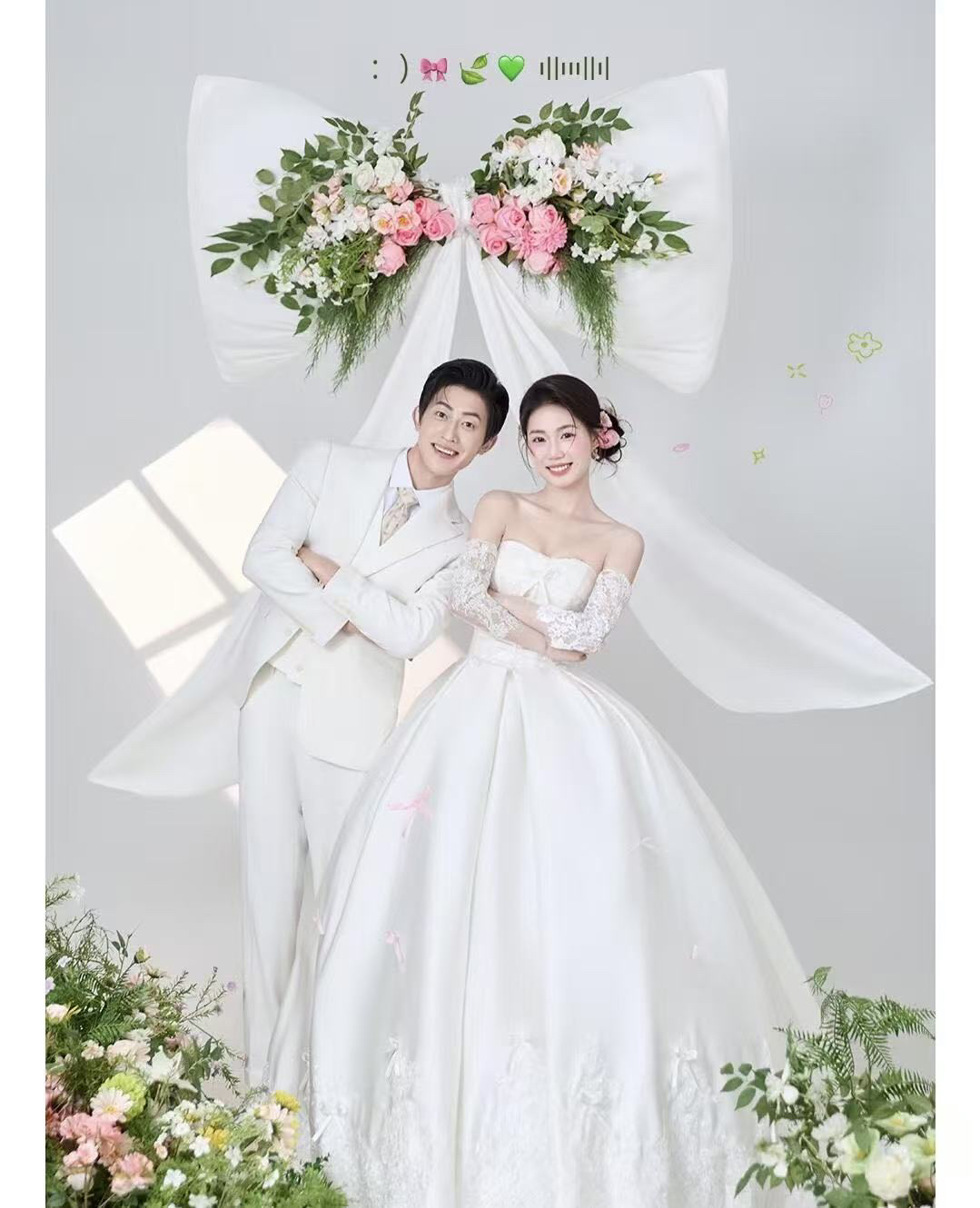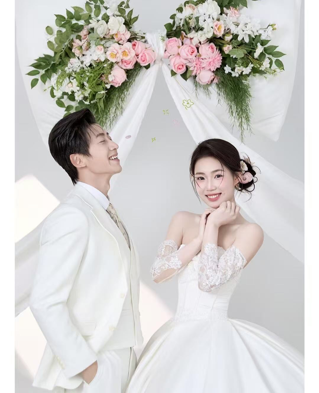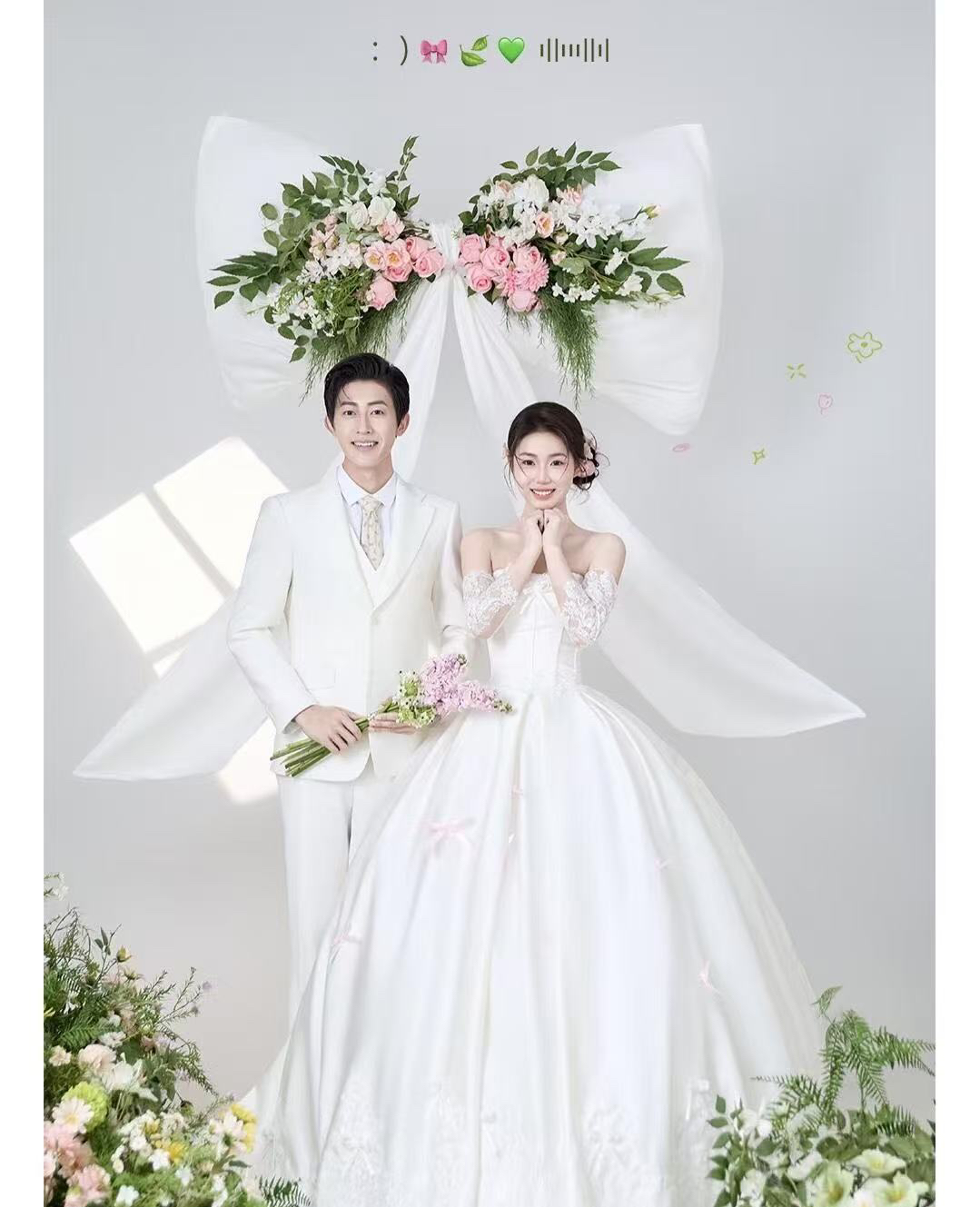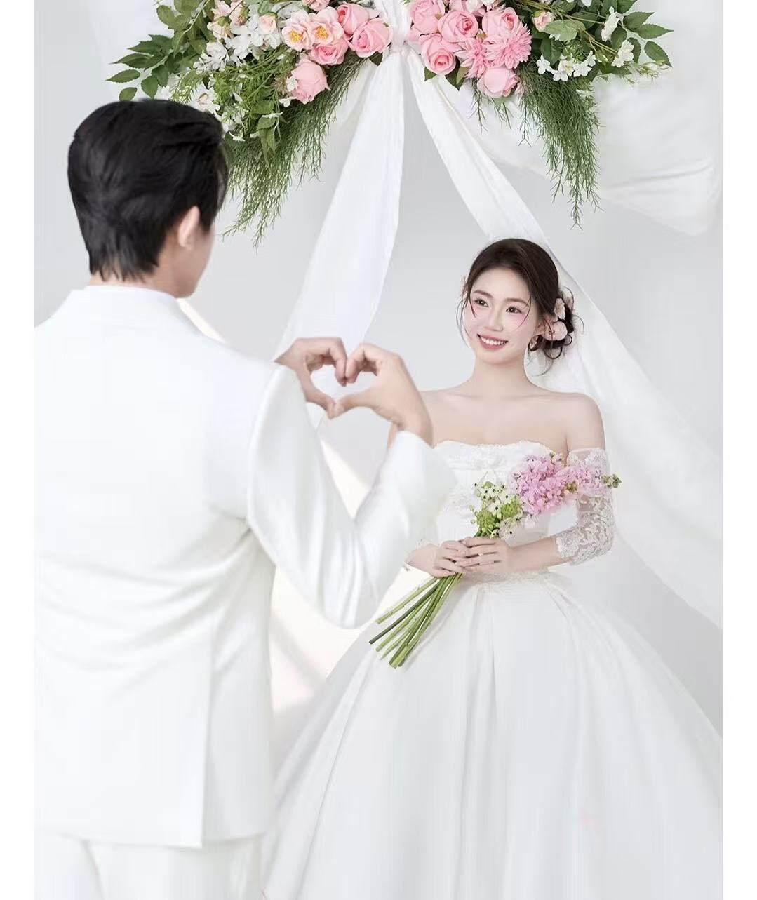 • 巨型缎面蝴蝶结+花簇装饰直接把“童话感”拉满 新娘的抹胸白纱和新郎的奶油白西装像从棉花糖里走出来的情侣~ 伸手互动的瞬间,连空气都在冒甜泡泡!~ 朋友说这组像“迪士尼公主的婚礼现场”长辈看了直夸“干净又高级”! 极简背景+巨型装饰的反差感,出片率直接达 #韩式花房婚纱照