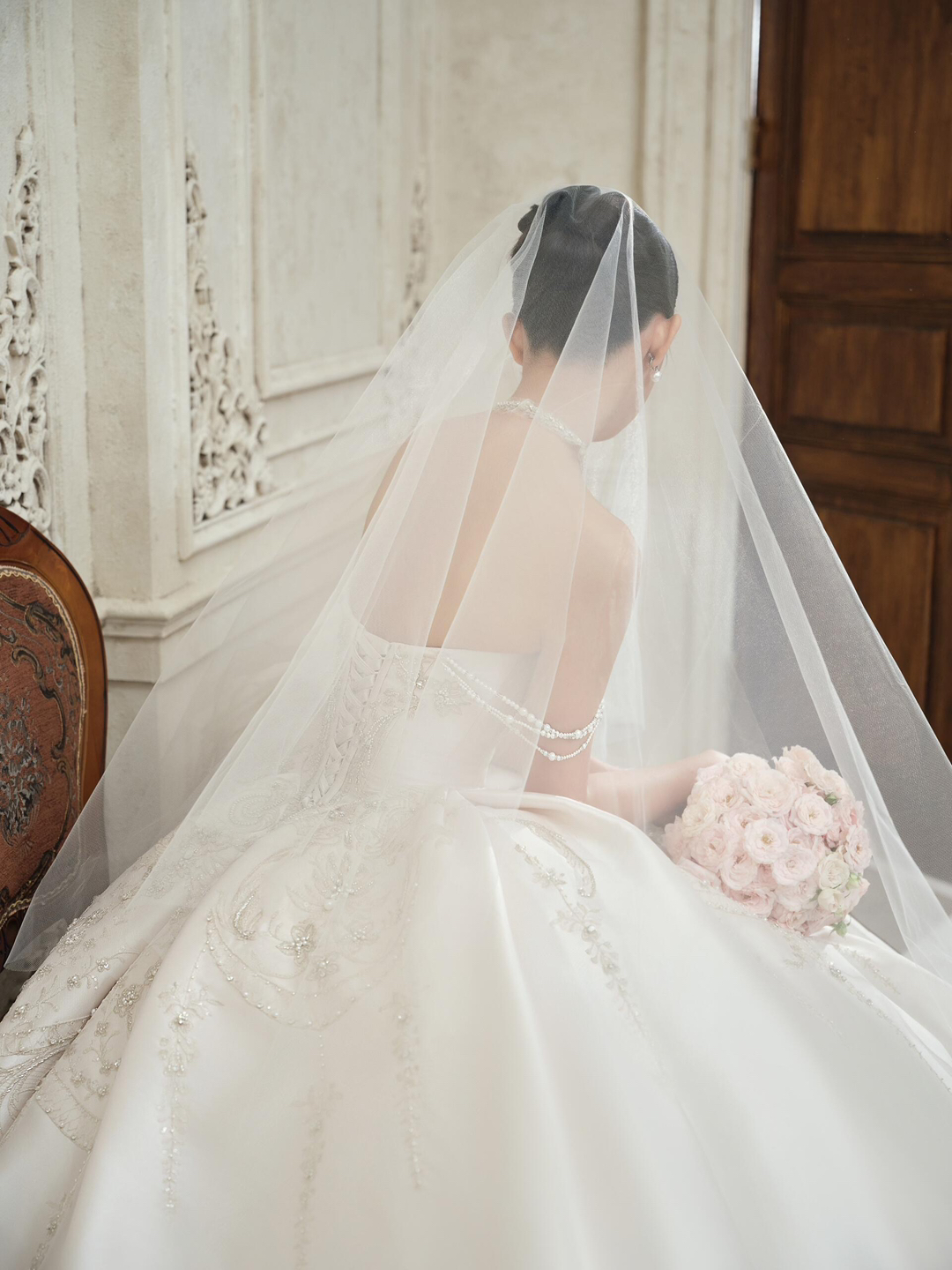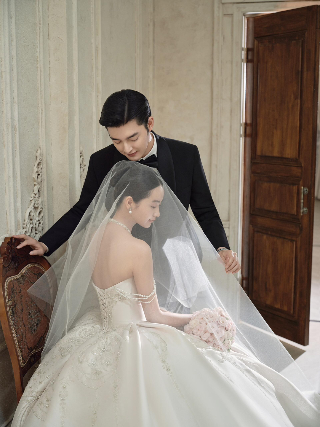 • 复古|轻奢|高定|高级感 [仙奢]系列 精致雕花背景与胡桃木门相互映衬,复古典雅氛围油然而生。 ST.WHITE〈玛格丽特公主〉 蕾丝与细腻的珠料交织,领口花边蕾丝的小心机,凸显锁骨线条。 粉色玫瑰花簇拥成蓬松花球,轻盈若云朵,握于手中,是浪漫与美好的凝结。 #复古胶片婚纱照
