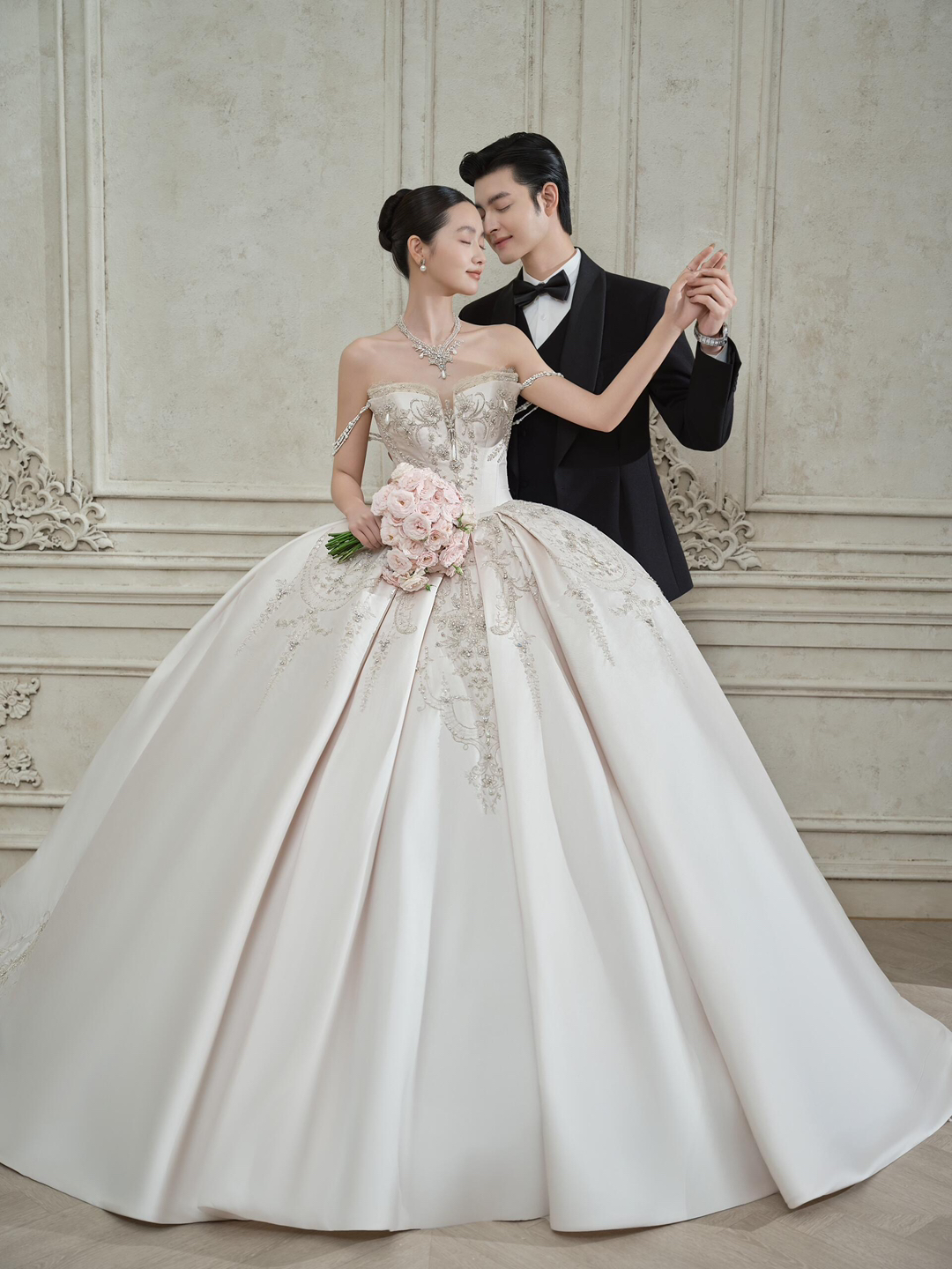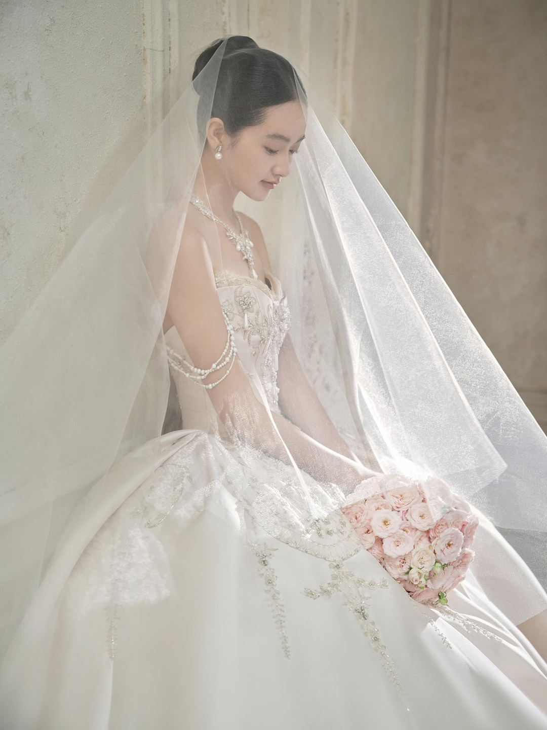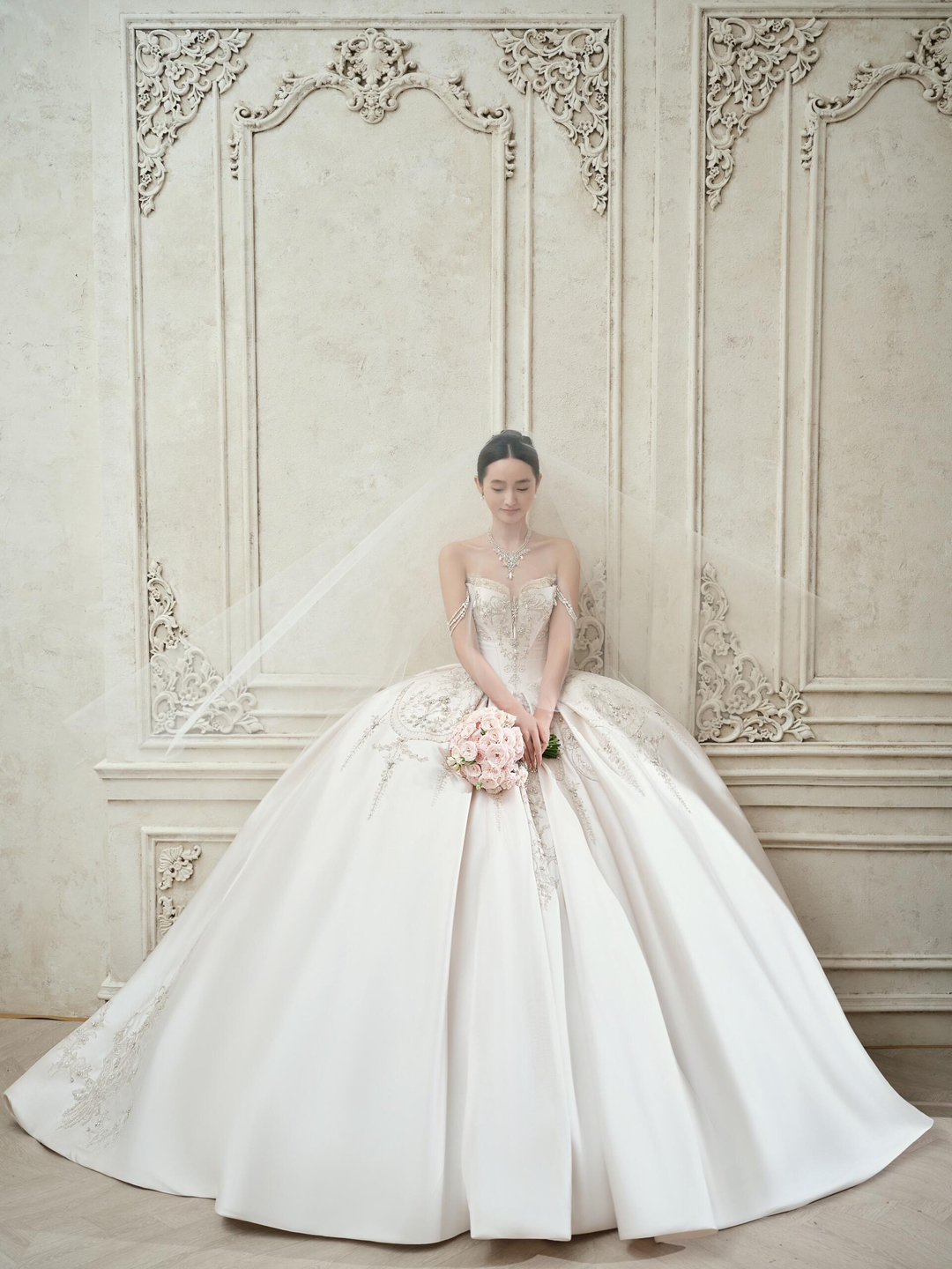 • 欧式复古|极简|清冷调|高级感 [仙奢]系列 极简雕花背景,在清冷的欧式复古调里留岁月沉淀的线条之美。 OOTD| 王妃领刺绣鱼尾裙勾勒优雅曲线,蕾丝缠绕着时光的密语。 拖地刺绣头纱如星河垂落,细密珠绣在清冷光线下流转微光。 #浪漫光影婚纱照