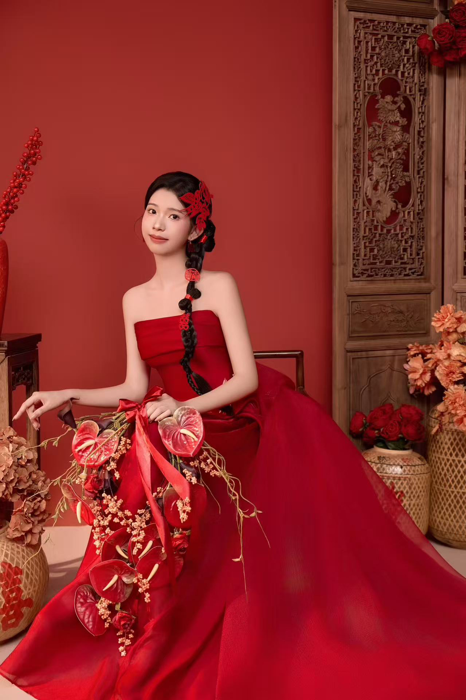 • 拍了一个好甜的新娘呀~复古红小花朵的鲜花造型和白色小礼服完美适配~ 超级年轻感的喜嫁婚纱照风格哦喜欢的姐妹们,快拍起来~ #美出圈的新中式婚纱照
