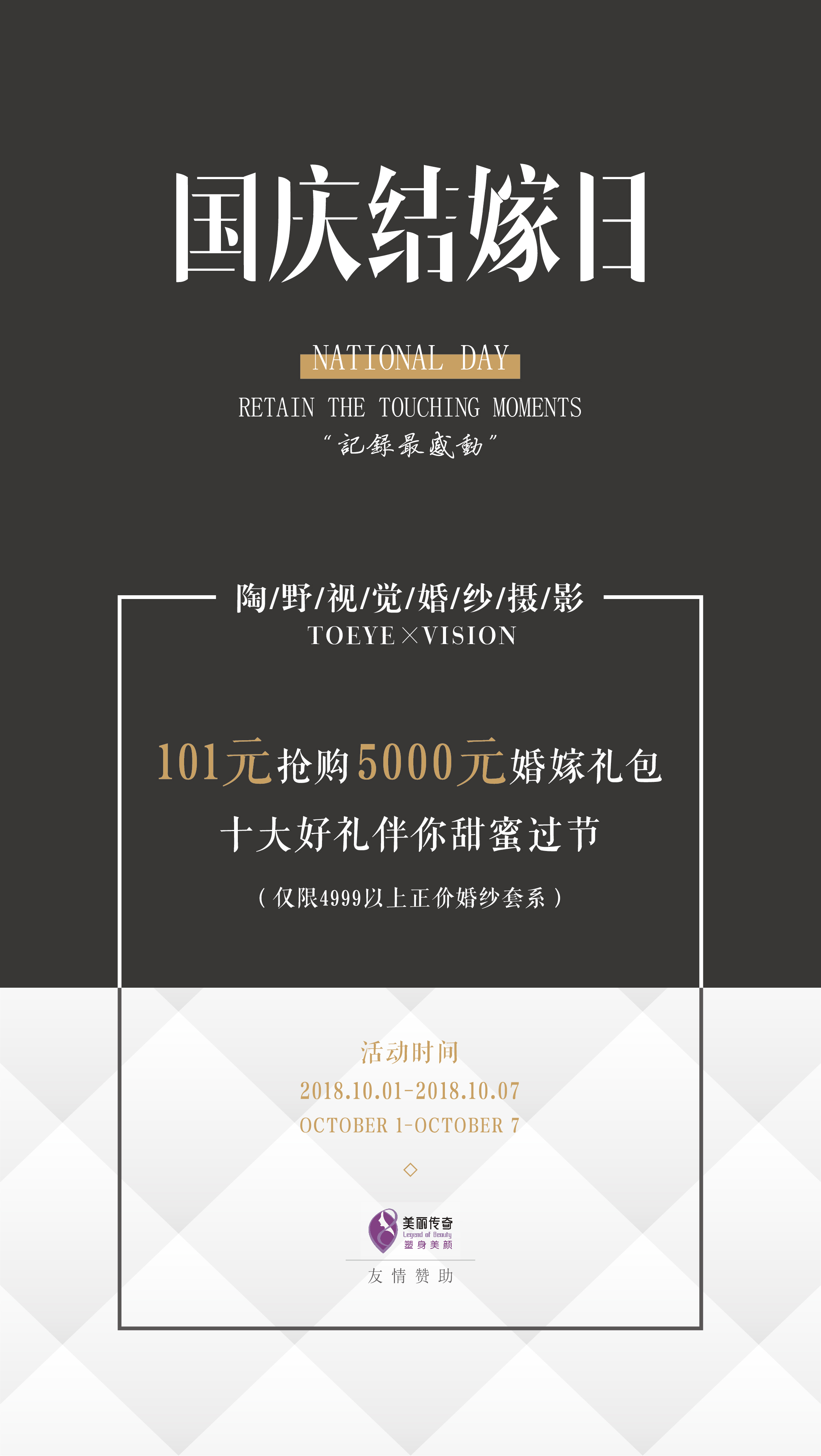 • 国庆七天小长假悄咪咪的就快来了,大家是不是迫不及待地想要开始放假了? 让我们再为您的假期加点料吧! 5000元婚嫁大礼包限量供应,抢订初秋黄金档期。