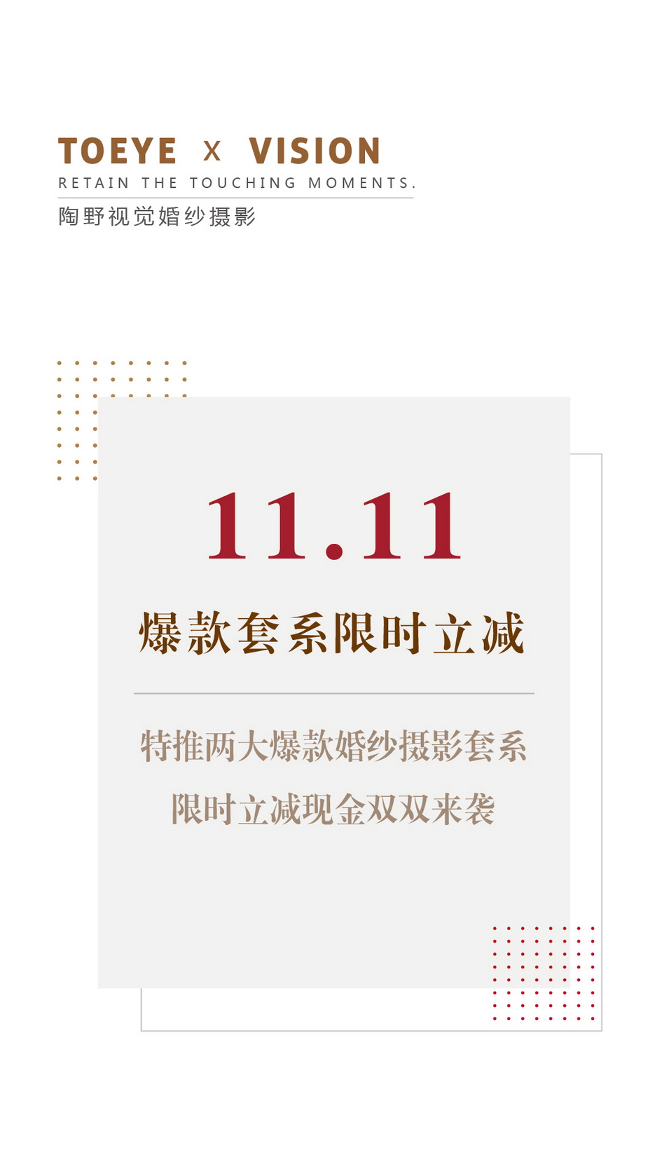 • 距离一年一度的网购大节【双11】还有11天 陶野视觉任性提前过! 如果此前您还保留观望状态! 那么此刻您不该错过! 2018 Best prices 2018.11.1-2018.11.11 两大爆款婚纱摄影套系 连续11天现金立减