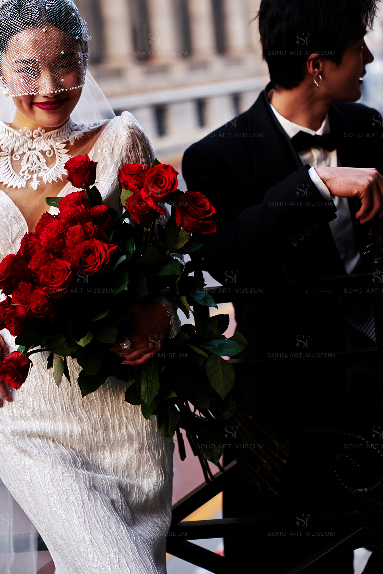 • 热情奔放的红玫瑰与黑色西服的搭配优雅又高贵!虽然画面偏冷调,但暖意与热情丝毫未减,心中爱意思绪早与浪漫撞了个满怀。半遮面似头纱的小细节在精致中流露出高级的神秘感。 面对面对视的镜头把我们拉回初见那天.....