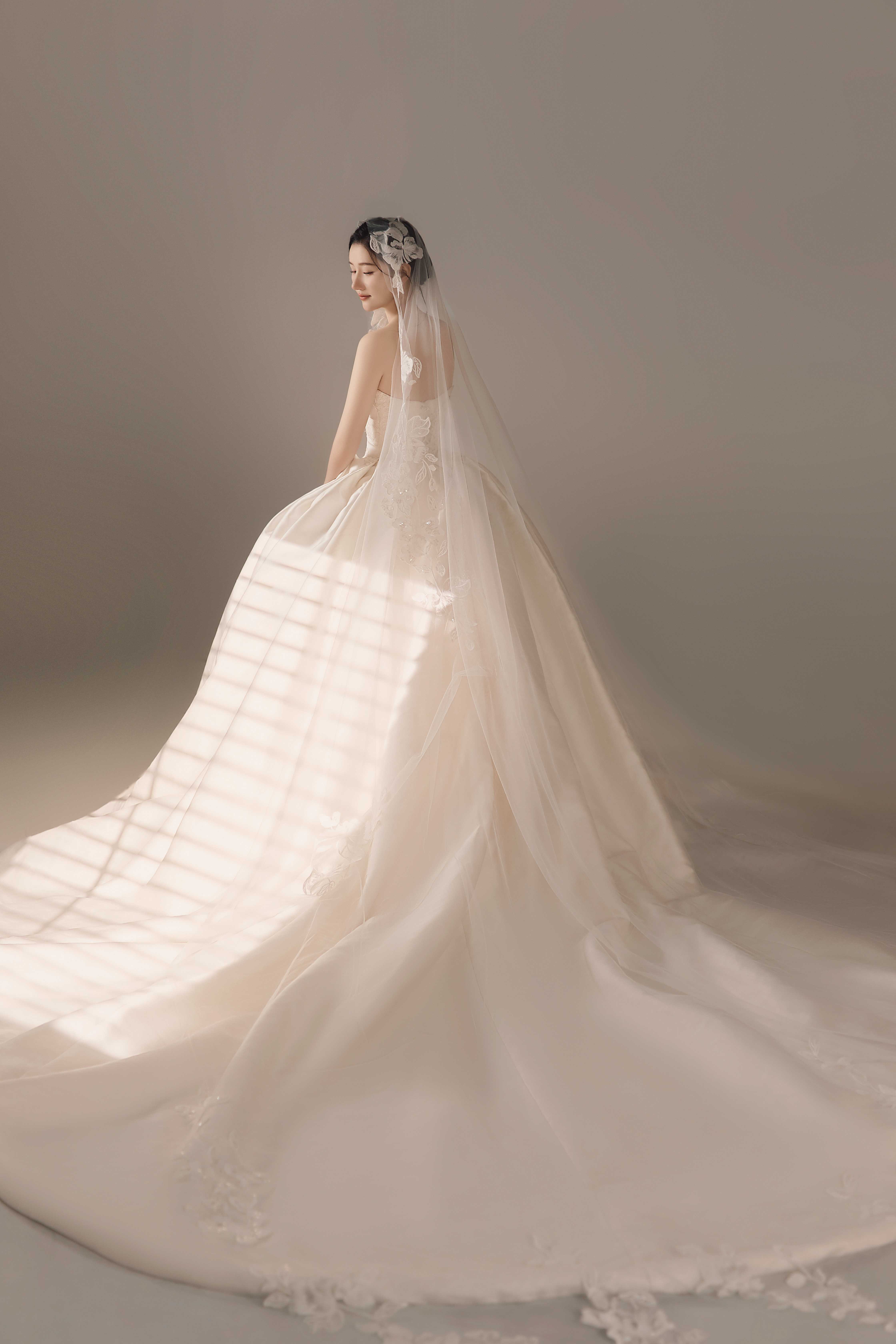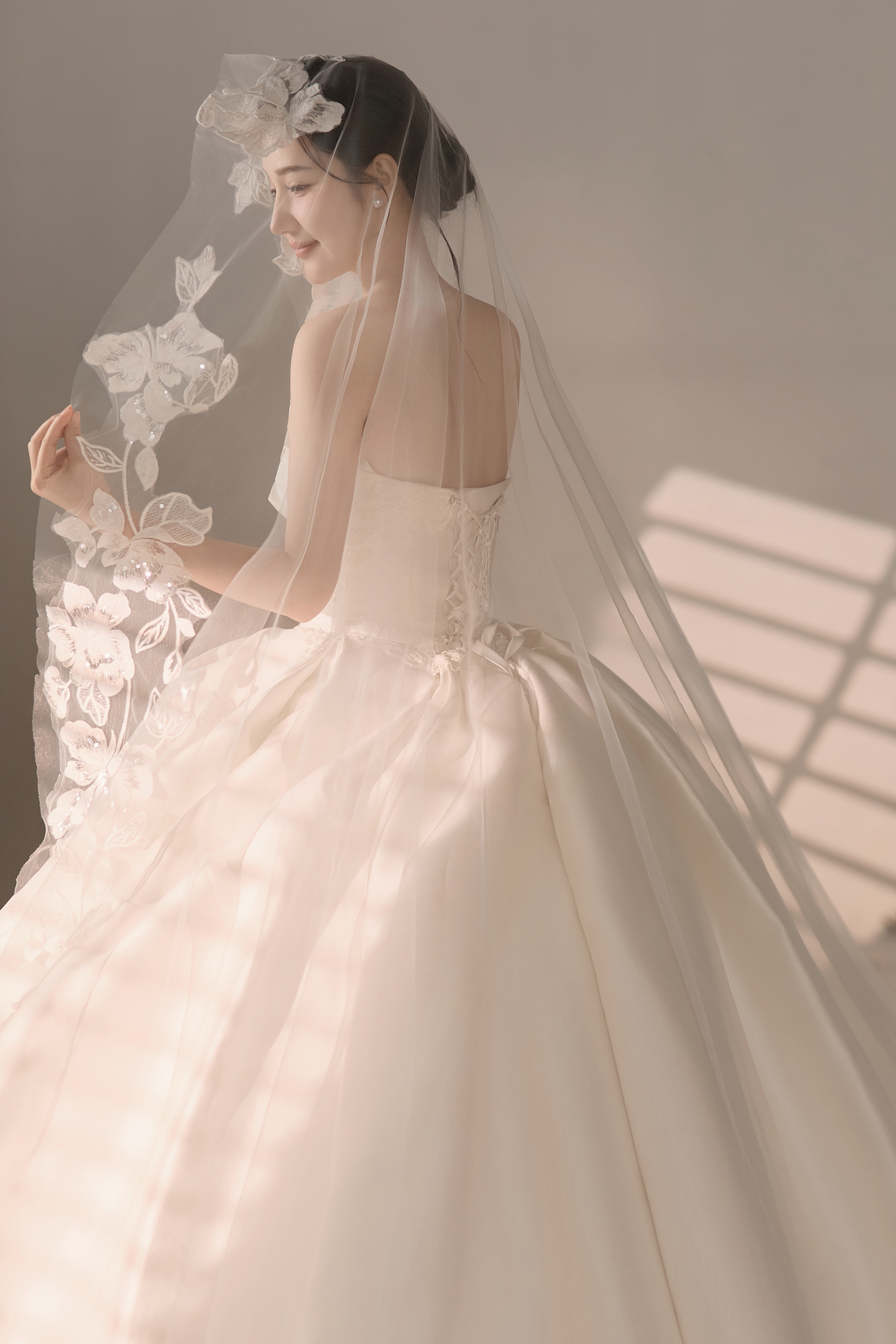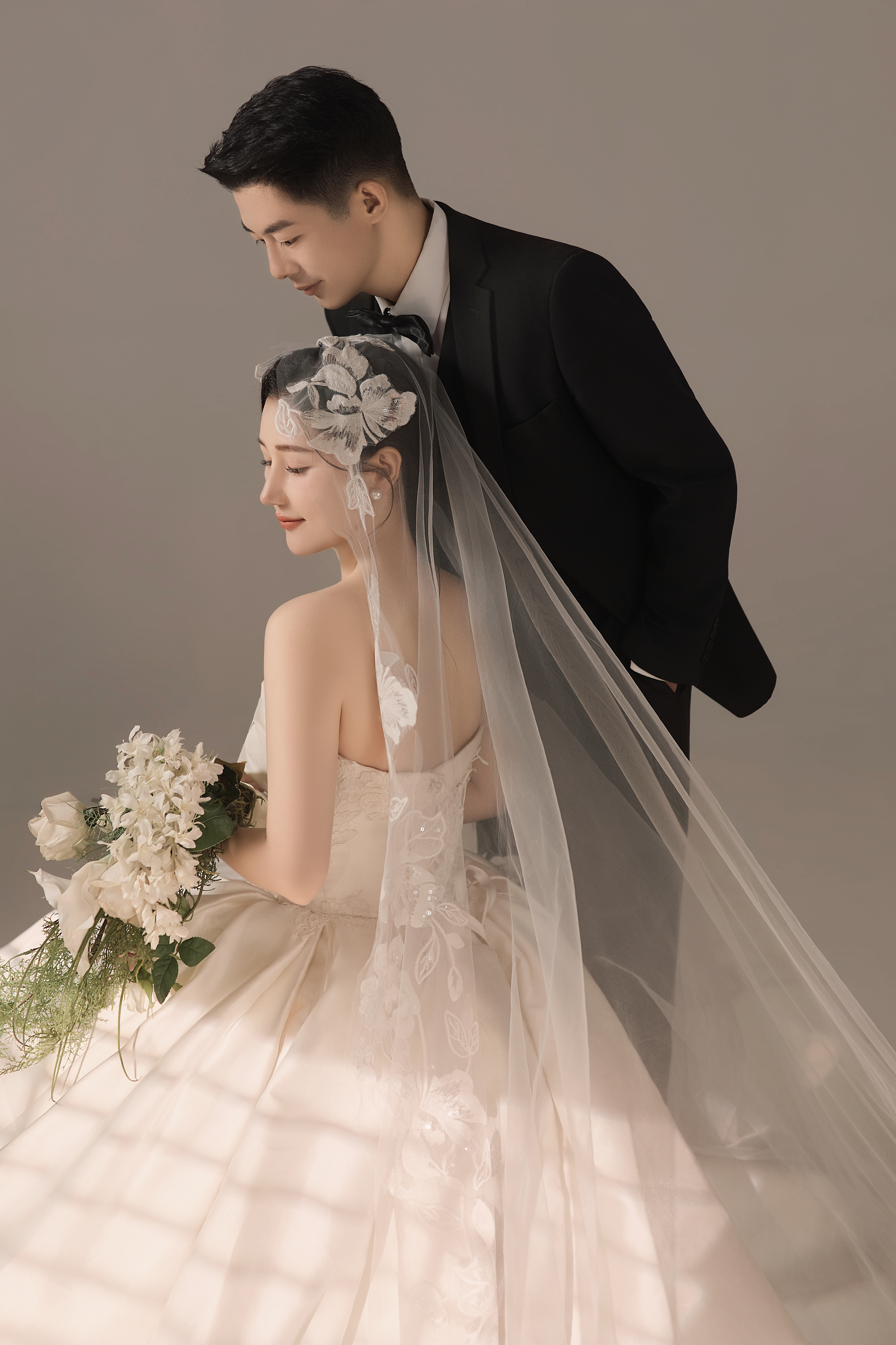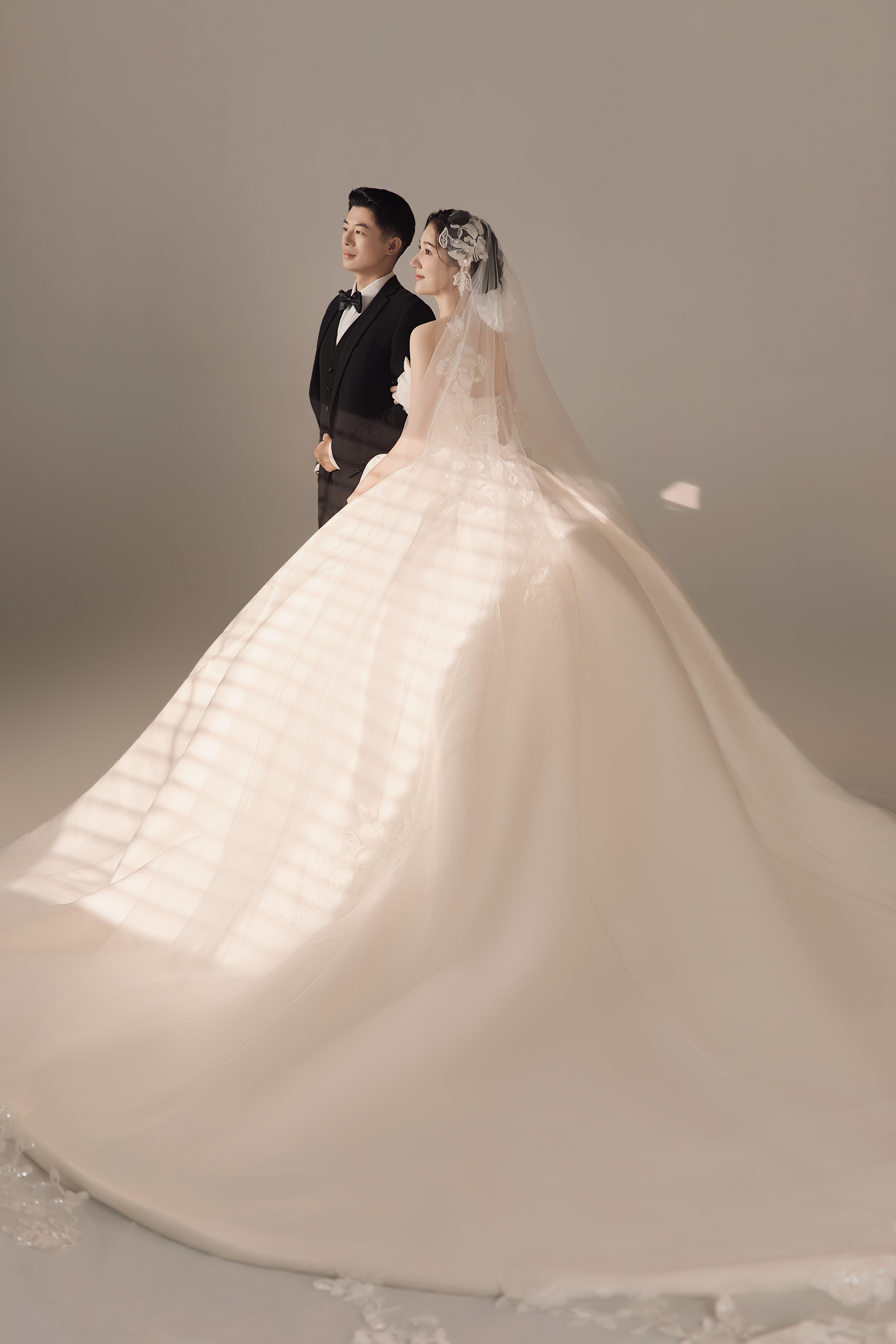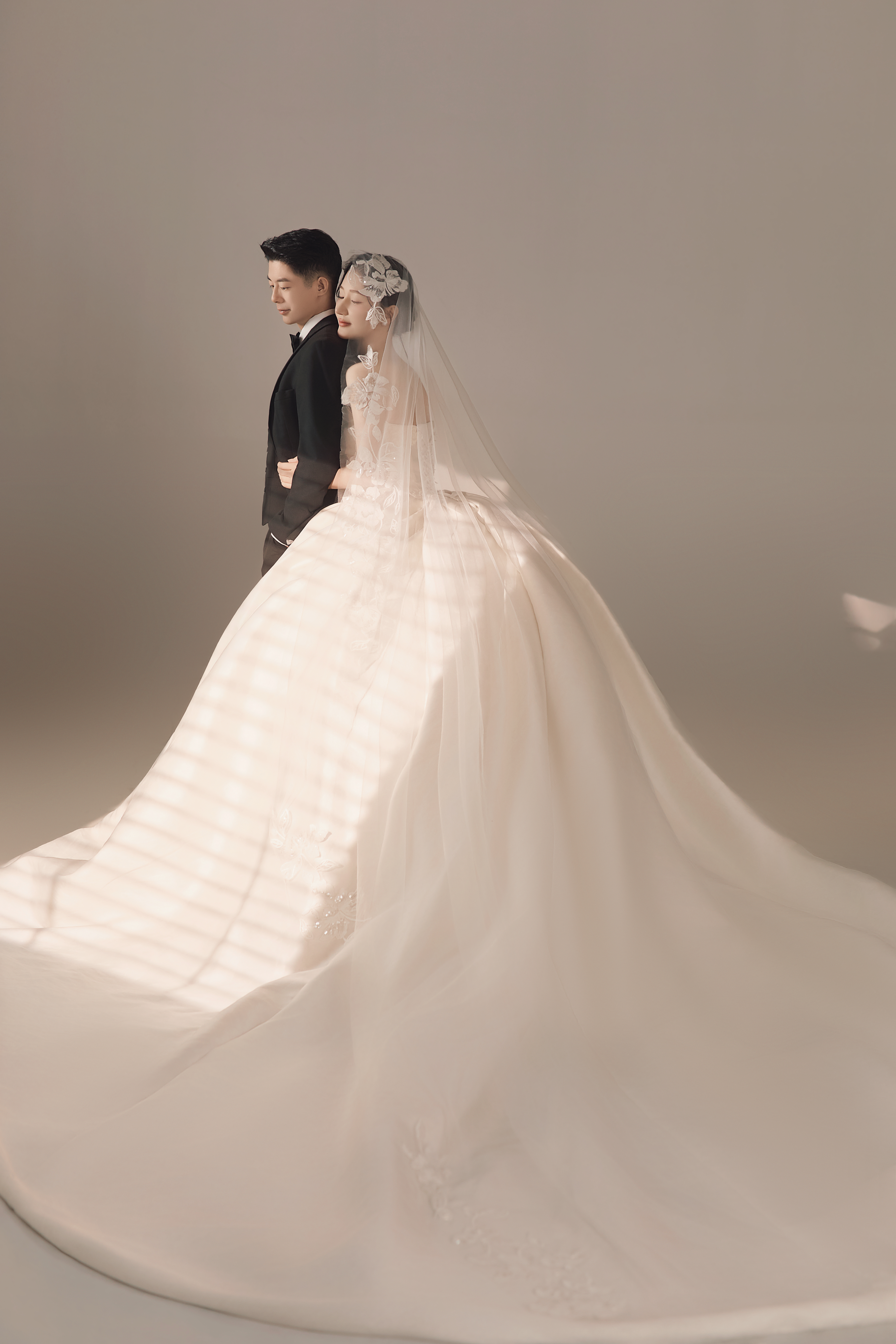 • #浪漫光影婚纱照 —— 两套不同的头饰风格~ 简直是韩式婚纱的标配 经典又耐看,气质满分!👰‍♀ 完全不用担心过时💑 - 高定蕾丝婚纱恰到好处的温柔✨ 极简纯色背景丰富空间层次 化繁为简赋予主纱不一样的仪式感 每一帧画面都拥有细腻动人的感染力 -