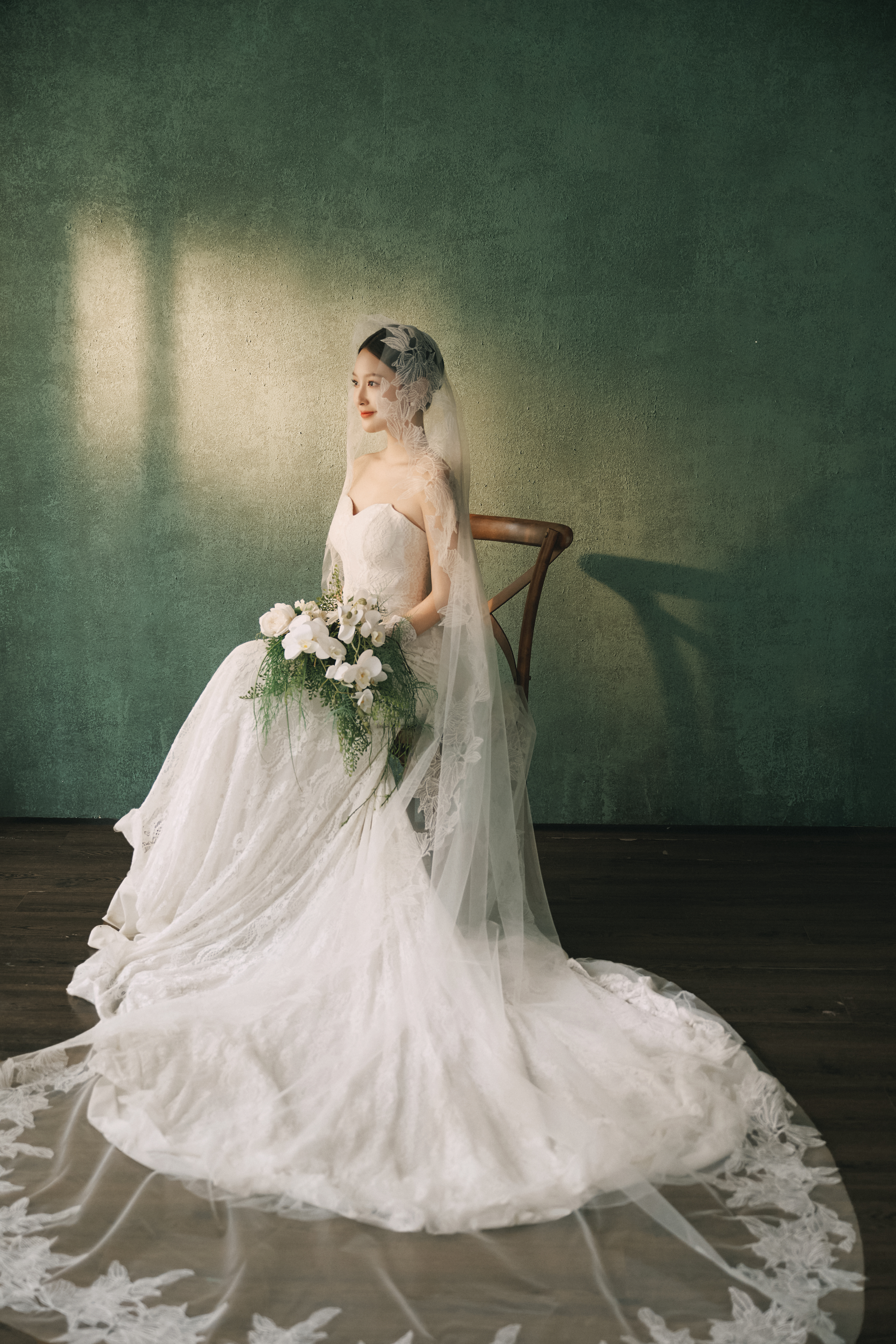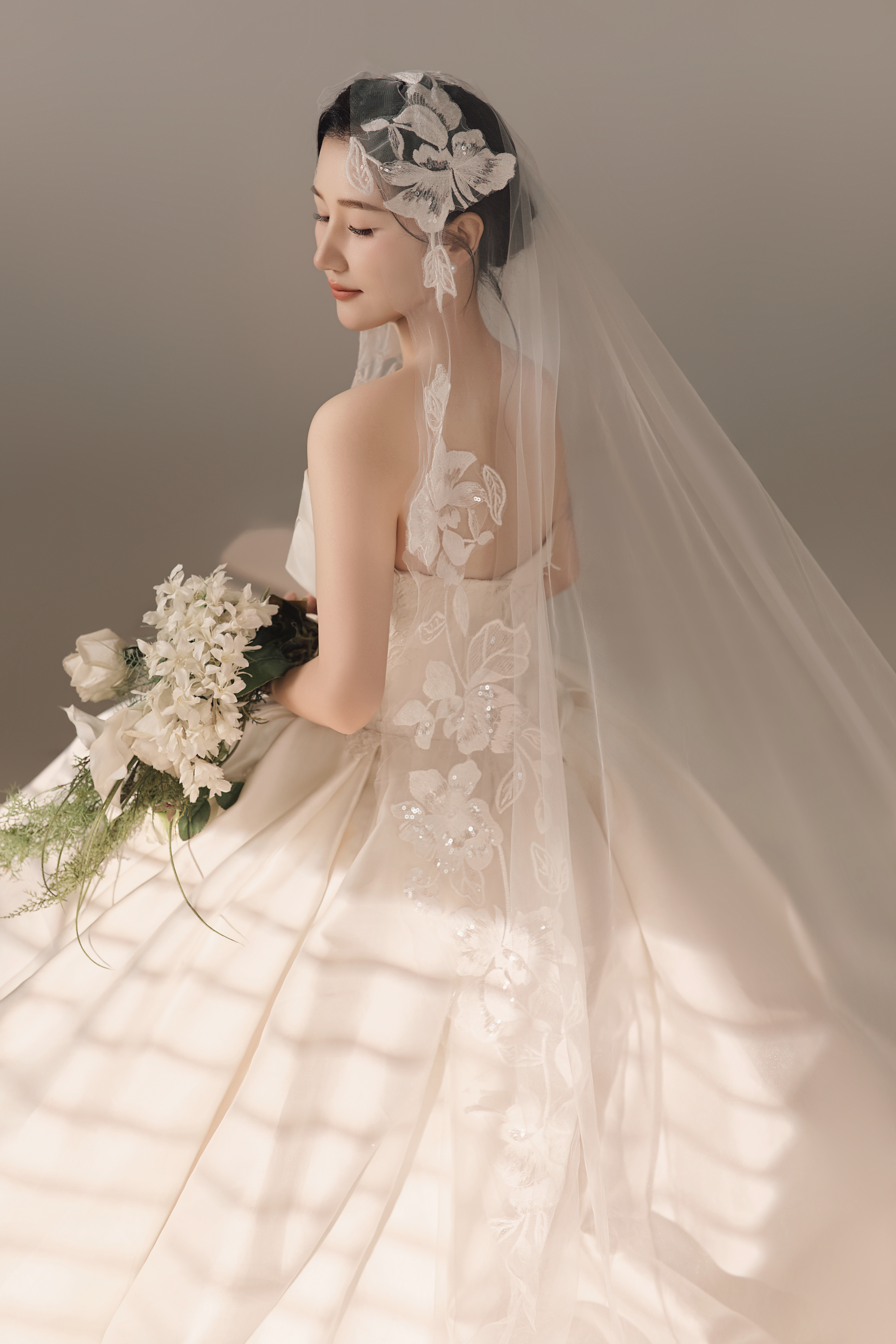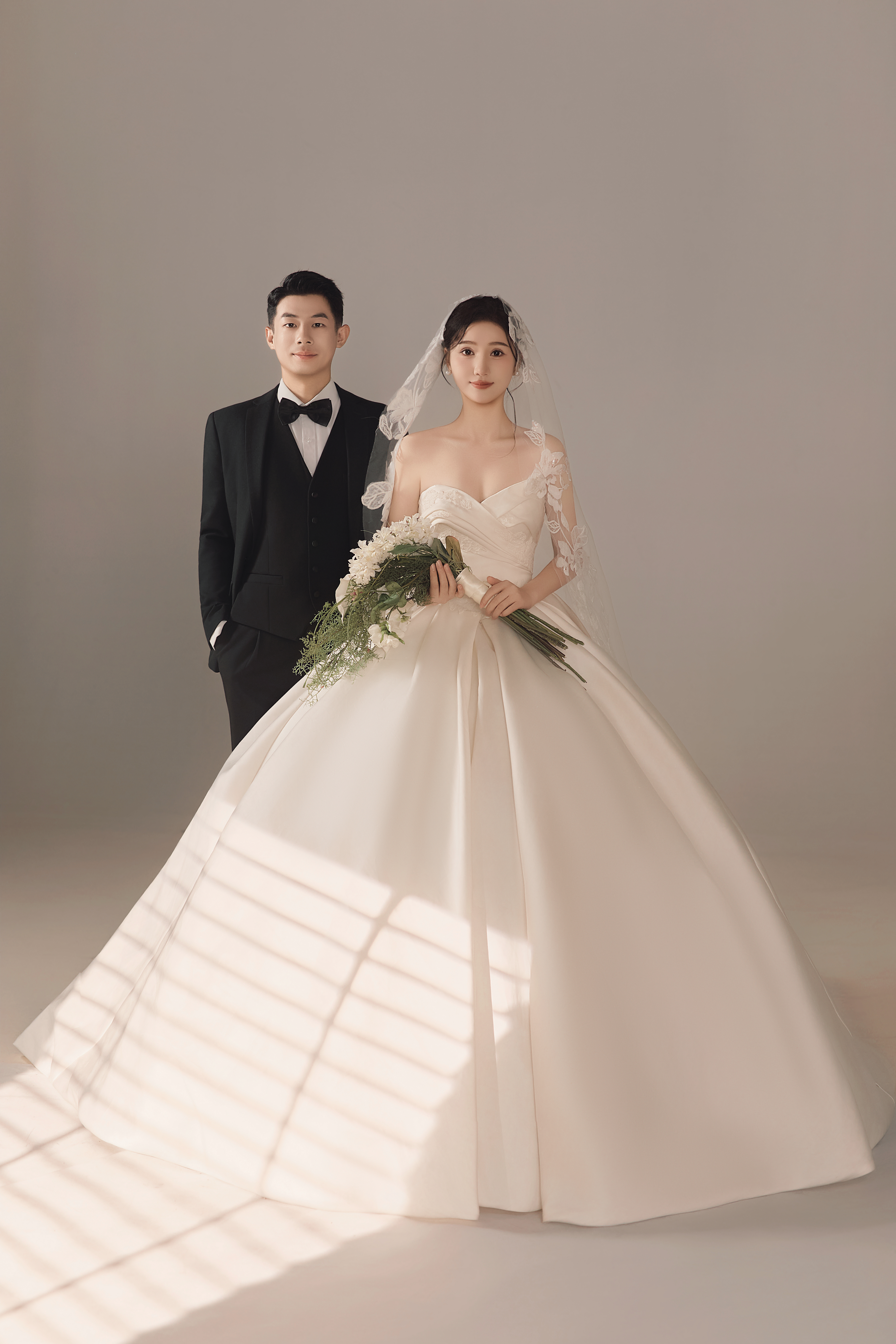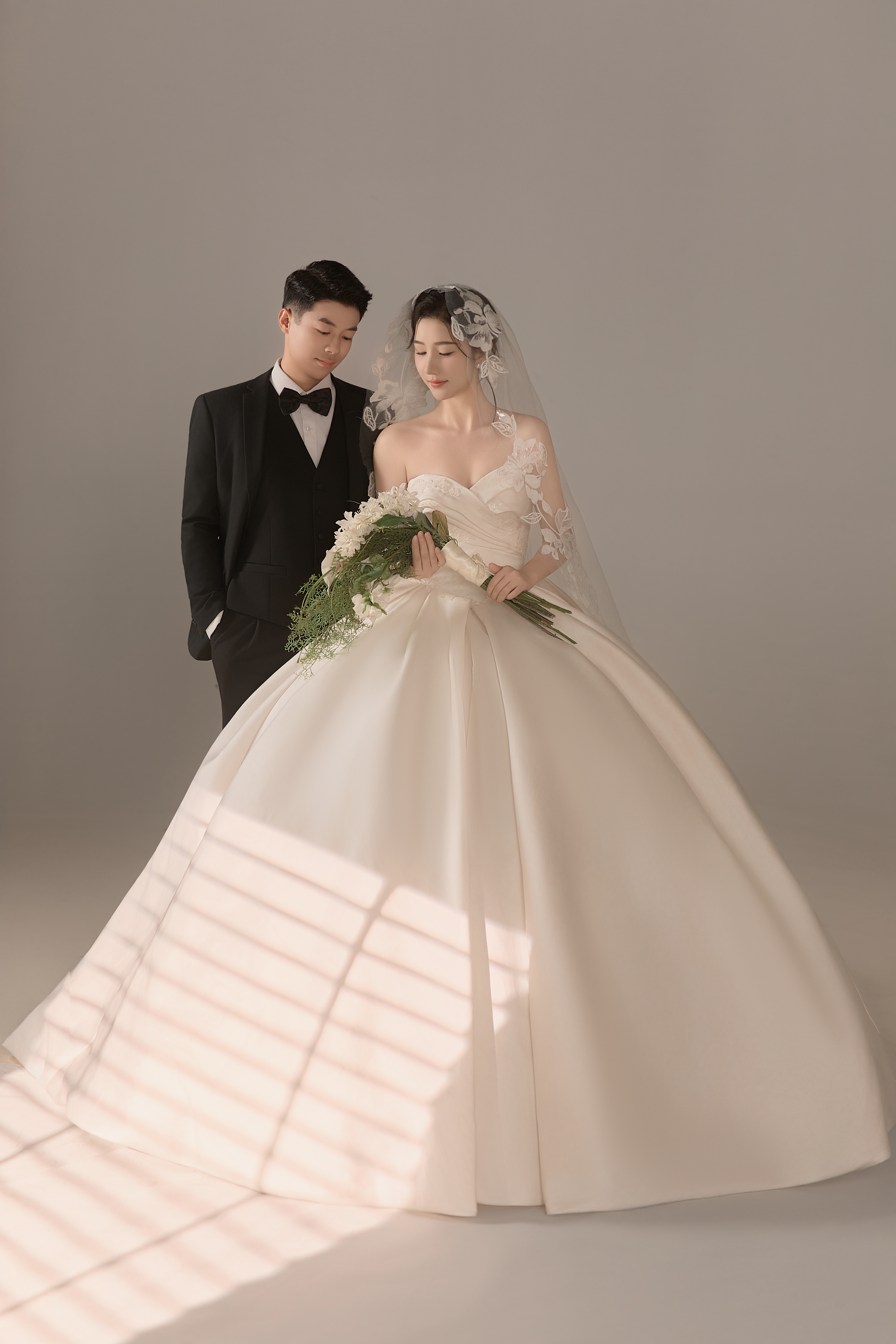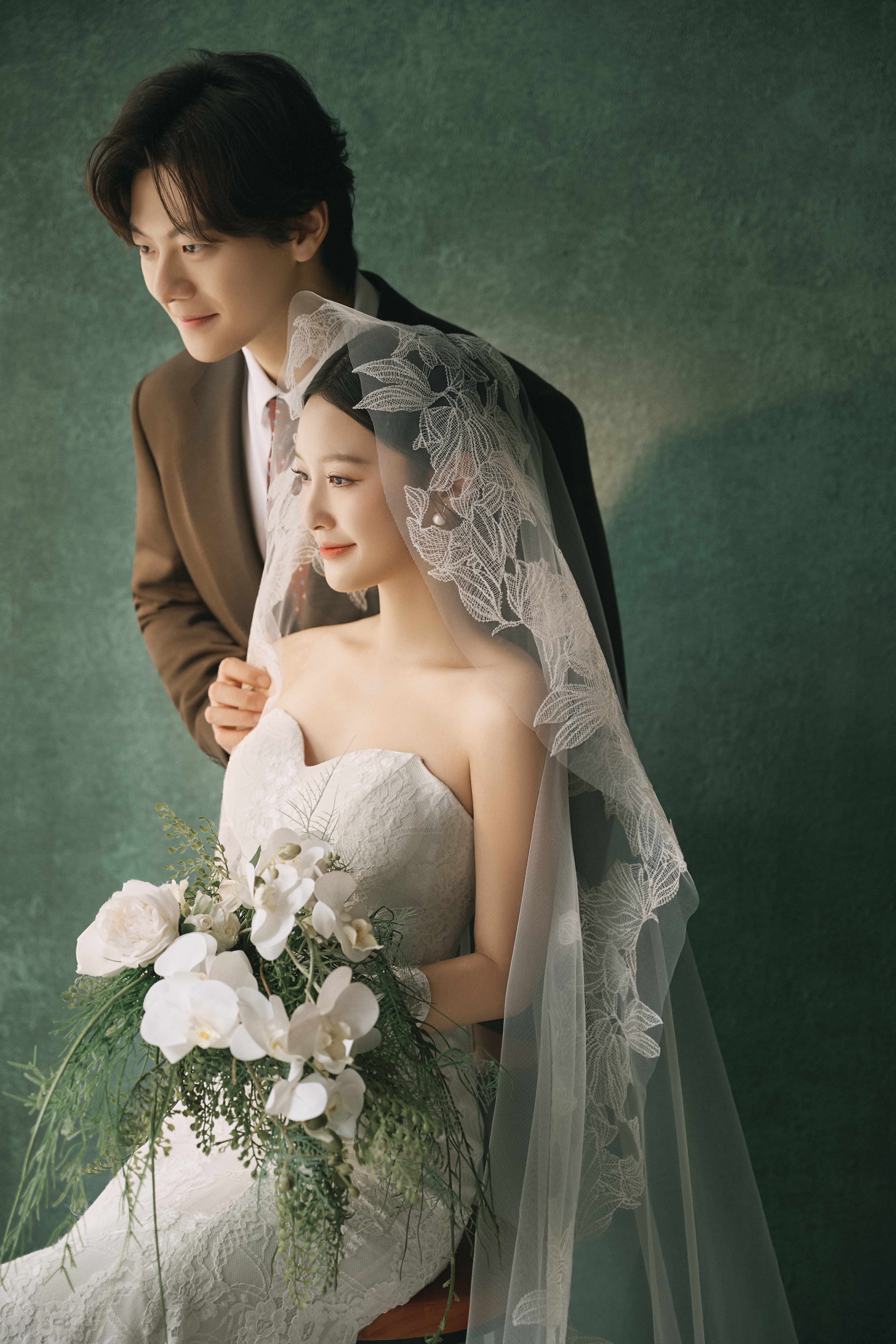 • #浪漫光影婚纱照 —— 两套不同的头饰风格~ 简直是韩式婚纱的标配 经典又耐看,气质满分!👰‍♀ 完全不用担心过时💑 - 高定蕾丝婚纱恰到好处的温柔✨ 极简纯色背景丰富空间层次 化繁为简赋予主纱不一样的仪式感 每一帧画面都拥有细腻动人的感染力 -