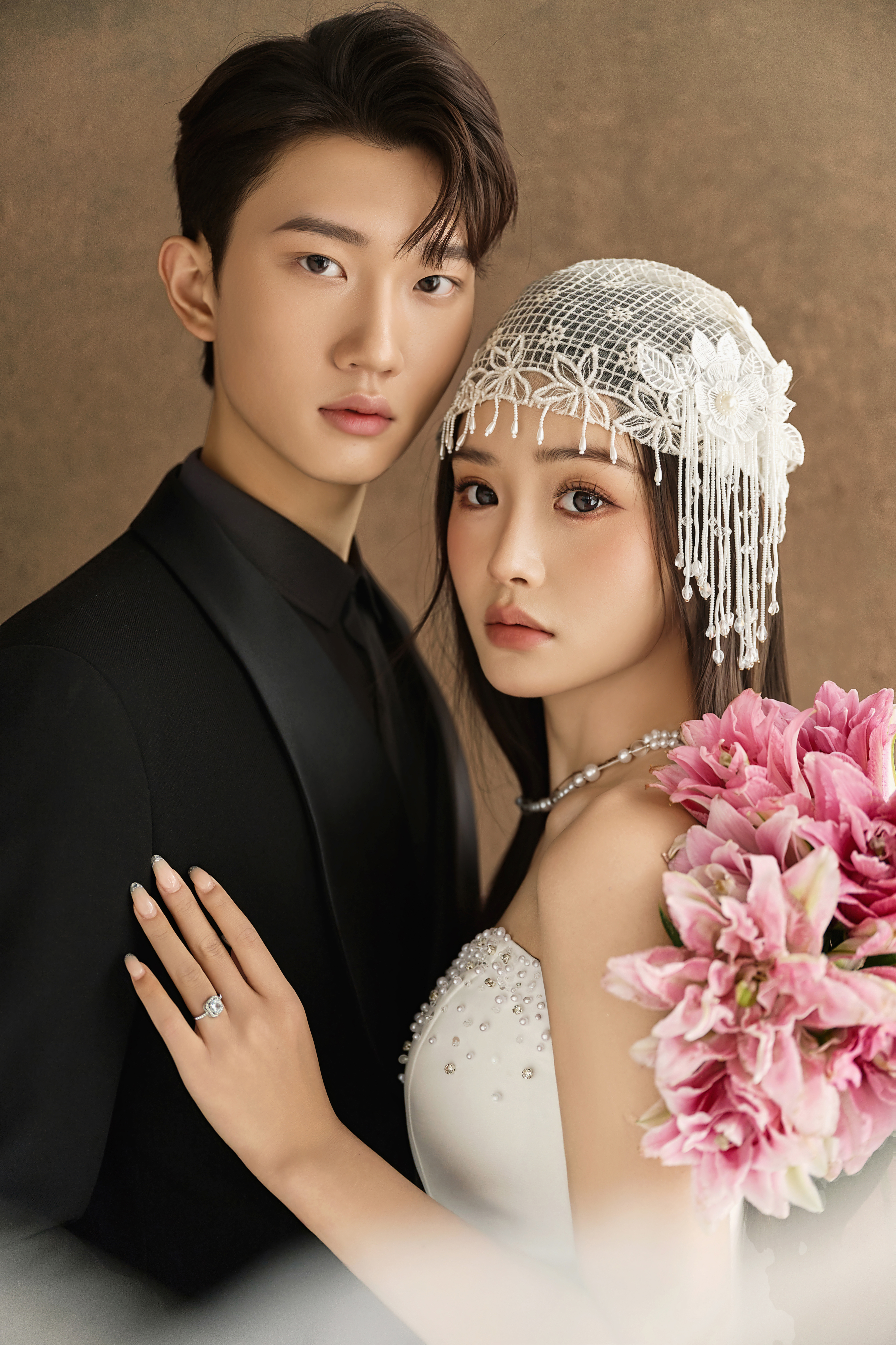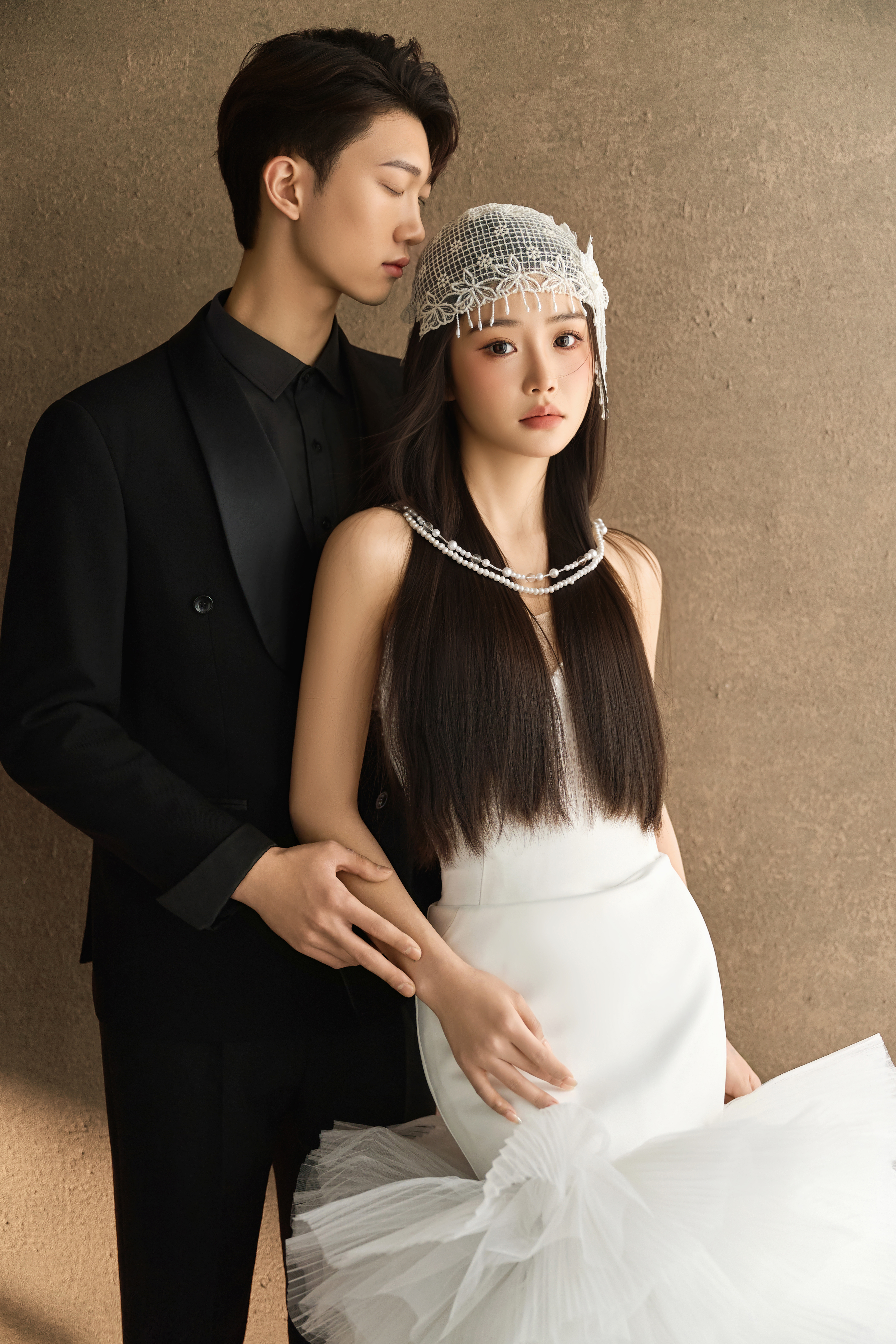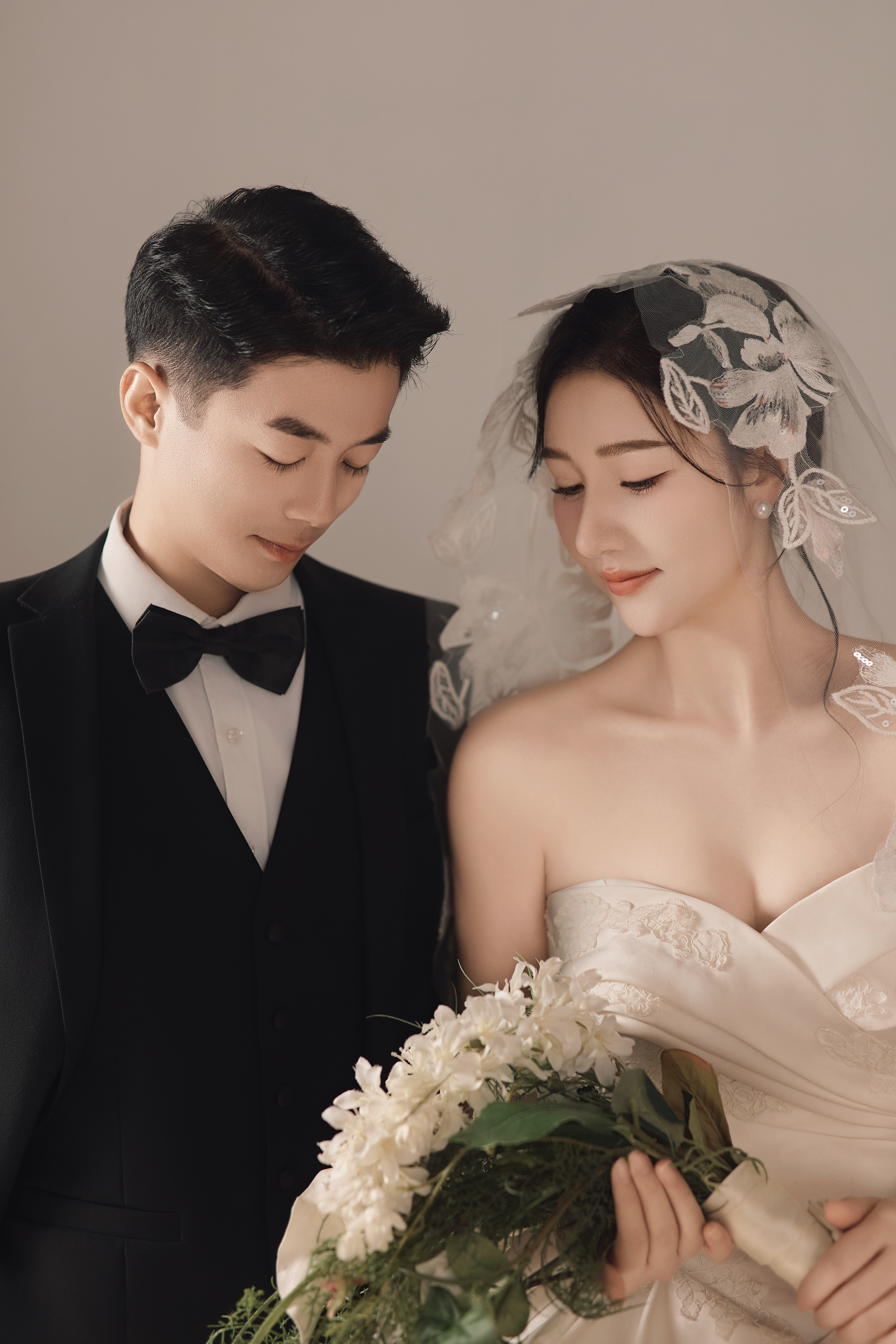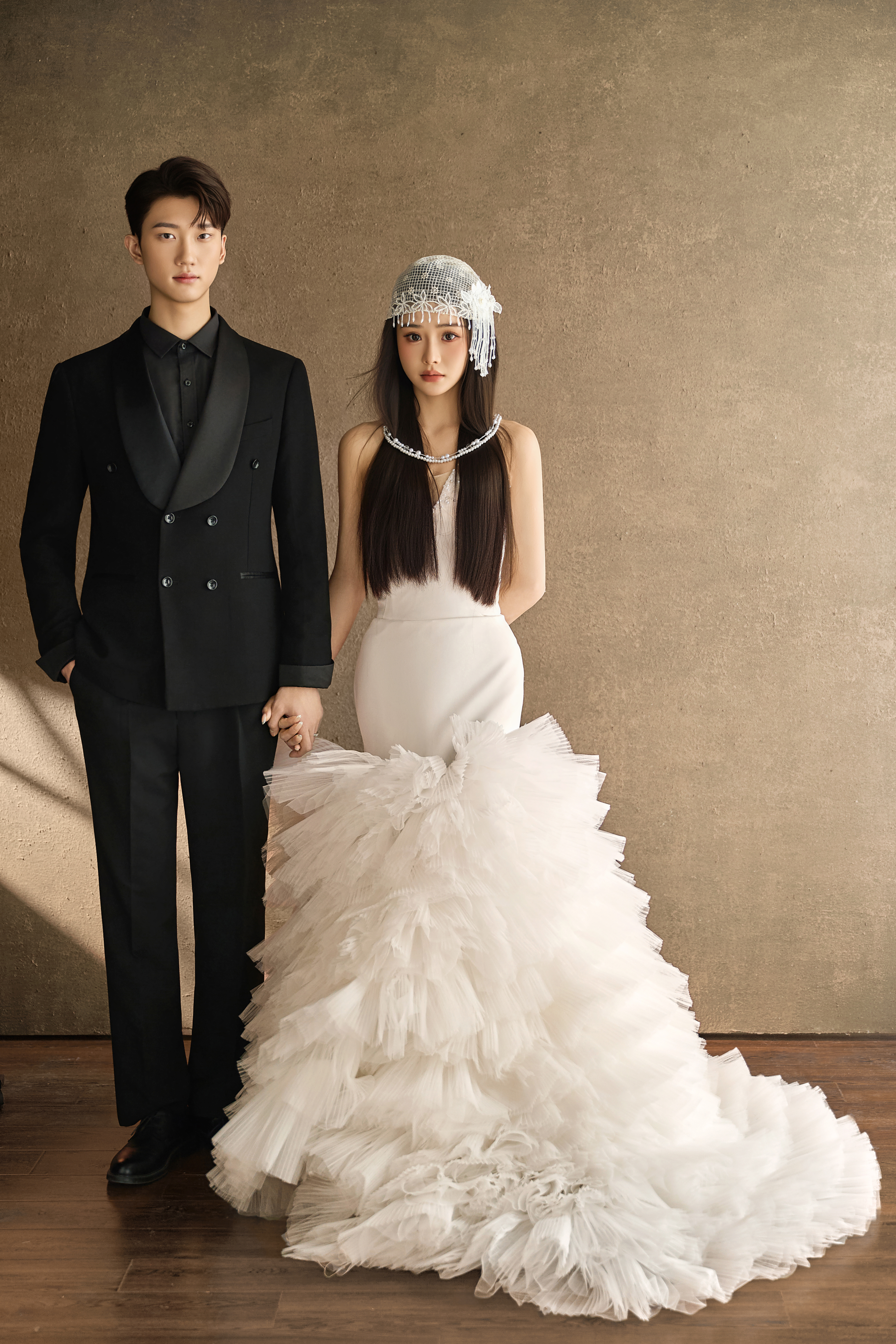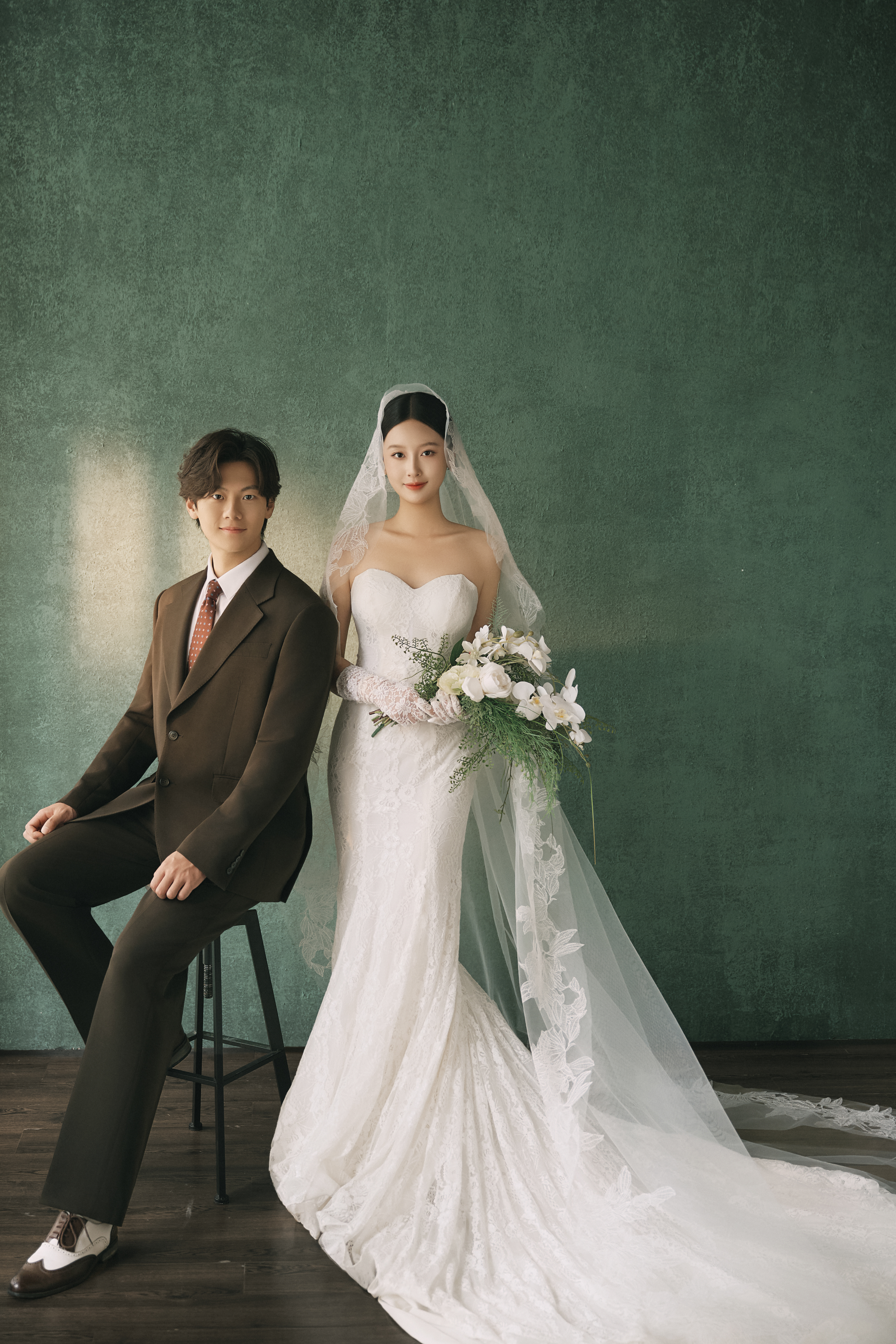 • #浪漫光影婚纱照 —— 两套不同的头饰风格~ 简直是韩式婚纱的标配 经典又耐看,气质满分!👰‍♀ 完全不用担心过时💑 - 高定蕾丝婚纱恰到好处的温柔✨ 极简纯色背景丰富空间层次 化繁为简赋予主纱不一样的仪式感 每一帧画面都拥有细腻动人的感染力 -