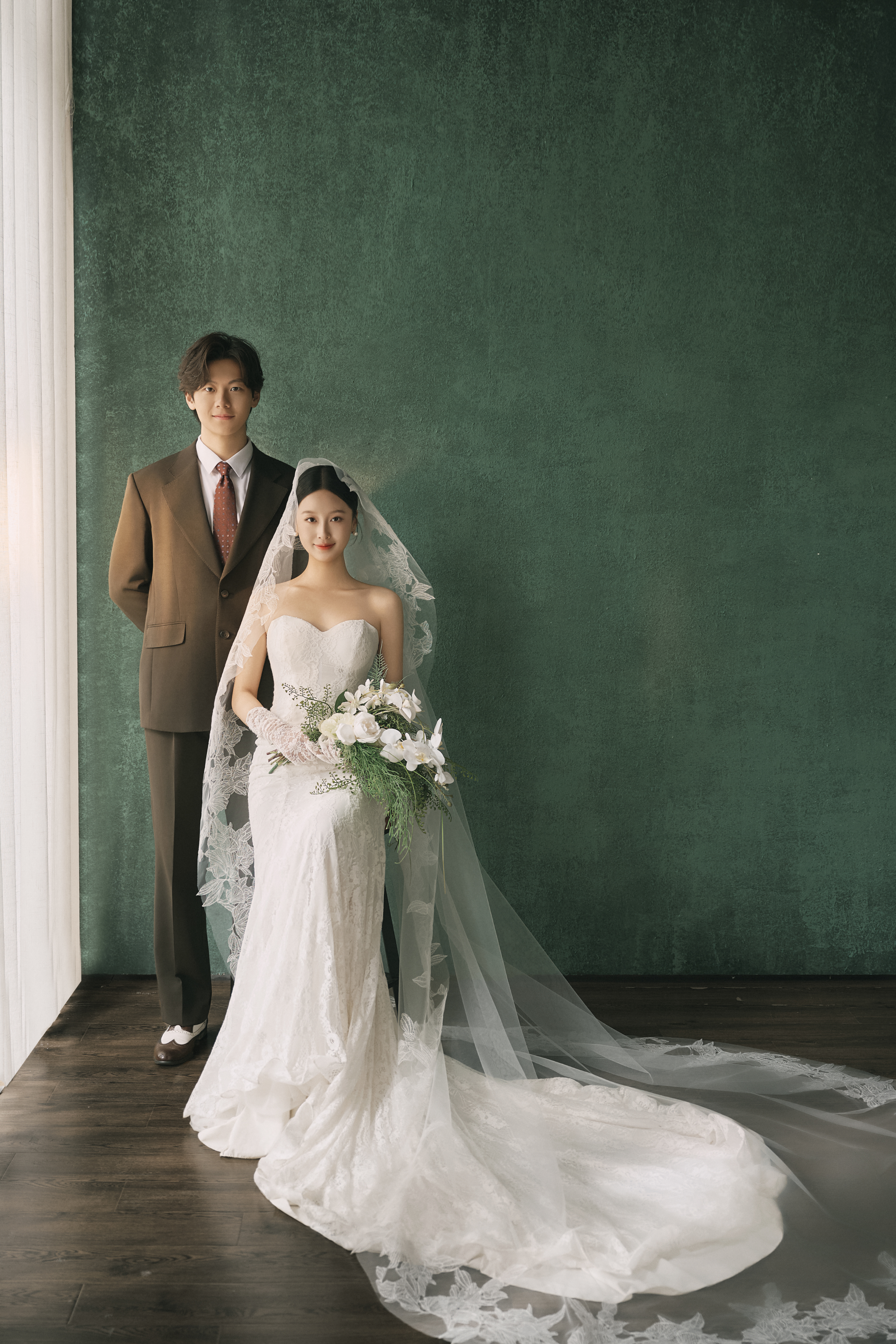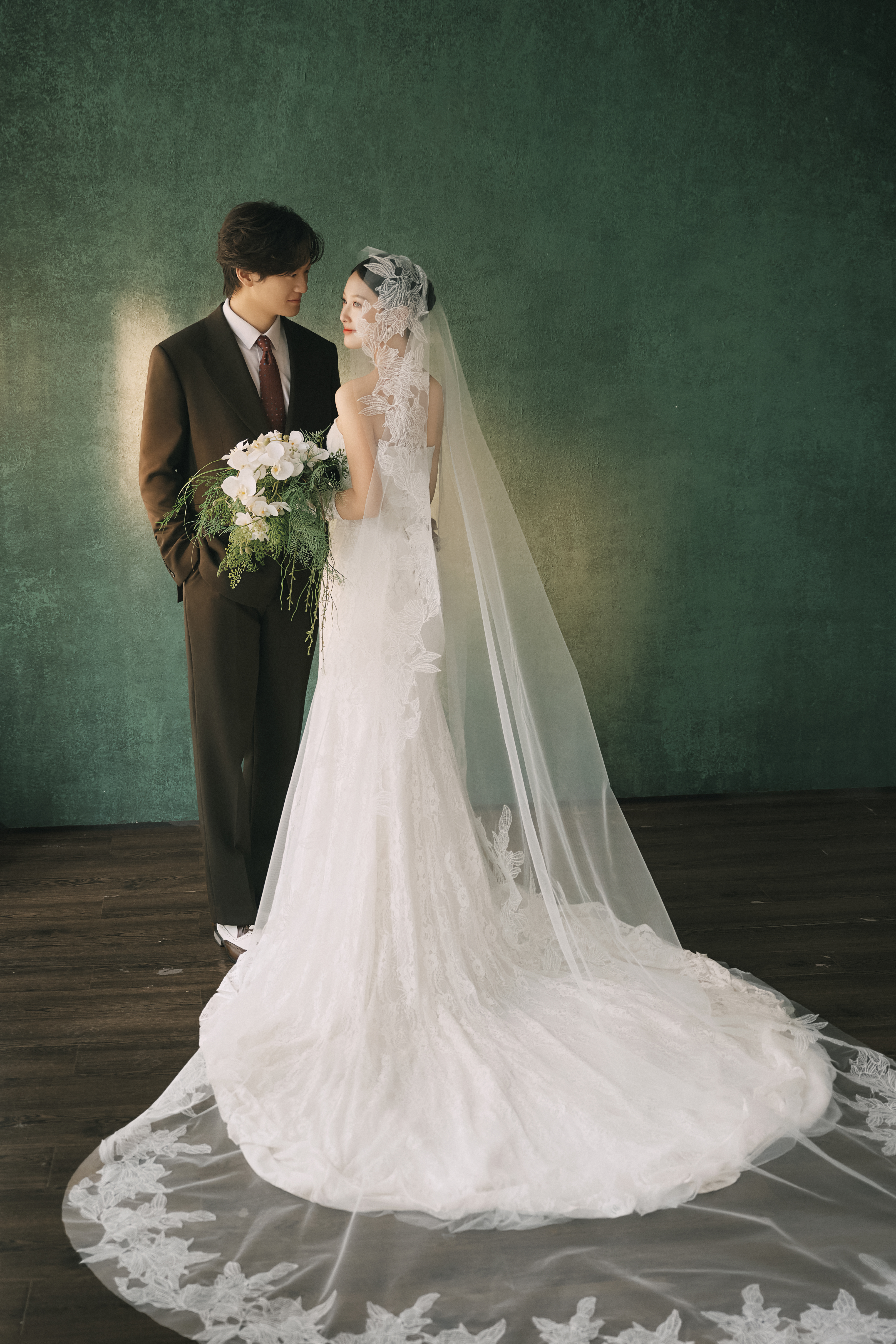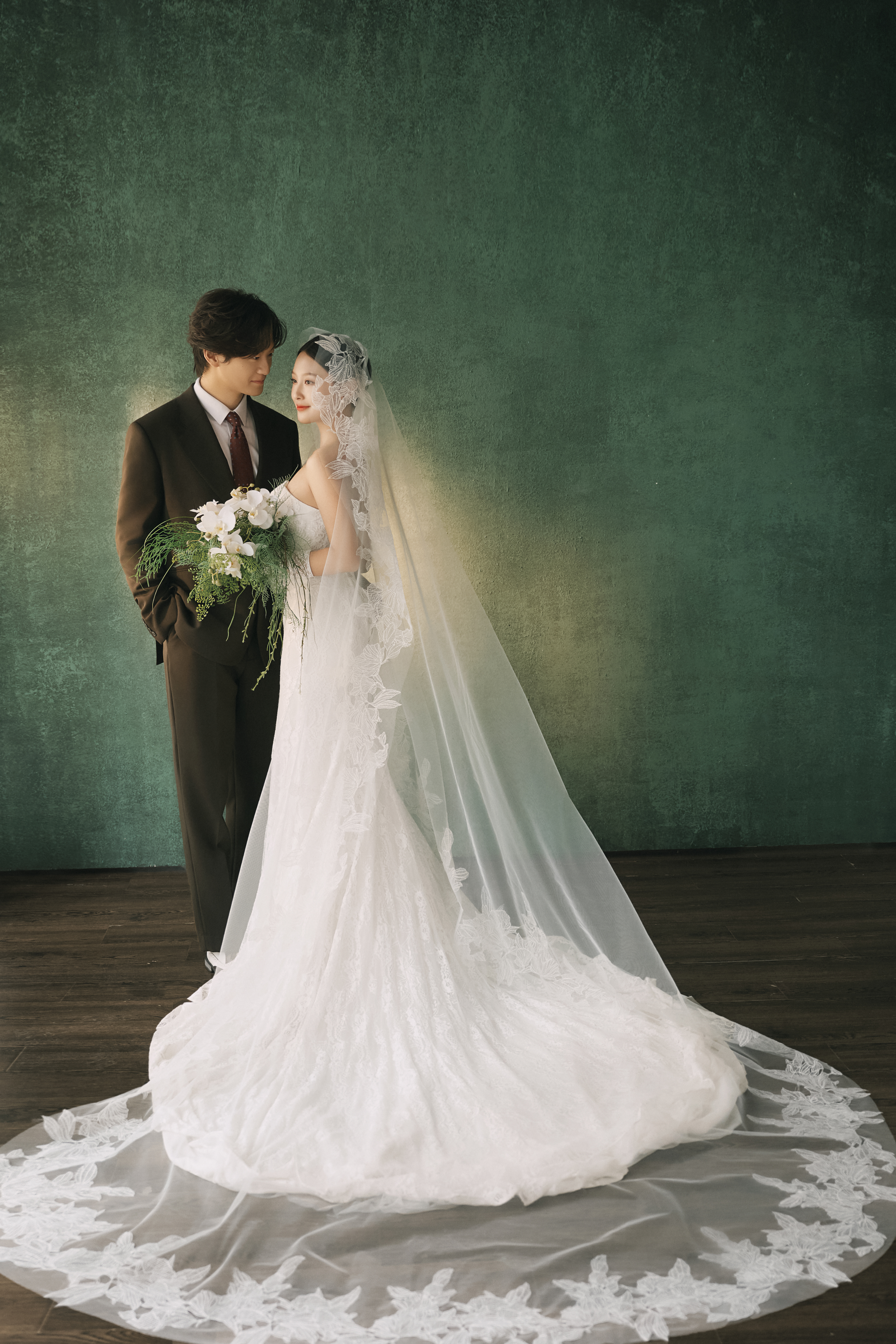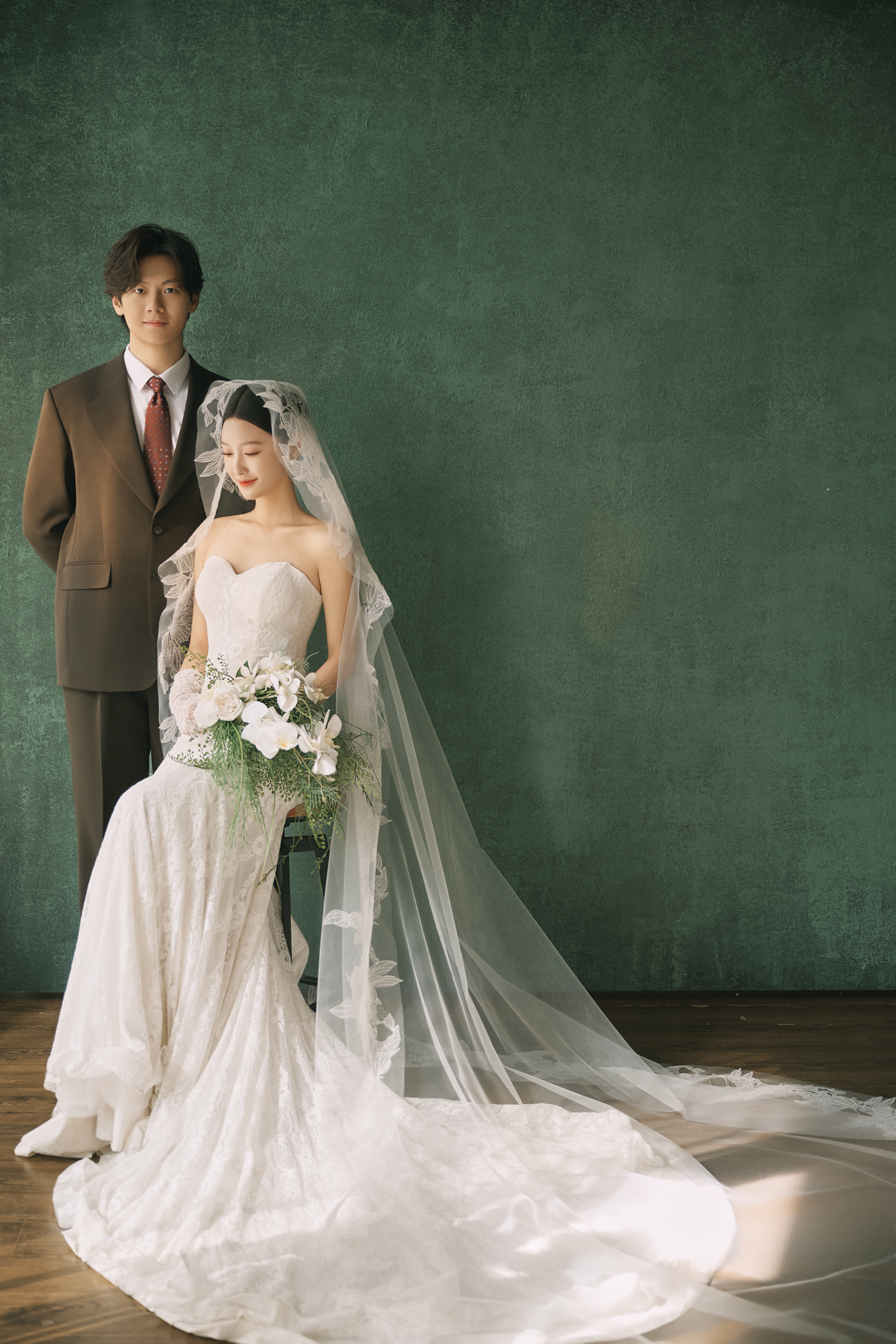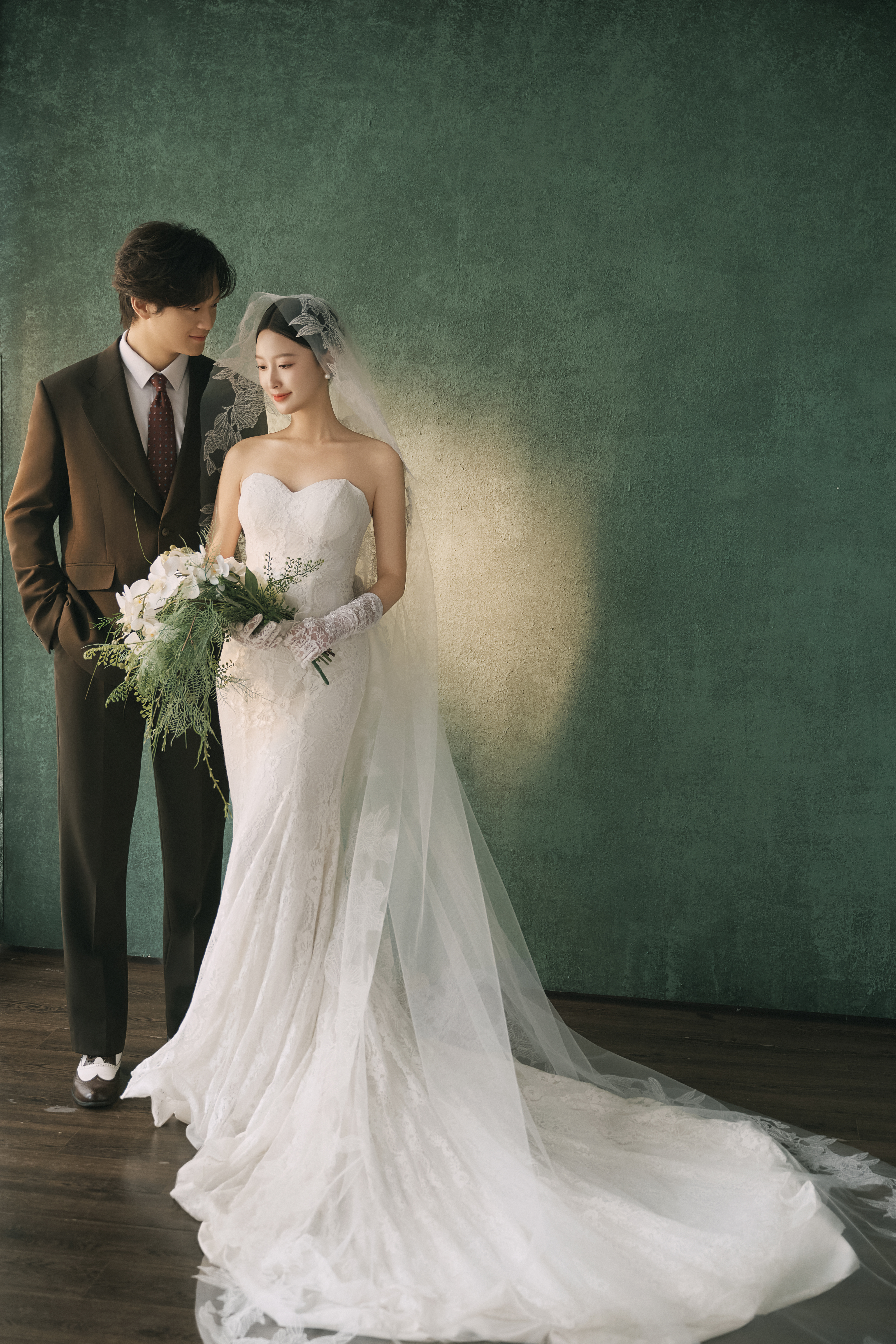 • #复古油画风婚纱照 —— 复古绿为背景, 镜头捕捉中古风格精髓 蕾丝花边、抹胸鱼尾裙, 没有复杂的褶皱堆积, 裙摆自然的垂落, 唯美优雅且少女感满满 - 浓郁的绿色油画背景 质感高级 每一帧都是将文艺复古感和优雅结合 还原每一帧古典艺术美 -