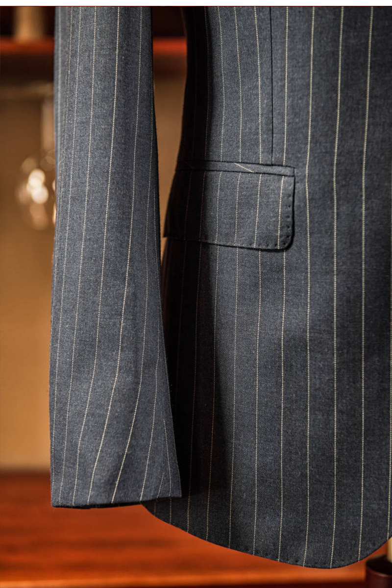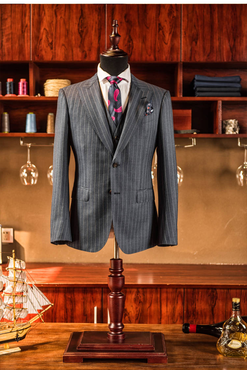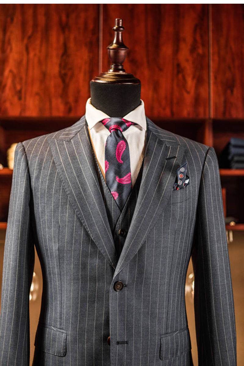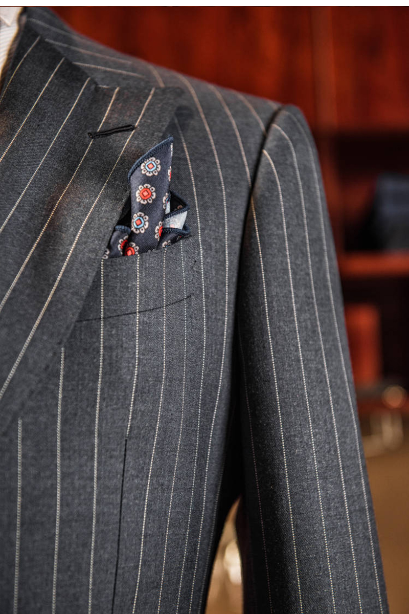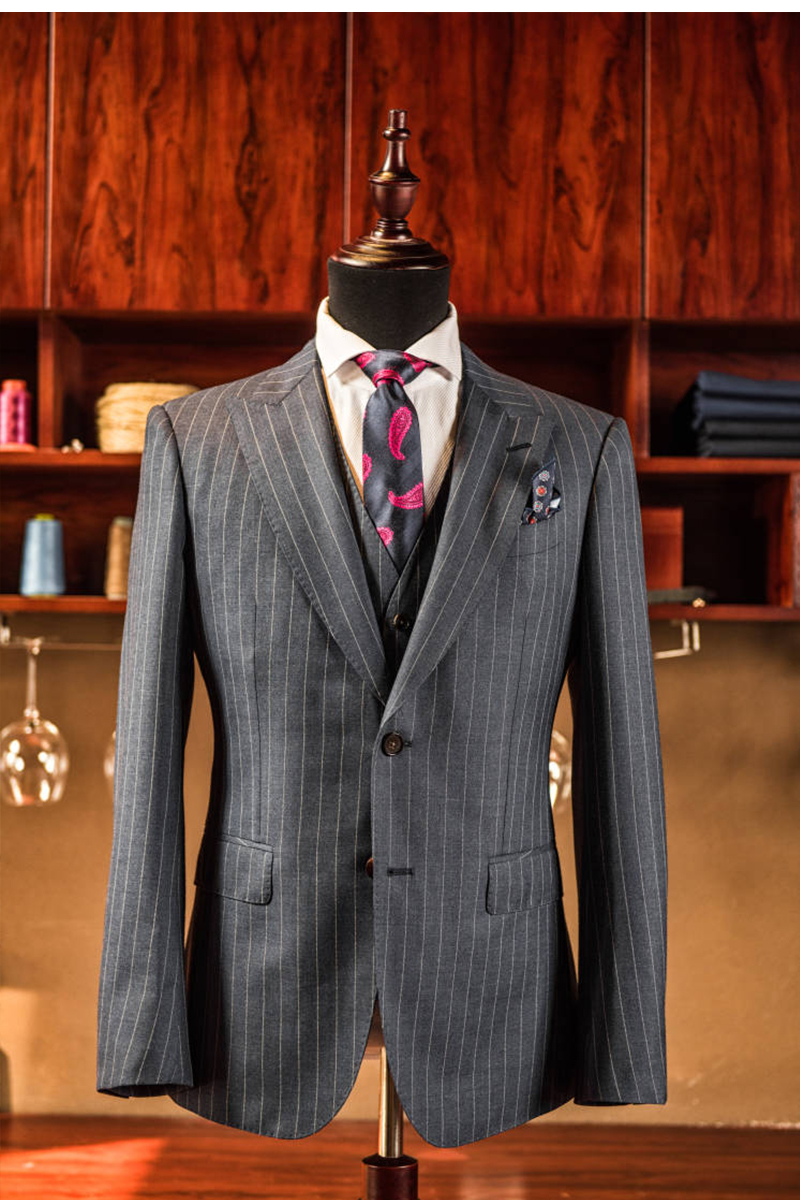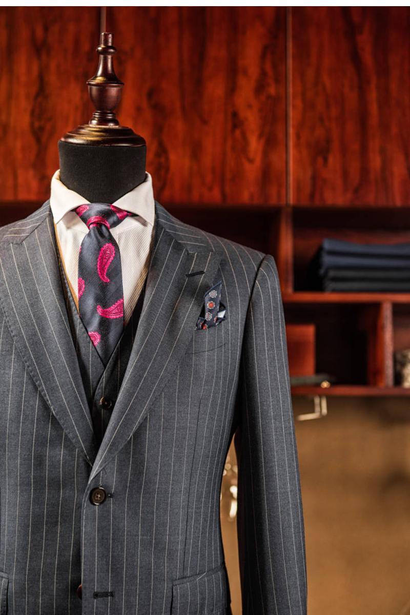 • 雨后的凉意,也是时候提前为秋冬做准备🍂 🍁 经典深灰条纹,可为你既严肃又庄重的职场加分不少。 配搭一条蓝底红色腰果花领带,在严谨之余增添几分雅痞时尚。