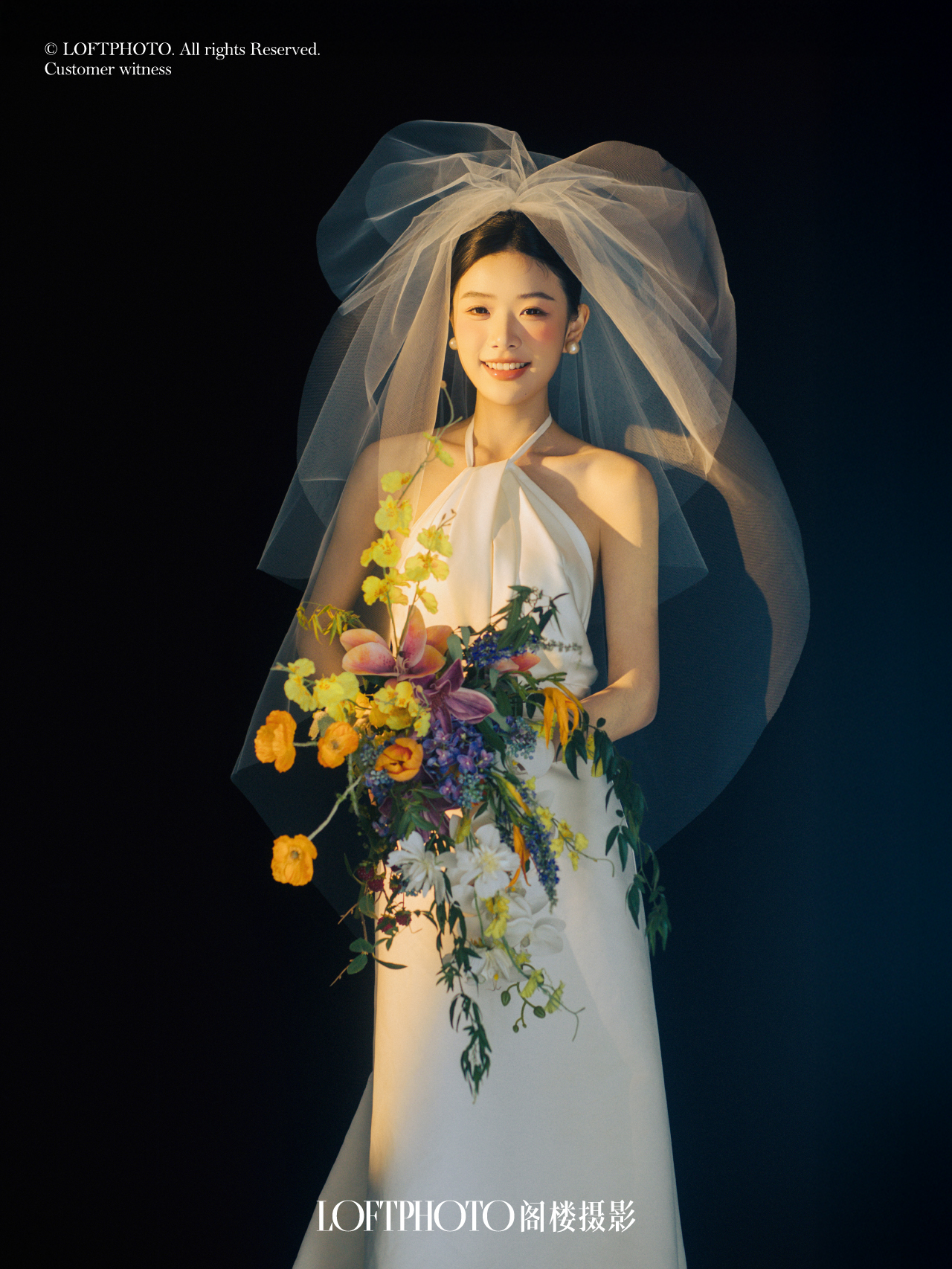 • 一袭大拖尾缎面主纱缀满碎钻星光 手作法式云朵帽纱衬托出新娘优雅高贵的气质 于复古空间中绽放出如诗般的仪式感和故事感#室内高定婚纱照 拍摄:阁楼摄影