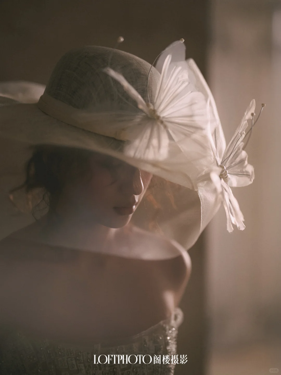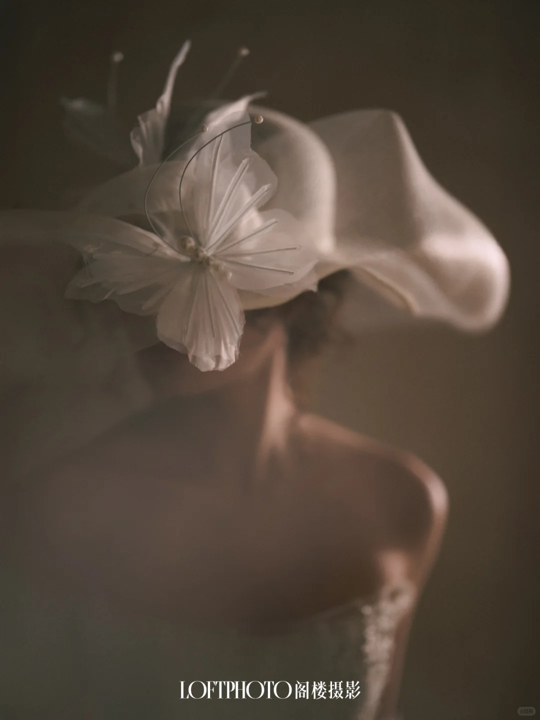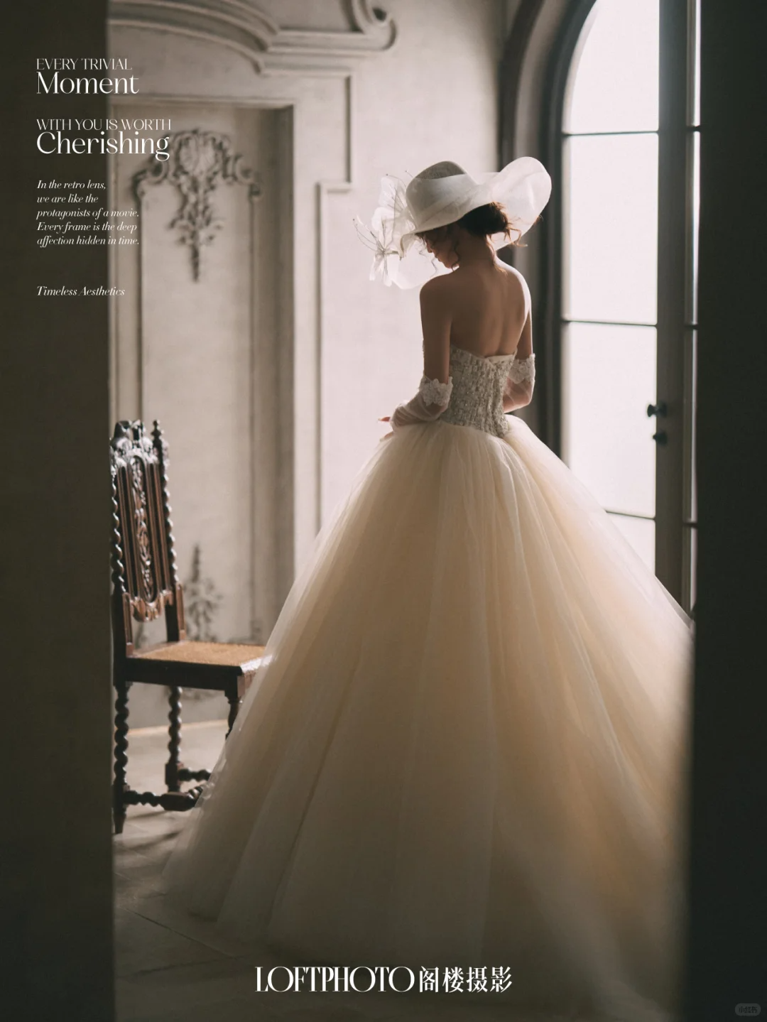 • 充满古典唯美感的复古空间 360度穿透光影打造细腻氛围感 法式背靠椅、水晶灯、帷幔,带来浓郁复古格调 - 法式轻纱大拖尾主纱 手作花朵复古大礼帽 衬托出新娘优雅白月光气质 拍摄:阁楼摄影 #浪漫光影婚纱照