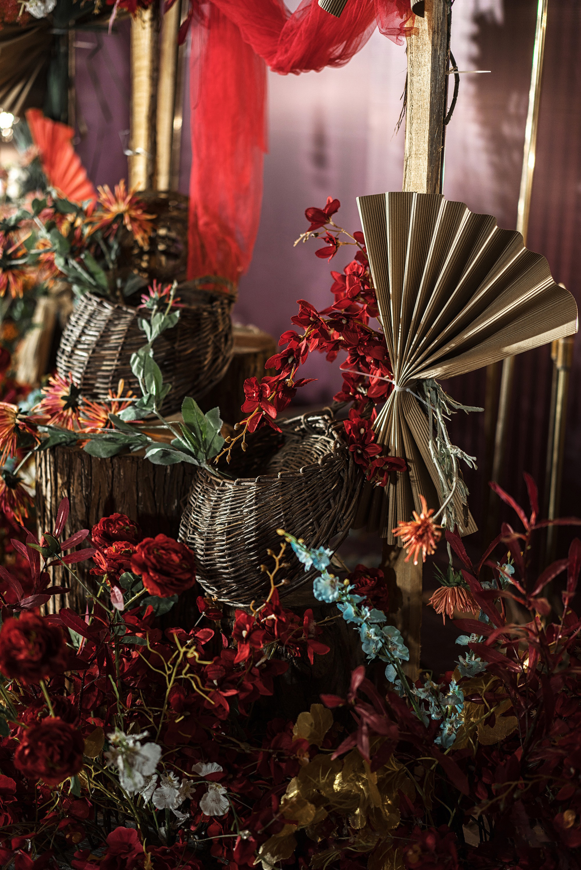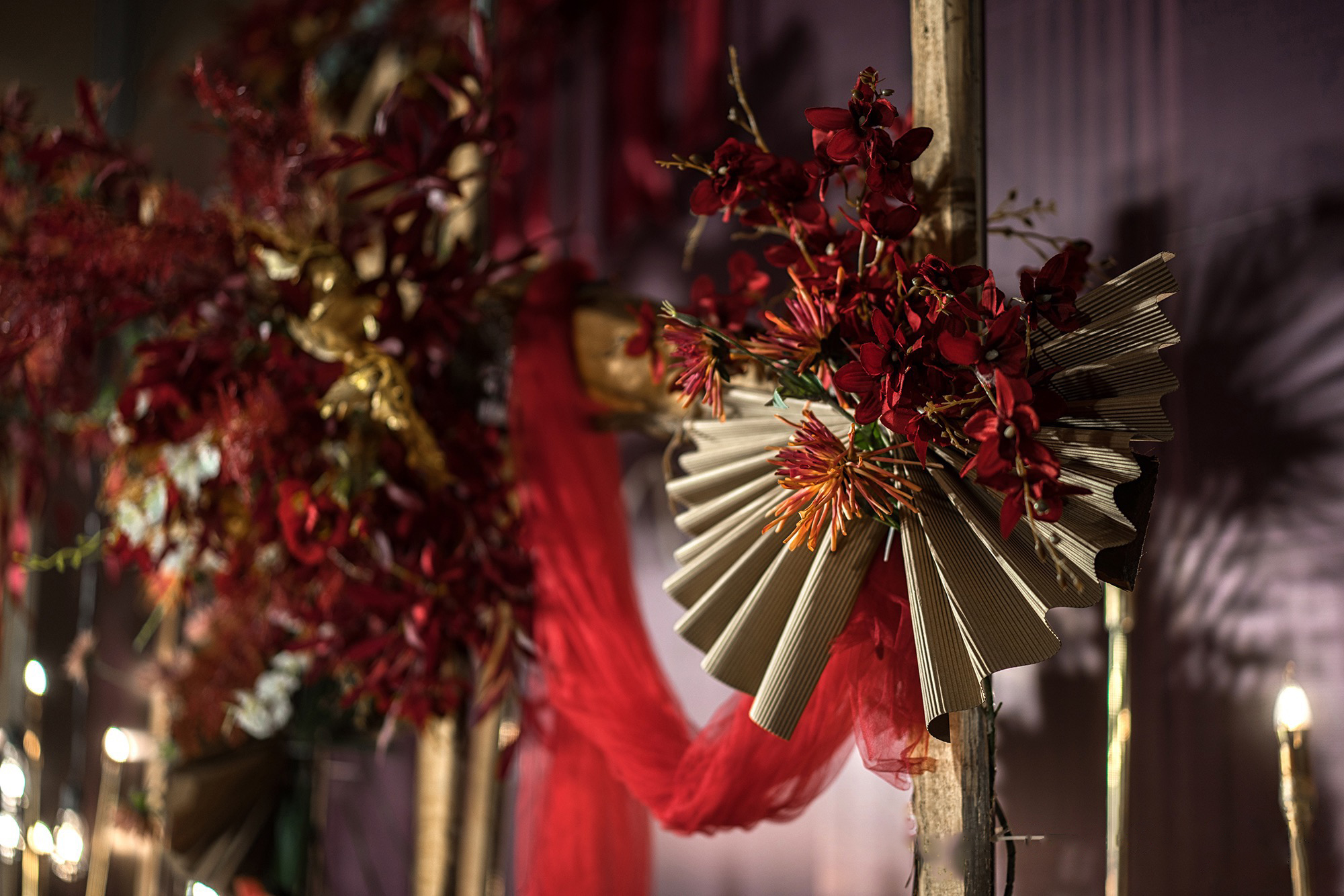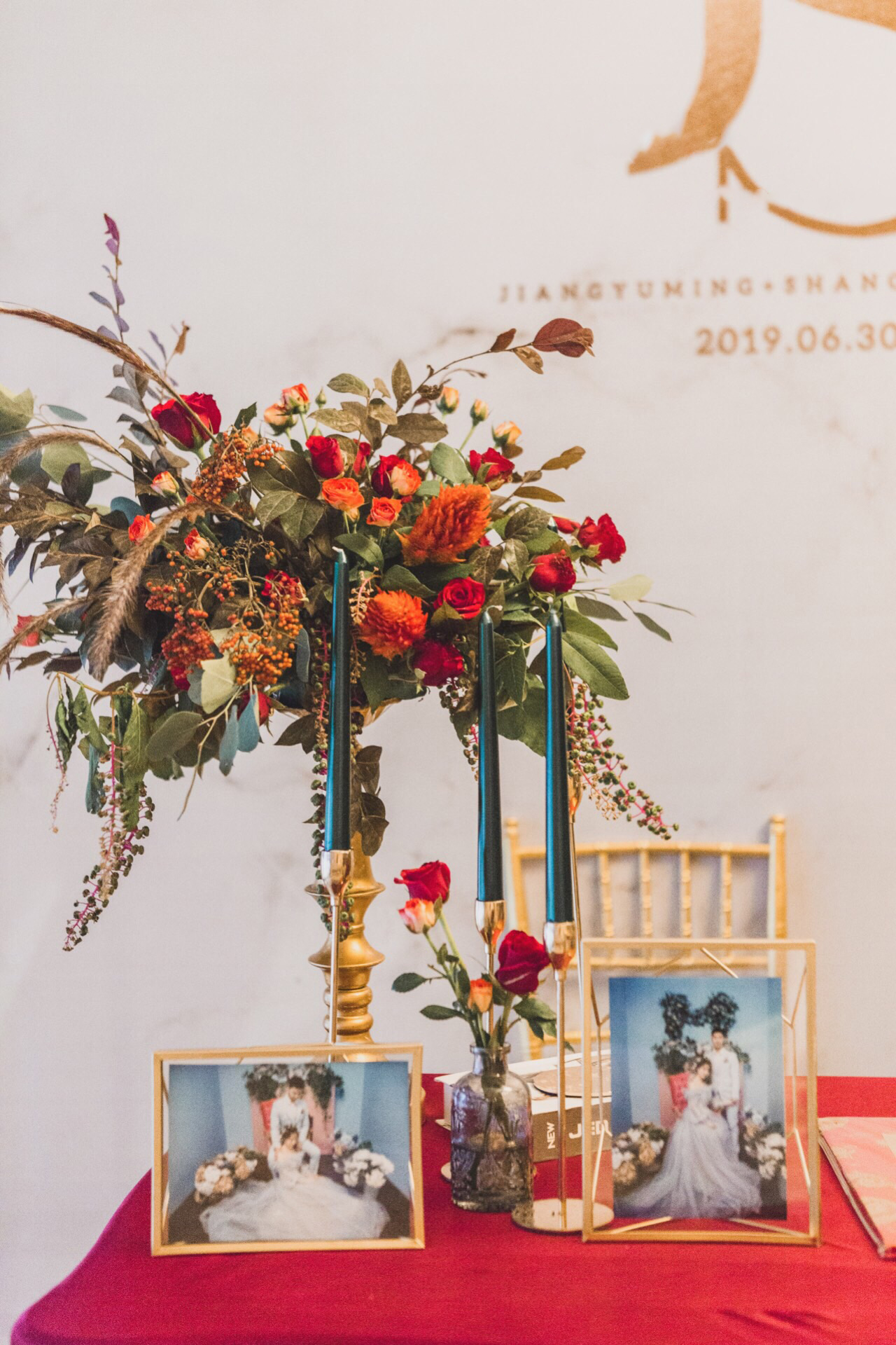 • 良辰吉日,二族崇饰 嘉宾僚党,祁祁云聚 威仪有序,骖騑如举。 蒋莫联姻,天作之合 。 金钗玉翘,旖旎风情,凤凰梁三绕。 那三千缠绵花鼓,只为一人花解语。
