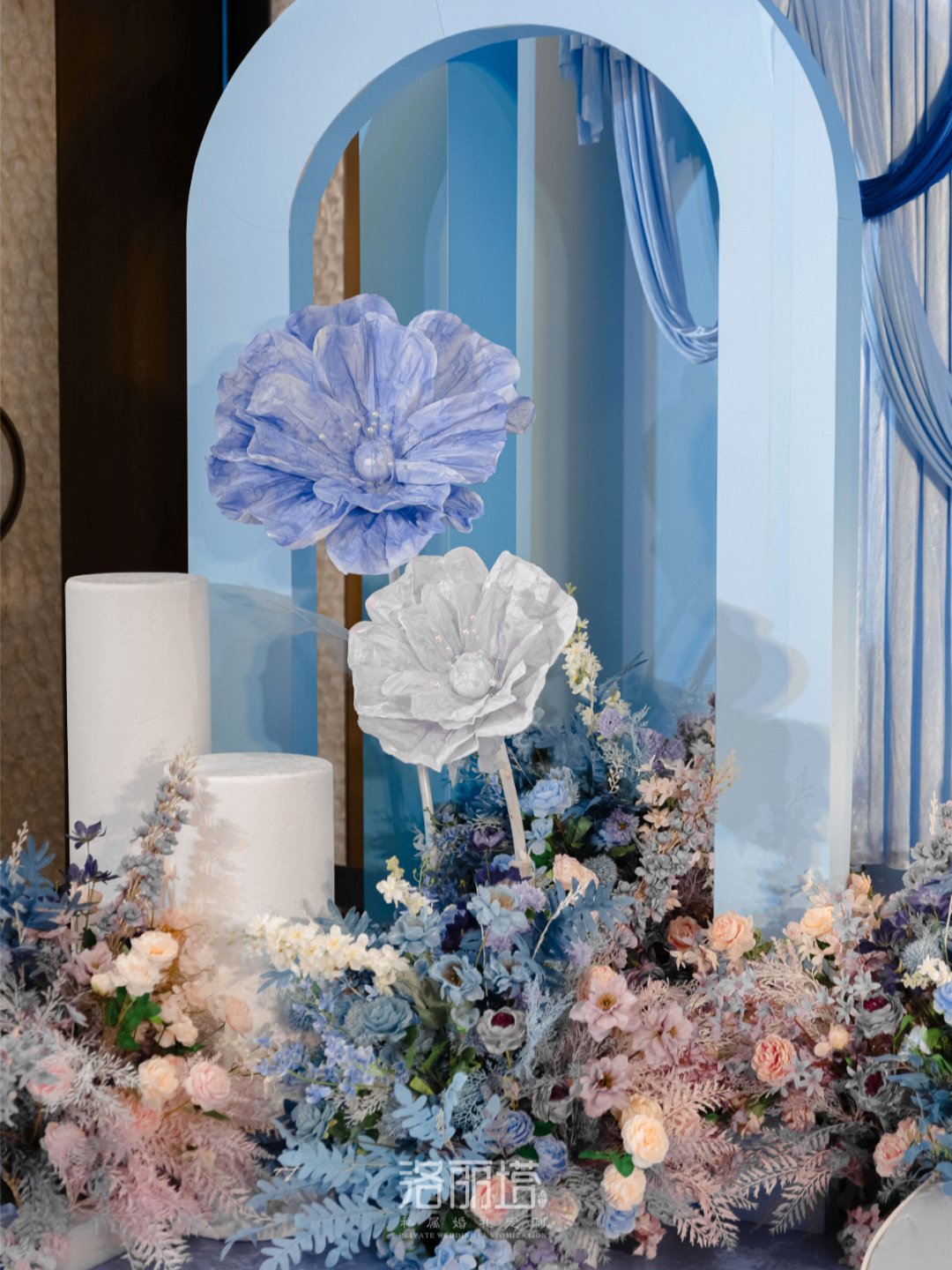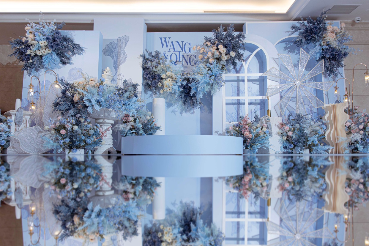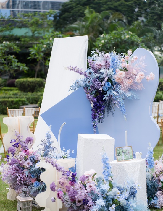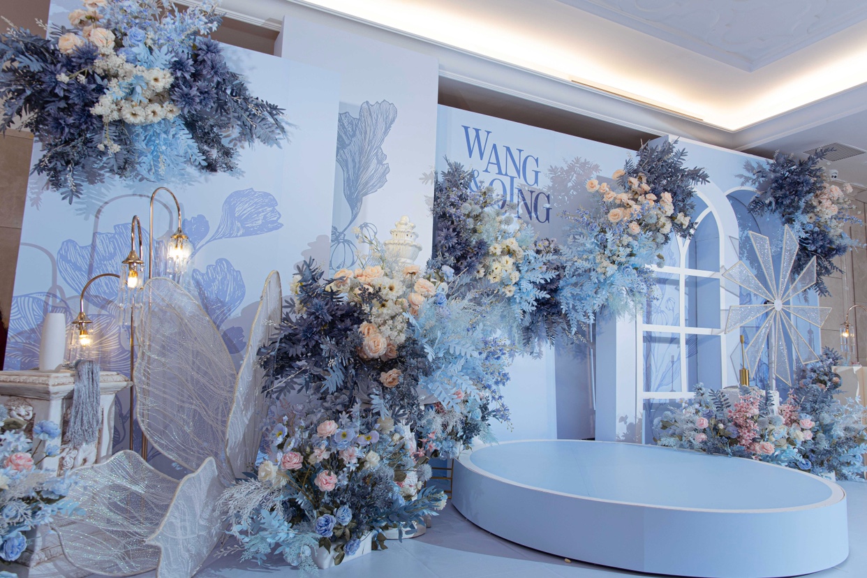 • 本场婚礼以简洁的蓝色为主色调 设计上看似简约却满满的细节 多块异型镂空的KT搭配层次更加的突出 大型立体的姓氏首字母 大大提升了小众高级感! - 搭配着唯美优雅的紫色系 再增添许多精致的少女元素 整体更是梦幻又大气! - ▫️婚礼坐标:中山金上濠大酒楼 ▫️婚礼色系:蓝色+紫色