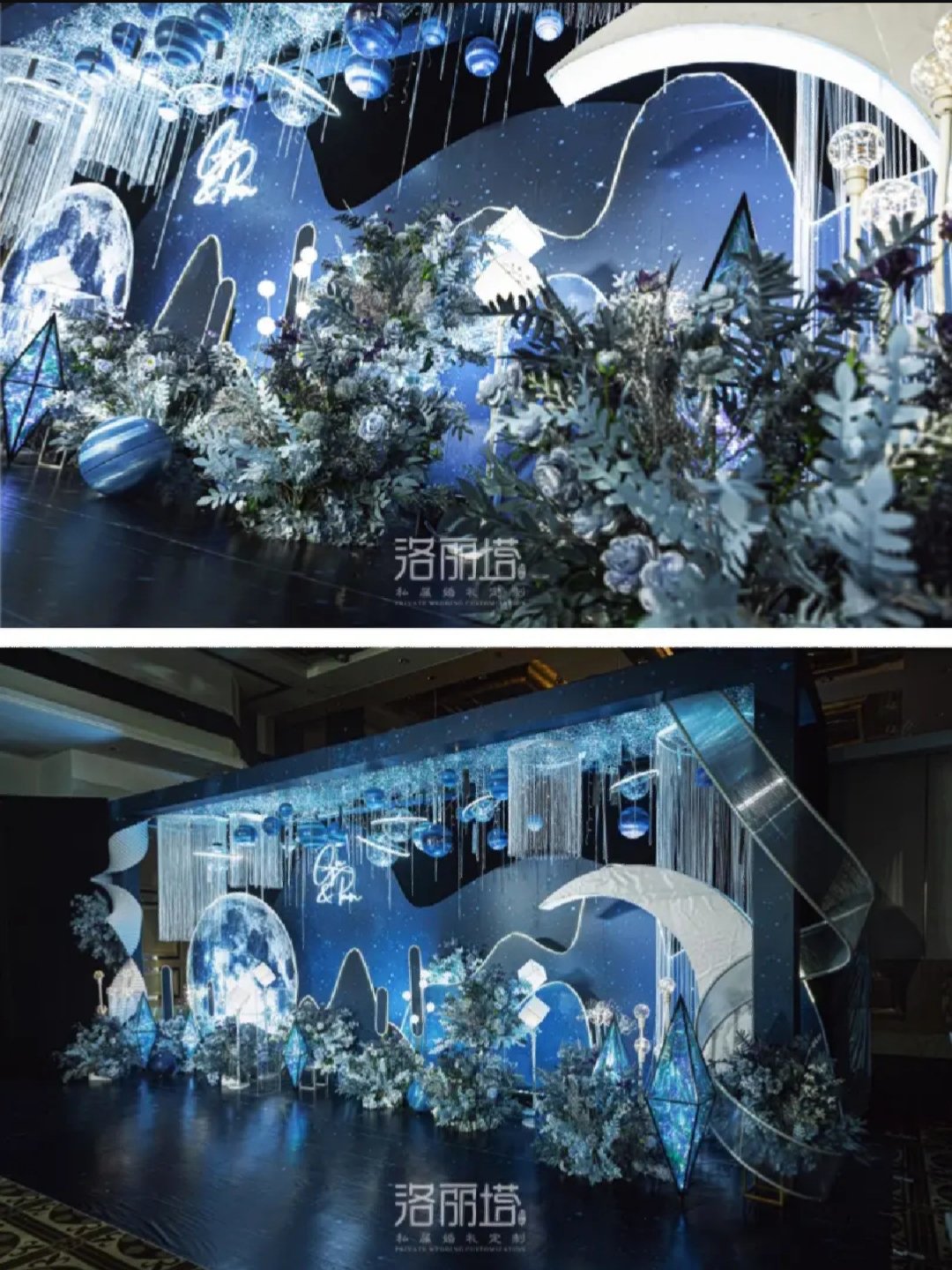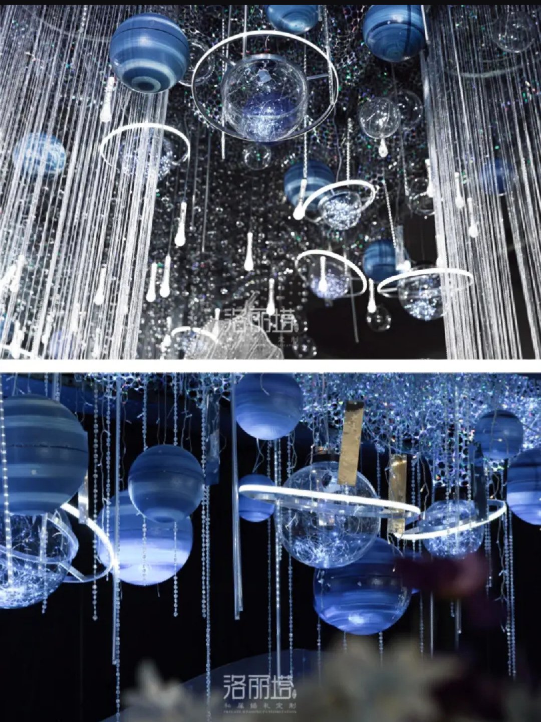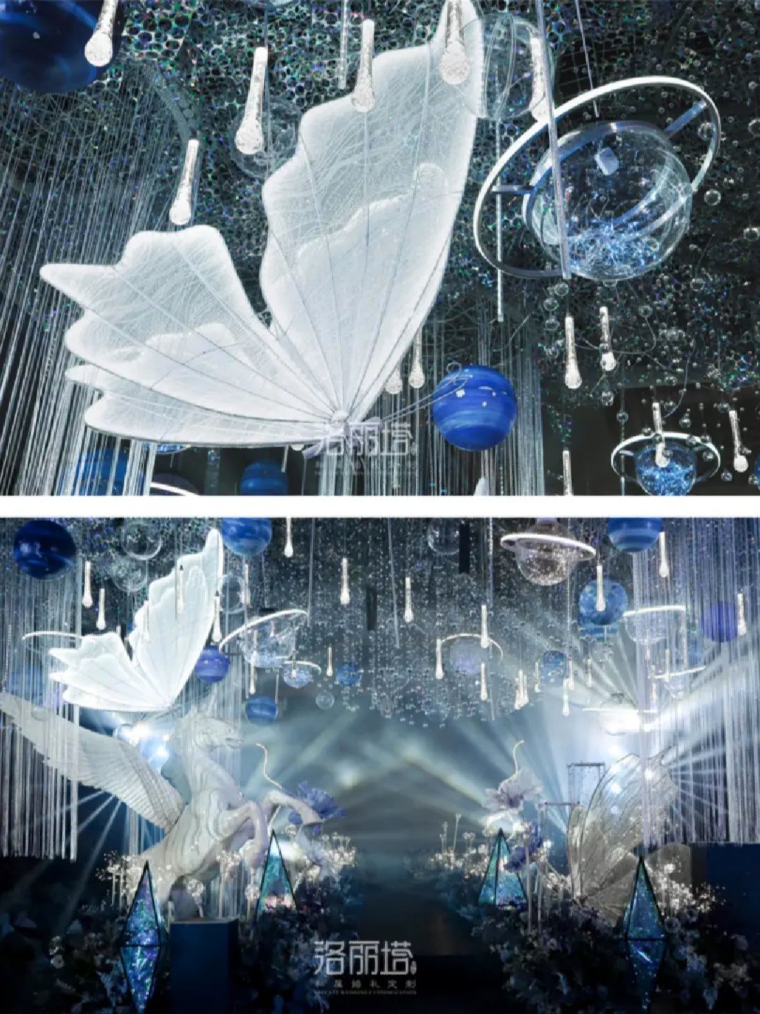 • 婚礼灵感 在浩瀚无垠的宇宙里,除了星星点点的光,还有你✨ - 婚礼元素 合影区与仪式区采用了关于星空系列婚礼标志性的元素,镭射网铺顶,大大的月亮,梦幻的飞马 加上各种圆形星球以长条型流星元素点缀吊顶上。把整个婚礼现场打造出星空色彩,这是女生对幸福生活的向往