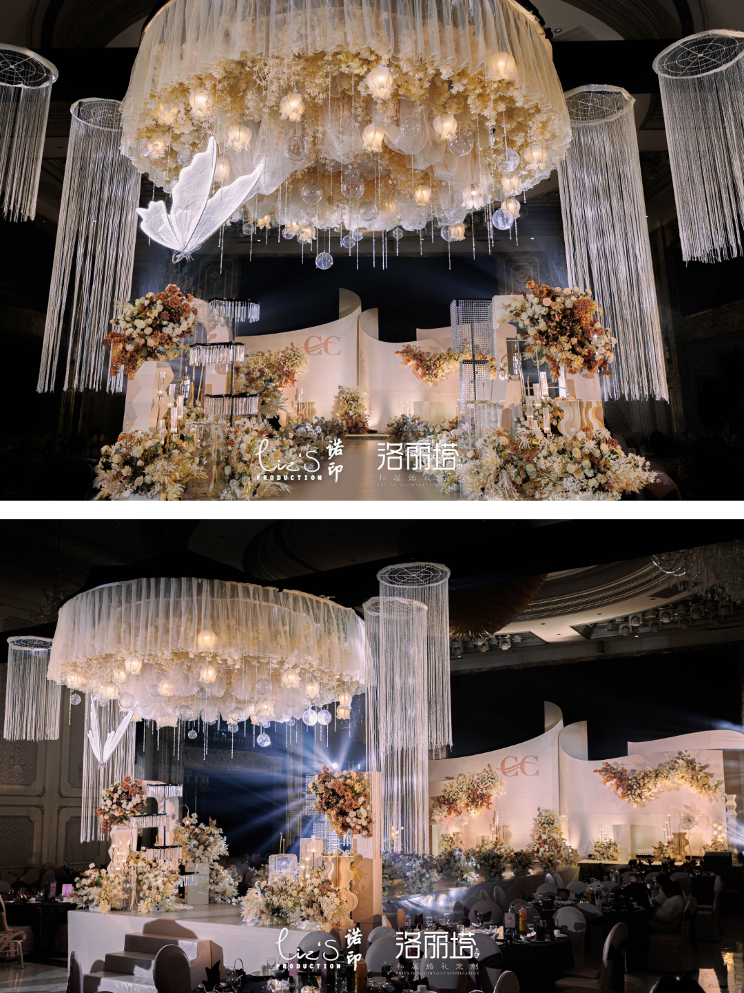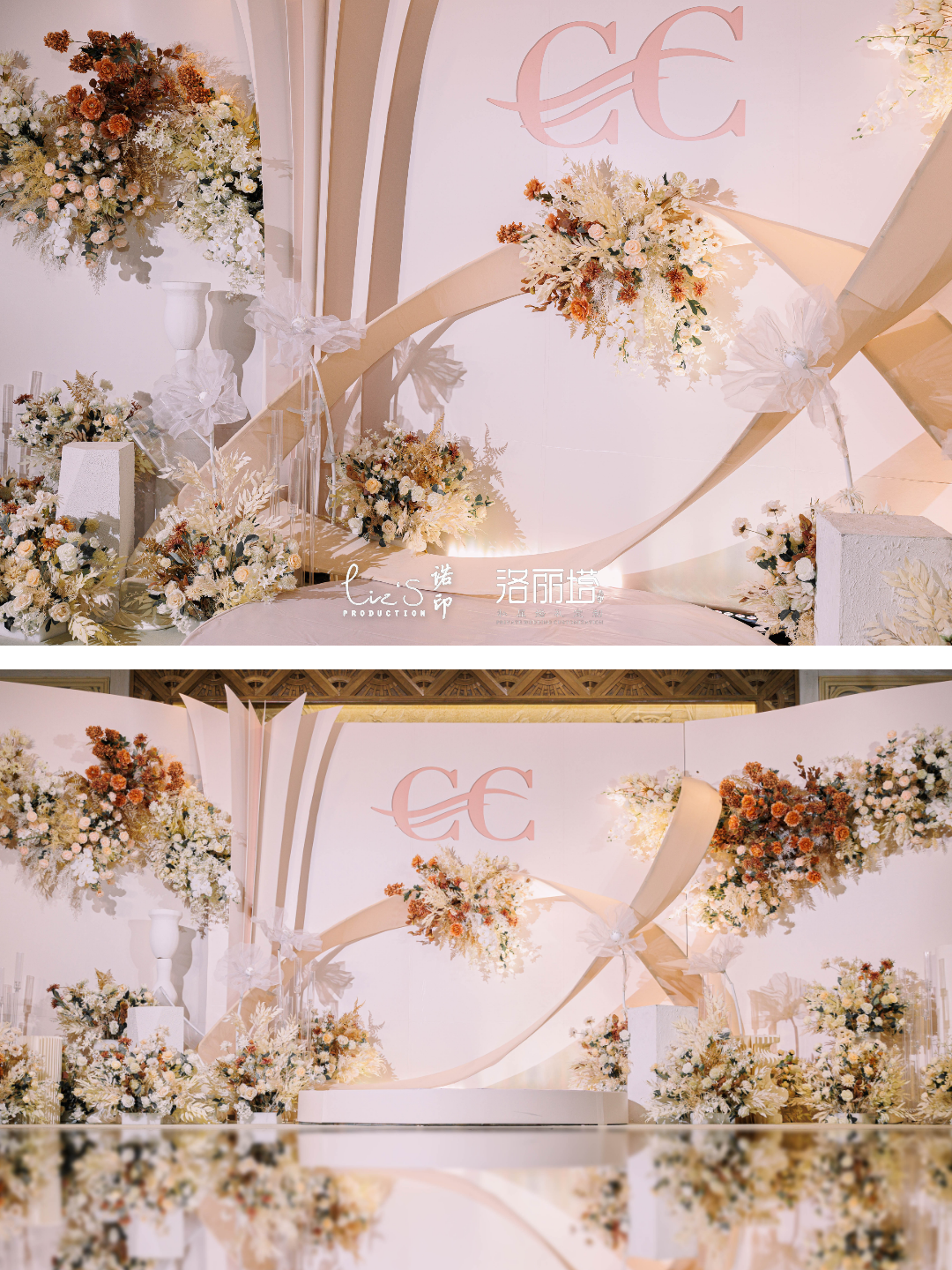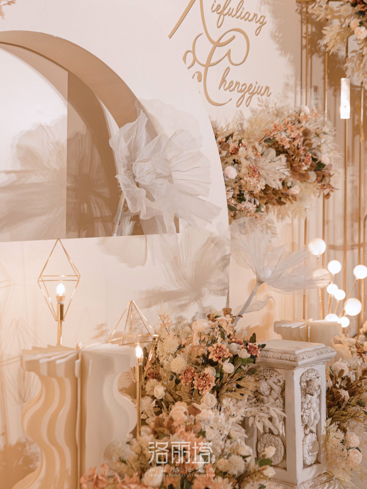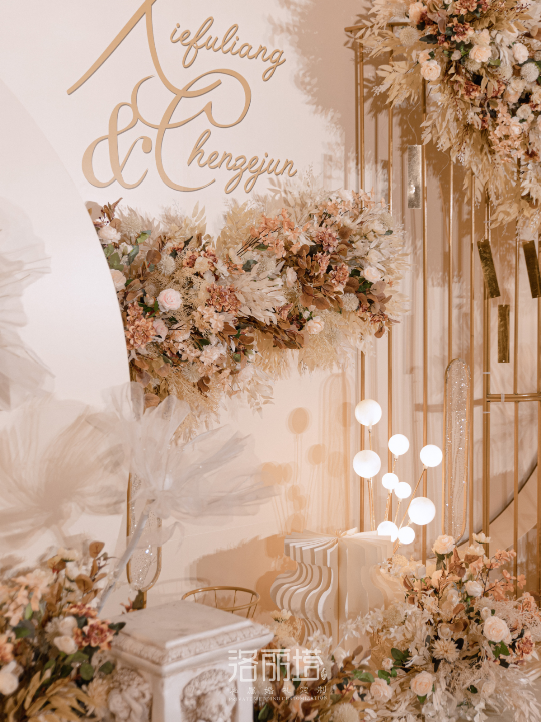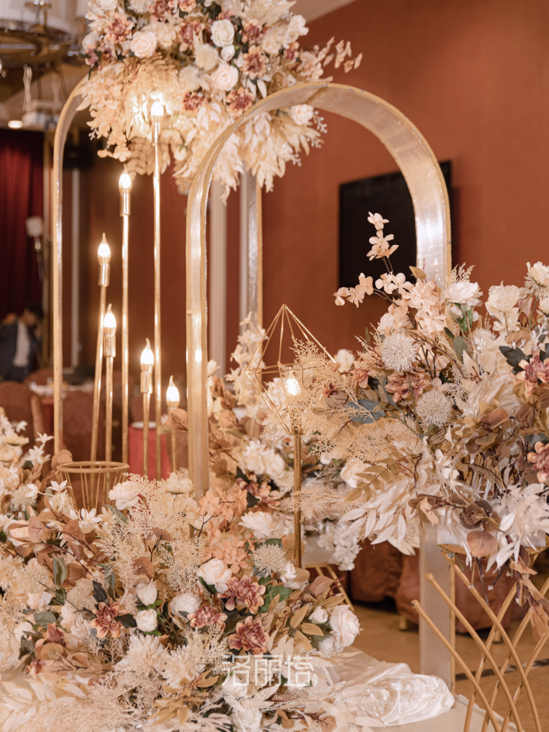 • 永不过时的香槟色系婚礼 添加“圆”的设计,带着微新中式的情怀 整体素雅柔和的感觉,却造型感丰富 - 低调却高级的香槟色 暖光与白光的相互搭配, 也让婚礼现场有了温馨融洽的氛围感