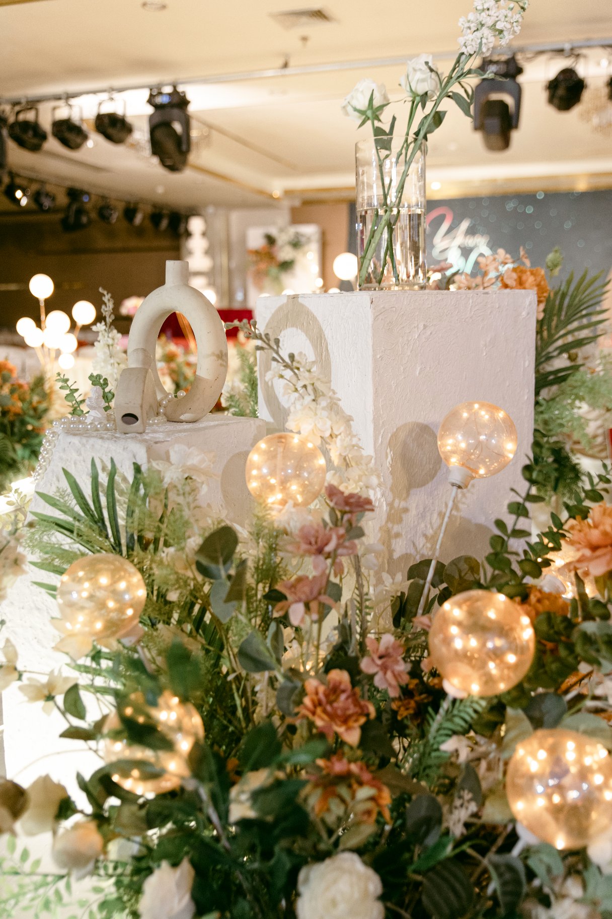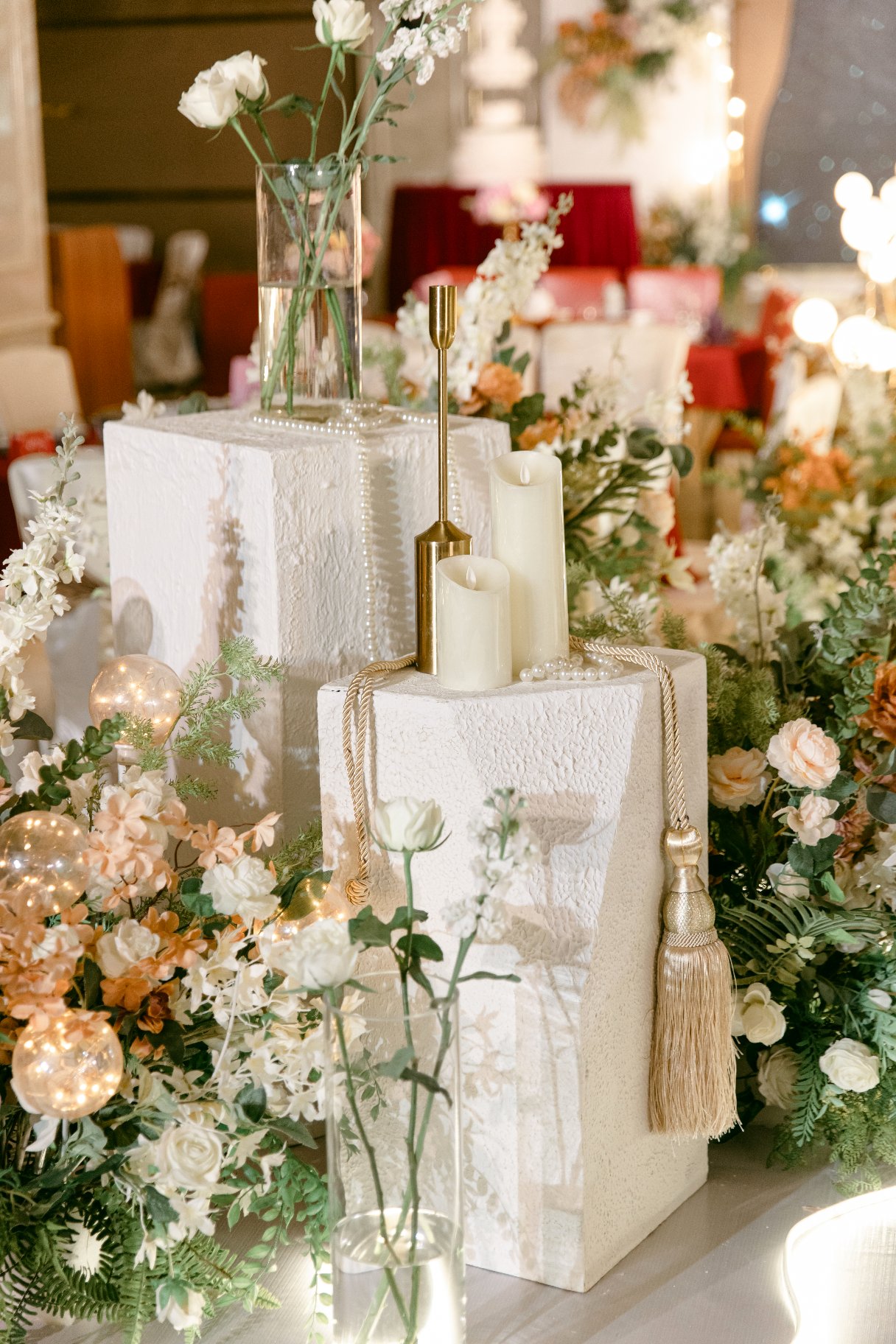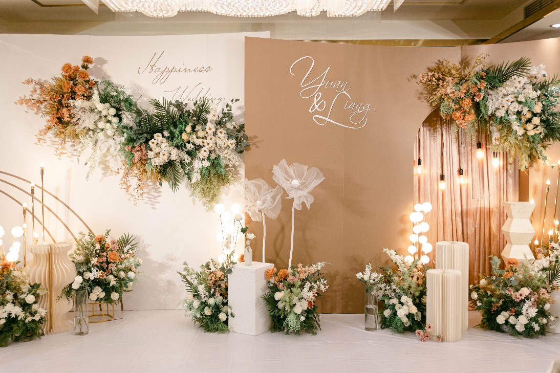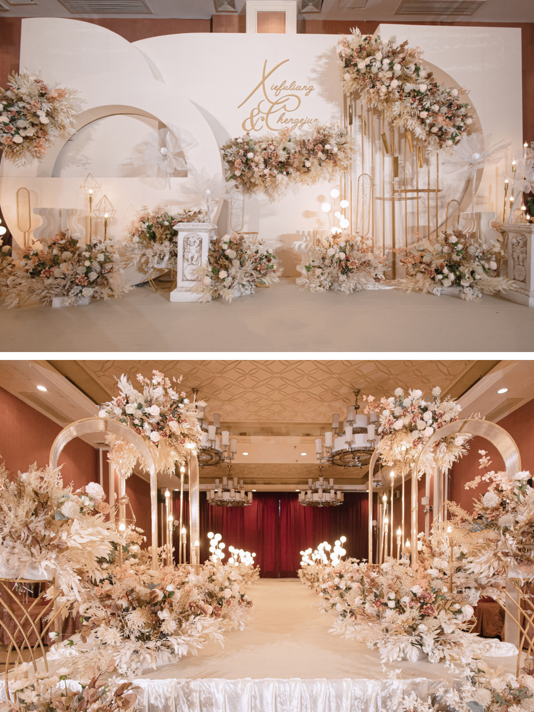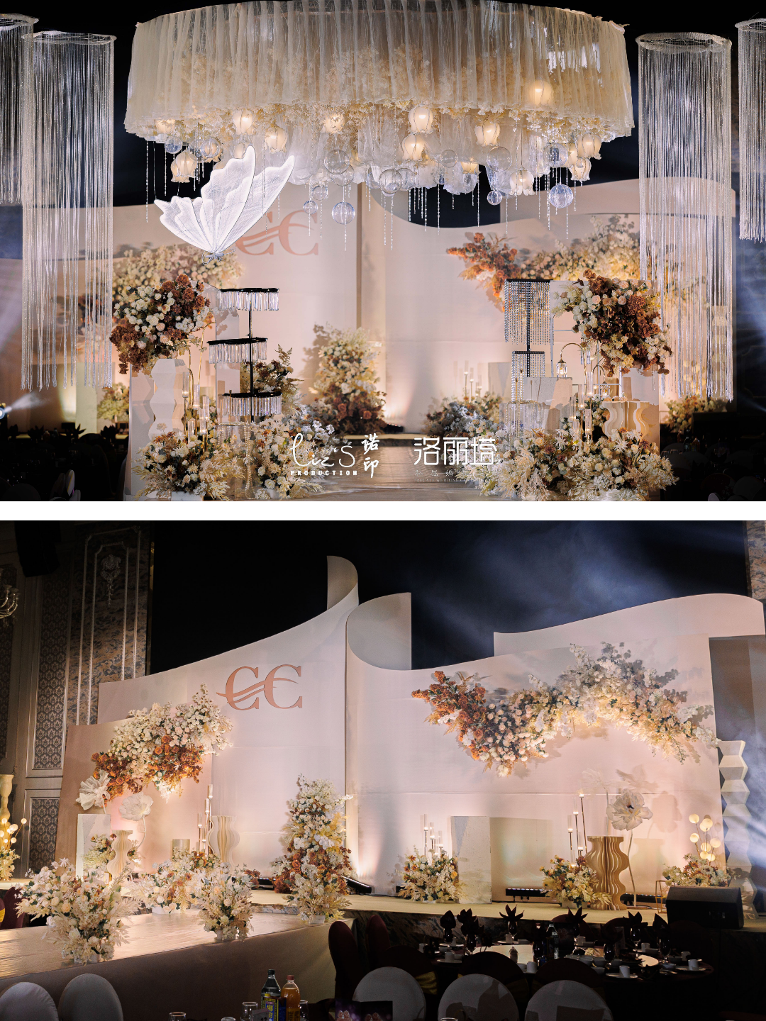 • 永不过时的香槟色系婚礼 添加“圆”的设计,带着微新中式的情怀 整体素雅柔和的感觉,却造型感丰富 - 低调却高级的香槟色 暖光与白光的相互搭配, 也让婚礼现场有了温馨融洽的氛围感