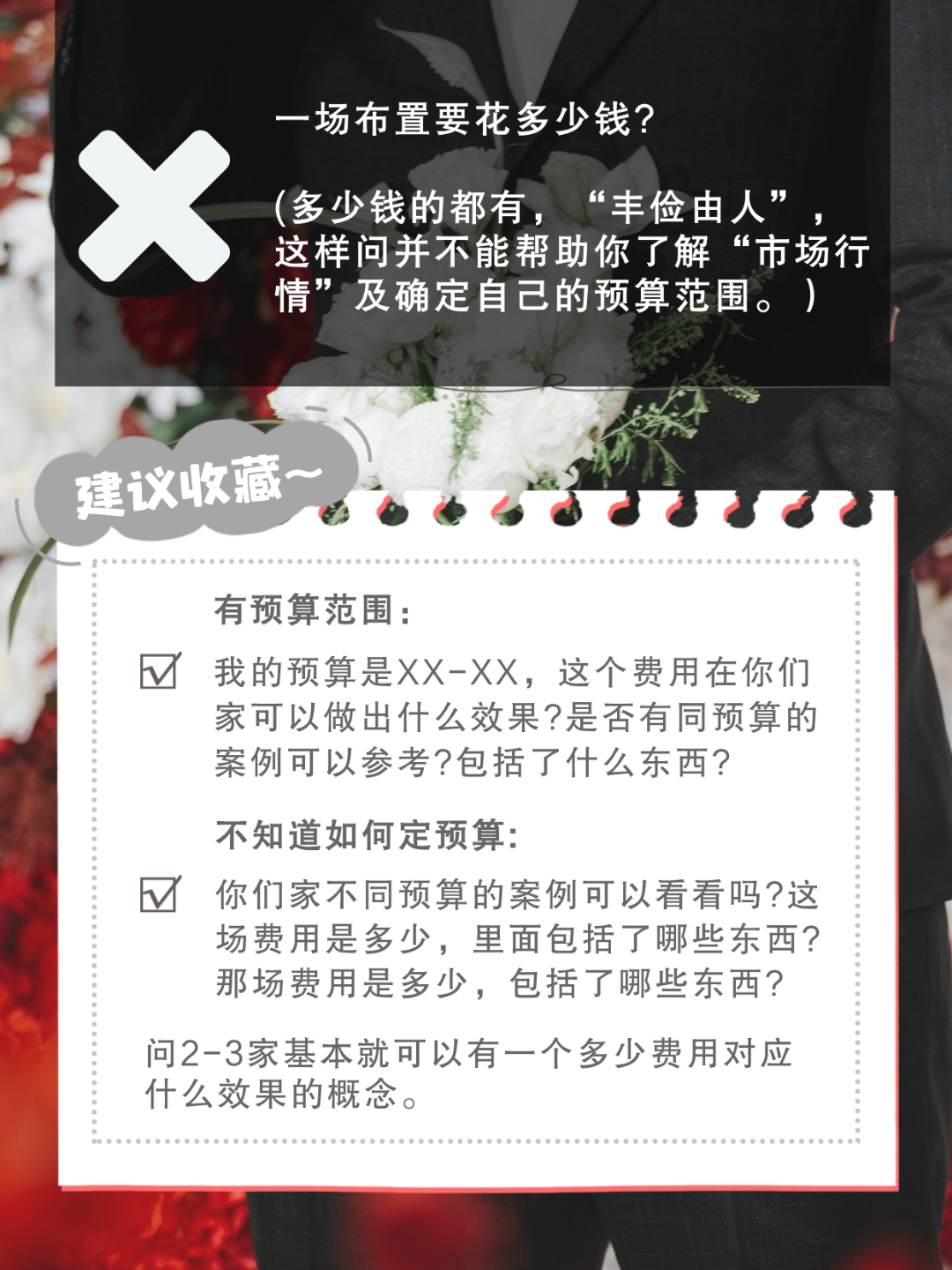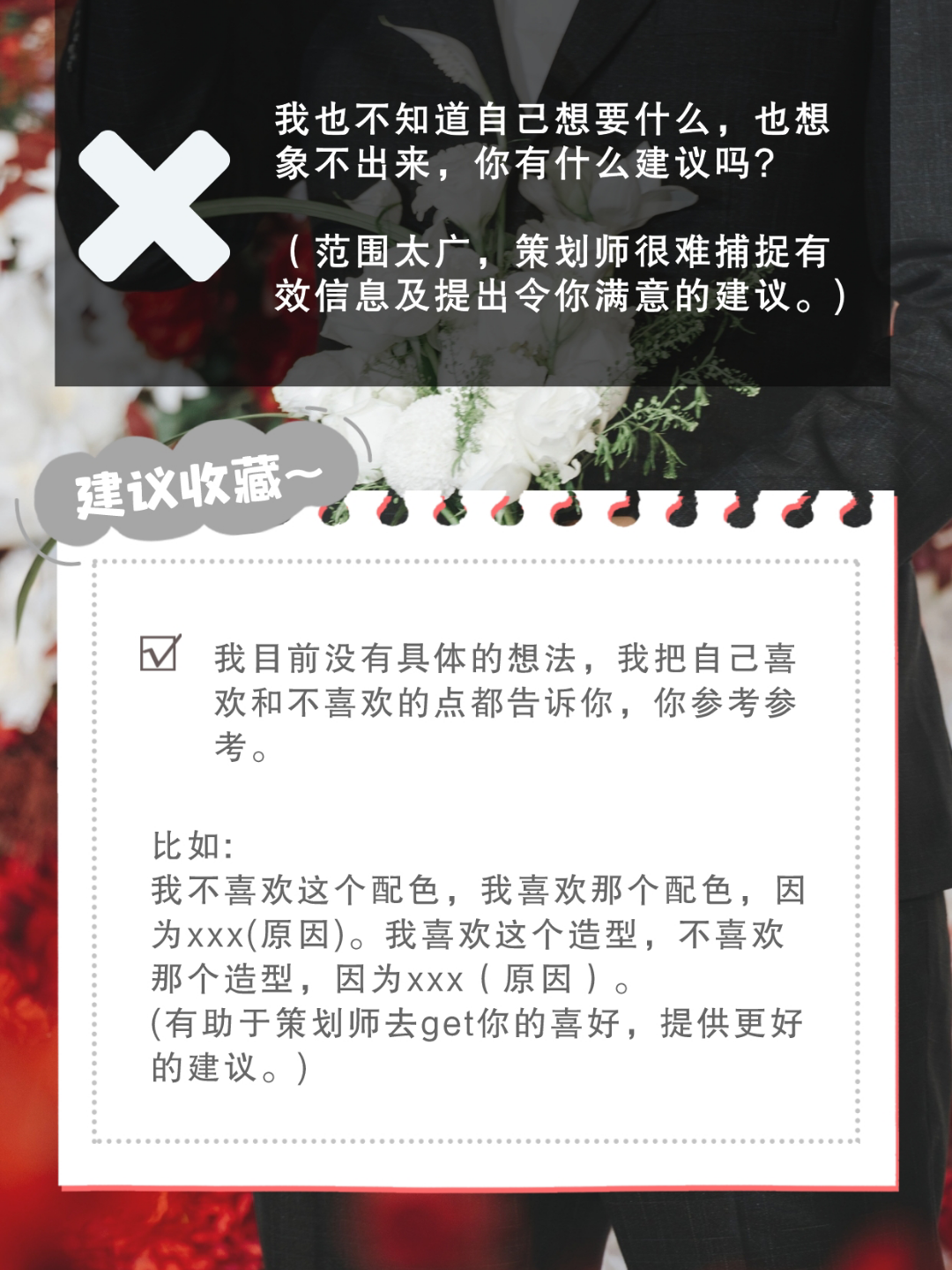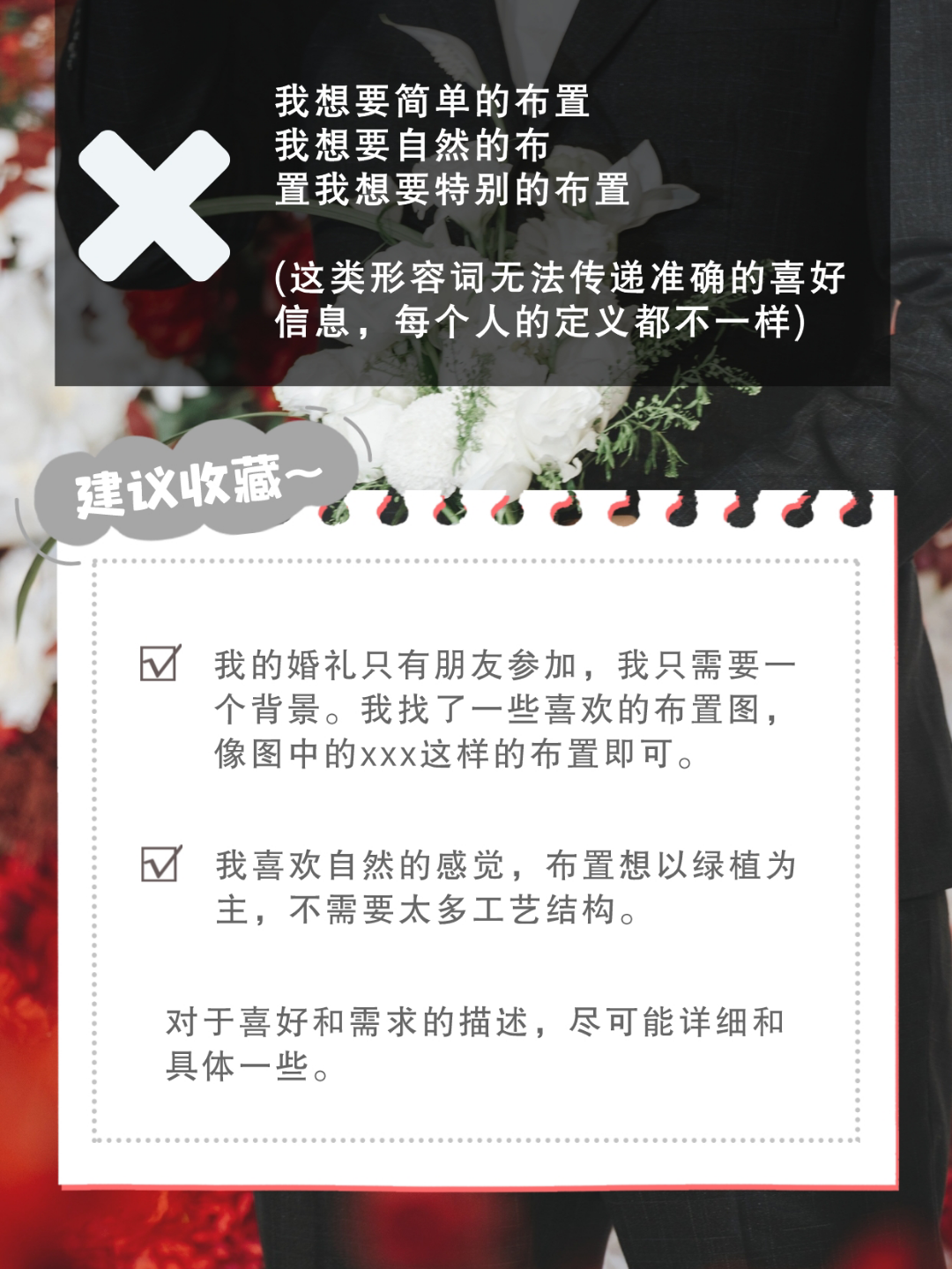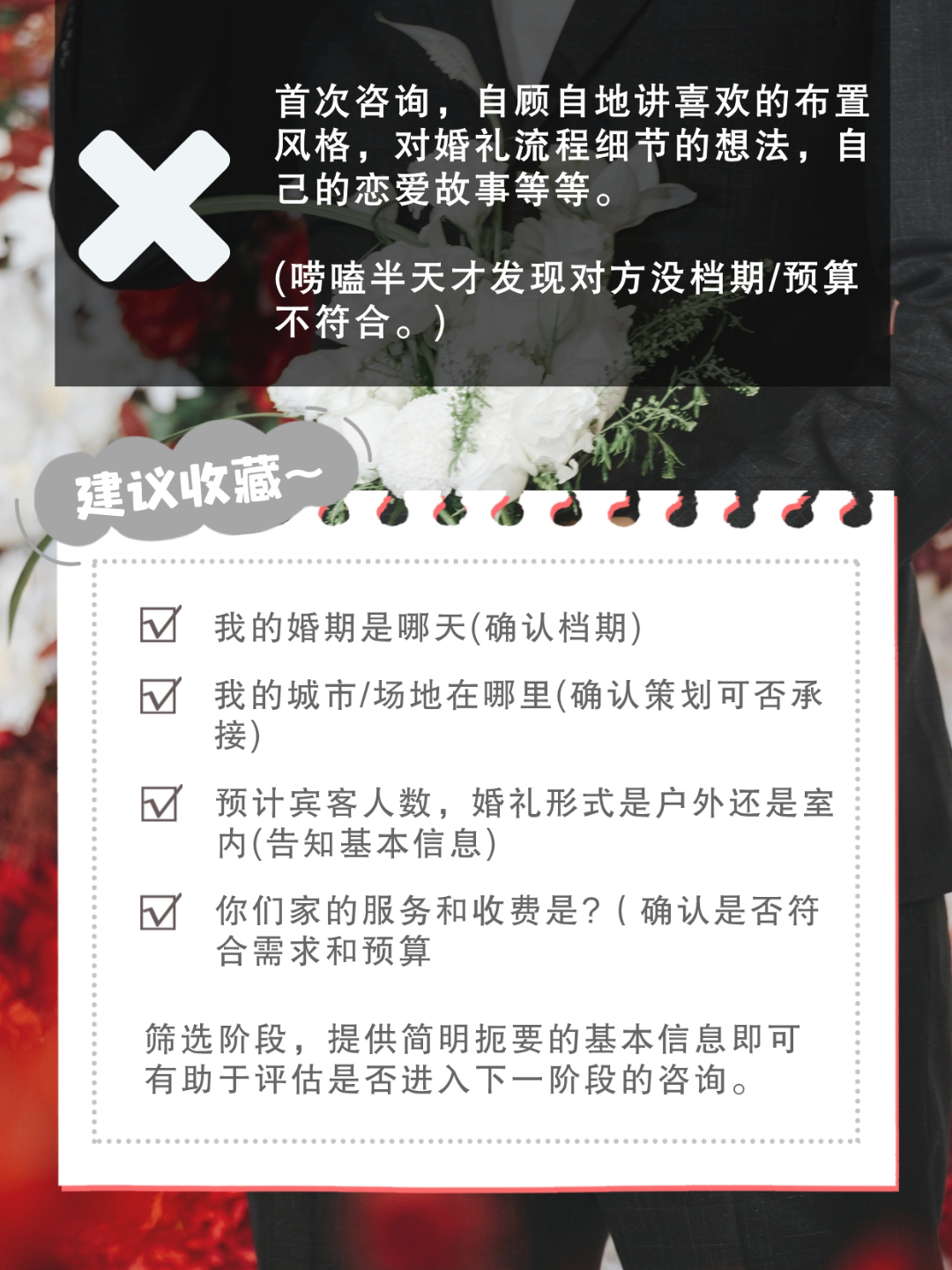 • 婚的新人来说,初次跟策划师聊自己婚礼的时候,都会有一些阻碍,要么总谈不到点上,要么就考虑不到实际执行度。 - ⚠️与策划师如何有效沟通: 1⃣️确认档期 2⃣️确认场地 3⃣️告知基本信息 4⃣️确认是否符合需求和预算 5⃣️与策划沟通自己的喜好和需求 - 正确有效的沟通,能更有助于策划去实现新人预算范围内所期待的婚礼效果,避雷因沟通上的误解而导致的不完美因素。