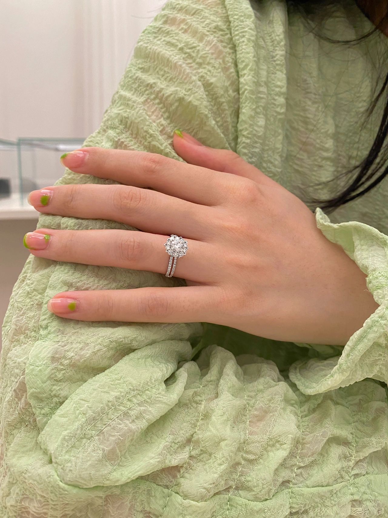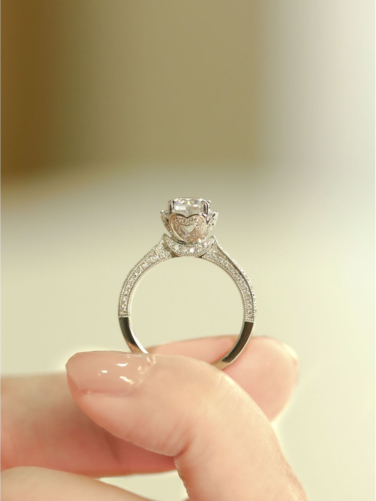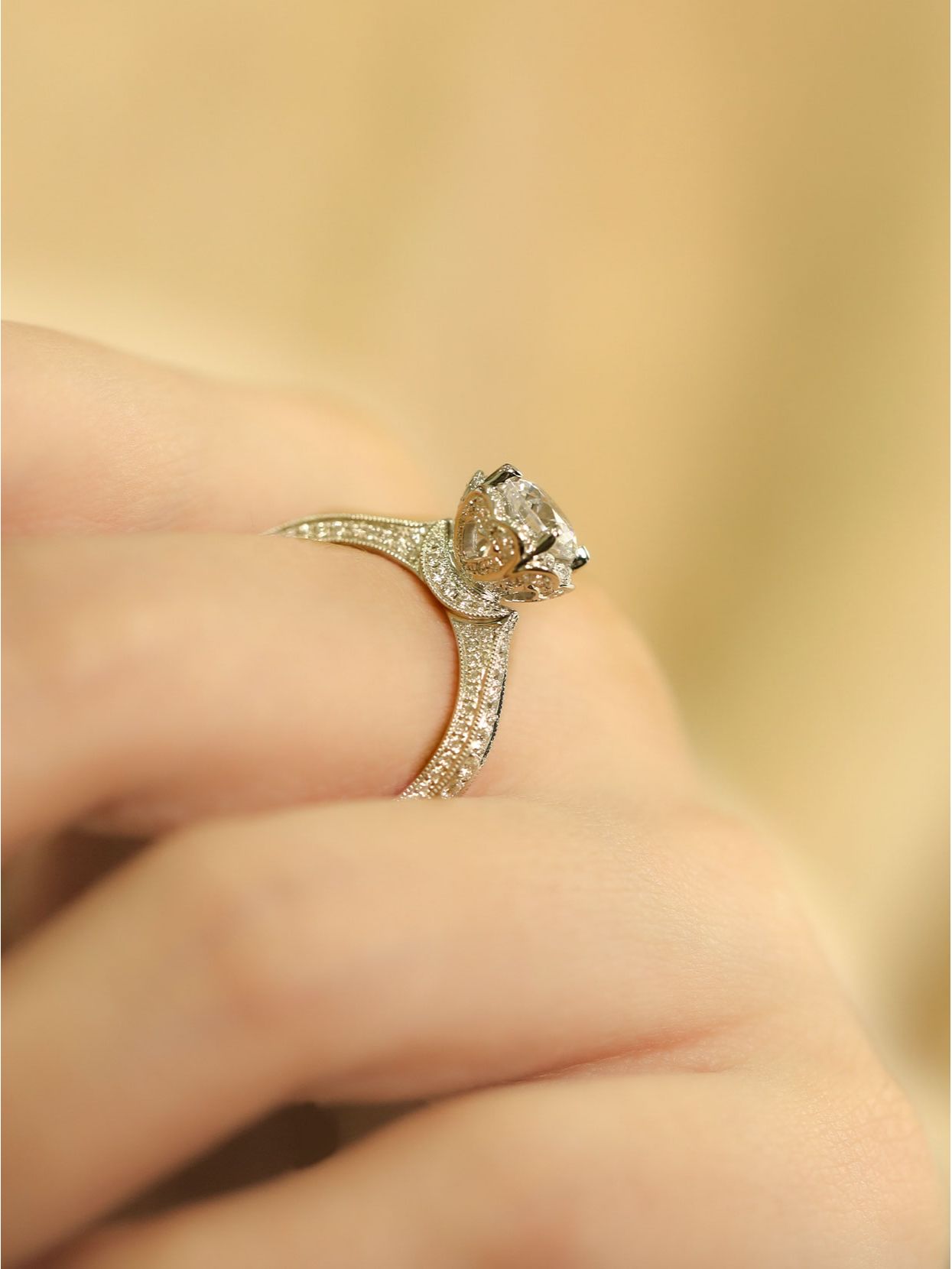 • 有没有宝宝想要钻戒显大又不复杂呢? 💍『花蕊』钻戒肯定符合要求 正面简约四爪,70分媲美1克拉效果👌🏻 🌸侧面镂空花瓣设计,细节考究 钻石折射无遮挡,火彩满满✨✨ #西安蒙迪亚培育钻石婚戒定制