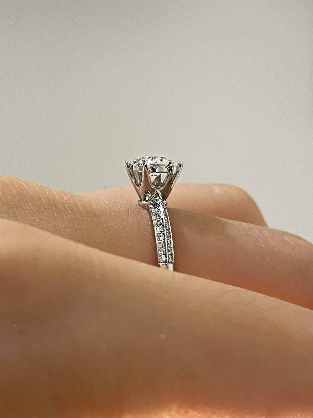 • 一直对这种很有设计感的钻戒特别有好感!从一开始就决定要买个显钻又好看的款式,所以当我买到这个复古款的钻戒,不仅在外观上精致又有气质,而且也是独一无二的,让我满足到不行,本来有点点恐婚的我一下子都释然了!我的手是属于比较细的那种,带这种显钻款的戒指真的很大气!可以说是心中所想,手中所得,幸福感和满足感真的爆棚了!