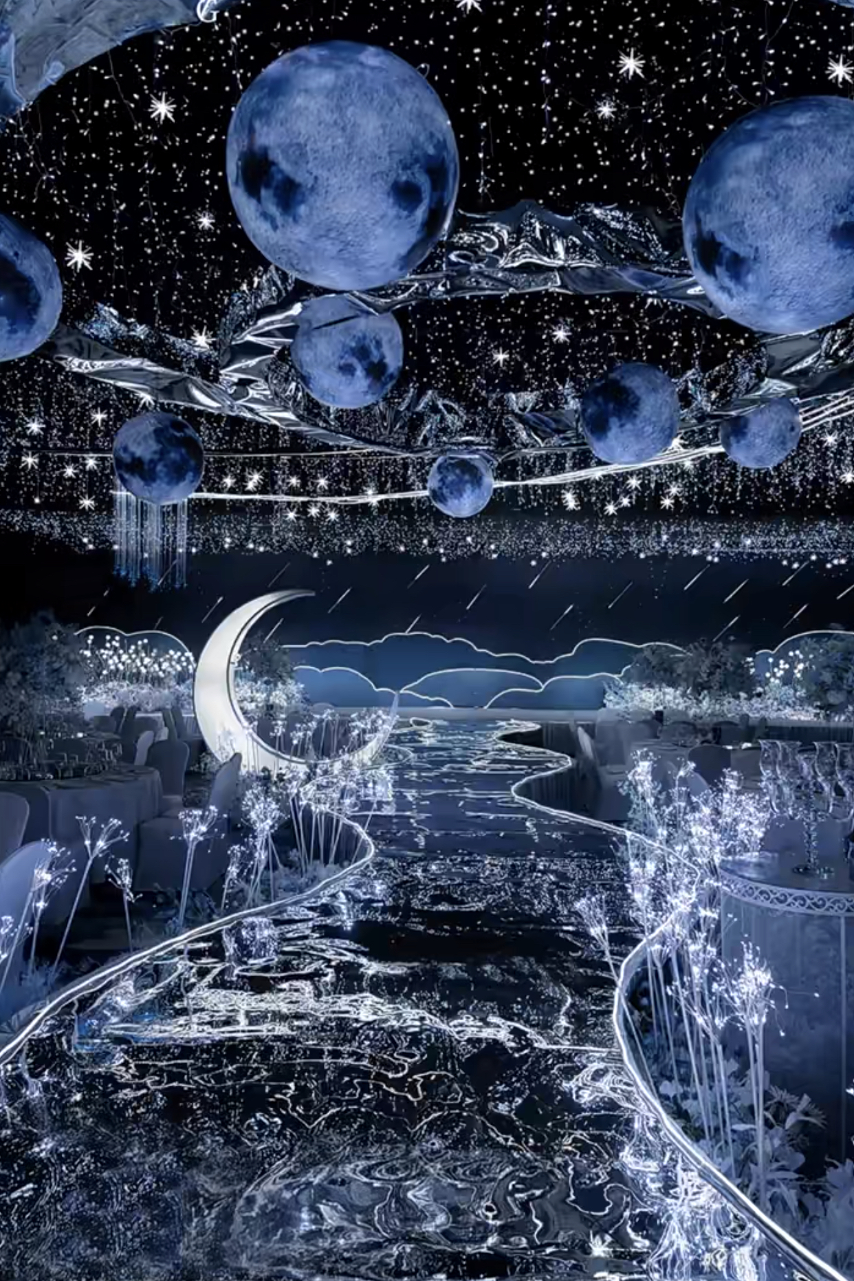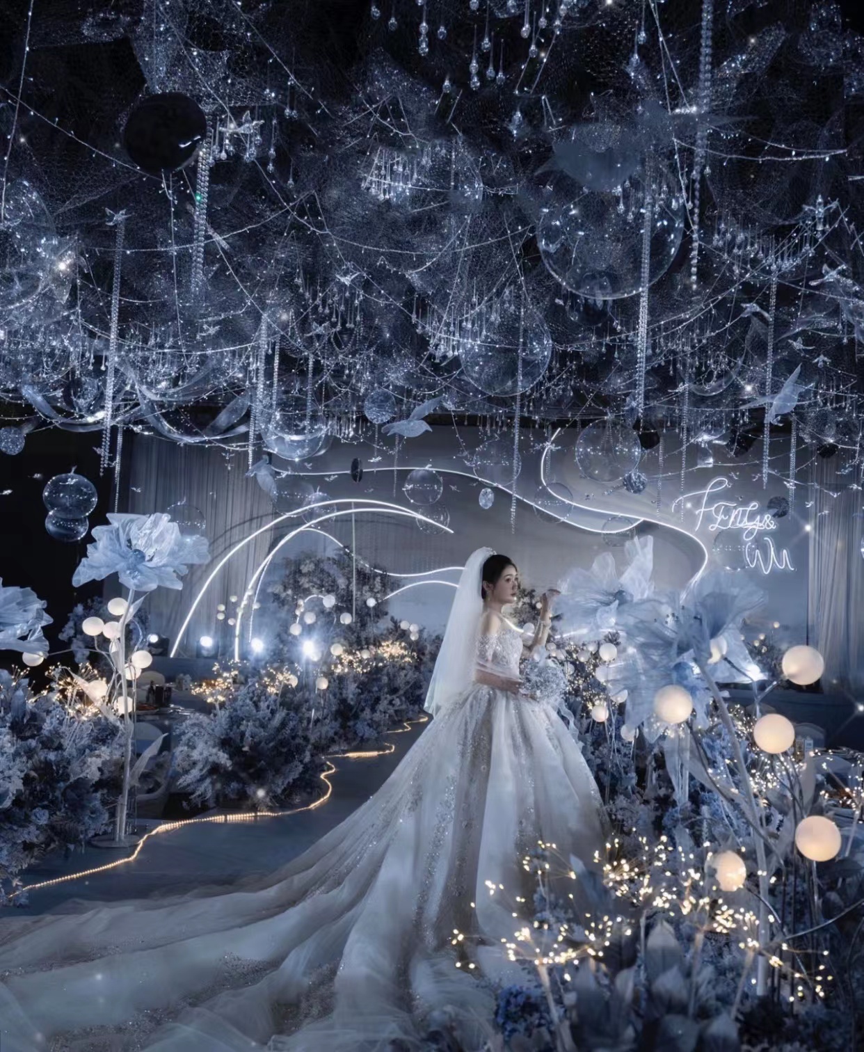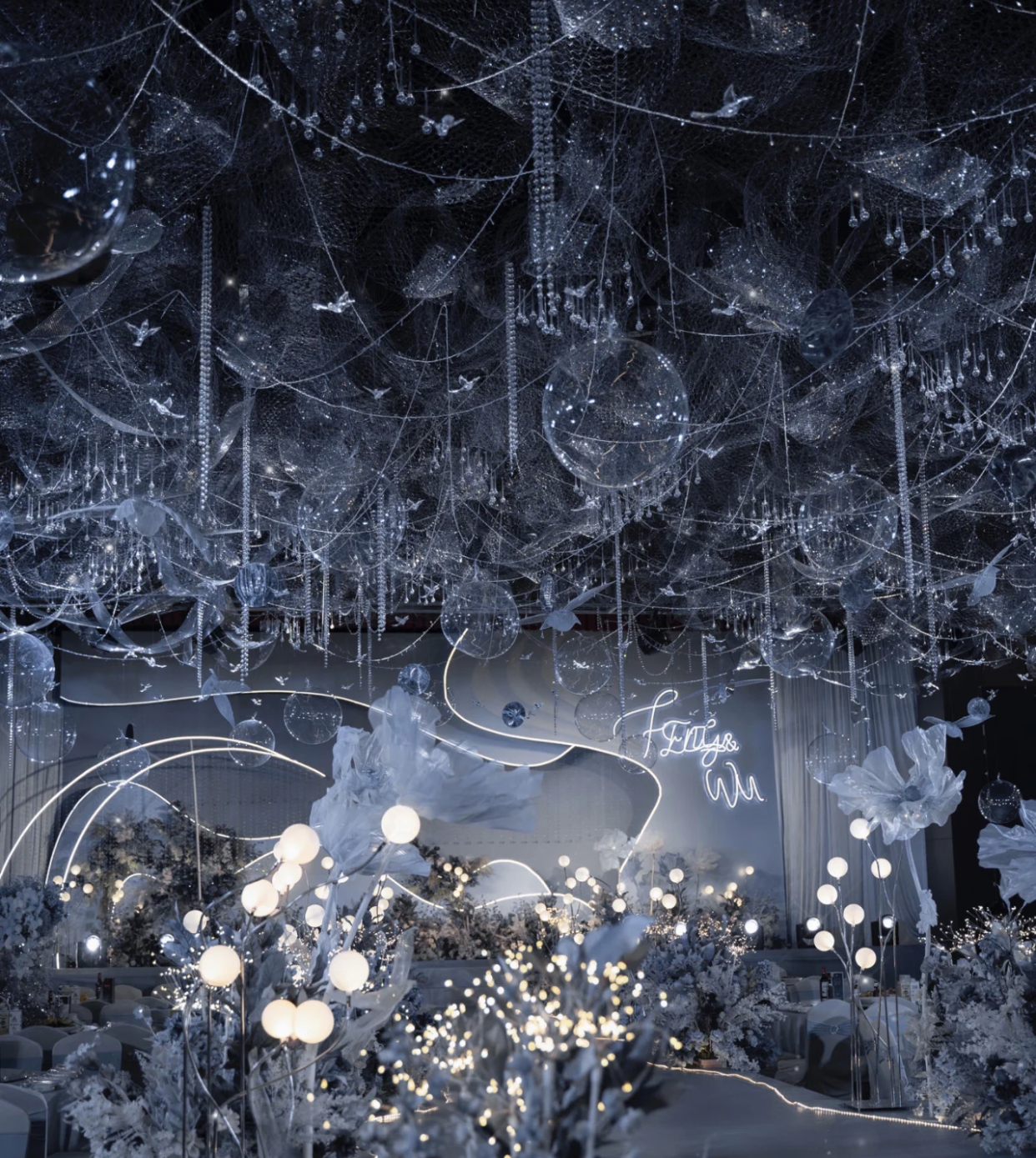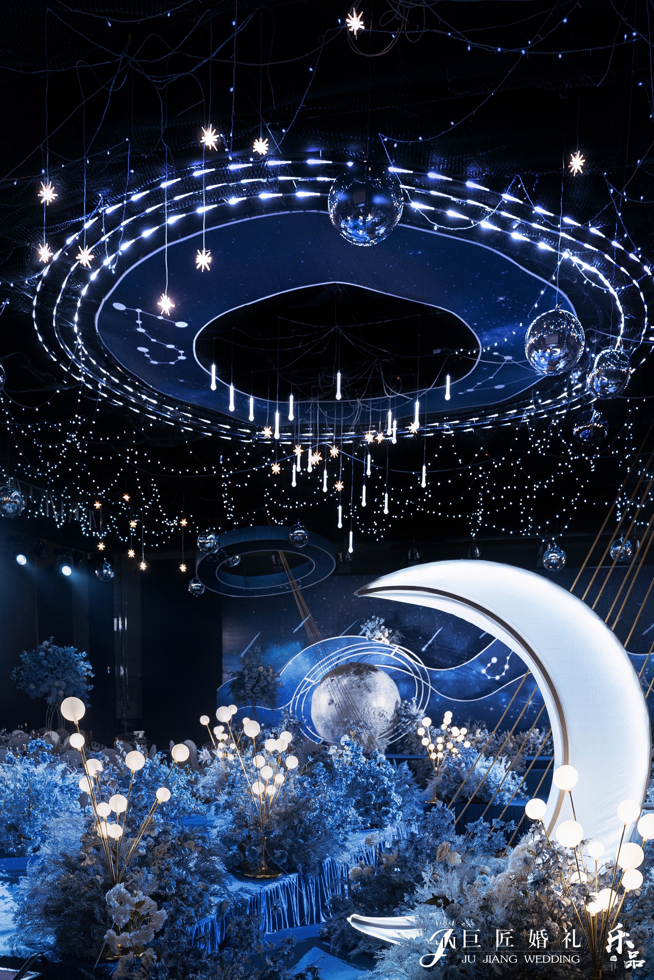 • 星河流转、目下皆是你的爱情 在这场蓝色星空婚礼中完美呈现 星河灿烂不及你眉眼万分的唯美 通过这浪漫的蓝色星空表达 - 深蓝色的主色调神秘唯美 星空吊顶加上银色的线灯 将星河完美的展现在眼前 #婚礼策划 #婚礼现场 #婚礼布置 #真实婚礼