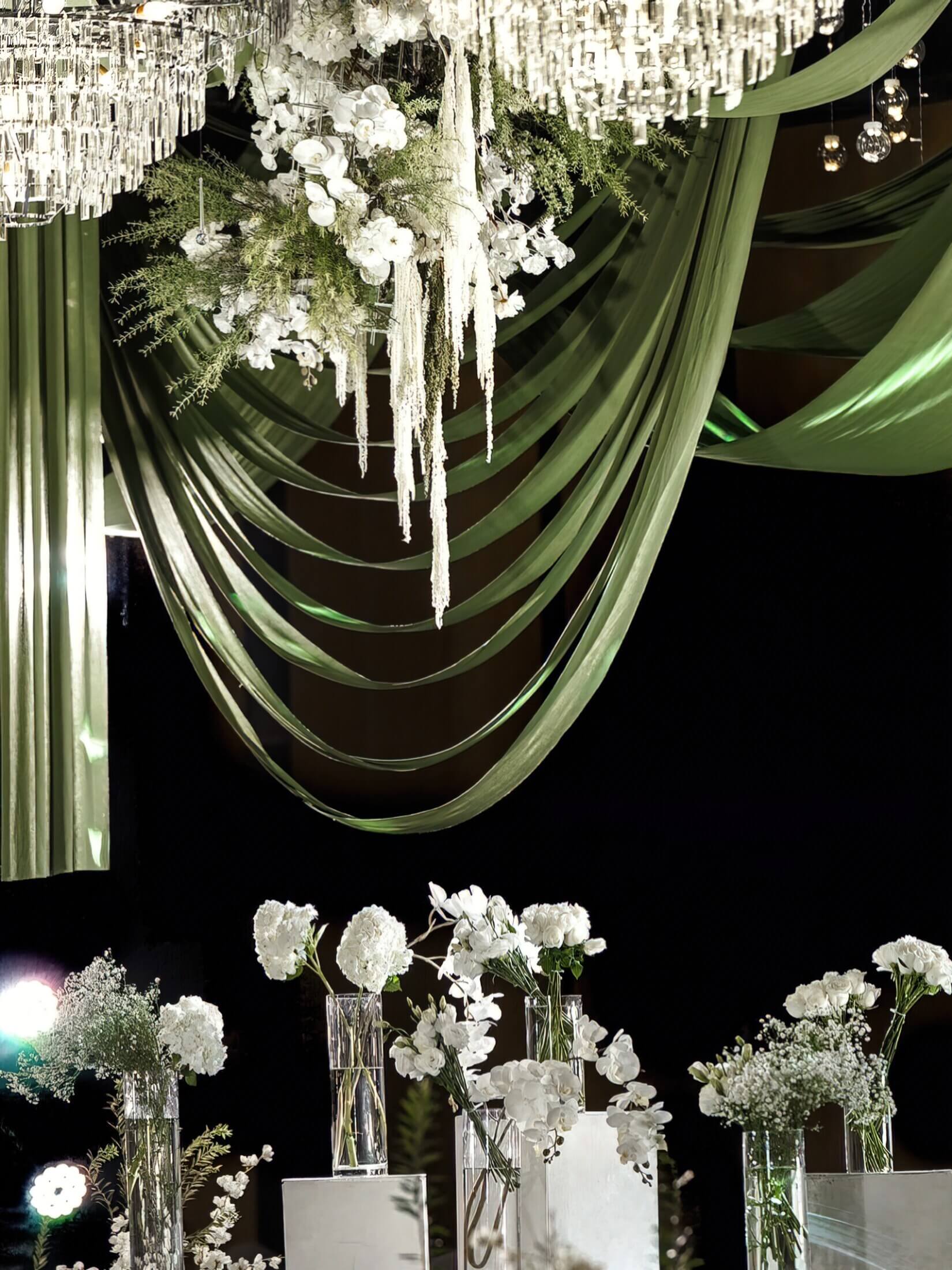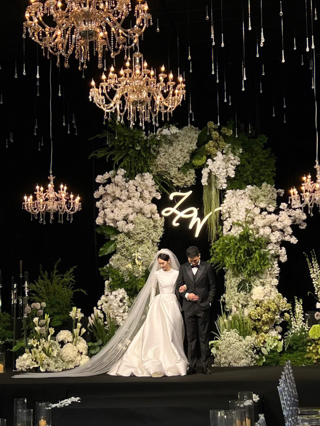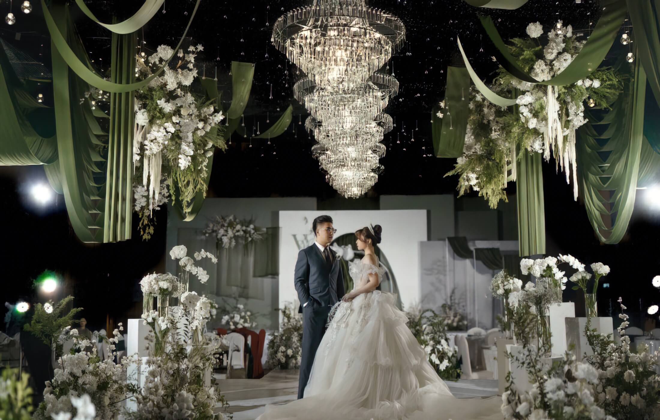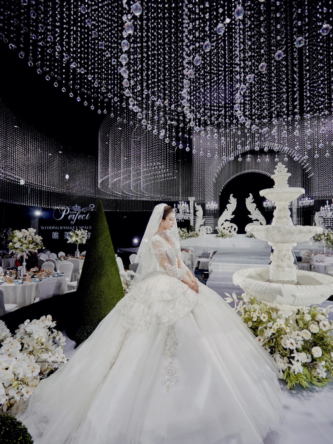 • 简约干净的白、搭配晶莹的水晶吊顶,奢华大气的水晶婚礼、是梦想中的婚礼现场