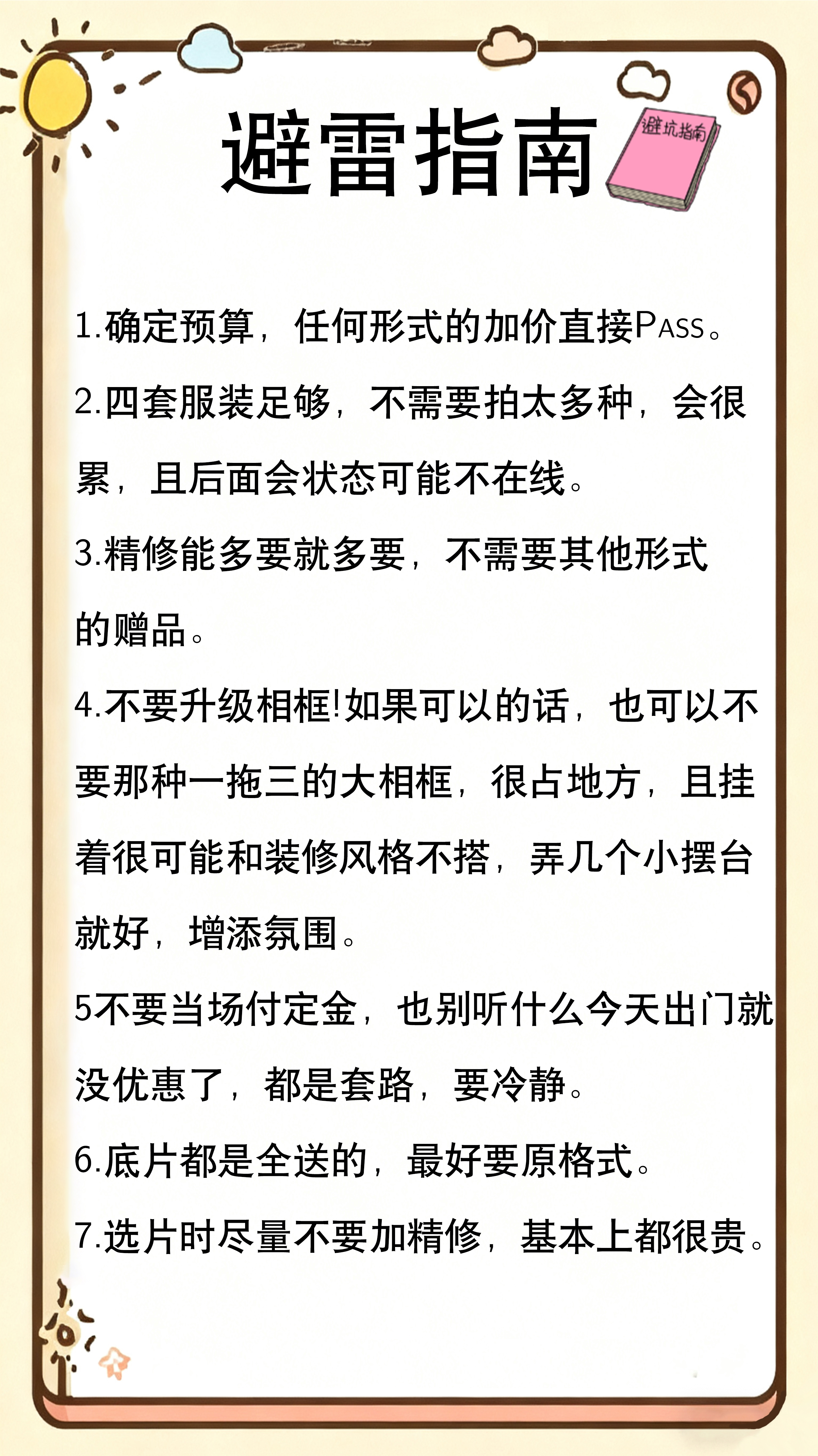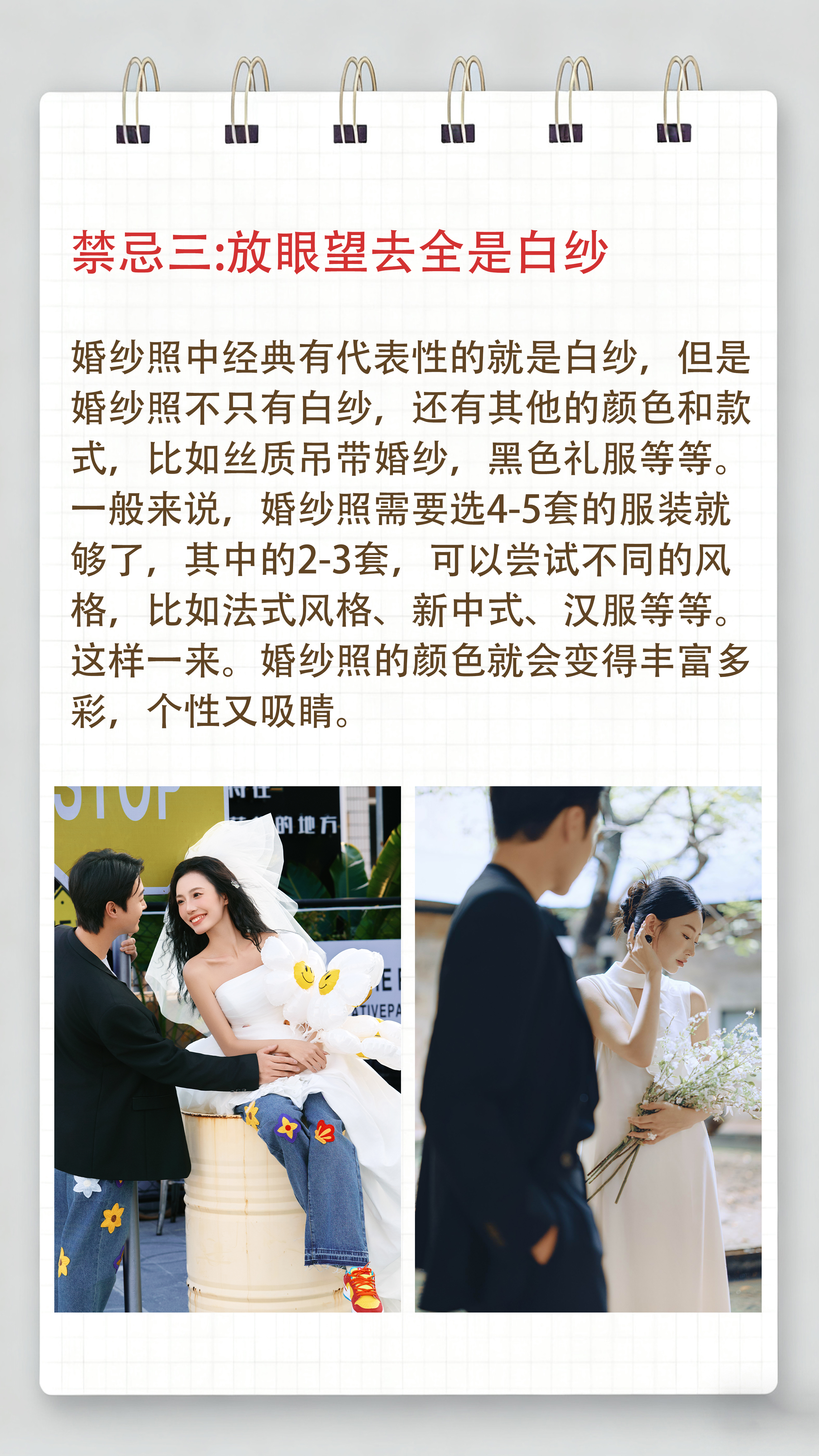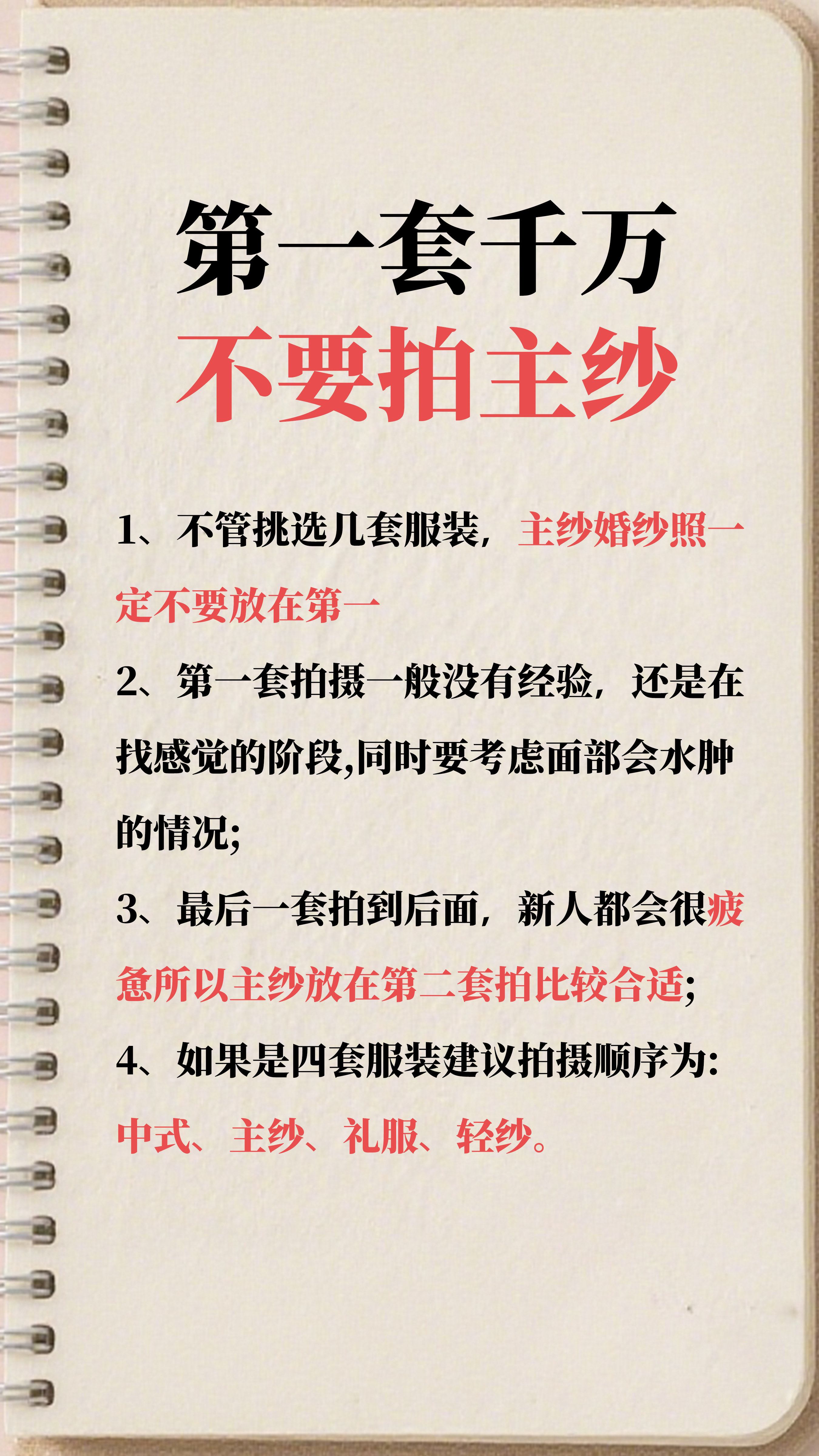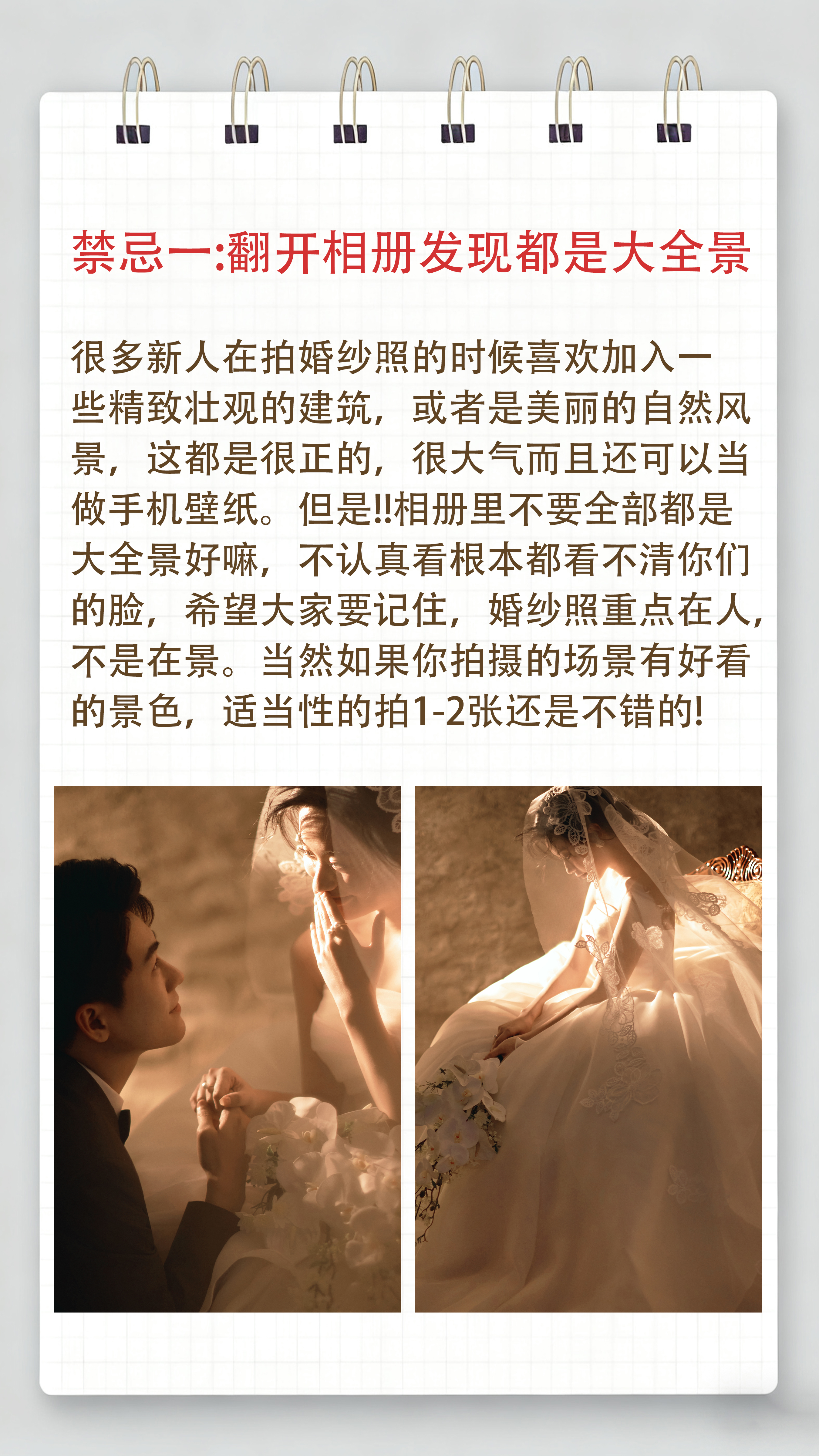 • 嗨嗨备婚小仙女们~✨ 拍婚纱照前刷到这篇就是赚到!💎 含泪总结⑦大禁忌🙅‍♀️ 看完保证让你的婚照美炸朋友圈!💖 ⚠️禁忌①:临时抱佛脚护肤 ❌拍摄前一周别刷酸!别尝试新品! (烂脸过敏哭都来不及!)🍋 ✅提前3个月定期护理才是正道~💆‍♀️ ⚠️禁忌②:盲目模仿样片 ❌硬copy别人的姿势和造型! (复制粘贴永远不如惊艳!)📋 ✅根据气质定制专属风格才最香!👑 ⚠️禁忌③:服装贪多 ❌选5套以上服装! (换装累瘫表情管理全垮掉!)💦 ✅3-4套恰到好处质量更高~👗 ⚠️禁忌④:忽视团队沟通 ❌不敢对摄影师说“不喜欢”! (成片翻车悔断肠!)😭 ✅拍摄每套后及时看片提要求!📲 ⚠️禁忌⑤:过度修图 ❌要求五官p到亲妈不认识! (失真不如去画漫画!)🎨 ✅自然微调保留真实幸福感~✨ ⚠️禁忌⑥:忽略天气因素 ❌酷暑拍外景不准备降温物品! (脱妆中暑双倍暴击!)☀️ ✅提前看天气预报准备应急方案!🌦️ ⚠️禁忌⑦:盲目加片 ❌被选片师忽悠疯狂加精修! (后期相册都在床底吃灰!)📦 ✅按需加片守住钱包最重要!💰 最后敲黑板!!📢 拍摄前一定要试妆试纱!! 不满意当场换掉别心软!!💪 希望各位仙女完美避雷~ 拍到让人哇塞的婚照!!💖 #鲜活又明媚的婚纱照