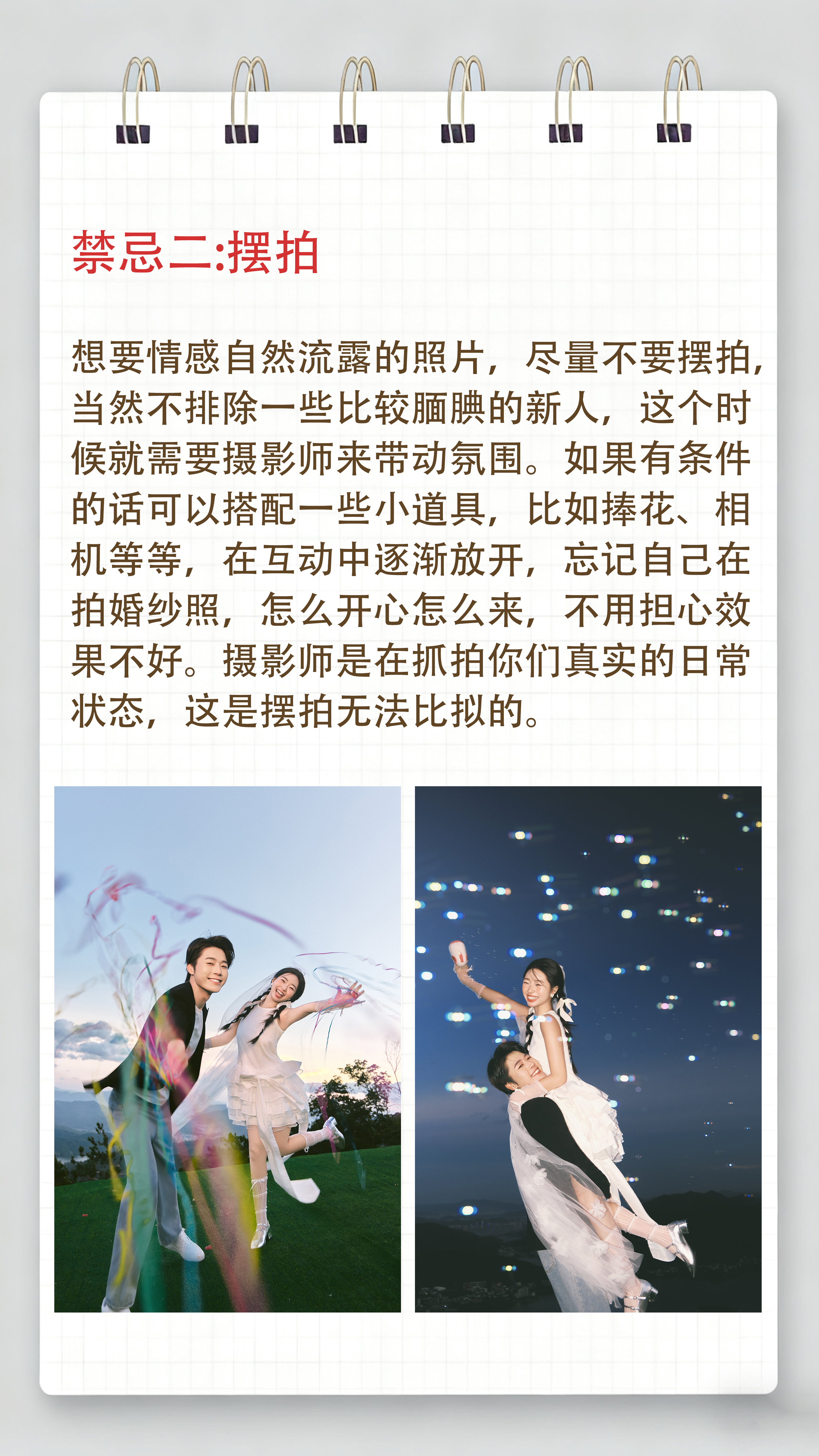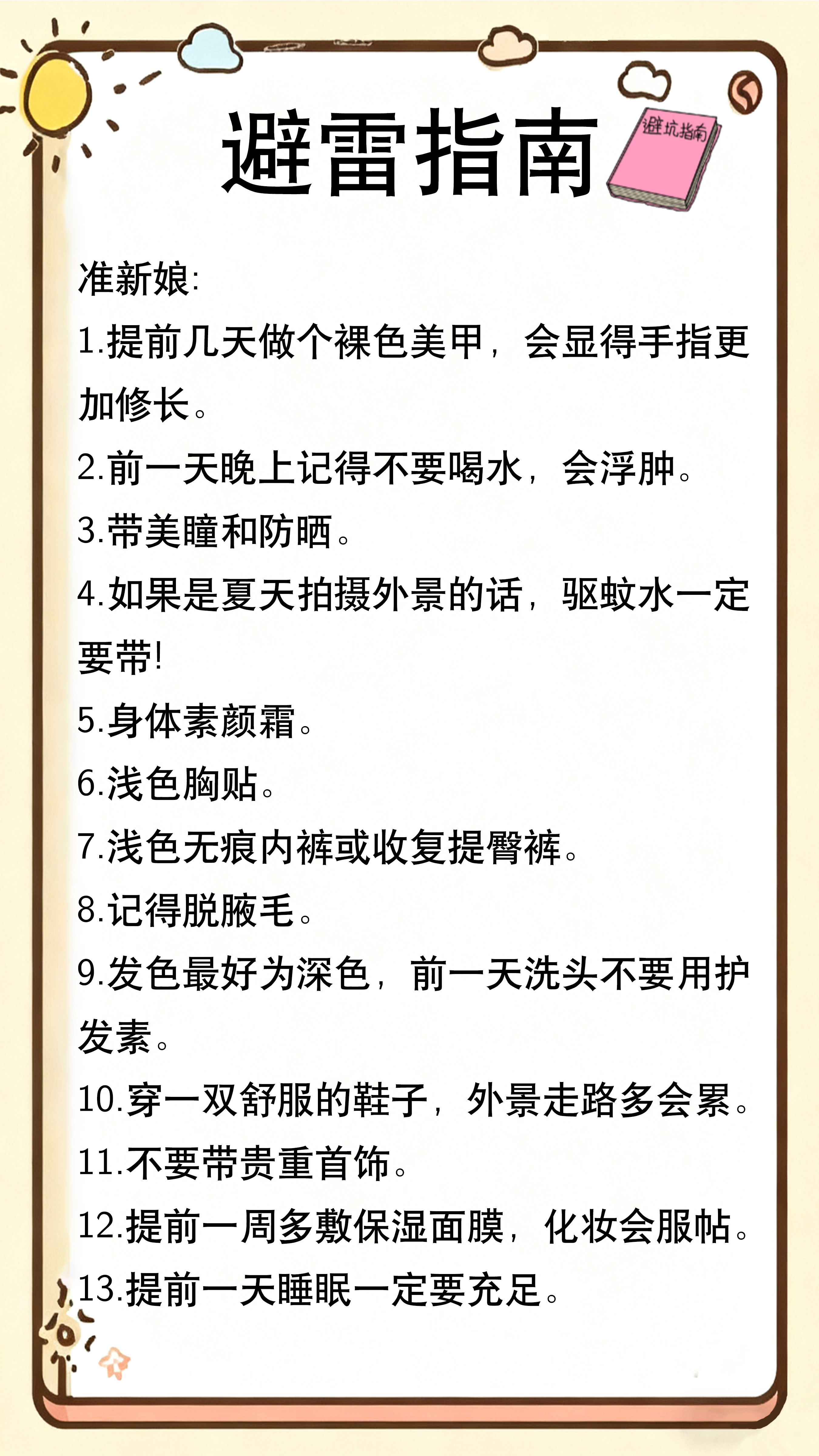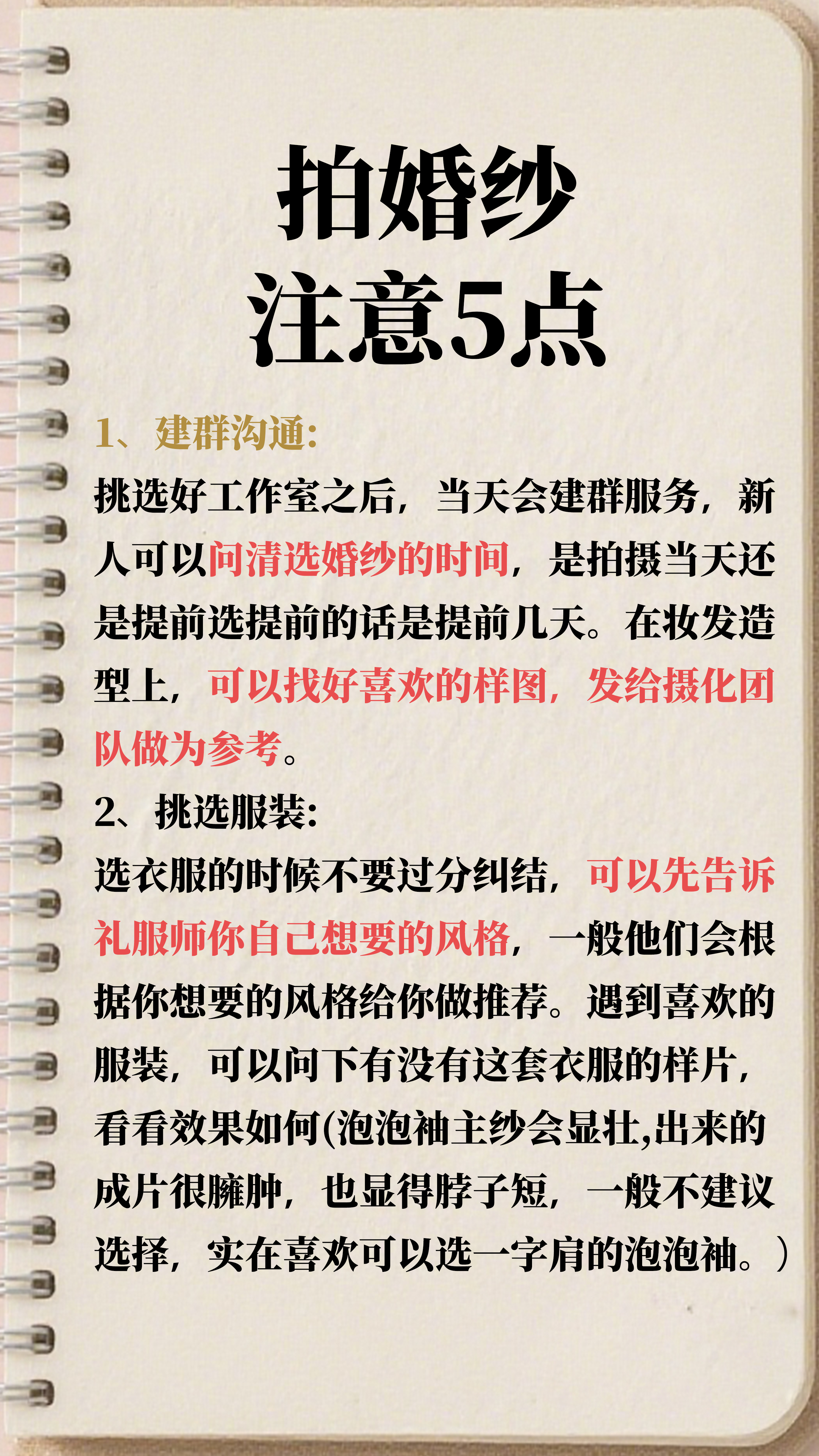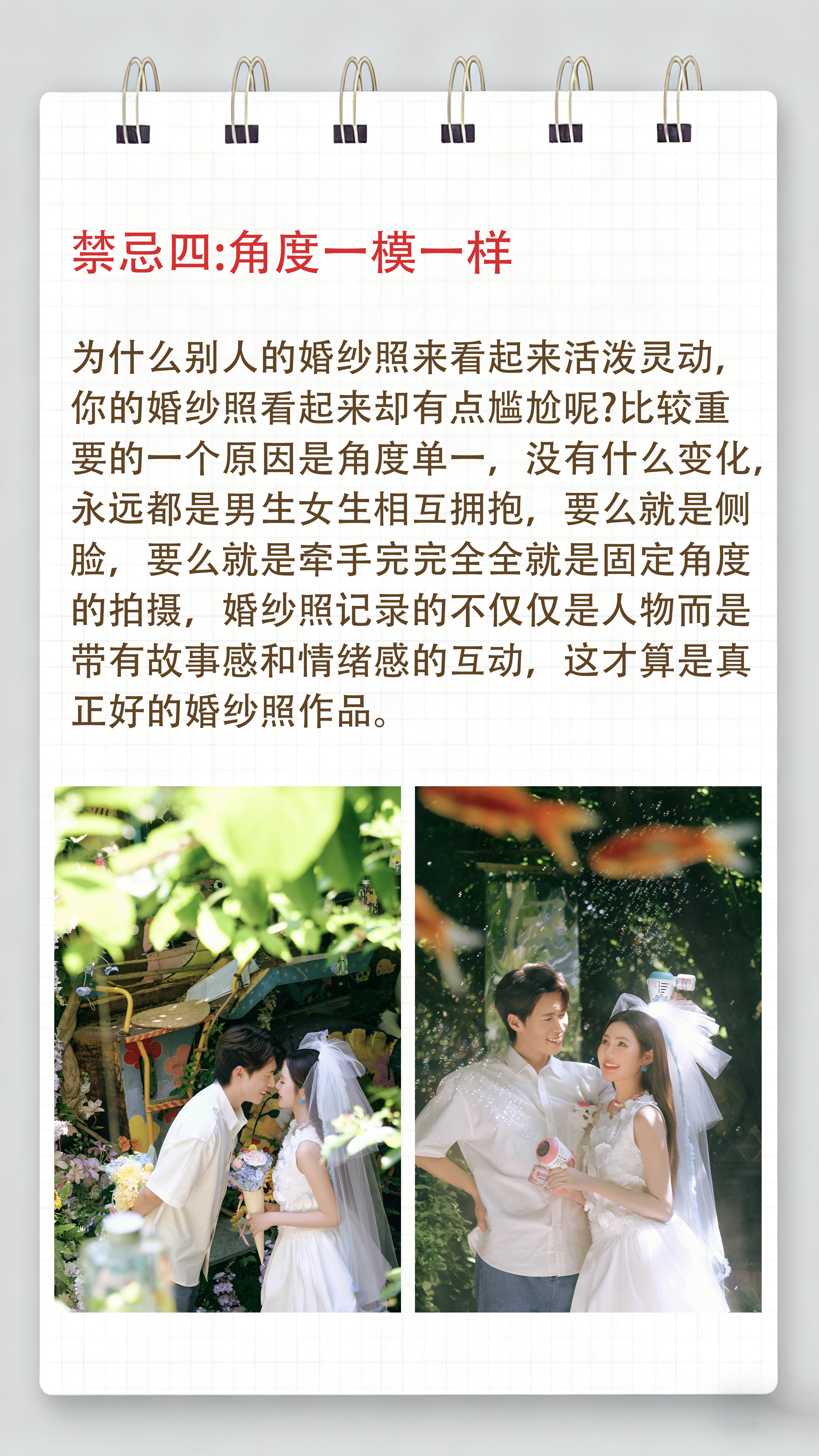 • 嗨嗨备婚小仙女们~✨ 拍婚纱照前刷到这篇就是赚到!💎 含泪总结⑦大禁忌🙅‍♀️ 看完保证让你的婚照美炸朋友圈!💖 ⚠️禁忌①:临时抱佛脚护肤 ❌拍摄前一周别刷酸!别尝试新品! (烂脸过敏哭都来不及!)🍋 ✅提前3个月定期护理才是正道~💆‍♀️ ⚠️禁忌②:盲目模仿样片 ❌硬copy别人的姿势和造型! (复制粘贴永远不如惊艳!)📋 ✅根据气质定制专属风格才最香!👑 ⚠️禁忌③:服装贪多 ❌选5套以上服装! (换装累瘫表情管理全垮掉!)💦 ✅3-4套恰到好处质量更高~👗 ⚠️禁忌④:忽视团队沟通 ❌不敢对摄影师说“不喜欢”! (成片翻车悔断肠!)😭 ✅拍摄每套后及时看片提要求!📲 ⚠️禁忌⑤:过度修图 ❌要求五官p到亲妈不认识! (失真不如去画漫画!)🎨 ✅自然微调保留真实幸福感~✨ ⚠️禁忌⑥:忽略天气因素 ❌酷暑拍外景不准备降温物品! (脱妆中暑双倍暴击!)☀️ ✅提前看天气预报准备应急方案!🌦️ ⚠️禁忌⑦:盲目加片 ❌被选片师忽悠疯狂加精修! (后期相册都在床底吃灰!)📦 ✅按需加片守住钱包最重要!💰 最后敲黑板!!📢 拍摄前一定要试妆试纱!! 不满意当场换掉别心软!!💪 希望各位仙女完美避雷~ 拍到让人哇塞的婚照!!💖 #鲜活又明媚的婚纱照
