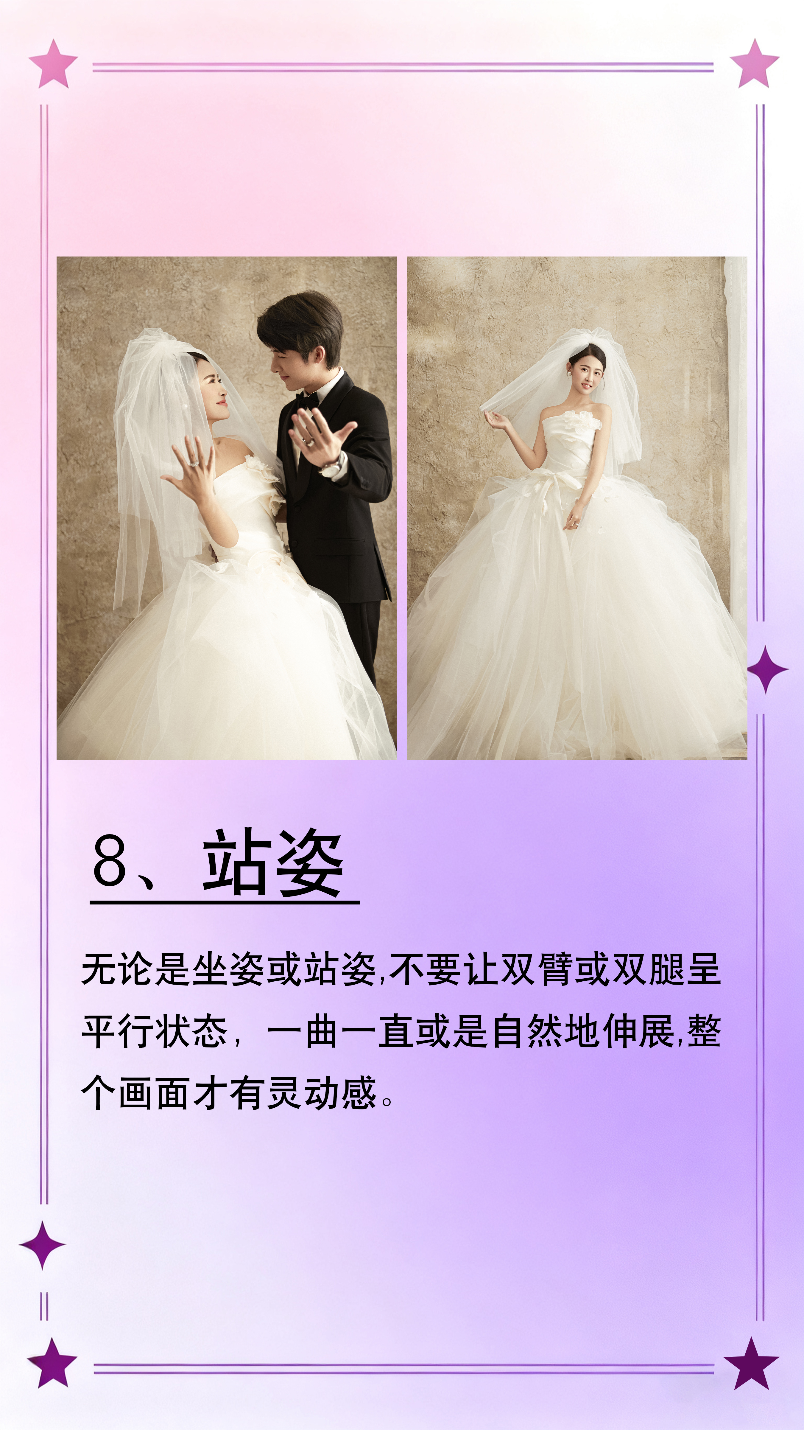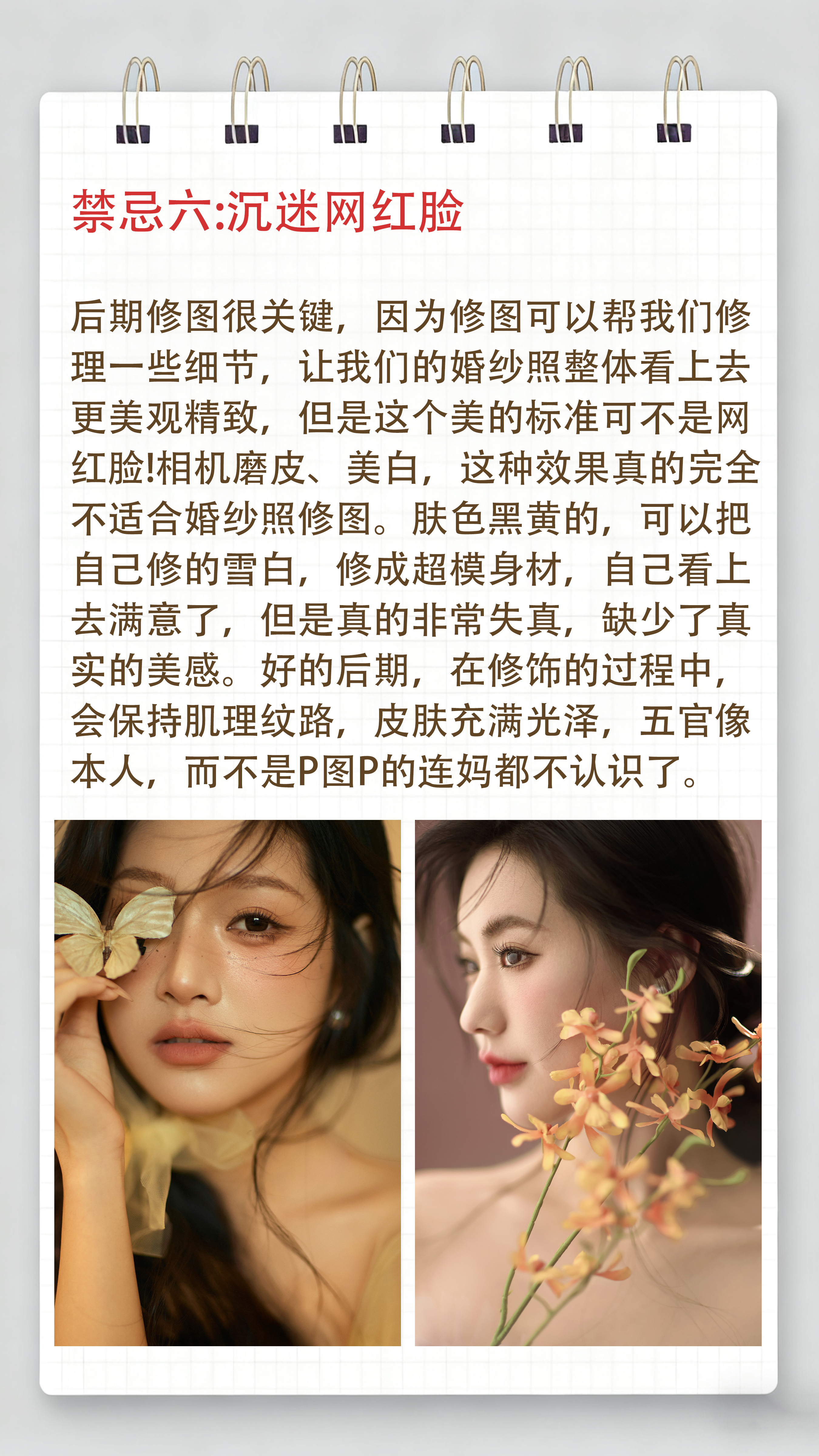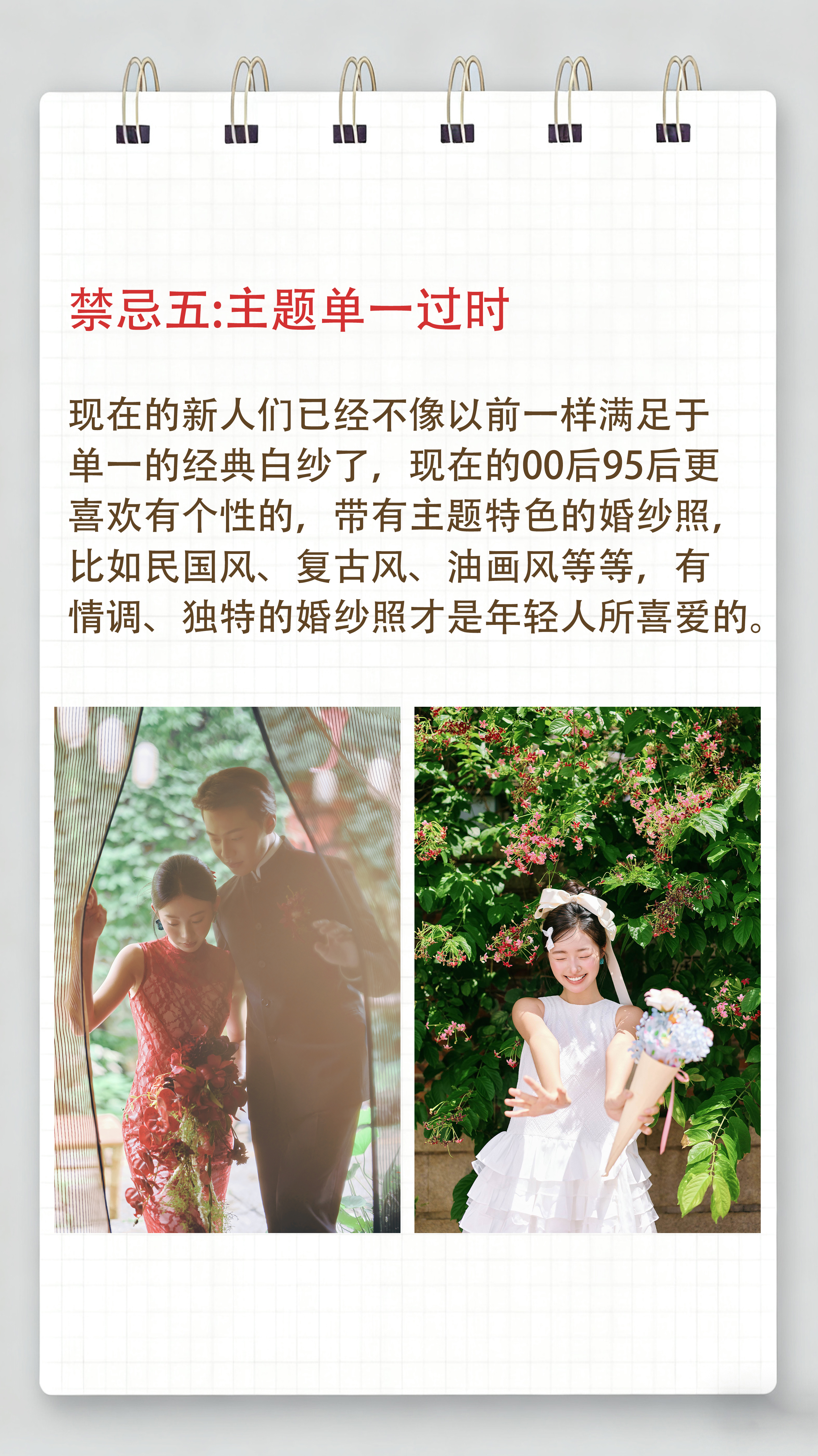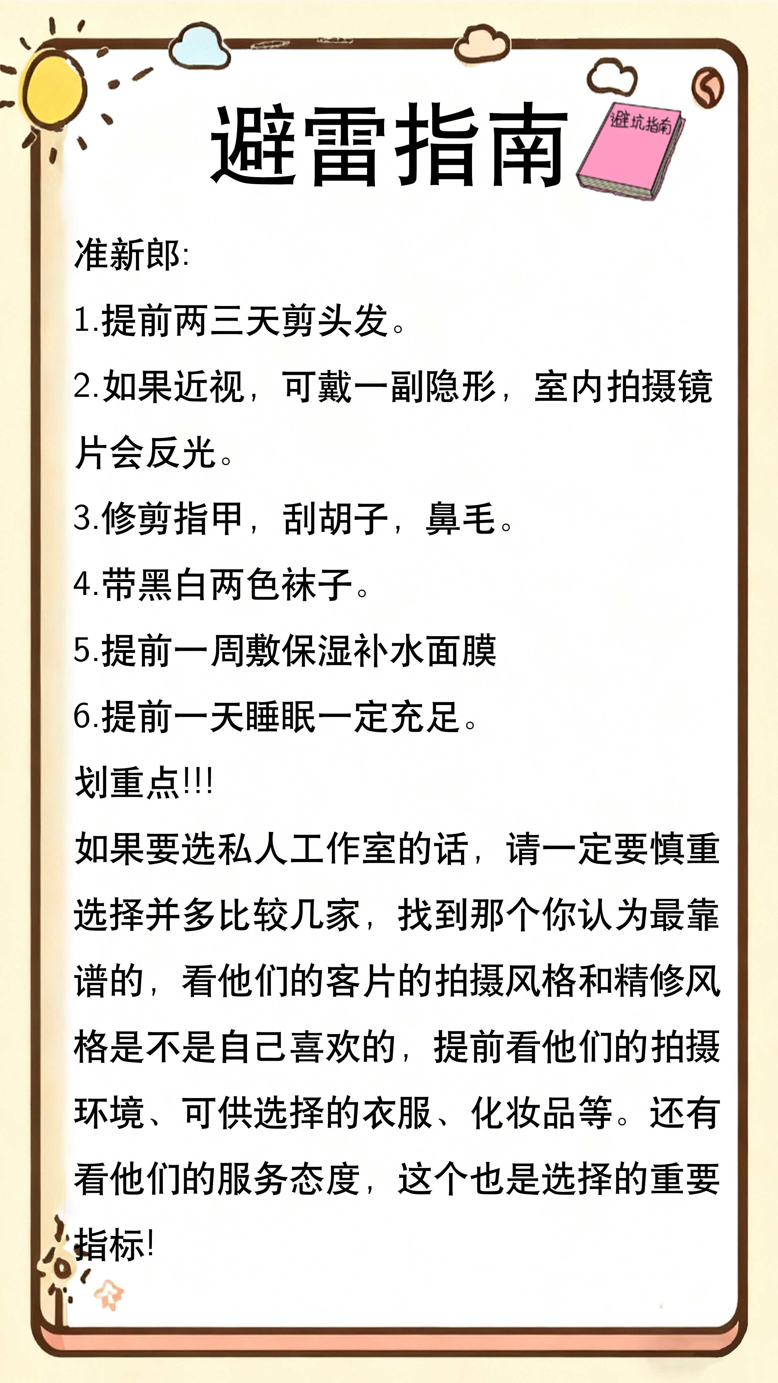 • 嗨嗨备婚小仙女们~✨ 拍婚纱照前刷到这篇就是赚到!💎 含泪总结⑦大禁忌🙅‍♀️ 看完保证让你的婚照美炸朋友圈!💖 ⚠️禁忌①:临时抱佛脚护肤 ❌拍摄前一周别刷酸!别尝试新品! (烂脸过敏哭都来不及!)🍋 ✅提前3个月定期护理才是正道~💆‍♀️ ⚠️禁忌②:盲目模仿样片 ❌硬copy别人的姿势和造型! (复制粘贴永远不如惊艳!)📋 ✅根据气质定制专属风格才最香!👑 ⚠️禁忌③:服装贪多 ❌选5套以上服装! (换装累瘫表情管理全垮掉!)💦 ✅3-4套恰到好处质量更高~👗 ⚠️禁忌④:忽视团队沟通 ❌不敢对摄影师说“不喜欢”! (成片翻车悔断肠!)😭 ✅拍摄每套后及时看片提要求!📲 ⚠️禁忌⑤:过度修图 ❌要求五官p到亲妈不认识! (失真不如去画漫画!)🎨 ✅自然微调保留真实幸福感~✨ ⚠️禁忌⑥:忽略天气因素 ❌酷暑拍外景不准备降温物品! (脱妆中暑双倍暴击!)☀️ ✅提前看天气预报准备应急方案!🌦️ ⚠️禁忌⑦:盲目加片 ❌被选片师忽悠疯狂加精修! (后期相册都在床底吃灰!)📦 ✅按需加片守住钱包最重要!💰 最后敲黑板!!📢 拍摄前一定要试妆试纱!! 不满意当场换掉别心软!!💪 希望各位仙女完美避雷~ 拍到让人哇塞的婚照!!💖 #鲜活又明媚的婚纱照