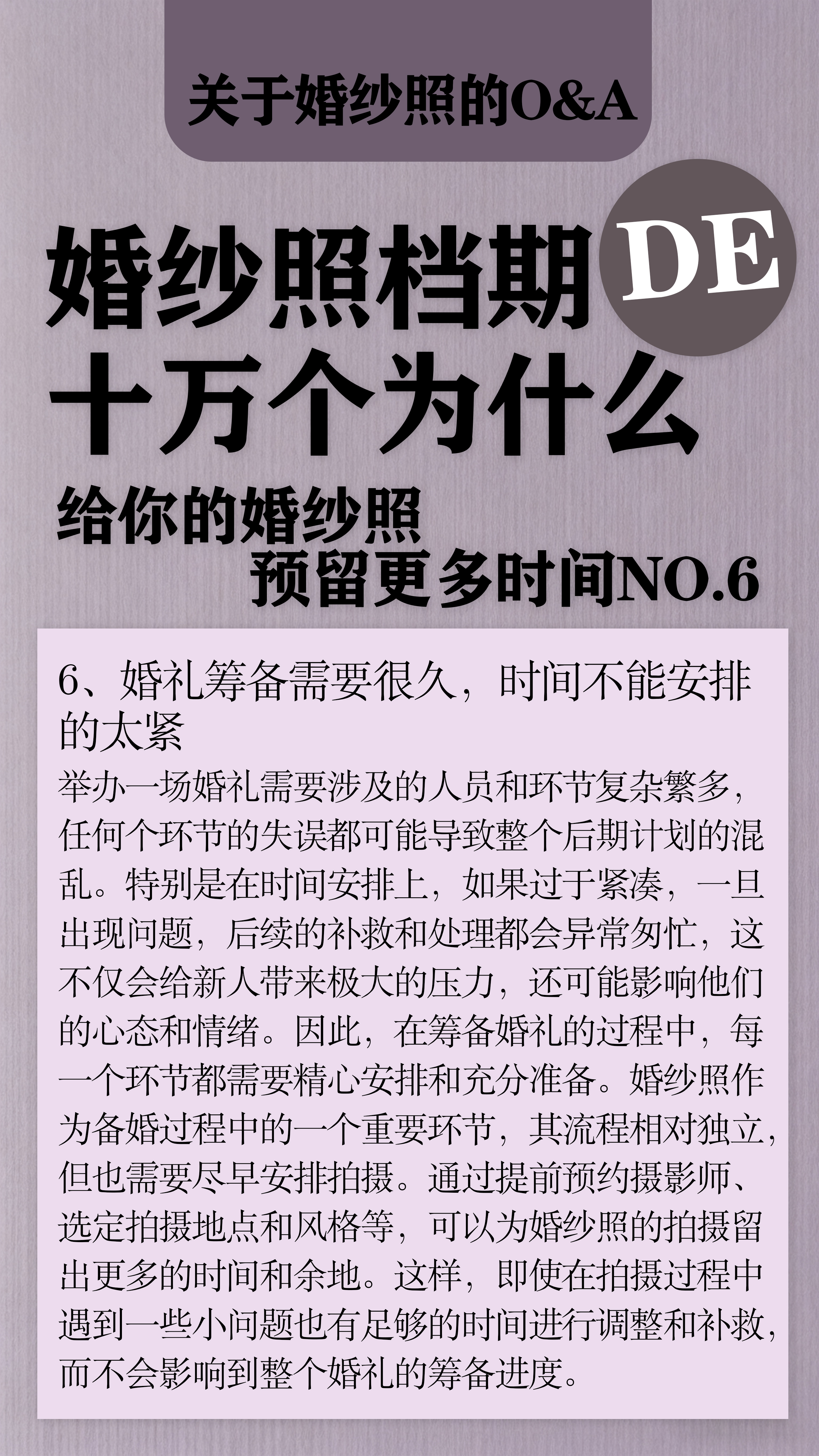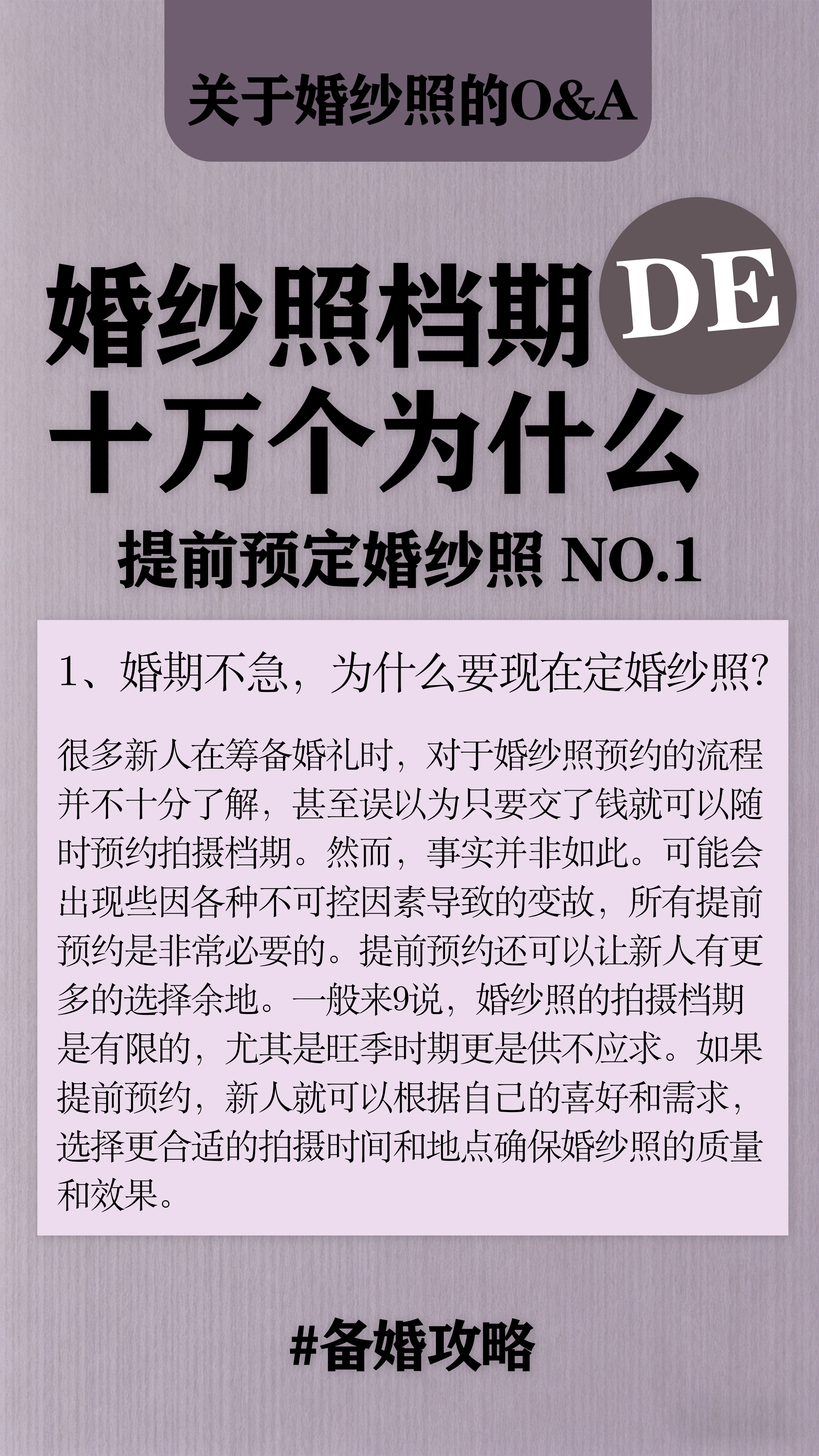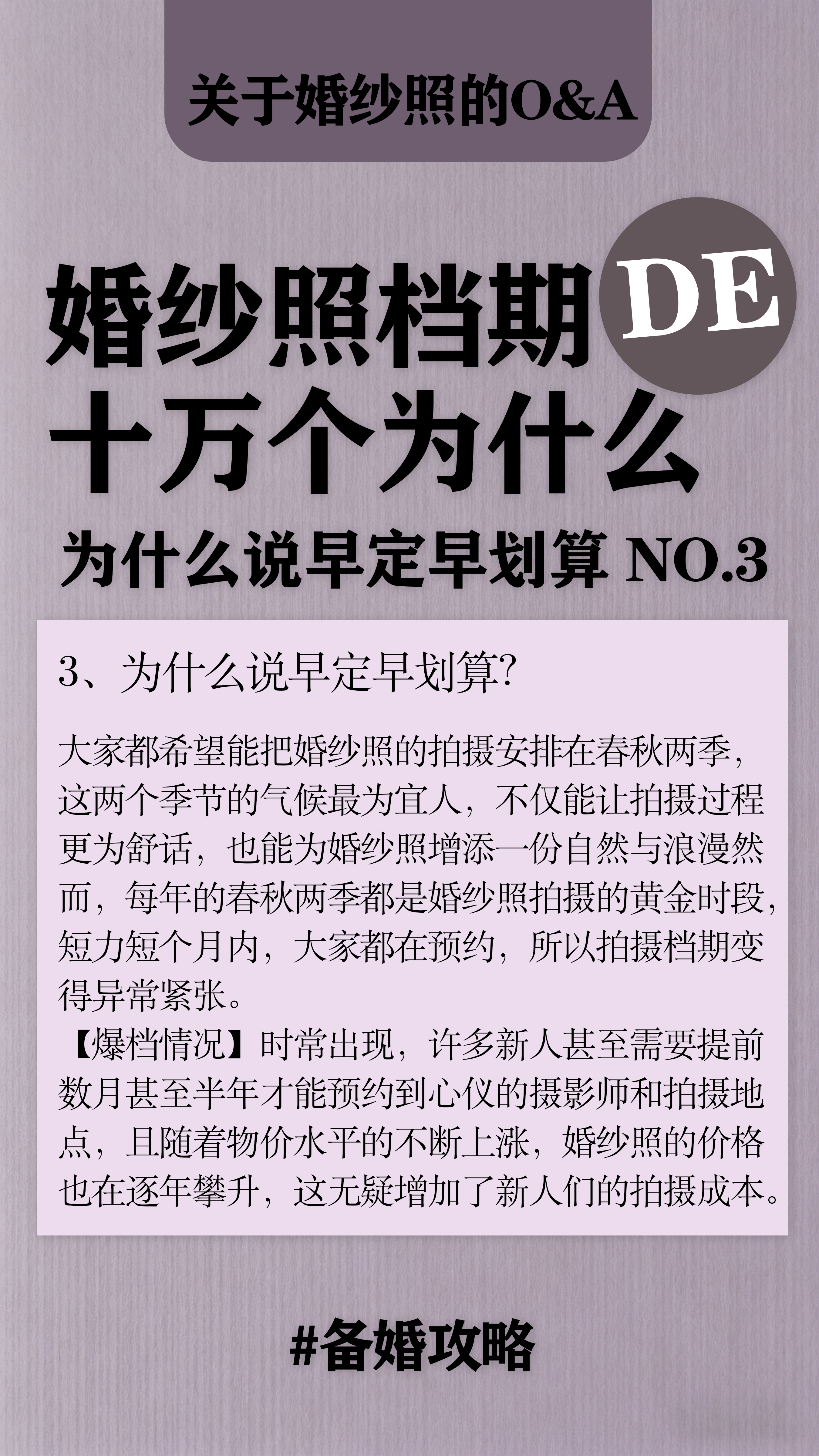 • 嗨嗨备婚小仙女们~✨ 是不是觉得婚期还早不用急?🚫 达咩!听我一句劝!! 提前预约婚纱照真的真的太重要啦!💥 📅【档期厮杀超激烈】 ✅热门摄影师提前半年就被订光光! ✅黄金周末档期要靠抢的! 🌸【季节限定不等人】 ✅想拍樱花雨?要卡准4月! ✅要拍雪景?得锁定12月! 💝【定制服务需时长】 ✅ dream婚纱要调货! ✅专属造型要设计! (临时约只能捡剩的😱) 💰【早鸟福利超划算】 ✅预约越早折扣越多! ✅赠品道具拿到手软! 👗【试纱选择更多样】 ✅新款礼服任你挑! ✅码数不合还能改! (临时约只有被挑剩的呜呜) 📸【准备时间更充分】 ✅减肥塑形安排上! ✅皮肤管理做起来! ✨【心理安全感max】 ✅不用焦虑档期! ✅不怕天气突变! 最后划重点!!📢 旺季要提前6-8个月预约!! 淡季也要提前3-4个月!! 现在立刻马上就去咨询!!💨 💐评论区晒晒你们提前多久预约的~ 让我夸夸有准备的聪明宝贝!!👏#鲜活又明媚的婚纱照