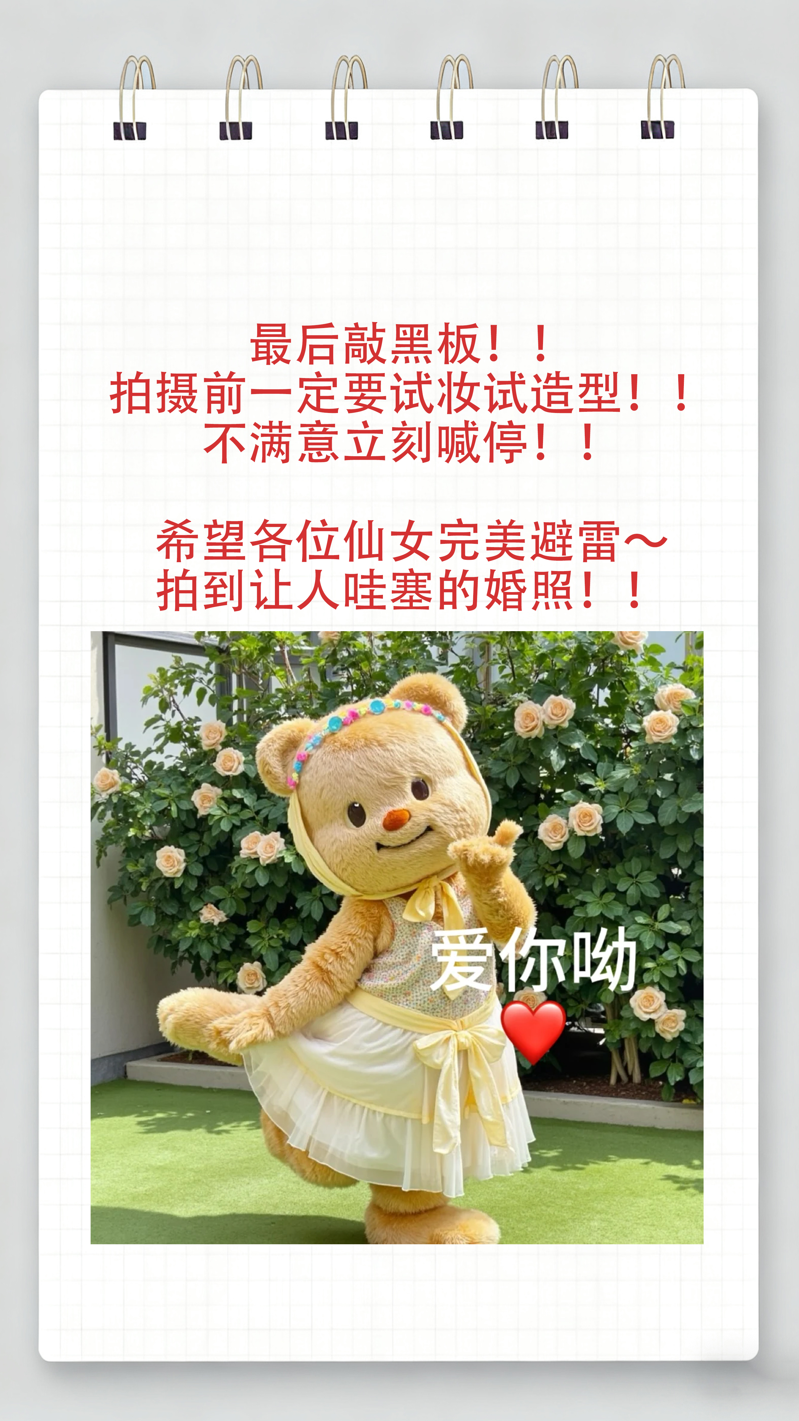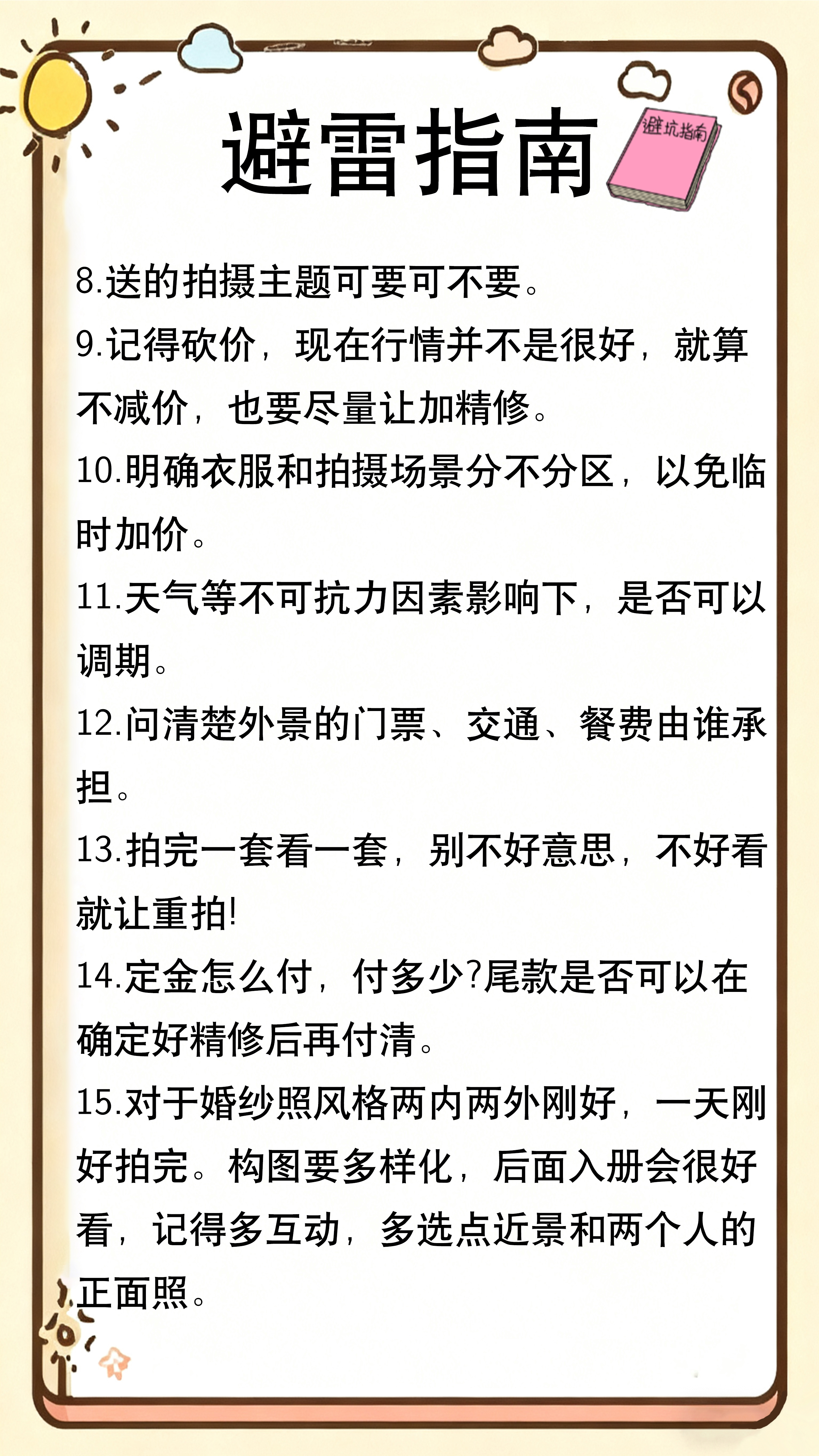 • 备婚仙女们注意啦!✨ 拍婚纱照前必看避雷指南~ 这些坑踩了真的会哭晕😭 收藏这篇雷区绕道走~💃 ❌雷区一:盲目相信客片 ✅一定要看真实客片! ✅要求看不同水平的案例!📸 ❌雷区二:不定制拍摄计划 ✅提前沟通拍摄脚本! ✅拒绝模板化流水线!🚶‍♀️ ❌雷区三:忽略天气因素 ✅外景一定要看天气预报! ✅准备室内备用方案!🌦️ ❌雷区四:服装选择失误 ✅提前试纱拍照确认! ✅主纱轻便各一套!👗 ❌雷区五:盲目追求张数 ✅质量>数量! ✅精品>废片! (选片时真的会选择困难)📦 ❌雷区六:忽略后期细节 ✅要求先修样片确认风格! ✅皮肤纹理要保留! (过度磨皮像假人)🎨 ❌雷区七:不检查道具 ✅提前确认道具状况! ✅鲜花要新鲜! (蔫掉的花真的丑)🌸 ✨必备 checklist✨ ▫️试妆时拍照确认📱 ▫️自带舒适拖鞋🥿 ▫️准备零食补充能量🍫 ▫️带上喜欢的道具💐 ▫️涂防晒!涂防晒!🌞 💝最后记住: 所有承诺都要写进合同! 不要相信口头承诺! 保留所有沟通记录!📝 评论区晒出你们的避雷经验~ 一起做聪明备婚人!👏#鲜活又明媚的婚纱照