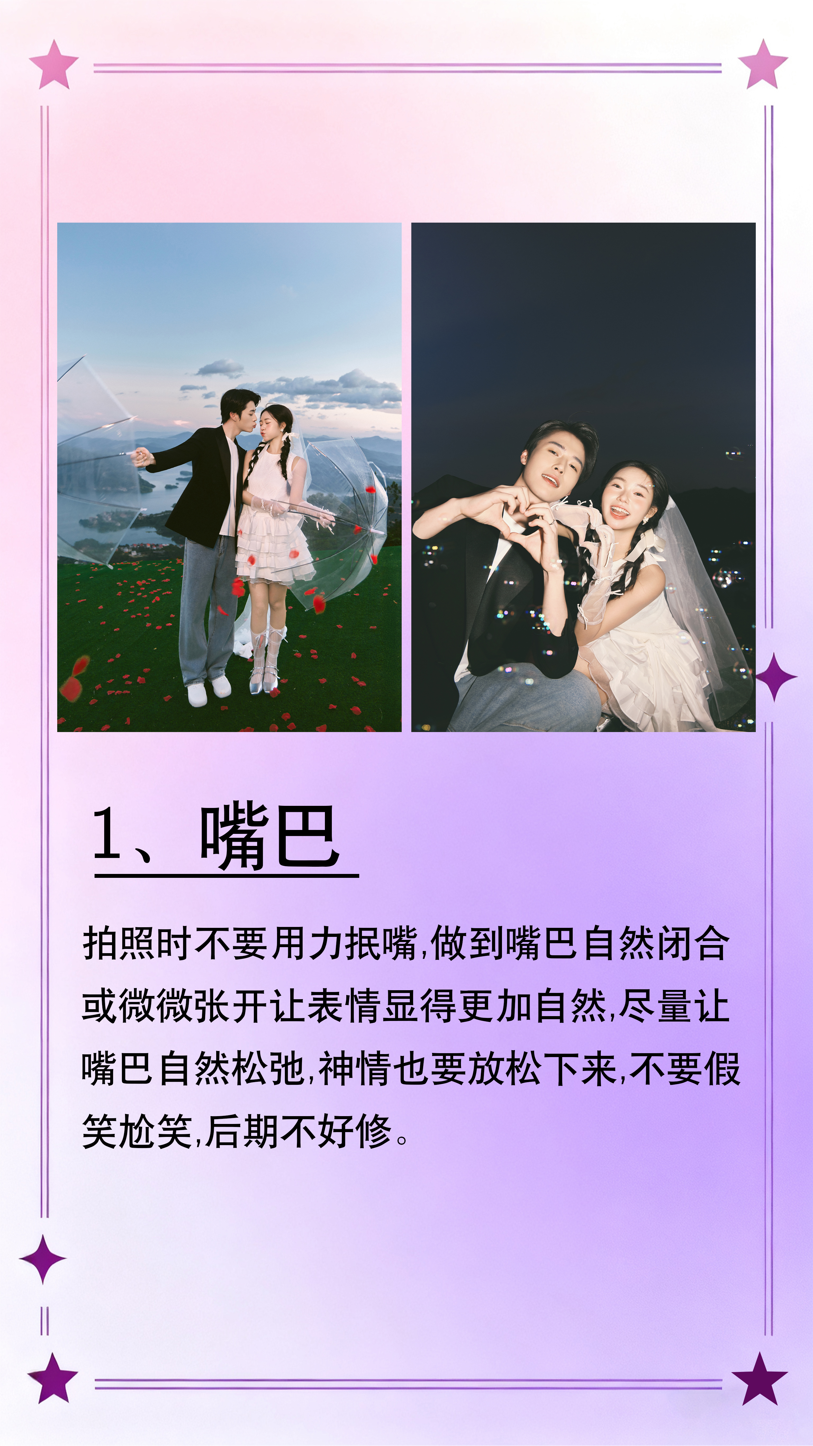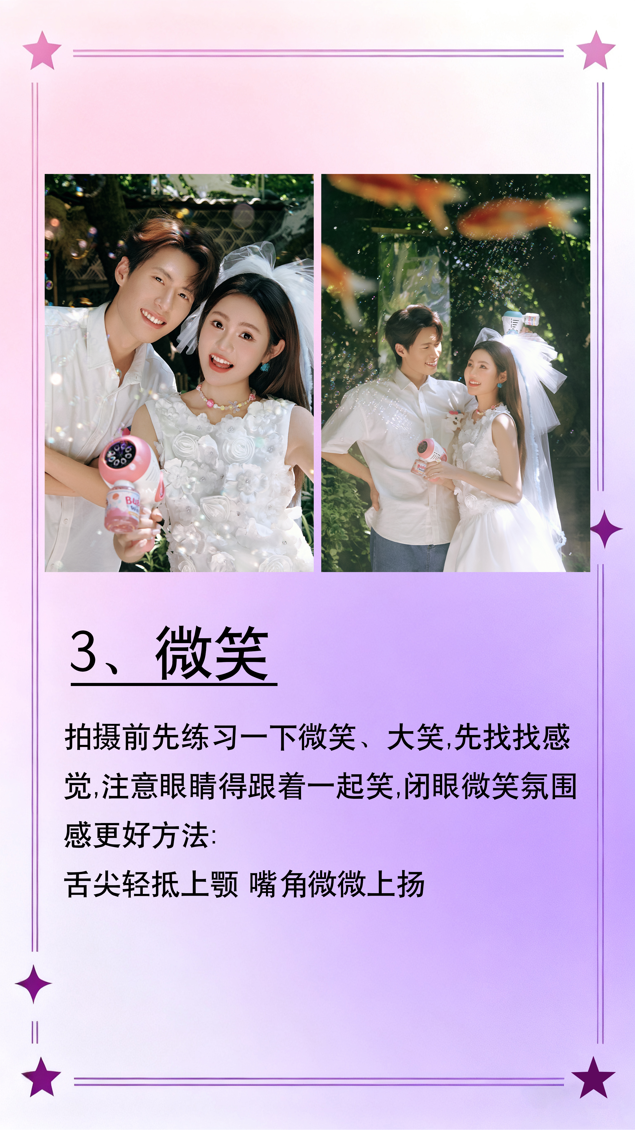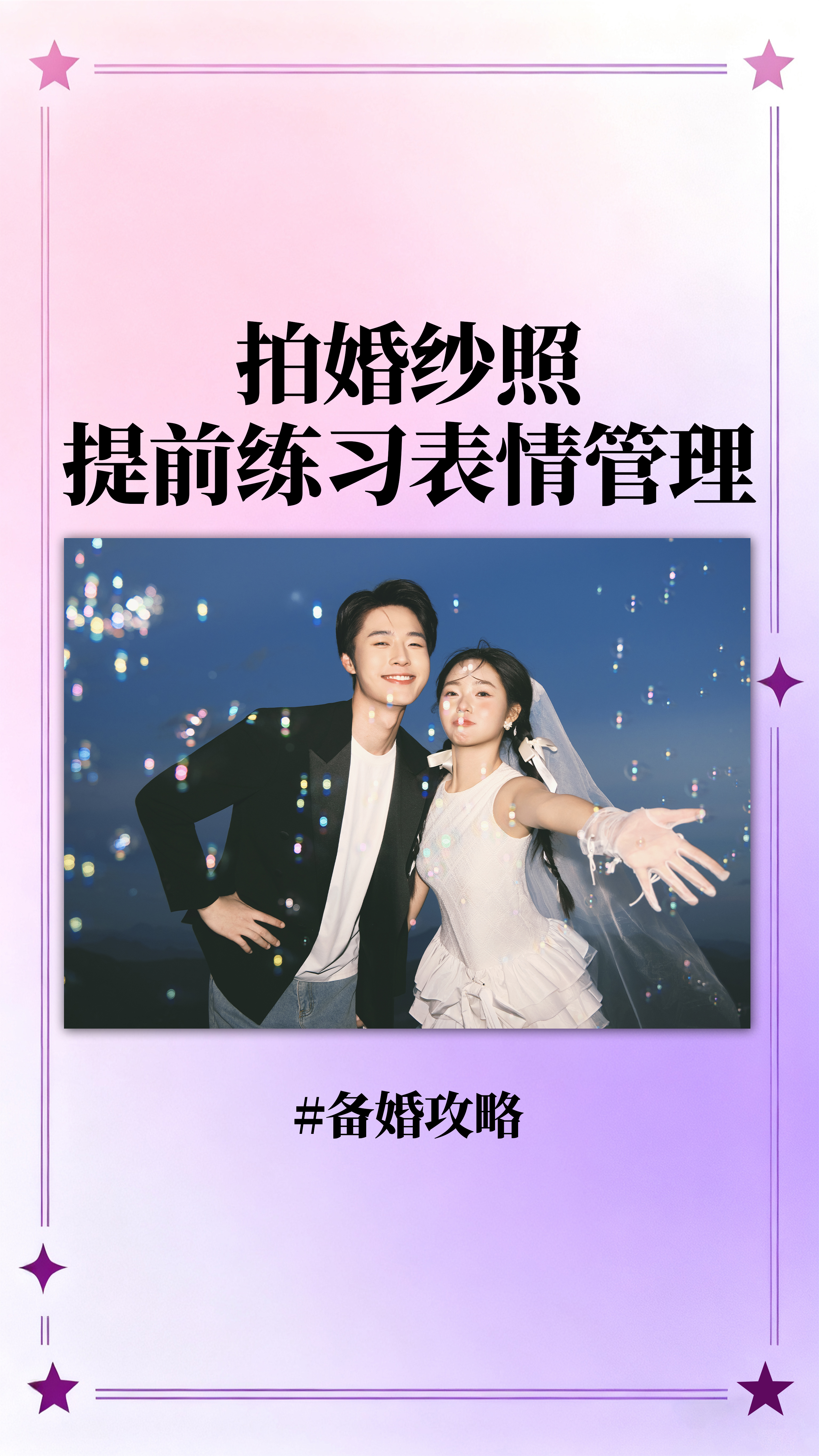 • 备婚仙女速速集合!!📢 拍婚纱照不会管理表情? 看完这篇直接拯救废片!🎉 ——————❌表情雷区—————— 😭假笑女(男)孩:嘴角上扬眼睛无神 (像被逼婚的可怜宝宝) 😤僵硬狂魔:全身紧绷像木偶人 (我成了个机器人?) 😫抿嘴怪:害怕露牙拼命抿嘴 (后期修图师崩溃警告!) ——————💡急救小技巧—————— ✨「嘿哈法」:按下快门前默念“嘿哈” (自然露齿笑get!) ✨「眨眼复位」:每次拍完眨眼重置表情 (杜绝死鱼眼!) ✨「动态捕捉」:连拍时轻轻晃动脑袋 (灵动感秒杀静态摆拍!) ——————💖绝美表情公式—————— 👉对视新郎:含糖量超标的星星眼✨ (想象他偷偷给你买奶茶!) 👉低头浅笑:温柔感直接拉满~ (显脸小还遮双下巴!) 👉回头抓拍:发丝飘动+自然笑颜 (故事感封神瞬间!) ——————📸场景对应表情包—————— 🎠游乐场:放肆大笑+夸张表情 (开心到模糊反而更出片!) 🏰古堡教堂:温柔浅笑+优雅矜持 (在逃公主本主!) 🌿森系草坪:闭眼微笑+清新自然 (仙气直接溢出屏幕!) 💫最终秘诀: 拍摄前对着镜子练习! 找到最美的微笑角度!! (提前一周每天练5分钟!)#鲜活又明媚的婚纱照