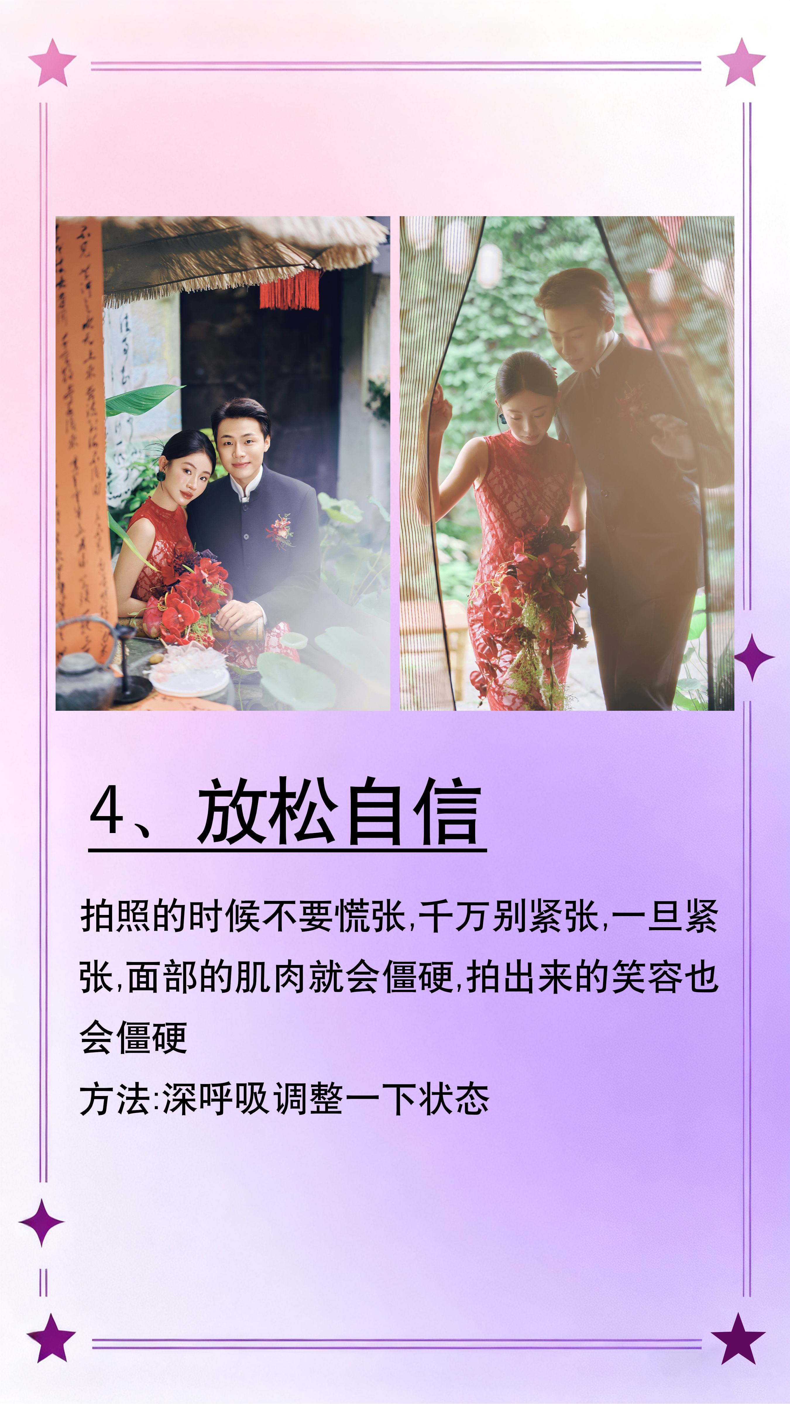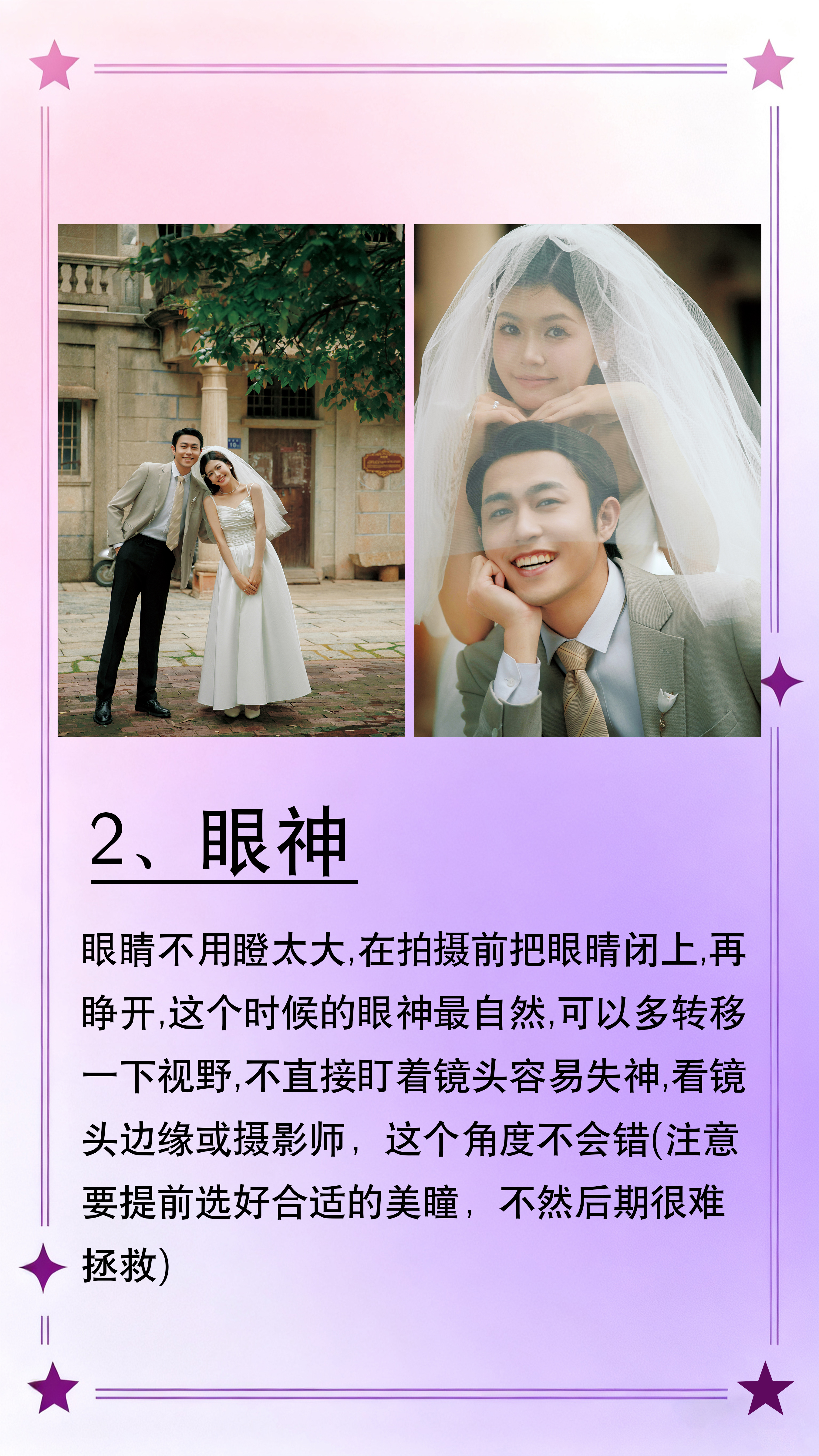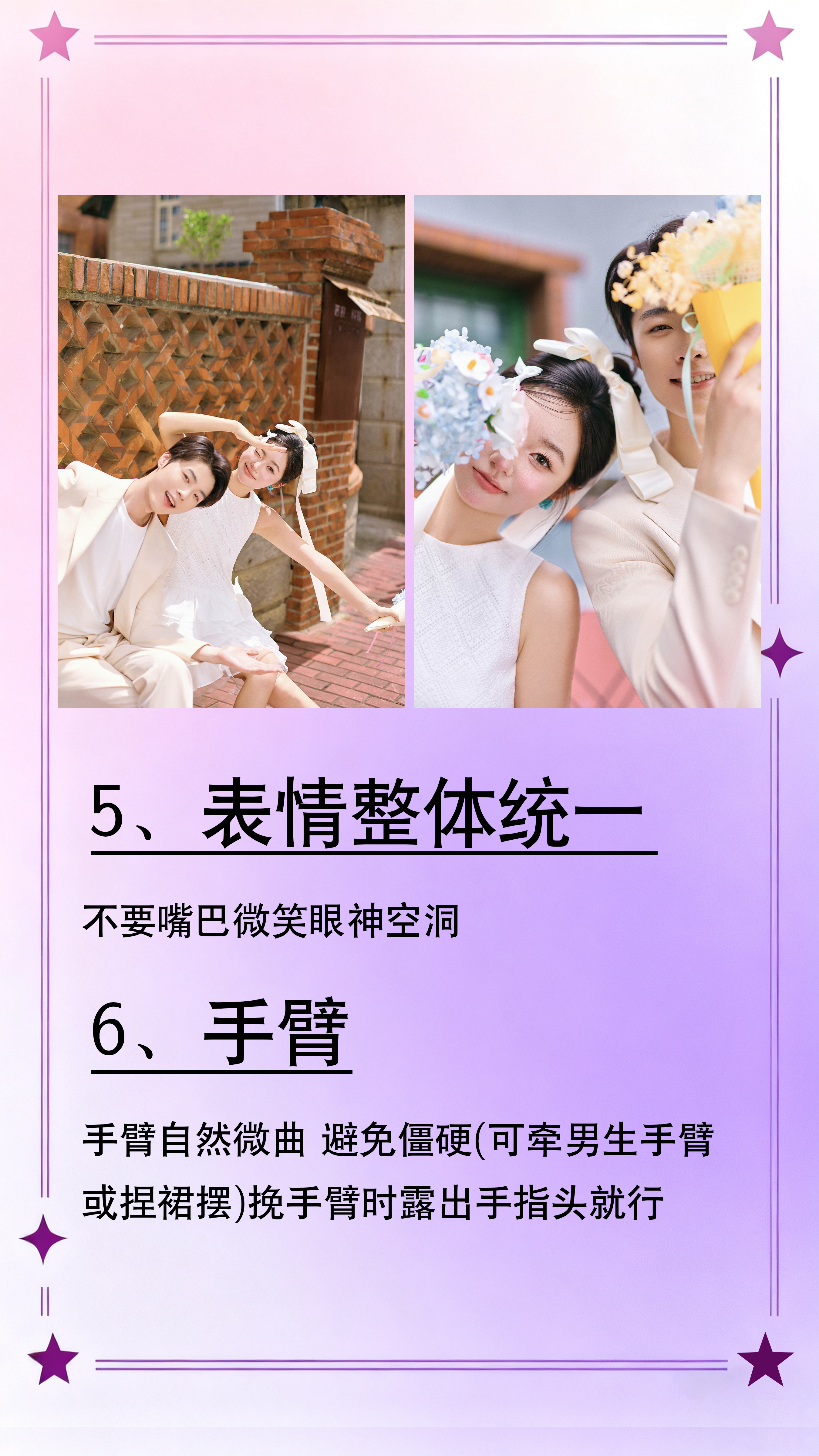 • 备婚仙女速速集合!!📢 拍婚纱照不会管理表情? 看完这篇直接拯救废片!🎉 ——————❌表情雷区—————— 😭假笑女(男)孩:嘴角上扬眼睛无神 (像被逼婚的可怜宝宝) 😤僵硬狂魔:全身紧绷像木偶人 (我成了个机器人?) 😫抿嘴怪:害怕露牙拼命抿嘴 (后期修图师崩溃警告!) ——————💡急救小技巧—————— ✨「嘿哈法」:按下快门前默念“嘿哈” (自然露齿笑get!) ✨「眨眼复位」:每次拍完眨眼重置表情 (杜绝死鱼眼!) ✨「动态捕捉」:连拍时轻轻晃动脑袋 (灵动感秒杀静态摆拍!) ——————💖绝美表情公式—————— 👉对视新郎:含糖量超标的星星眼✨ (想象他偷偷给你买奶茶!) 👉低头浅笑:温柔感直接拉满~ (显脸小还遮双下巴!) 👉回头抓拍:发丝飘动+自然笑颜 (故事感封神瞬间!) ——————📸场景对应表情包—————— 🎠游乐场:放肆大笑+夸张表情 (开心到模糊反而更出片!) 🏰古堡教堂:温柔浅笑+优雅矜持 (在逃公主本主!) 🌿森系草坪:闭眼微笑+清新自然 (仙气直接溢出屏幕!) 💫最终秘诀: 拍摄前对着镜子练习! 找到最美的微笑角度!! (提前一周每天练5分钟!)#鲜活又明媚的婚纱照